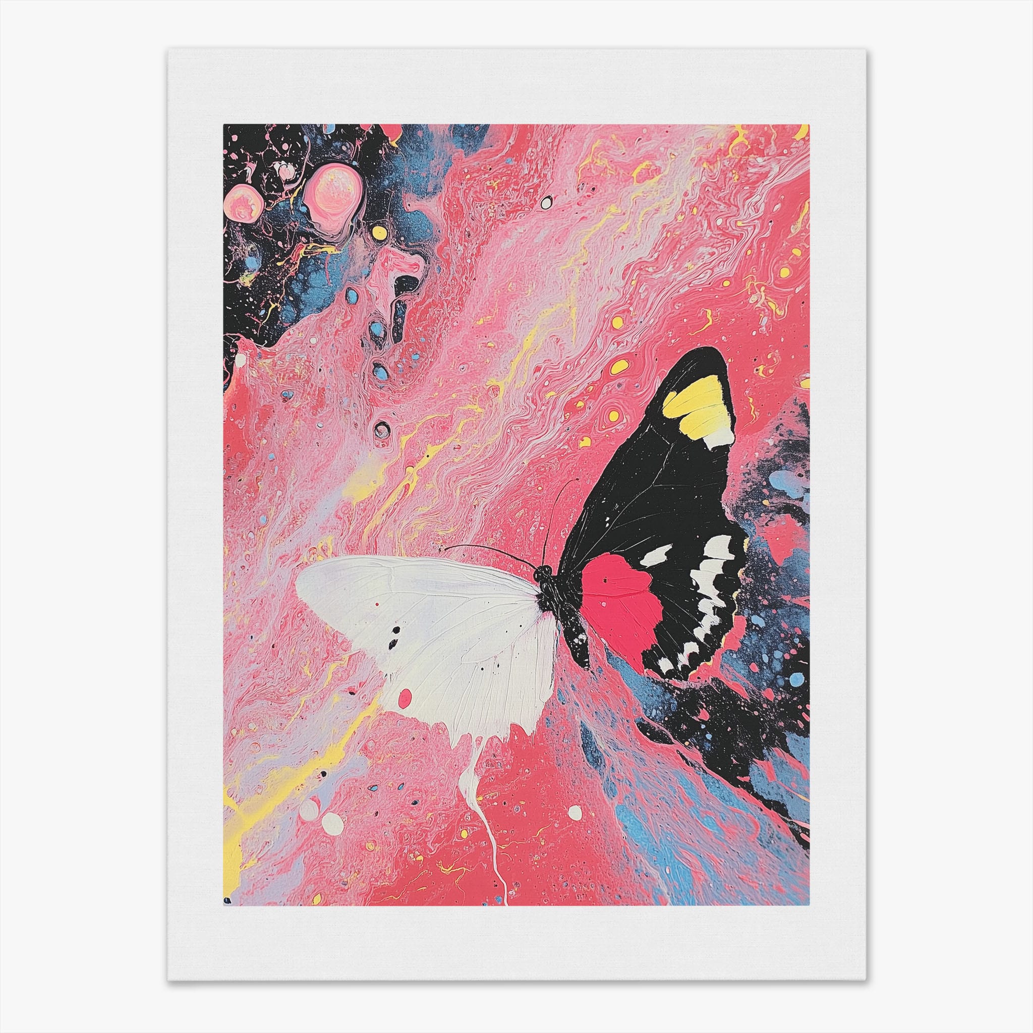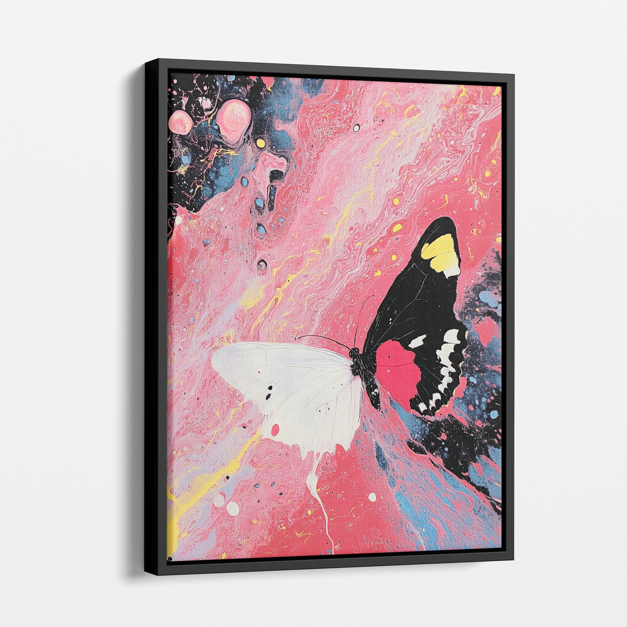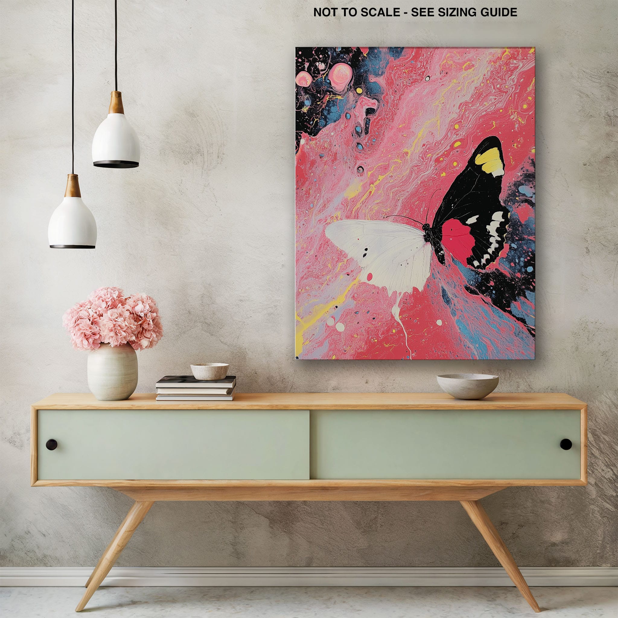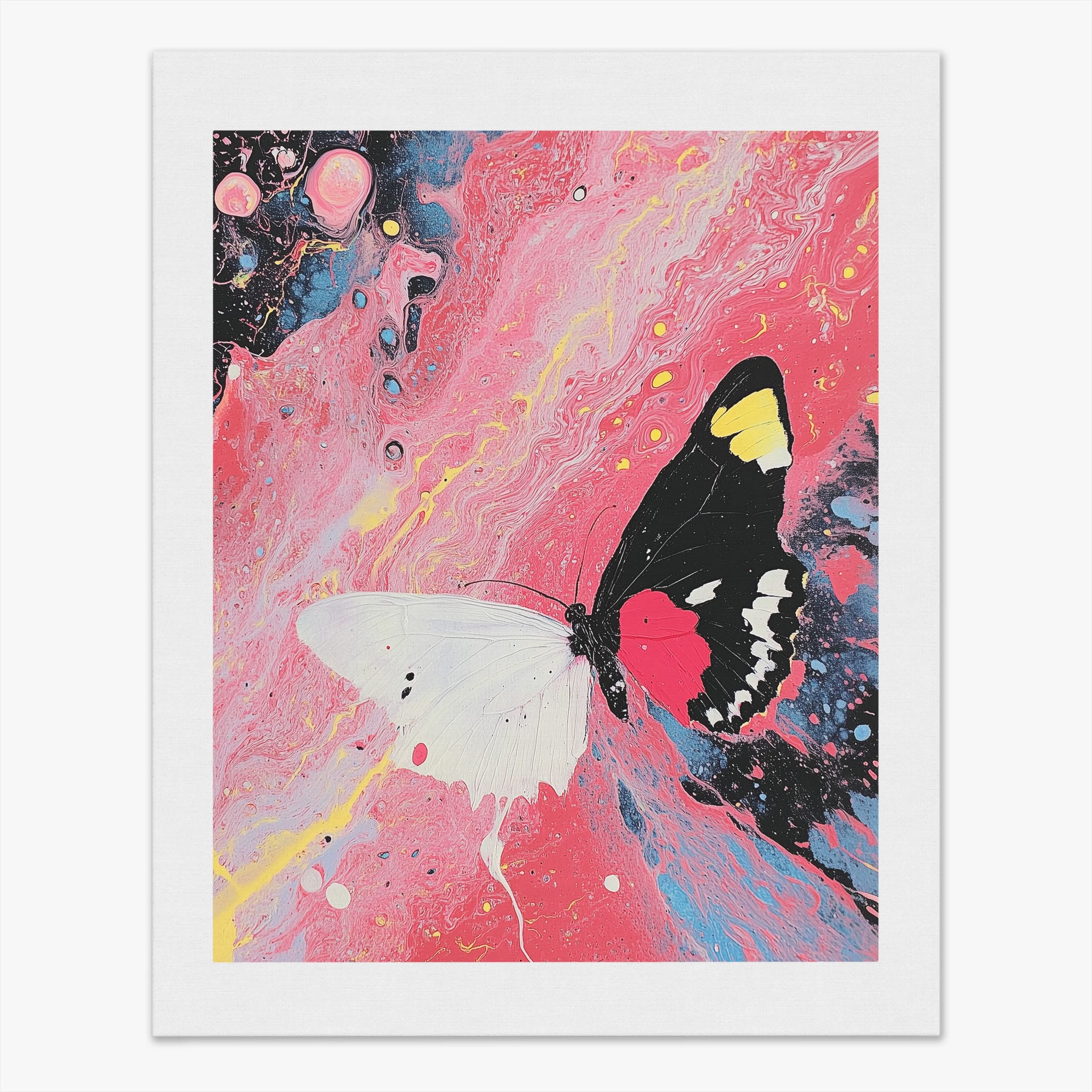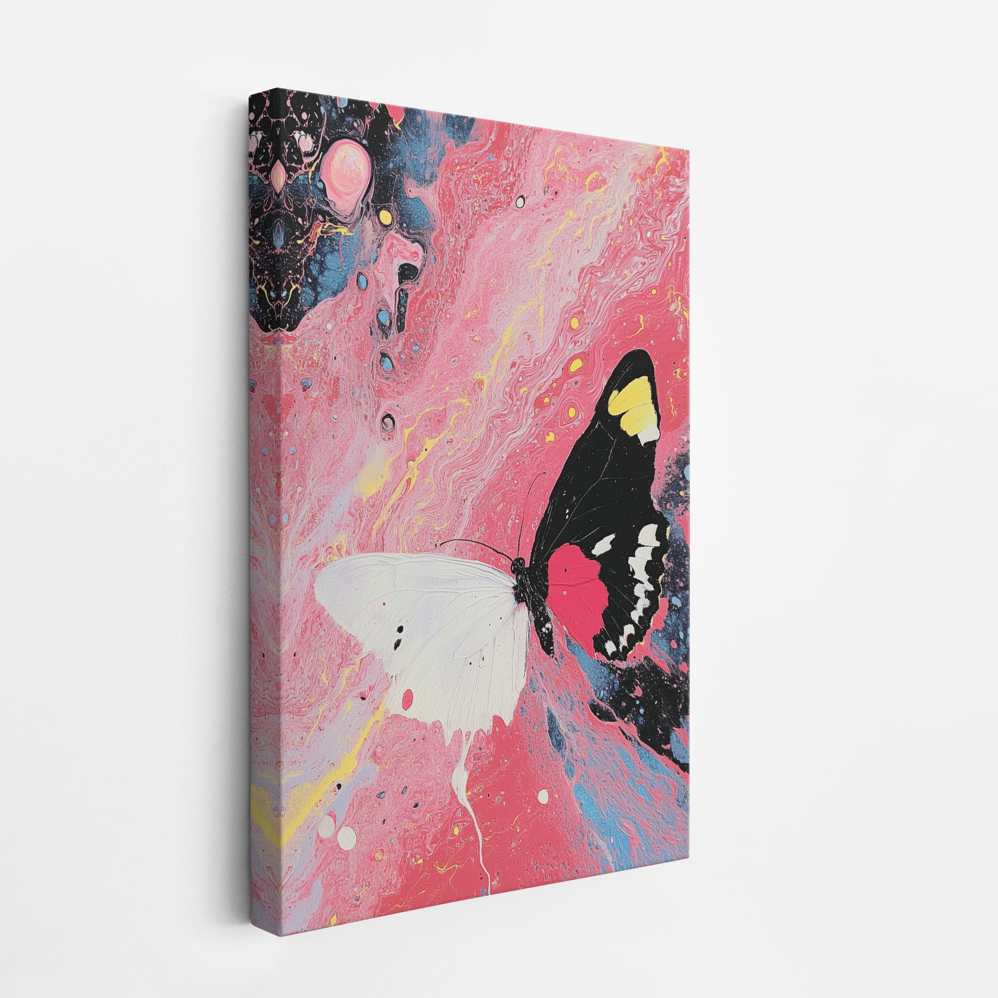 This artistic painting features a vibrantly depicted butterfly, its wings contrasting starkly against a swirling abstract background of deep blues, vivid pinks, and splashes of yellow. The use of bold, fluid strokes encapsulates an energetic mixture of motion, making the viewer feel as though they are witnessing the butterfly's gentle movements in real time. Perfect for art lovers looking to add a splash of color and a surrealistic touch to their space, this piece is sure to attract admiration and provoke conversation. Its abstract and surrealistic approach makes it ideal for modern decor settings that value unique and thought-provoking elements.