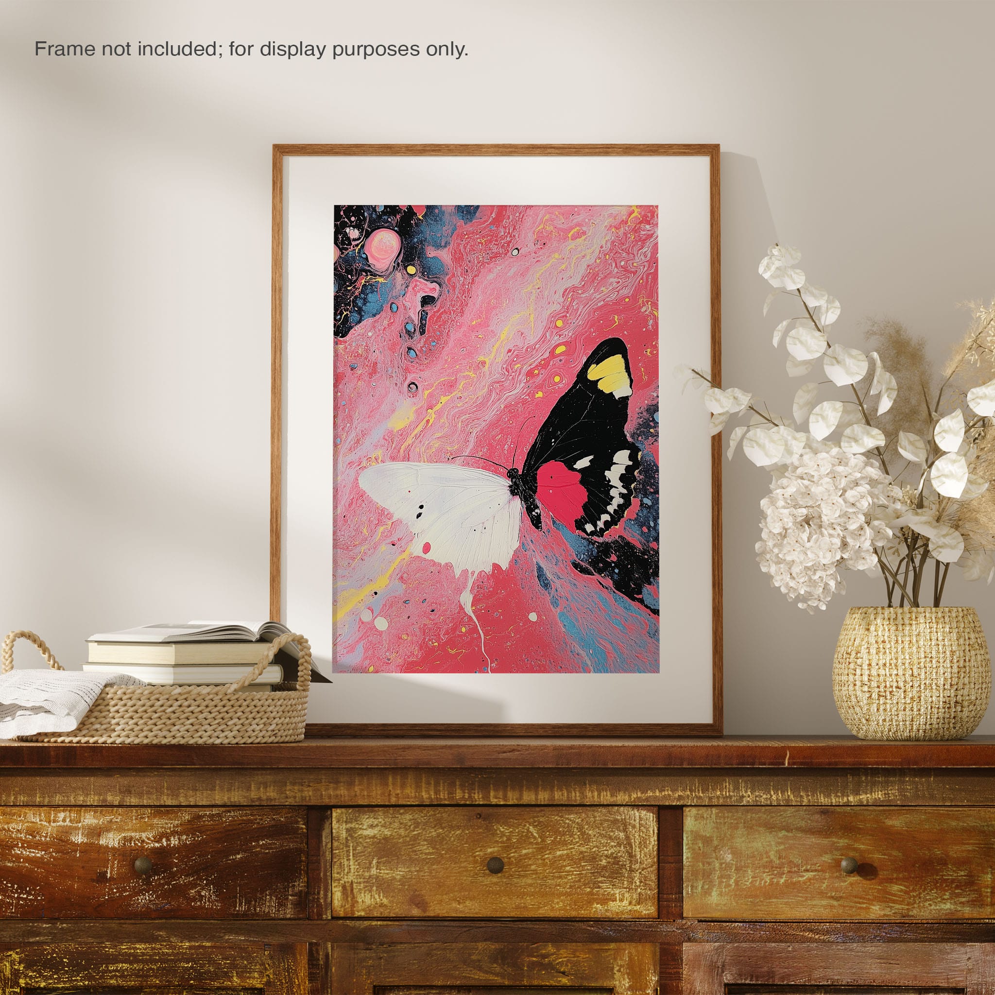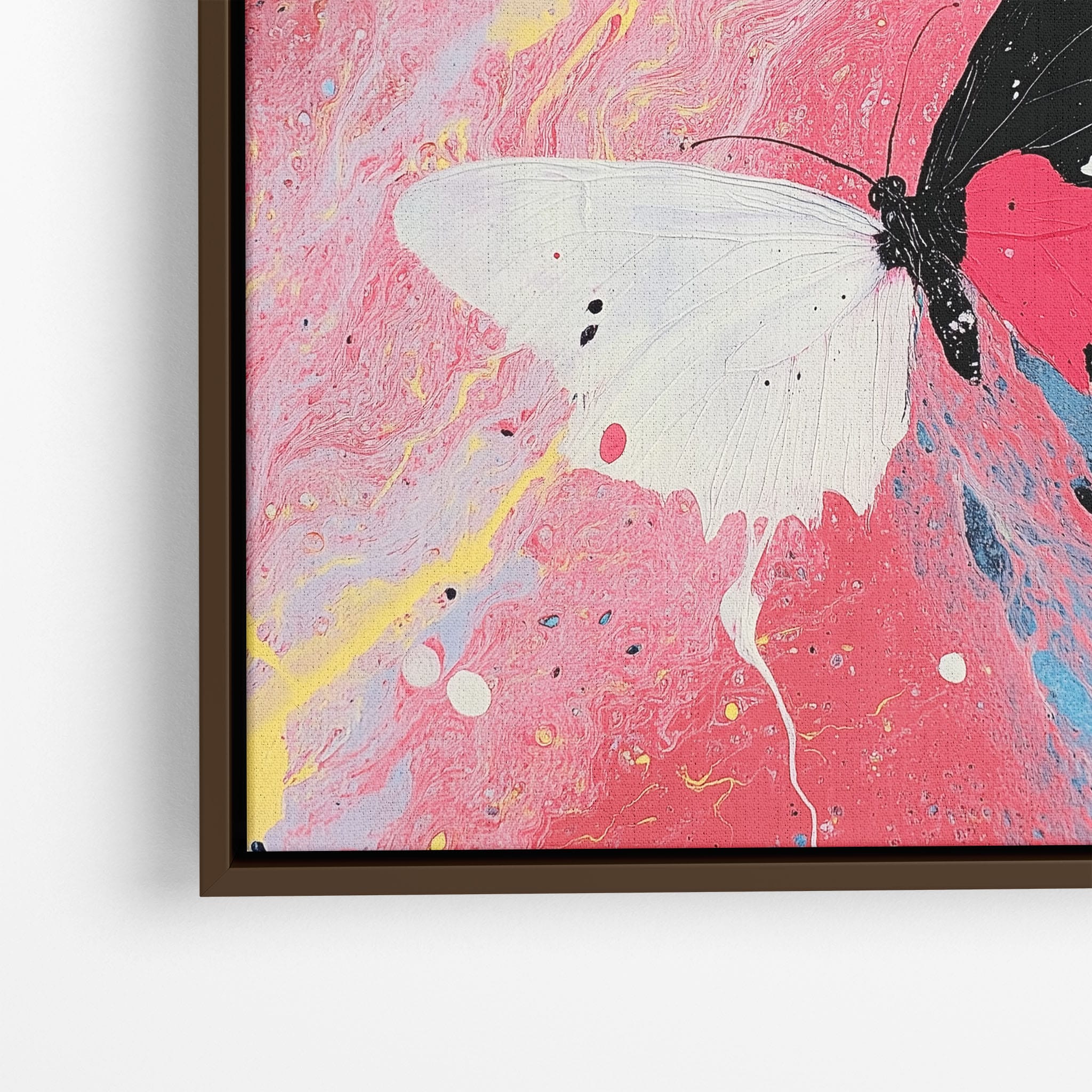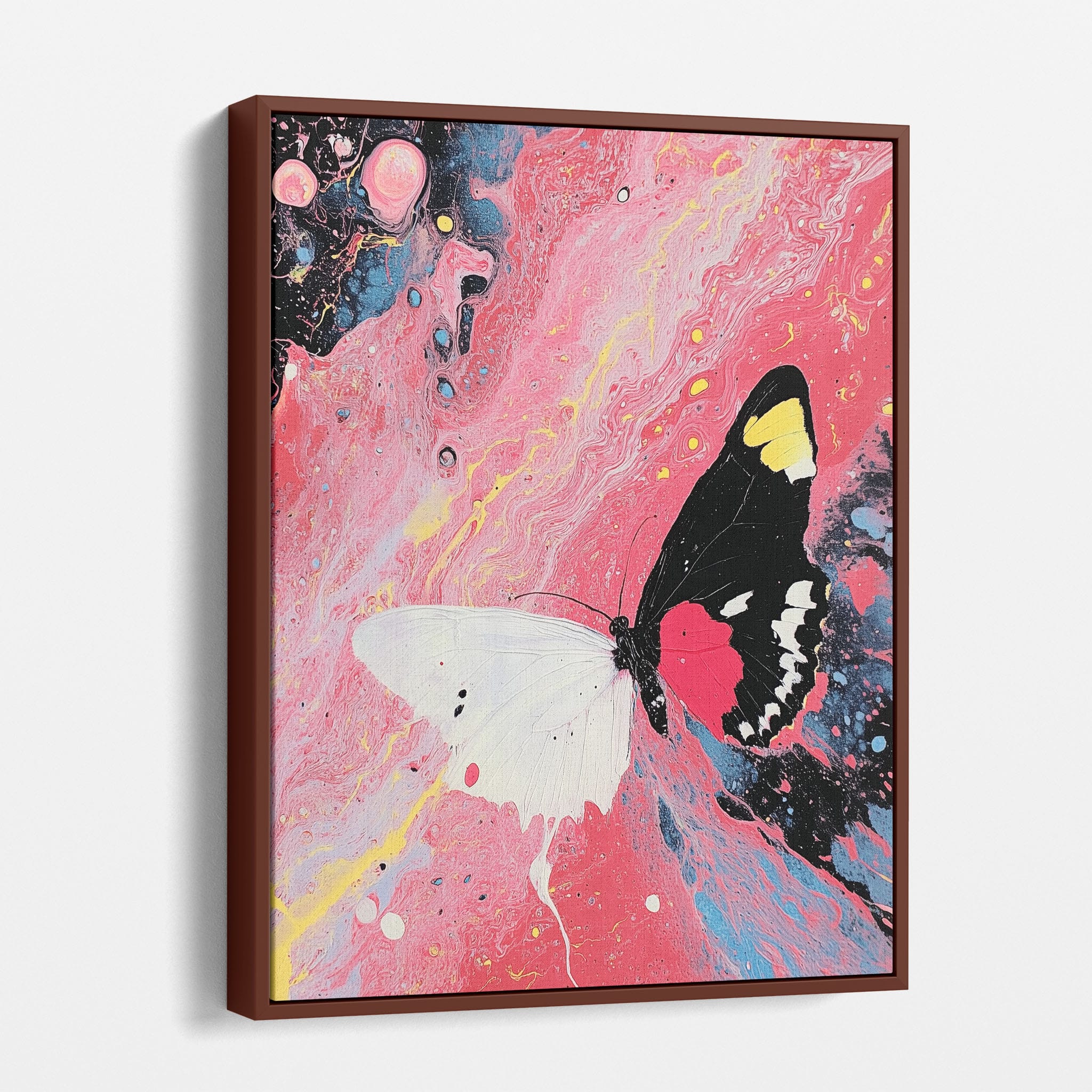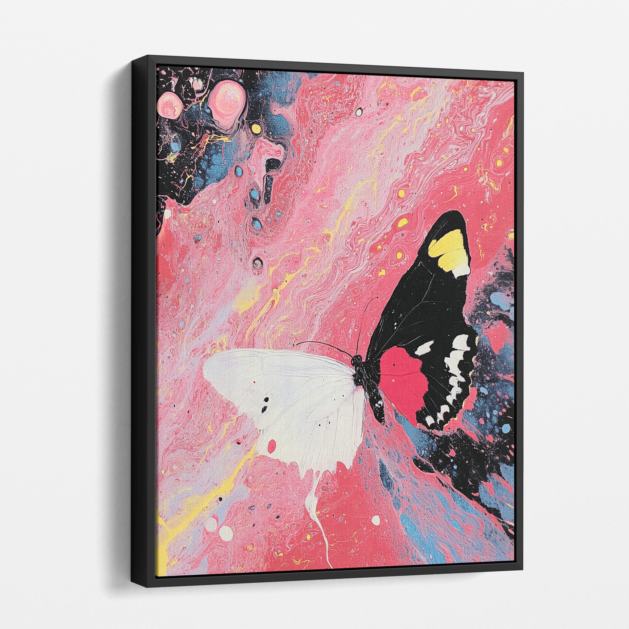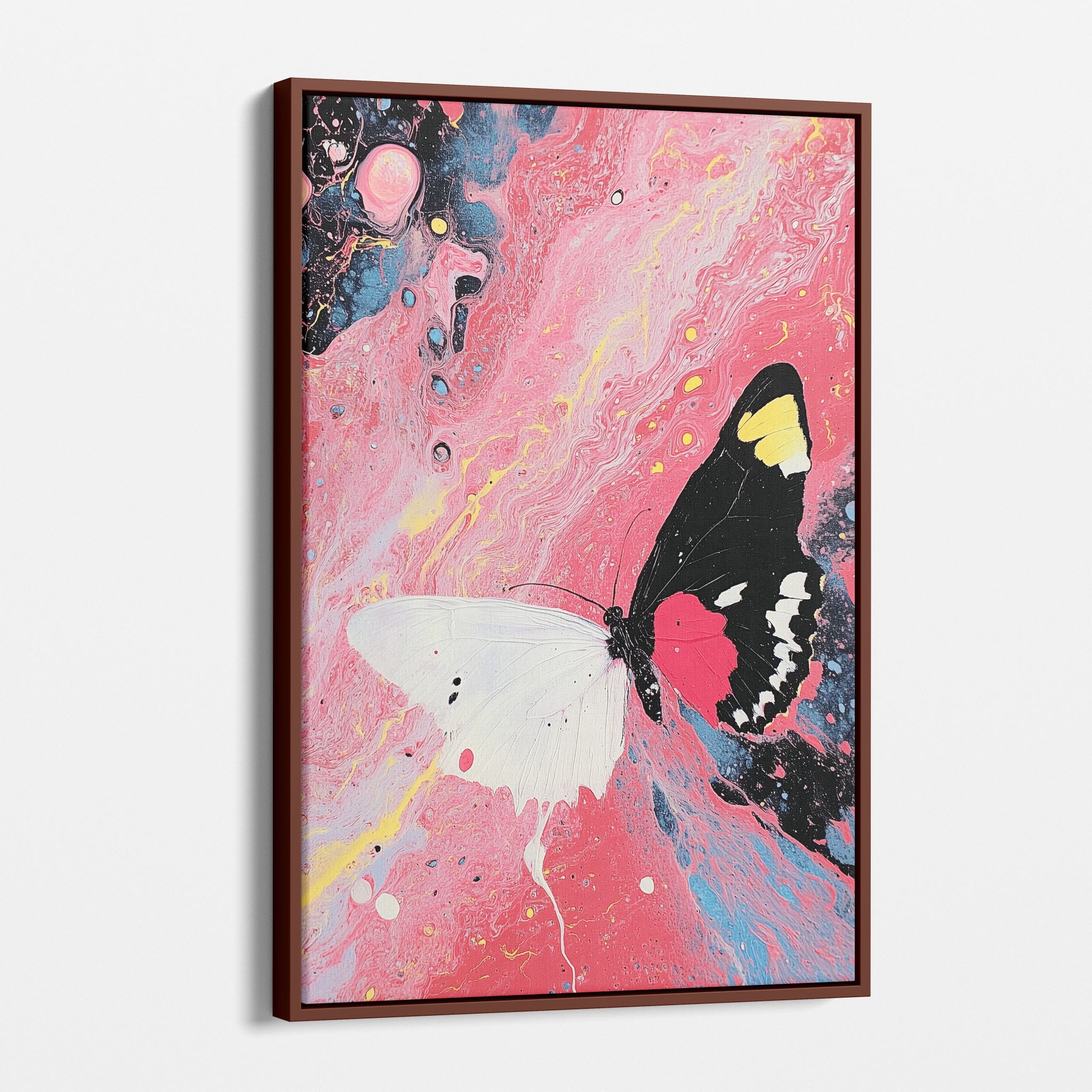 This artistic painting features a vibrantly depicted butterfly, its wings contrasting starkly against a swirling abstract background of deep blues, vivid pinks, and splashes of yellow. The use of bold, fluid strokes encapsulates an energetic mixture of motion, making the viewer feel as though they are witnessing the butterfly's gentle movements in real time. Perfect for art lovers looking to add a splash of color and a surrealistic touch to their space, this piece is sure to attract admiration and provoke conversation. Its abstract and surrealistic approach makes it ideal for modern decor settings that value unique and thought-provoking elements.
