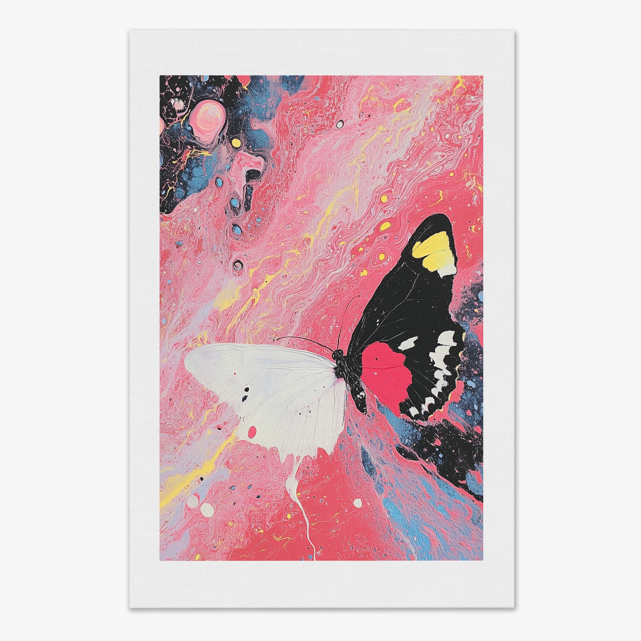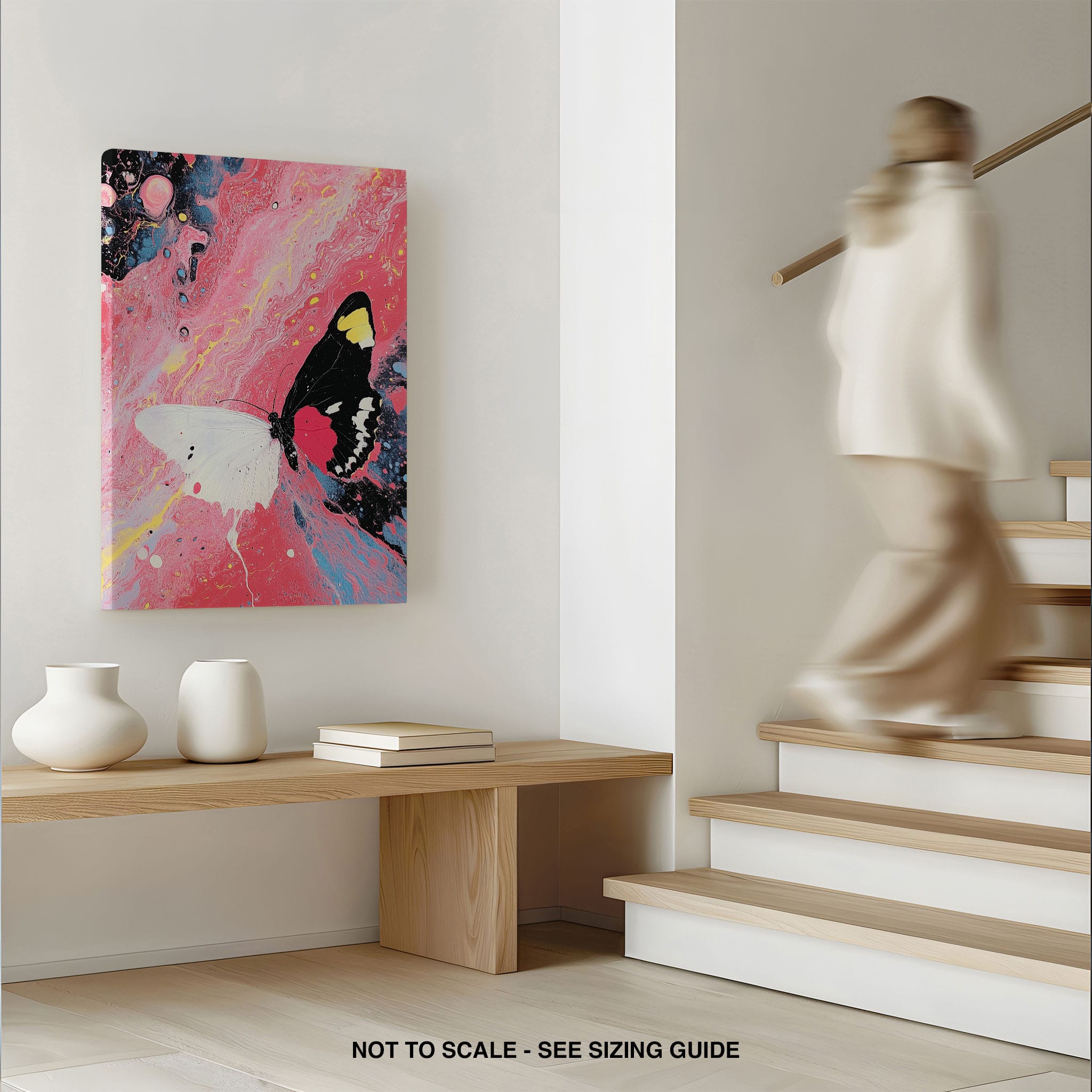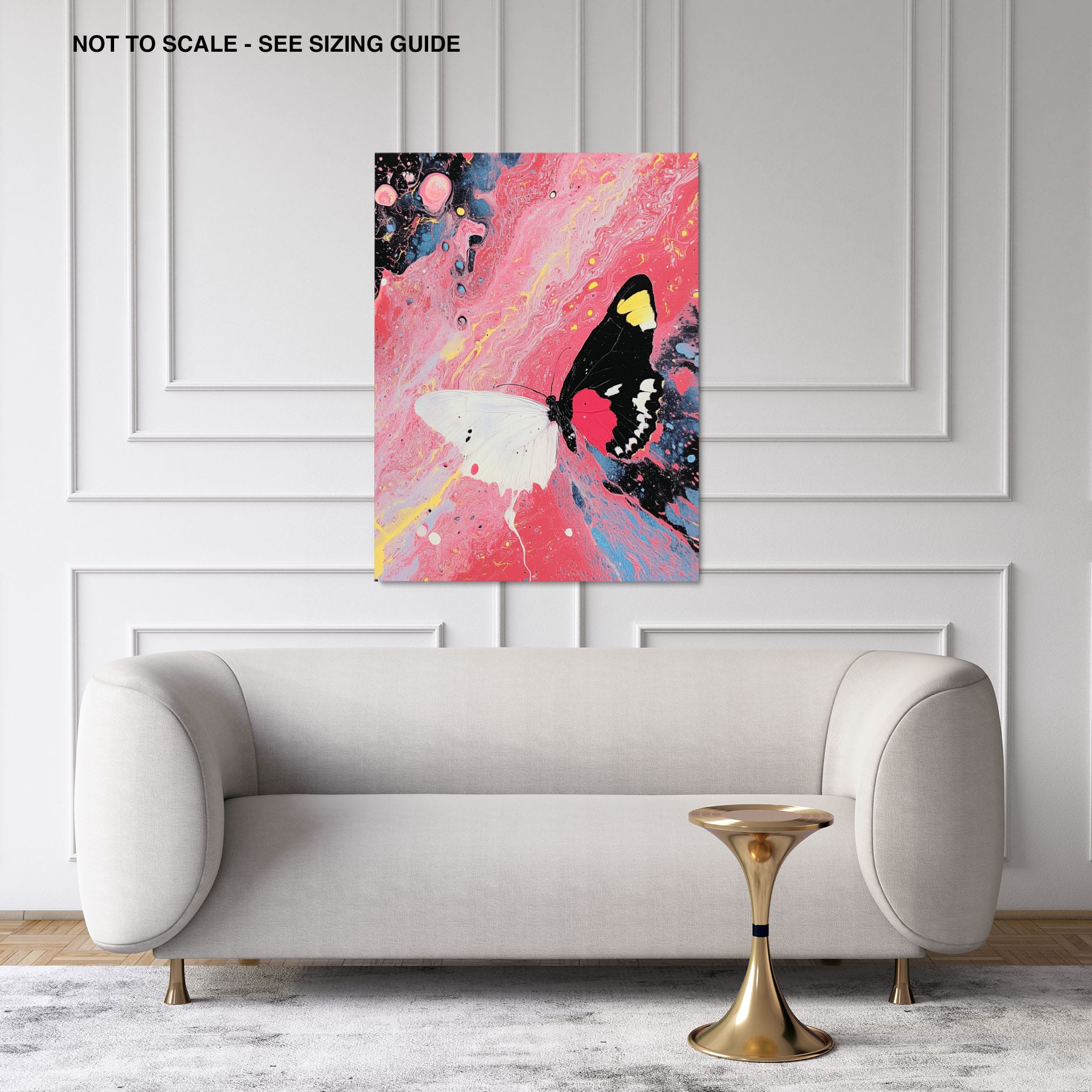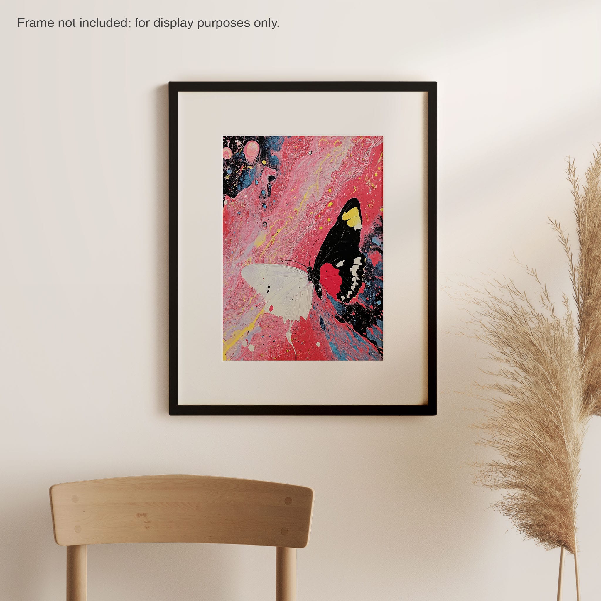 This artistic painting features a vibrantly depicted butterfly, its wings contrasting starkly against a swirling abstract background of deep blues, vivid pinks, and splashes of yellow. The use of bold, fluid strokes encapsulates an energetic mixture of motion, making the viewer feel as though they are witnessing the butterfly's gentle movements in real time. Perfect for art lovers looking to add a splash of color and a surrealistic touch to their space, this piece is sure to attract admiration and provoke conversation. Its abstract and surrealistic approach makes it ideal for modern decor settings that value unique and thought-provoking elements.