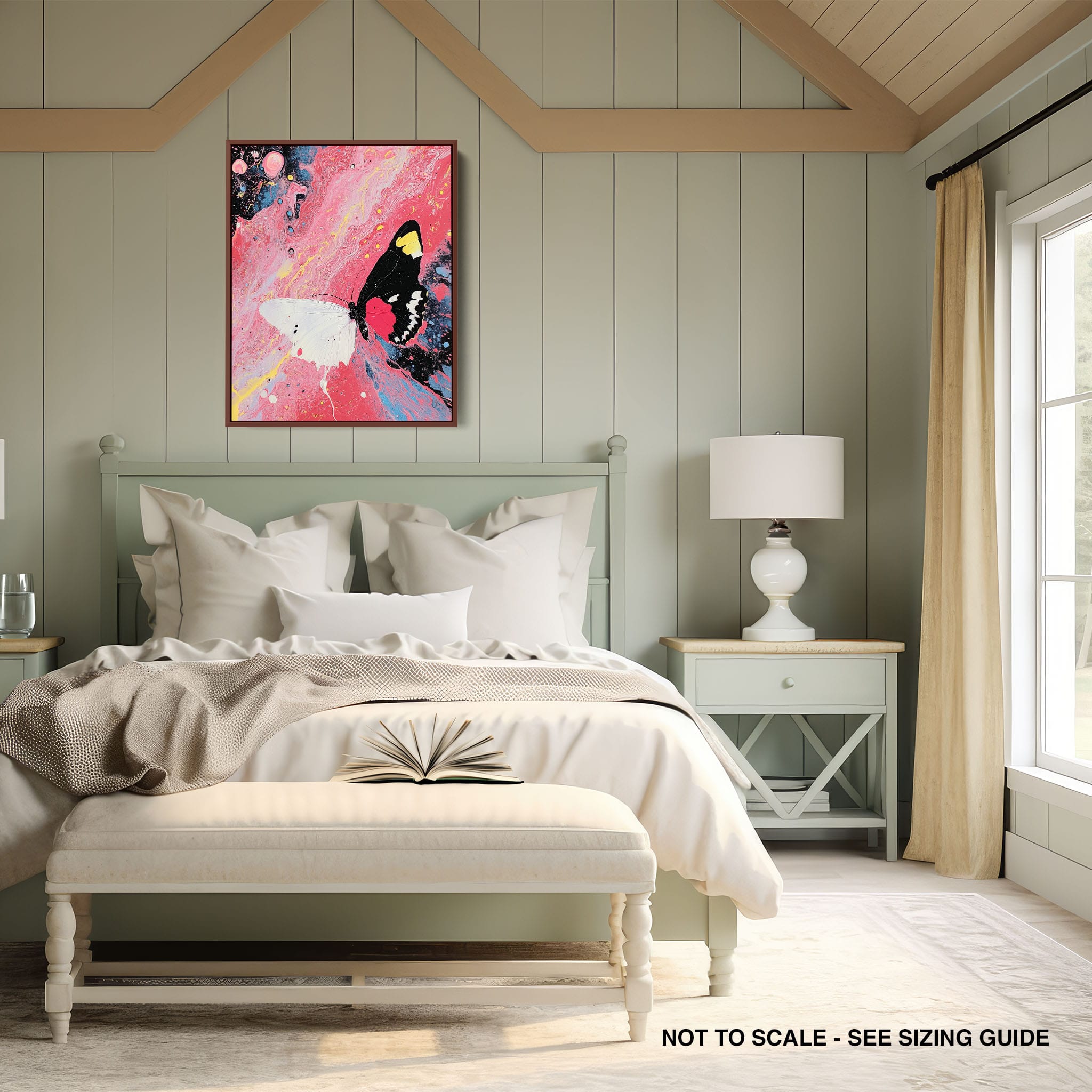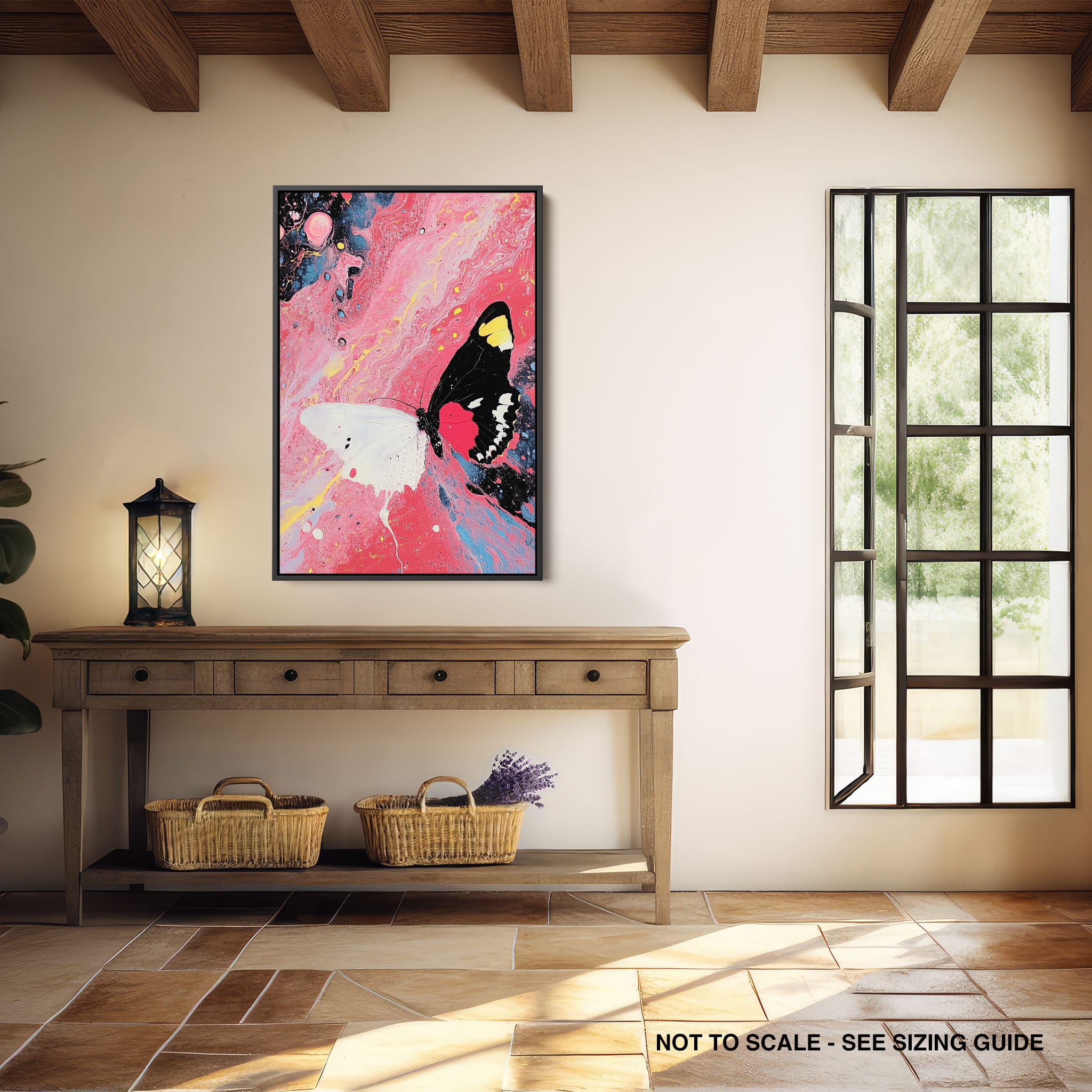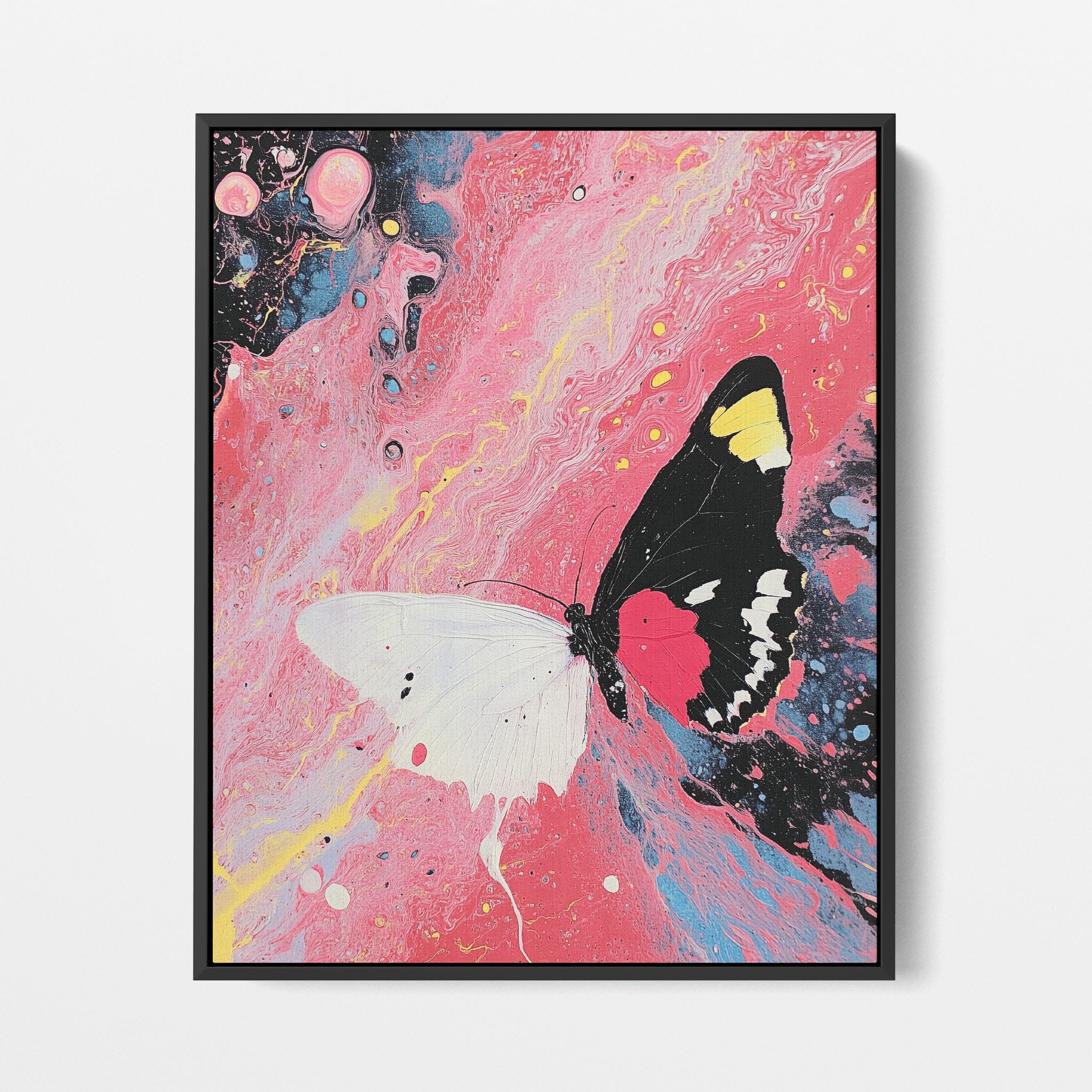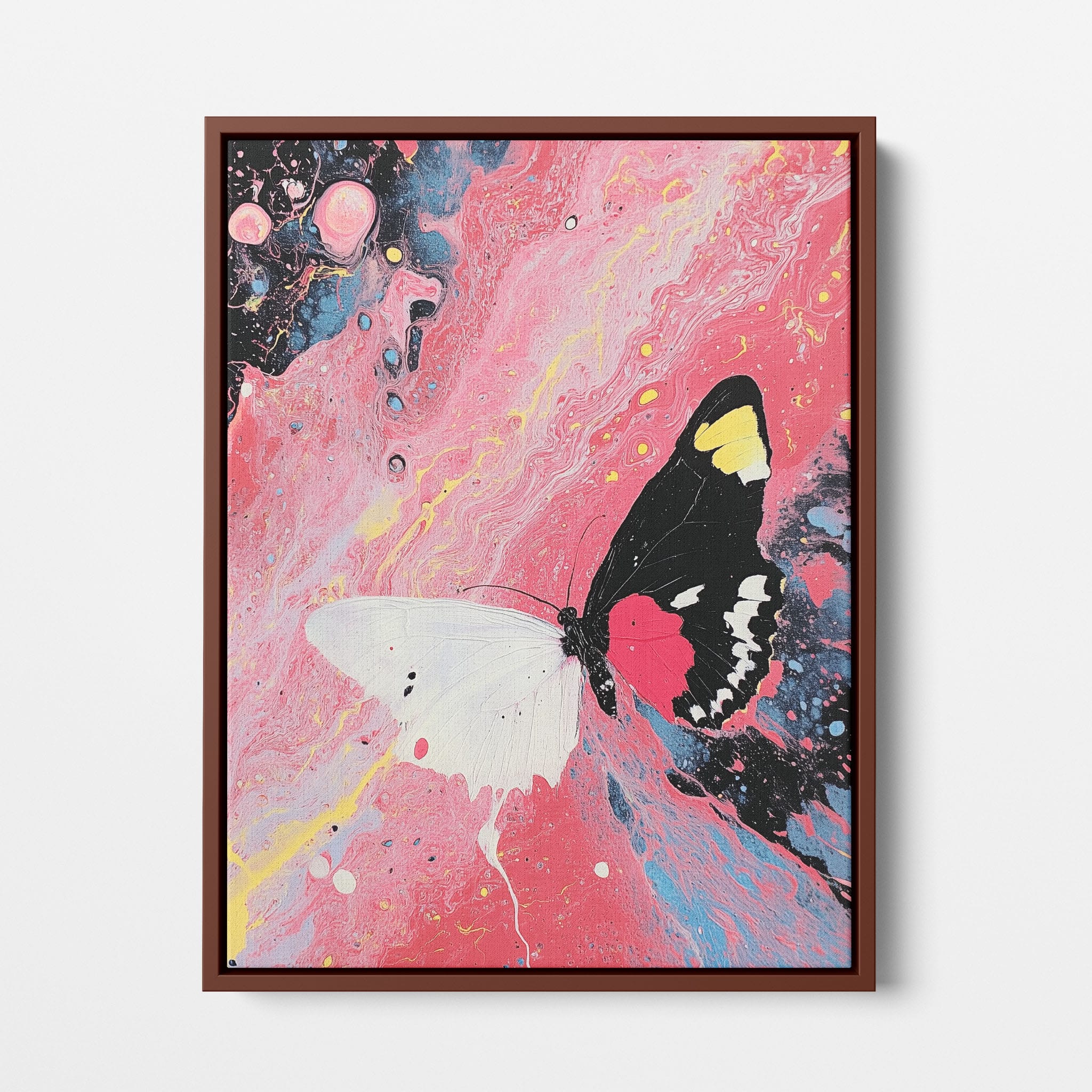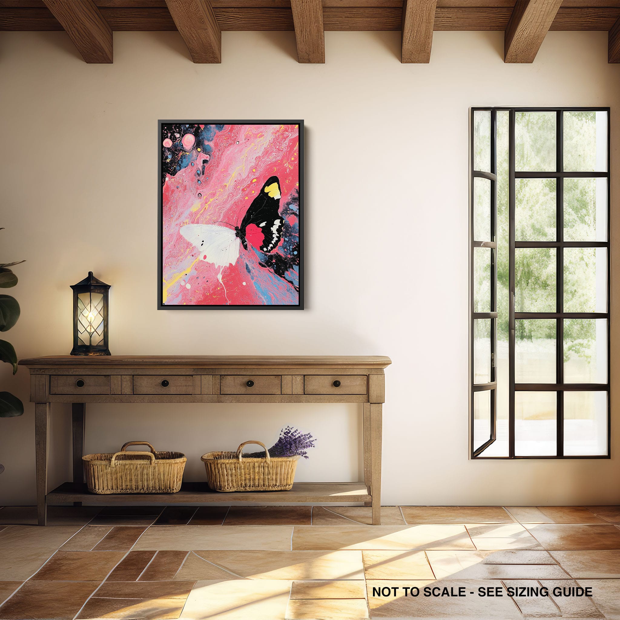 This artistic painting features a vibrantly depicted butterfly, its wings contrasting starkly against a swirling abstract background of deep blues, vivid pinks, and splashes of yellow. The use of bold, fluid strokes encapsulates an energetic mixture of motion, making the viewer feel as though they are witnessing the butterfly's gentle movements in real time. Perfect for art lovers looking to add a splash of color and a surrealistic touch to their space, this piece is sure to attract admiration and provoke conversation. Its abstract and surrealistic approach makes it ideal for modern decor settings that value unique and thought-provoking elements.