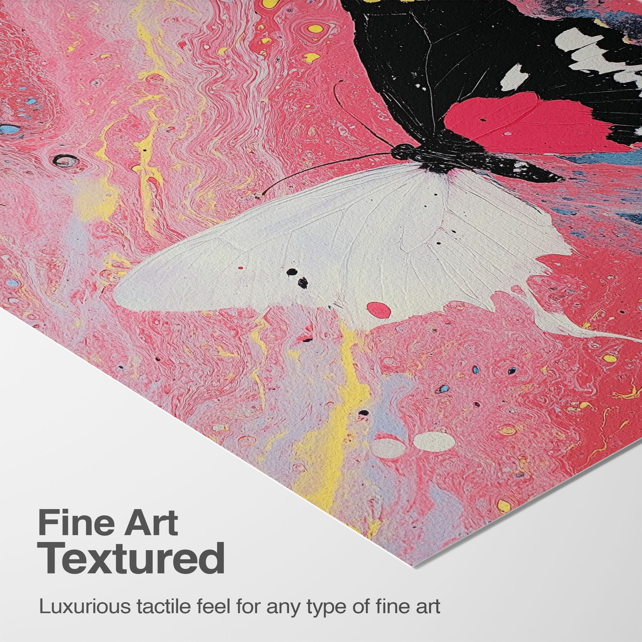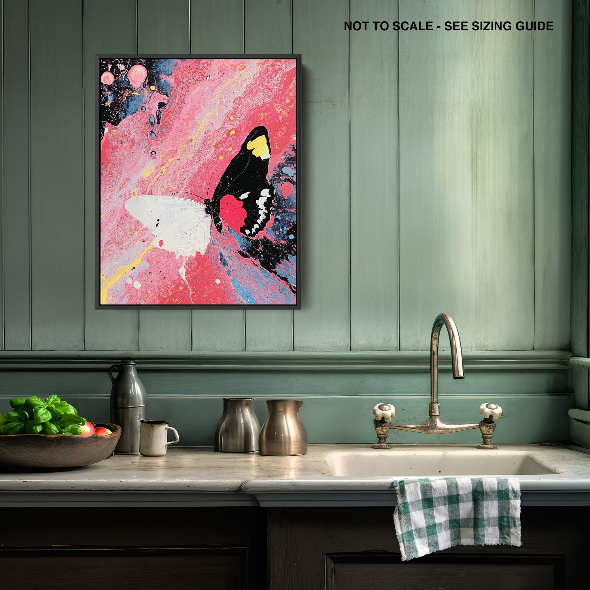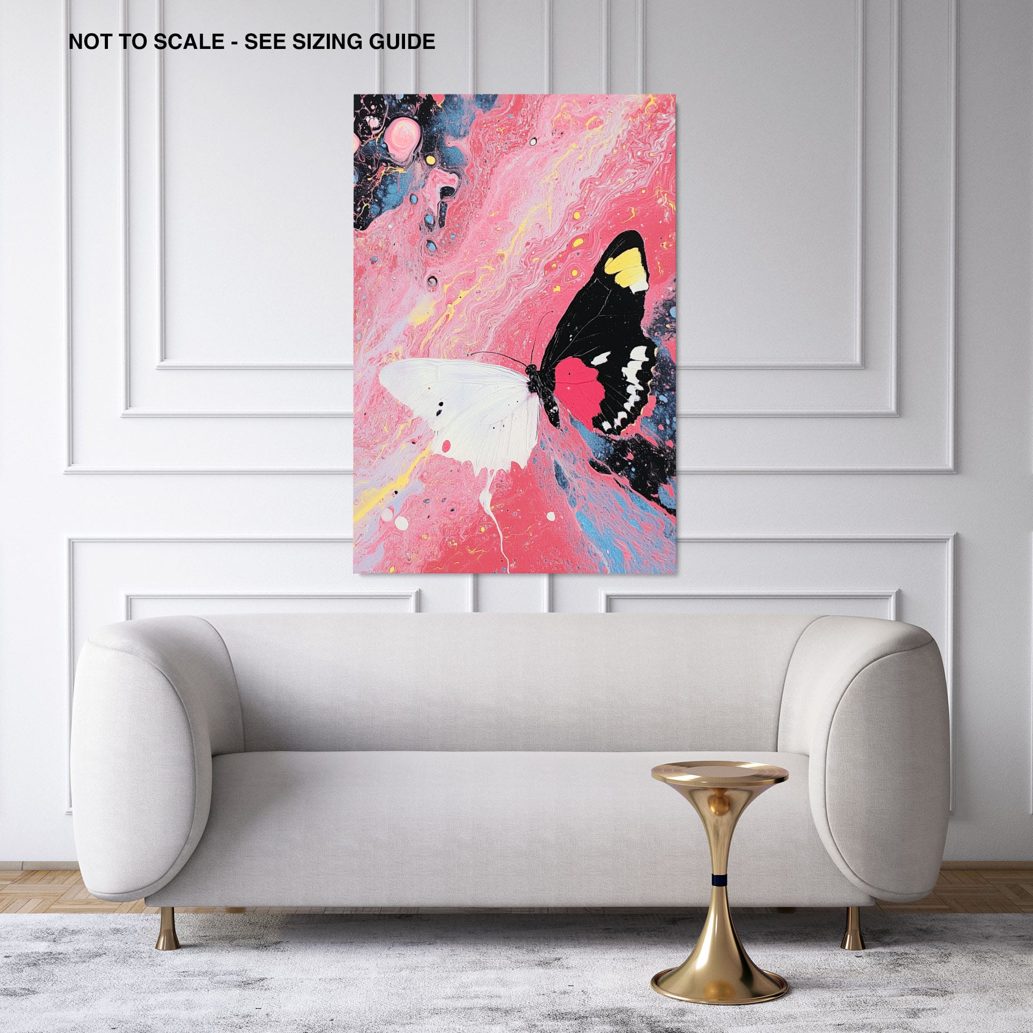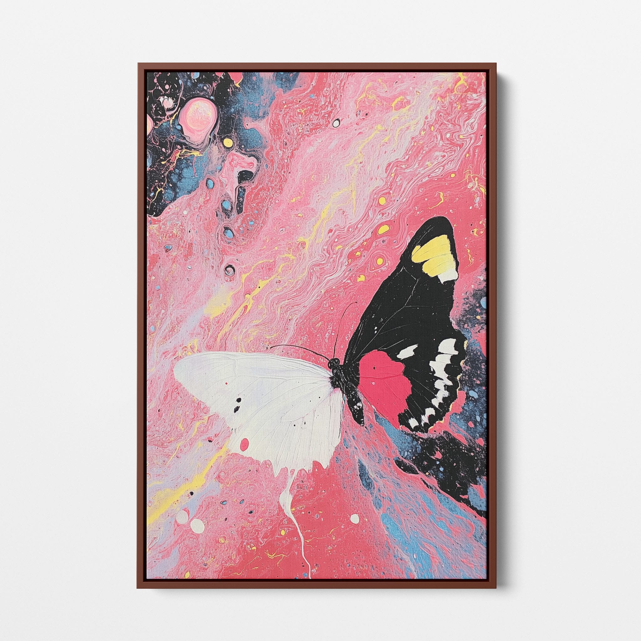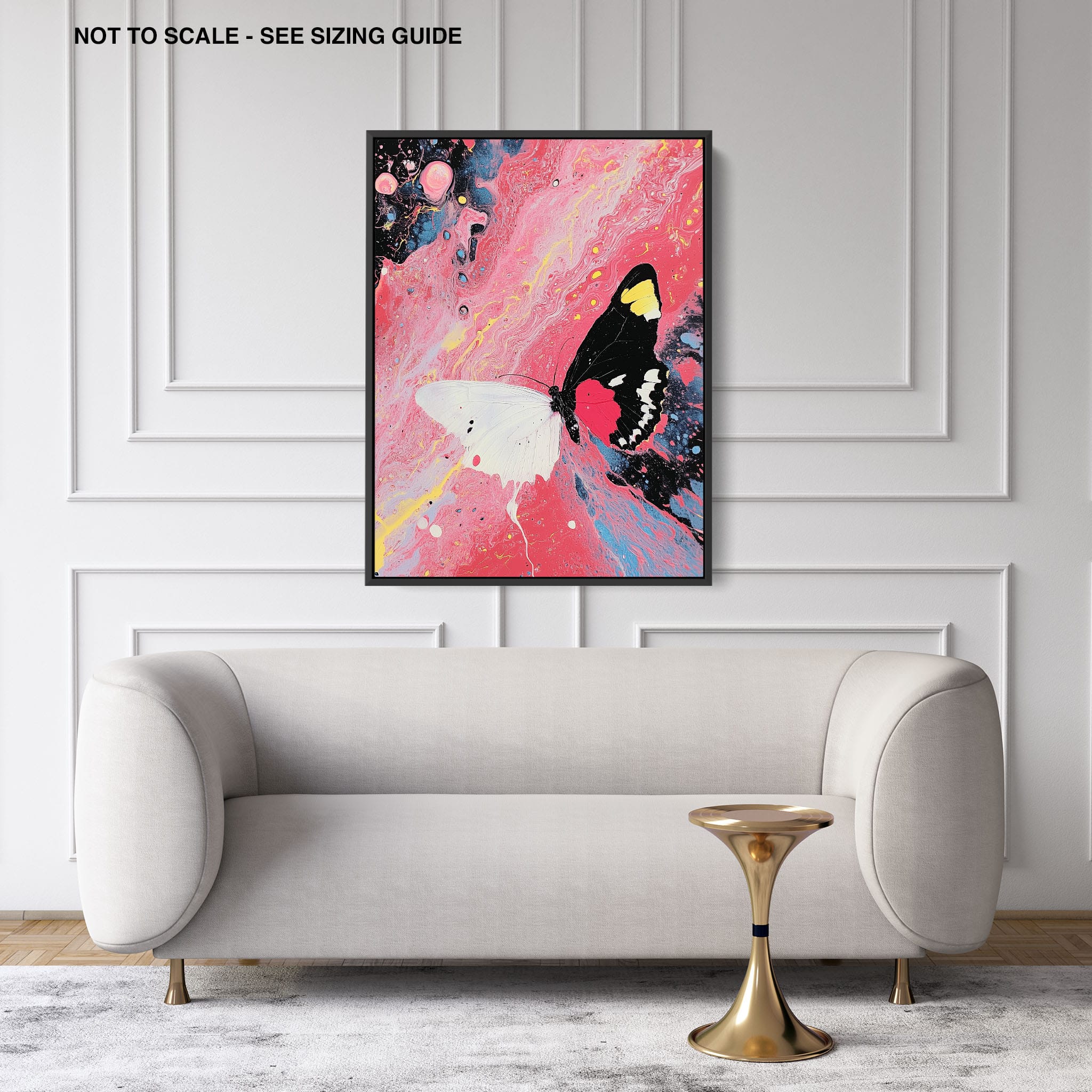 This artistic painting features a vibrantly depicted butterfly, its wings contrasting starkly against a swirling abstract background of deep blues, vivid pinks, and splashes of yellow. The use of bold, fluid strokes encapsulates an energetic mixture of motion, making the viewer feel as though they are witnessing the butterfly's gentle movements in real time. Perfect for art lovers looking to add a splash of color and a surrealistic touch to their space, this piece is sure to attract admiration and provoke conversation. Its abstract and surrealistic approach makes it ideal for modern decor settings that value unique and thought-provoking elements.