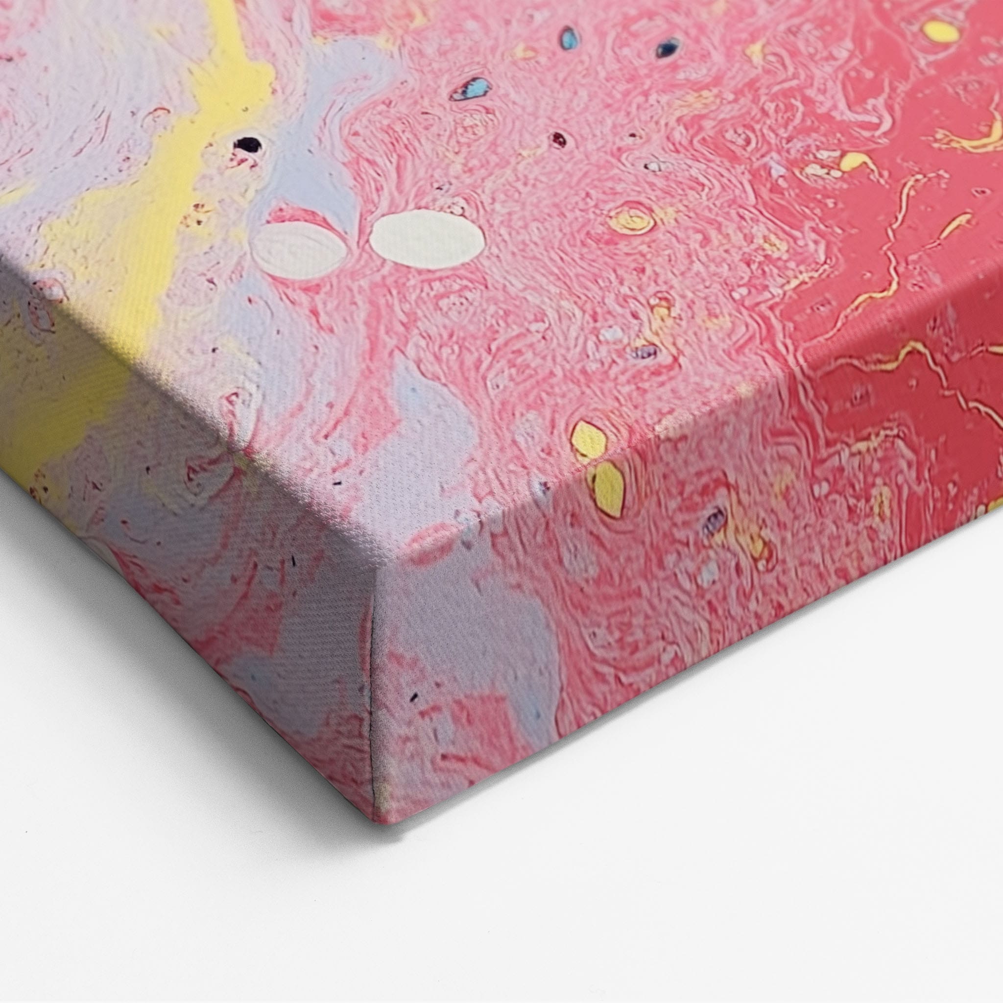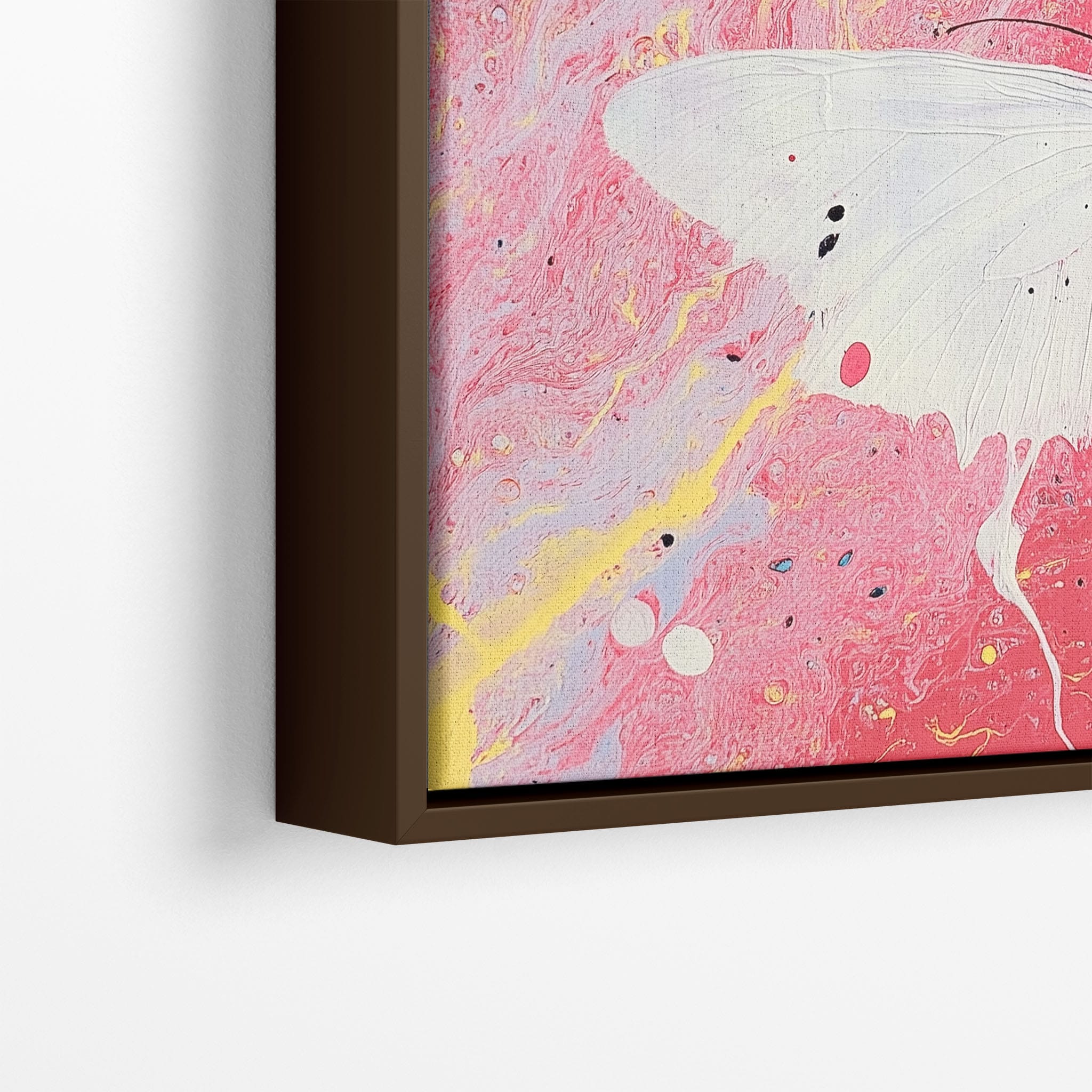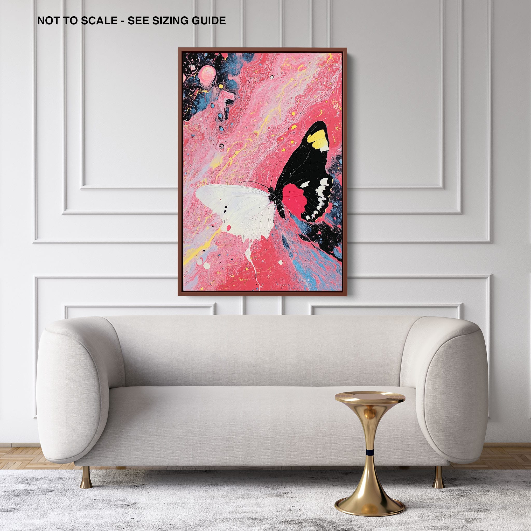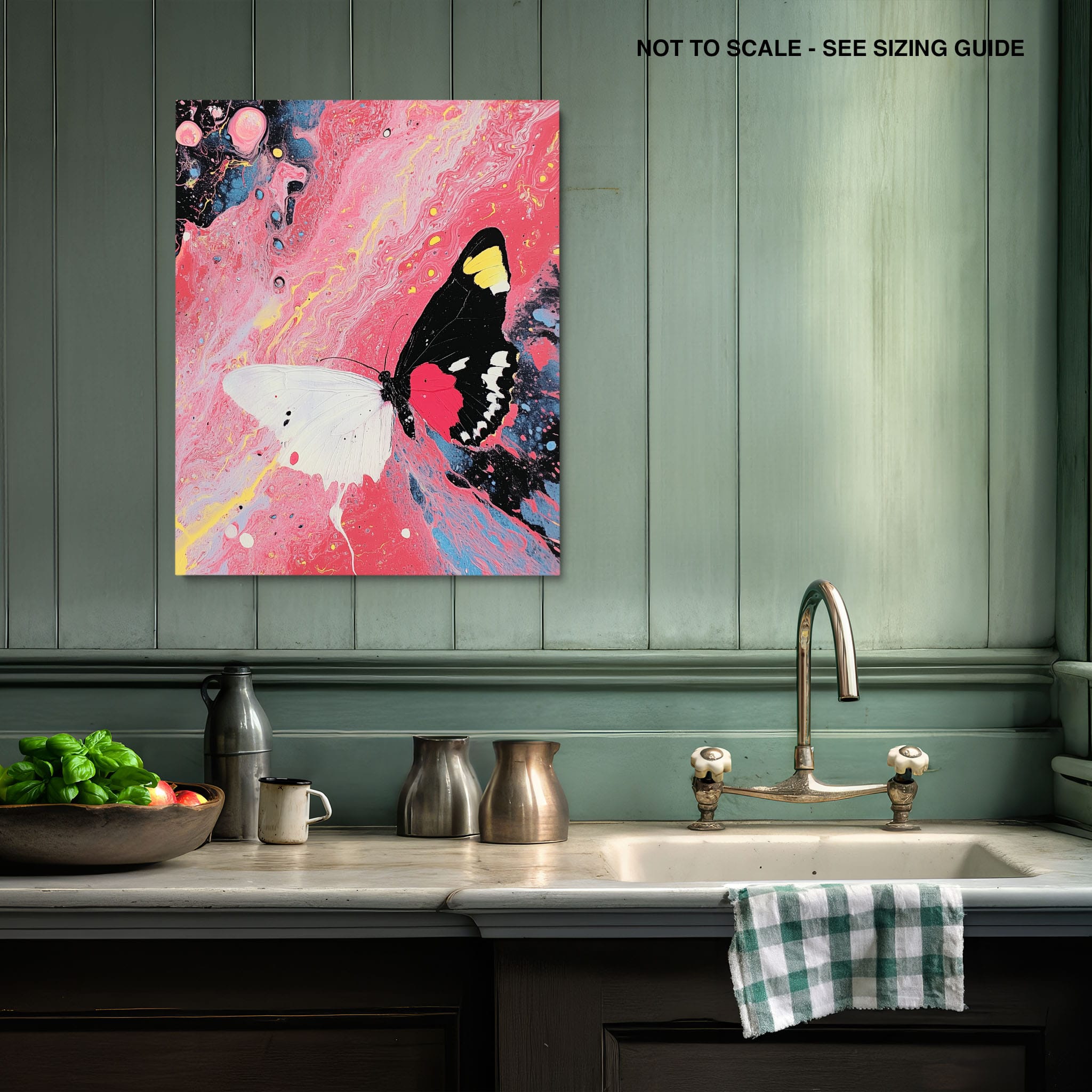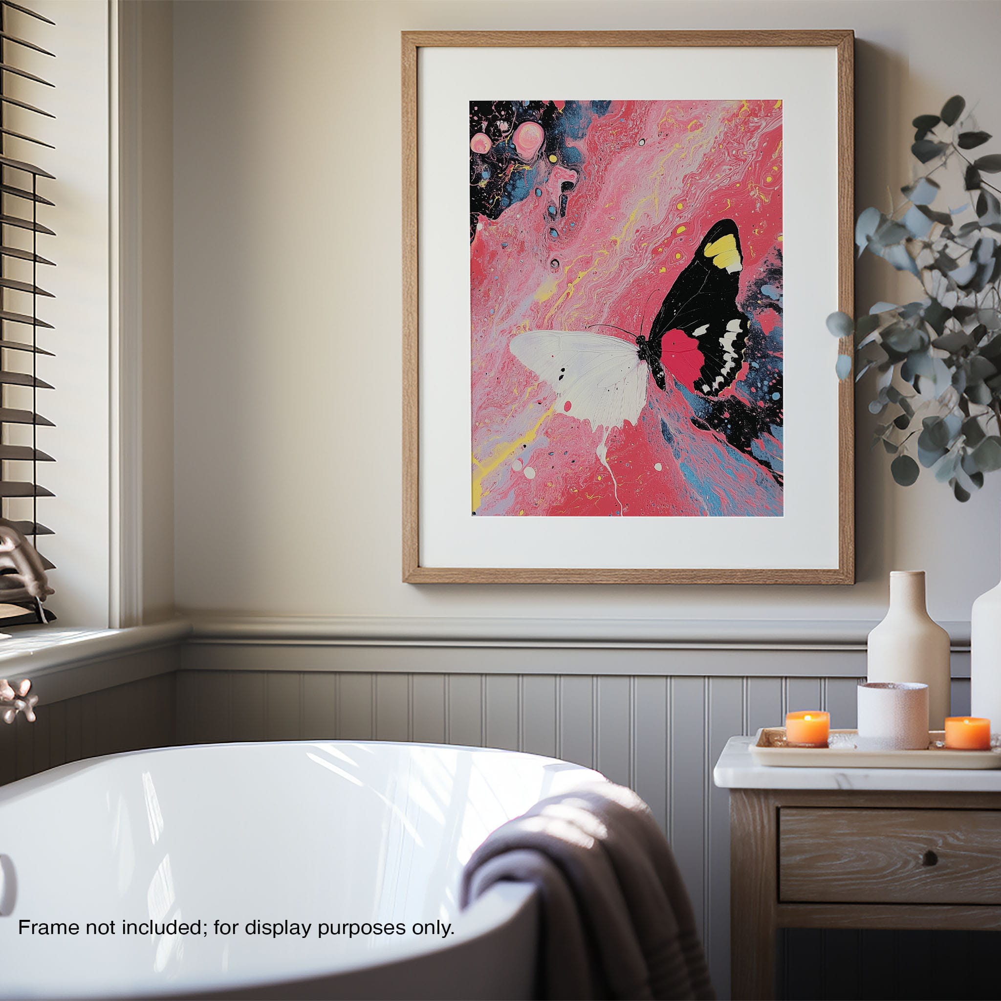 This artistic painting features a vibrantly depicted butterfly, its wings contrasting starkly against a swirling abstract background of deep blues, vivid pinks, and splashes of yellow. The use of bold, fluid strokes encapsulates an energetic mixture of motion, making the viewer feel as though they are witnessing the butterfly's gentle movements in real time. Perfect for art lovers looking to add a splash of color and a surrealistic touch to their space, this piece is sure to attract admiration and provoke conversation. Its abstract and surrealistic approach makes it ideal for modern decor settings that value unique and thought-provoking elements.