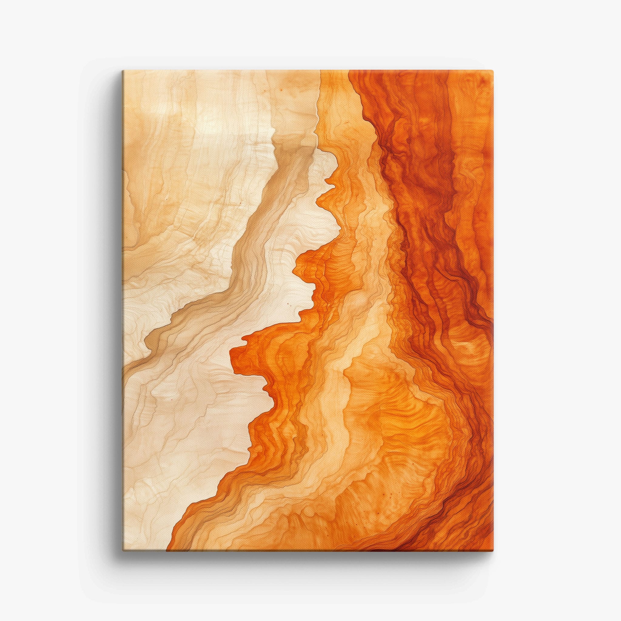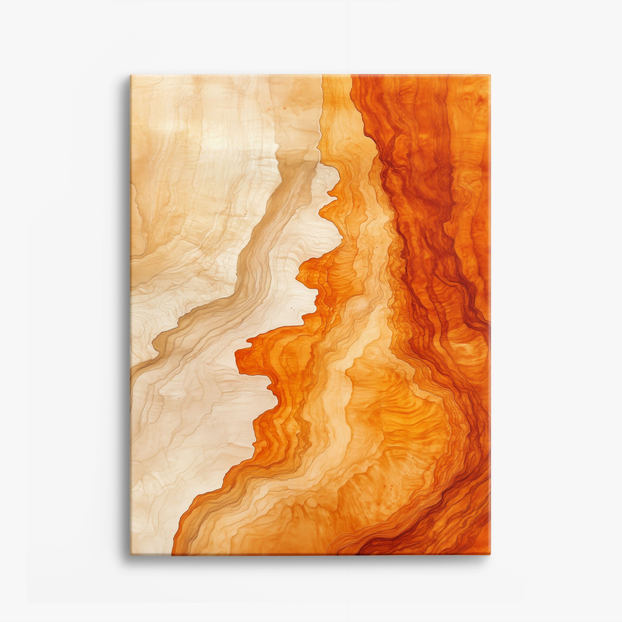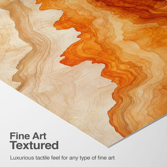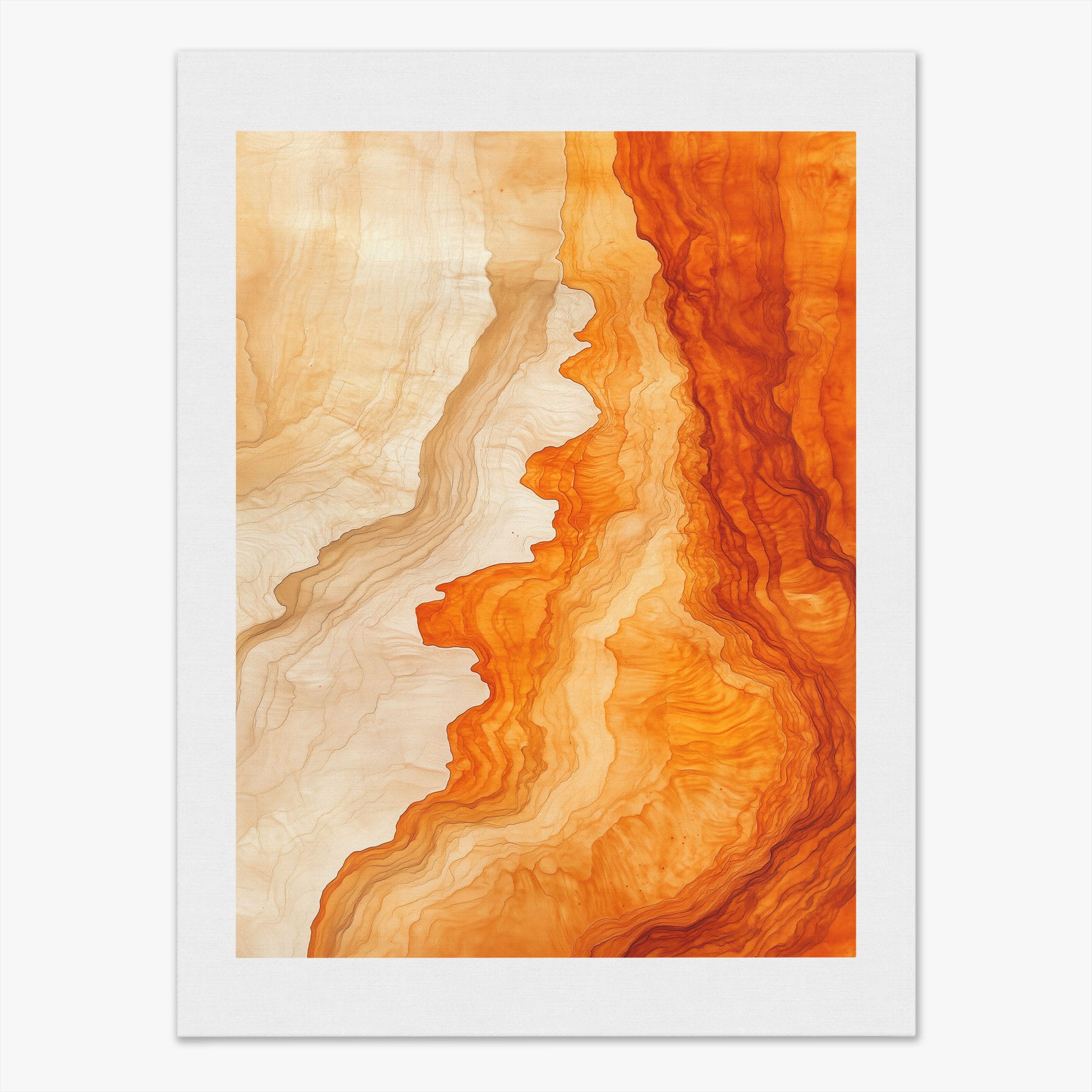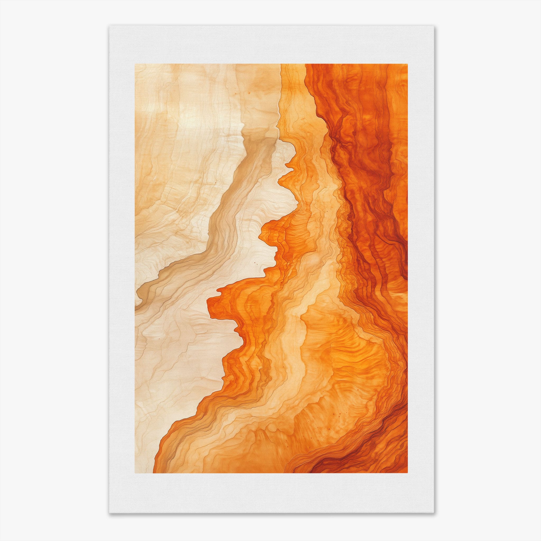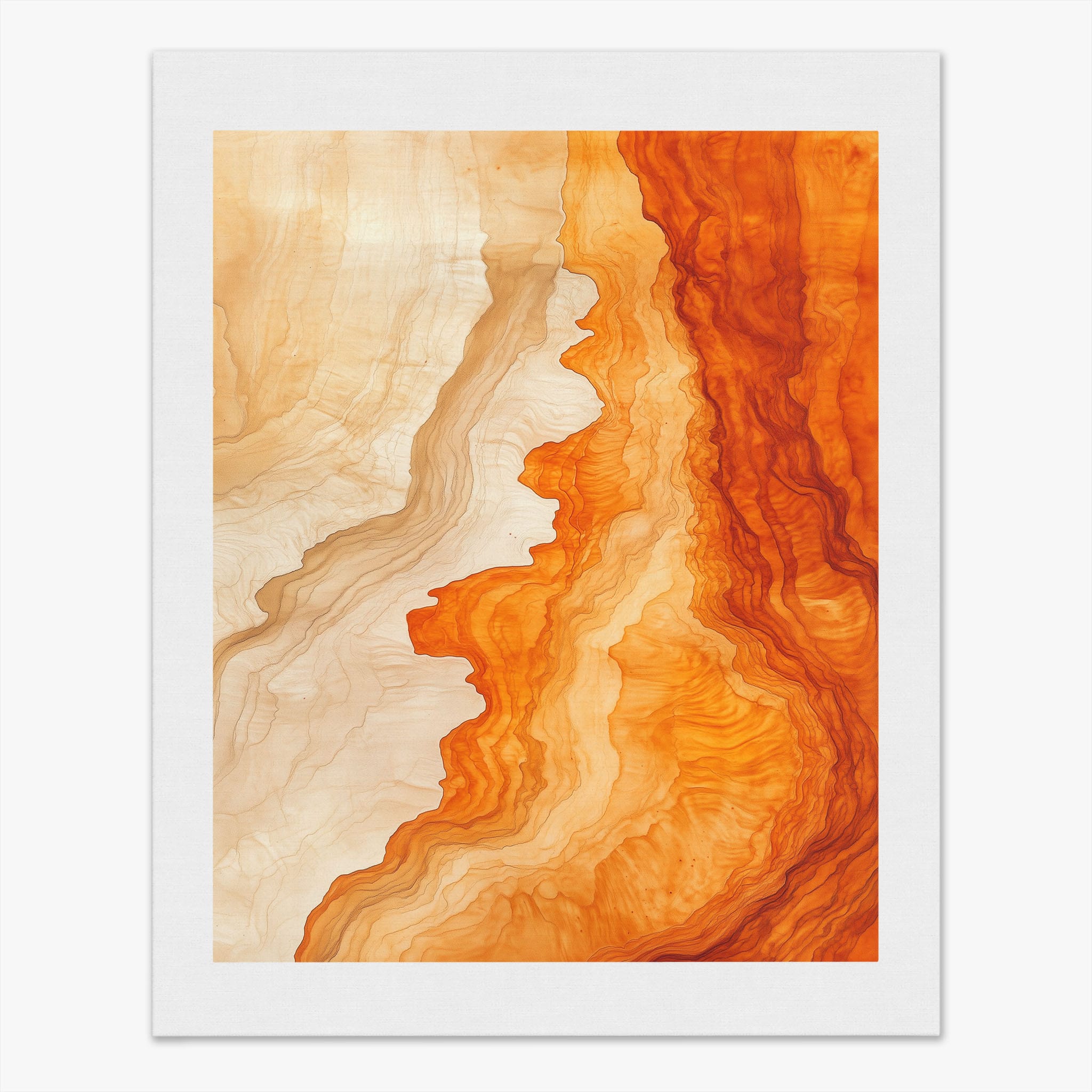 Experience the evocative power of this photographic artwork, where abstract forms and vivid colors mimic the rich tapestry of nature’s palette. The flowing lines in shades of deep oranges and soft creams capture the dynamic essence of geological strata, evoking thoughts of ancient landscapes sculpted over centuries. This piece, which resonates with abstract and surrealistic styles, invites the viewer to a visual journey through color and form. Perfect for bringing a piece of organic beauty into any contemporary space.
