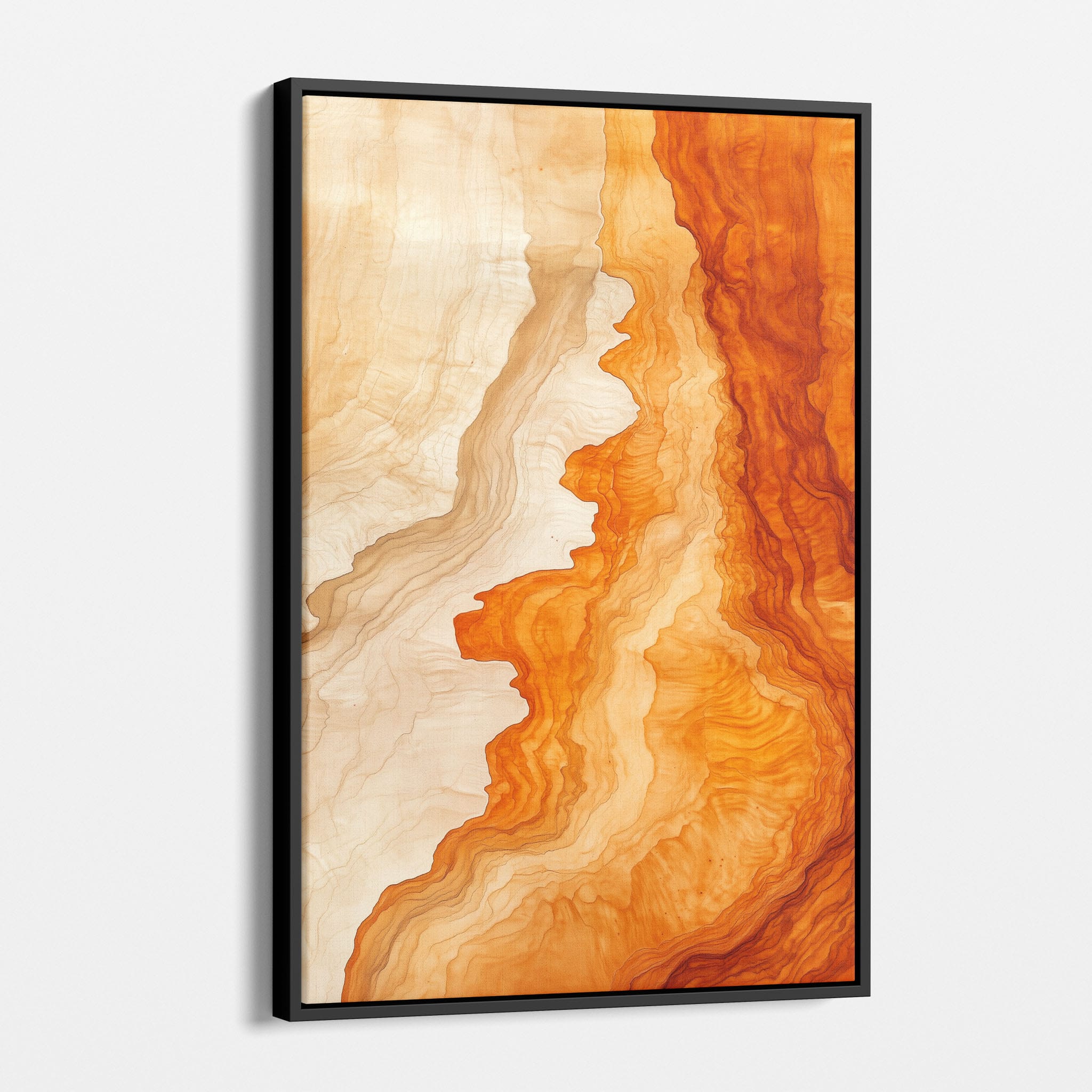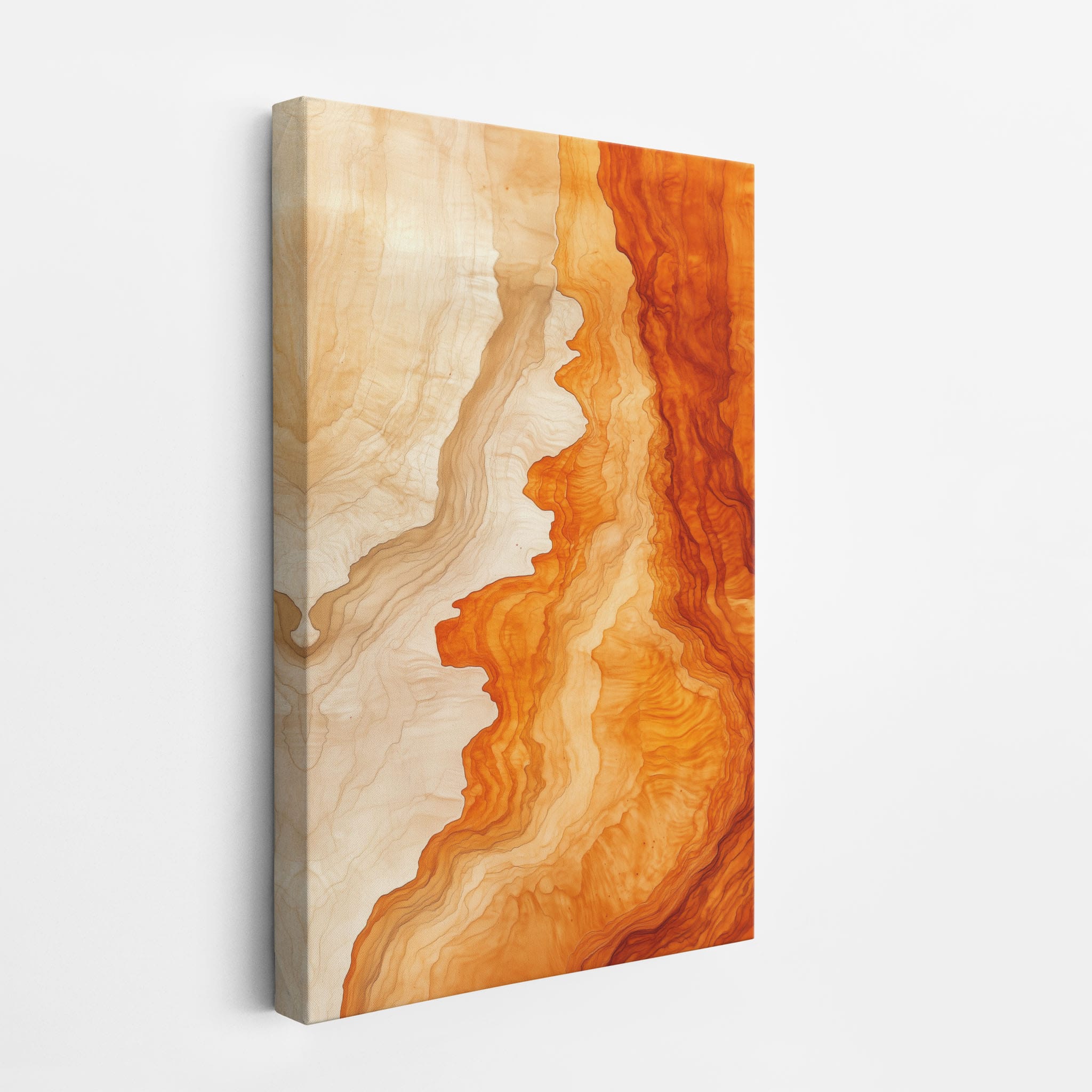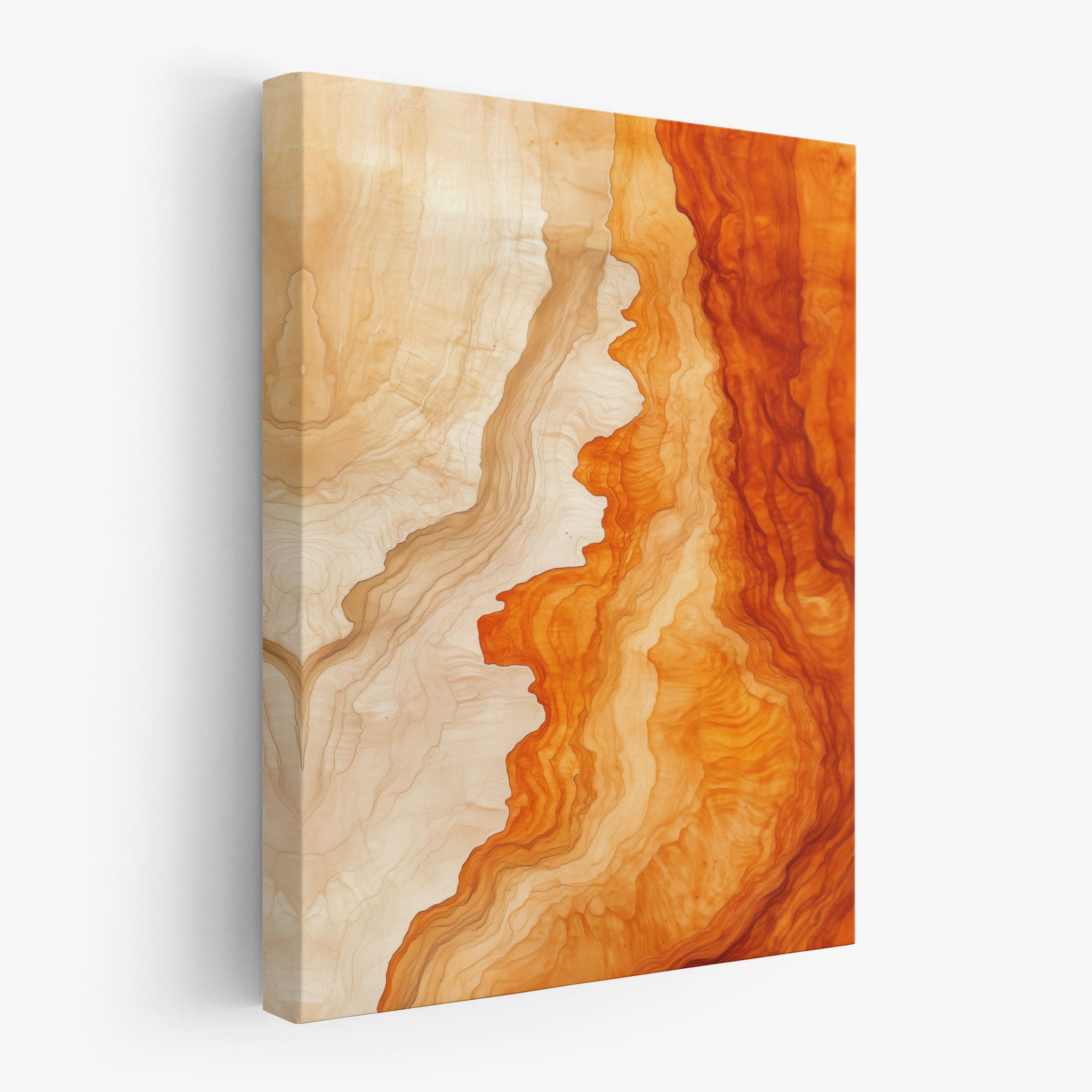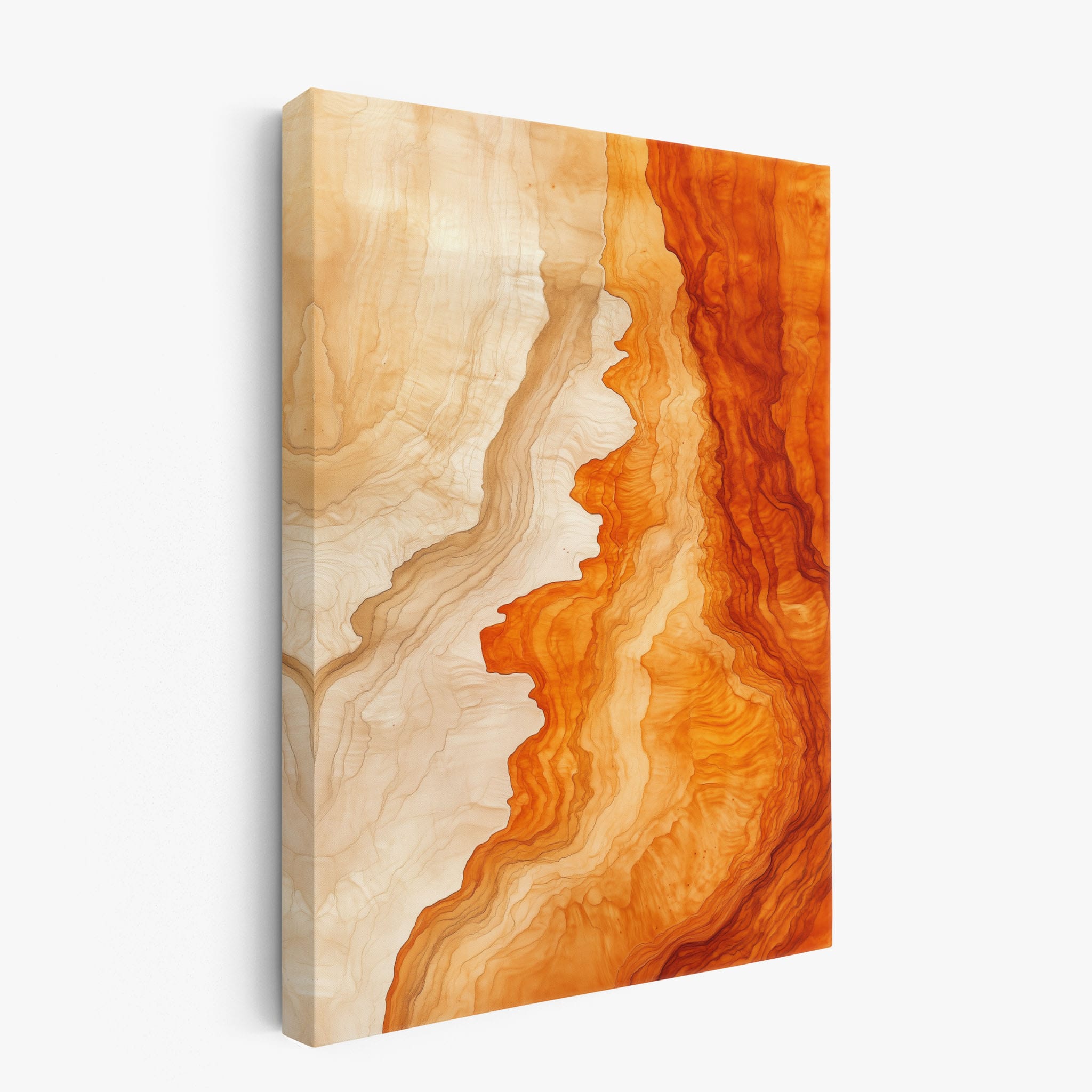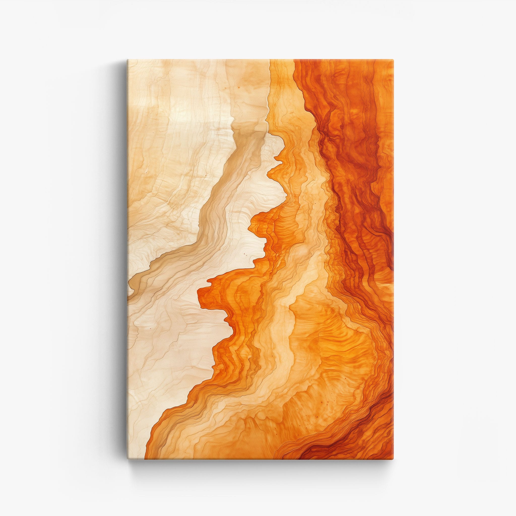 Experience the evocative power of this photographic artwork, where abstract forms and vivid colors mimic the rich tapestry of nature’s palette. The flowing lines in shades of deep oranges and soft creams capture the dynamic essence of geological strata, evoking thoughts of ancient landscapes sculpted over centuries. This piece, which resonates with abstract and surrealistic styles, invites the viewer to a visual journey through color and form. Perfect for bringing a piece of organic beauty into any contemporary space.