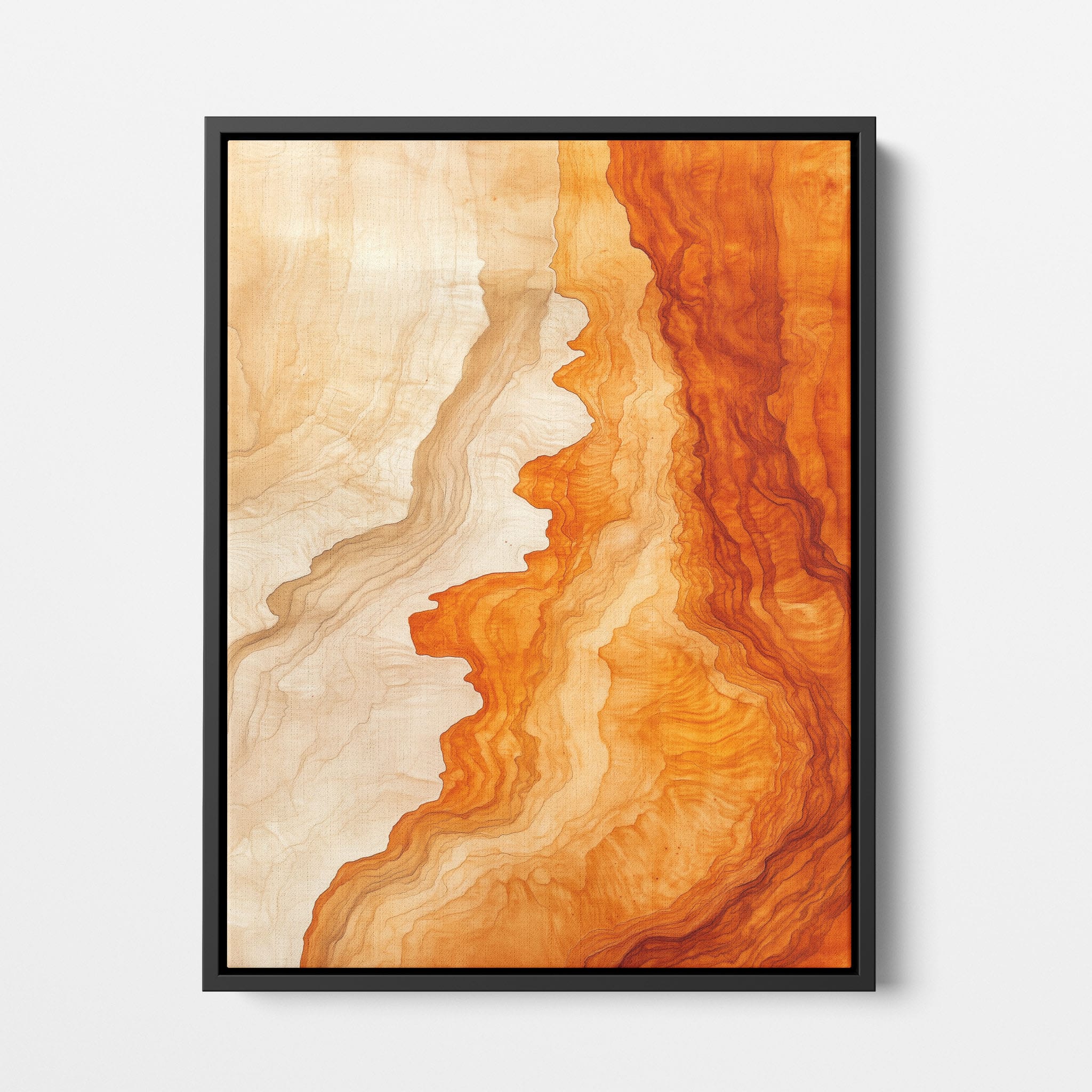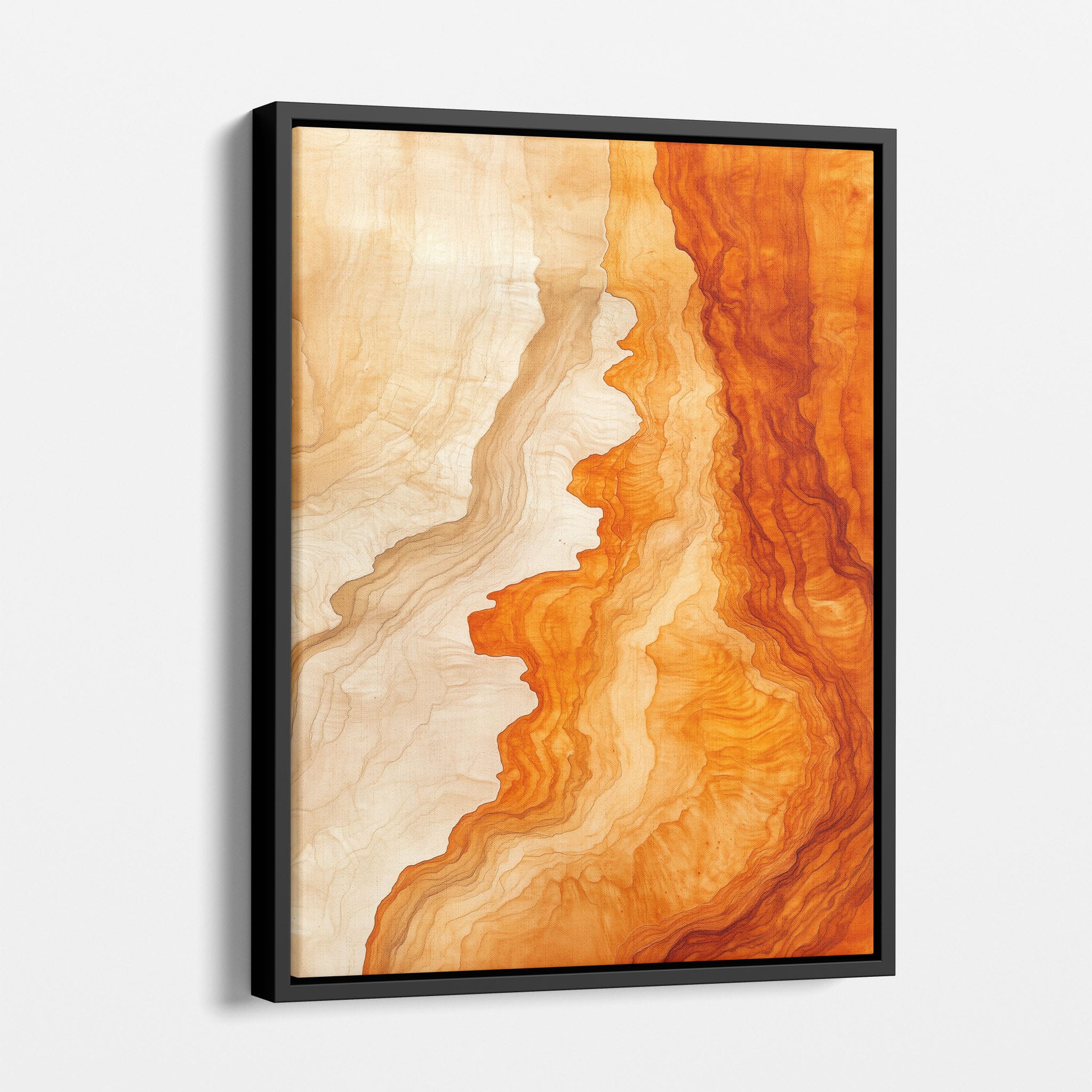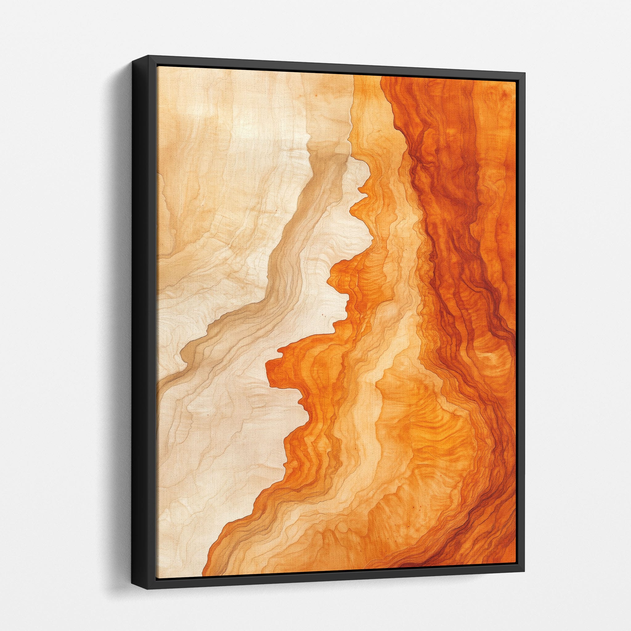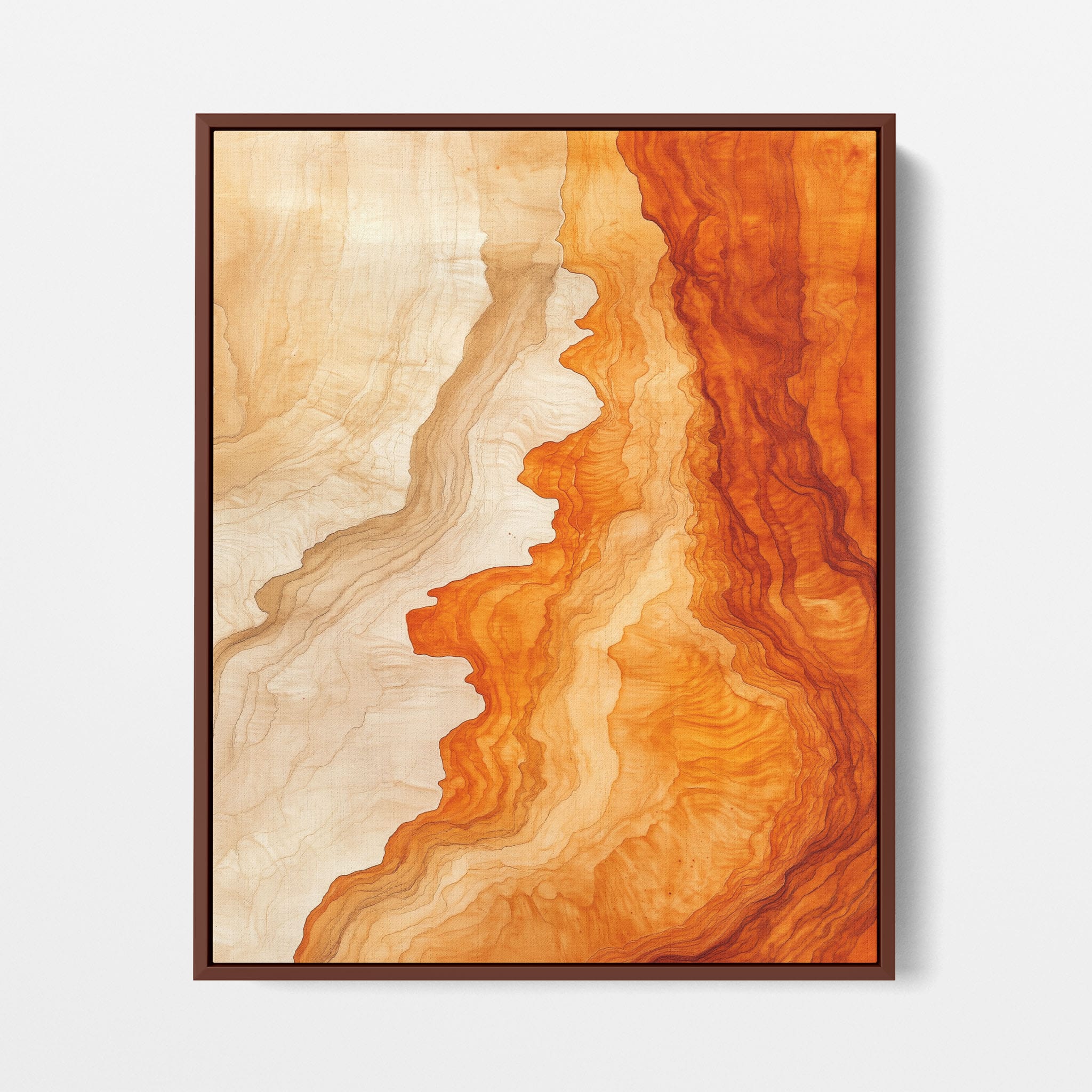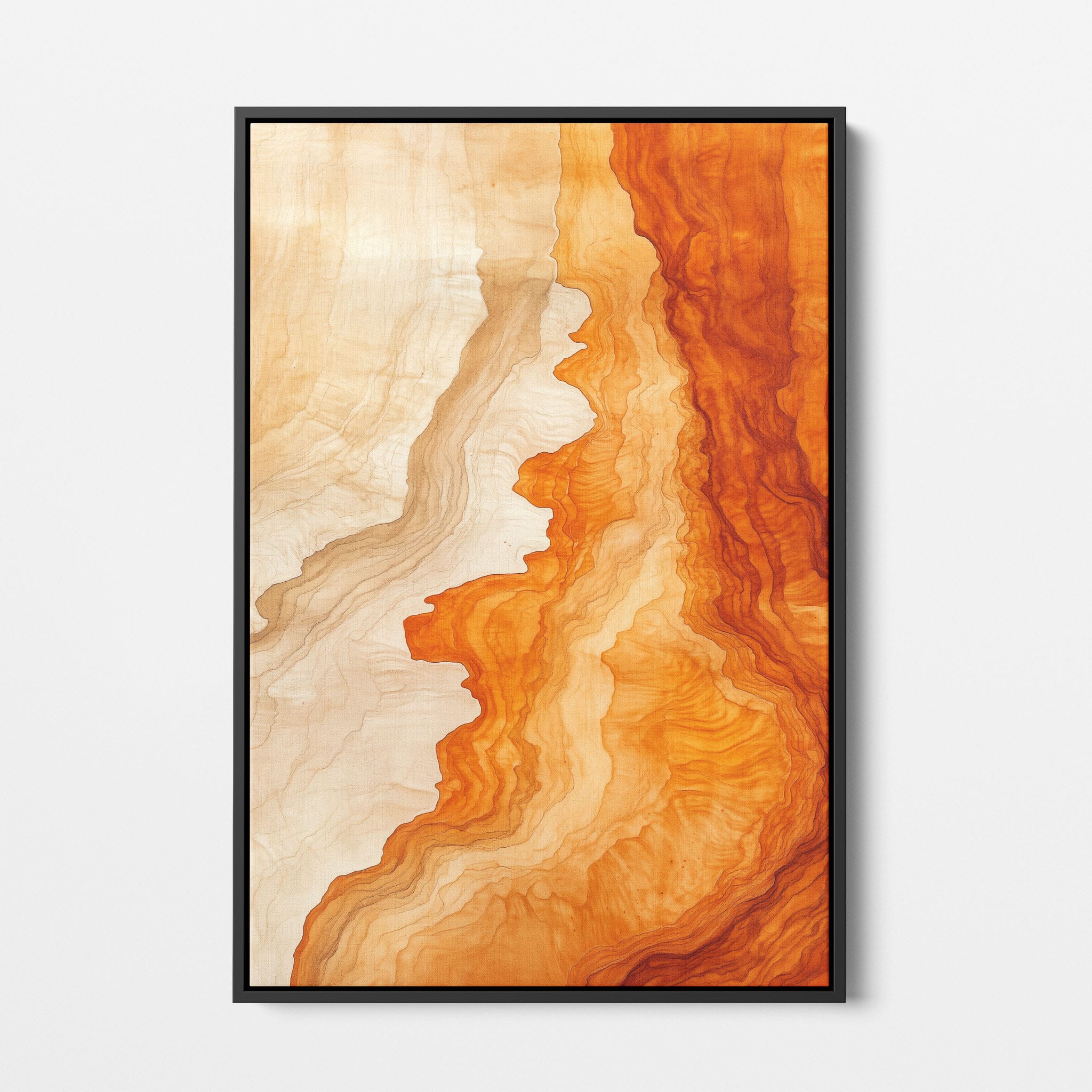 Experience the evocative power of this photographic artwork, where abstract forms and vivid colors mimic the rich tapestry of nature’s palette. The flowing lines in shades of deep oranges and soft creams capture the dynamic essence of geological strata, evoking thoughts of ancient landscapes sculpted over centuries. This piece, which resonates with abstract and surrealistic styles, invites the viewer to a visual journey through color and form. Perfect for bringing a piece of organic beauty into any contemporary space.