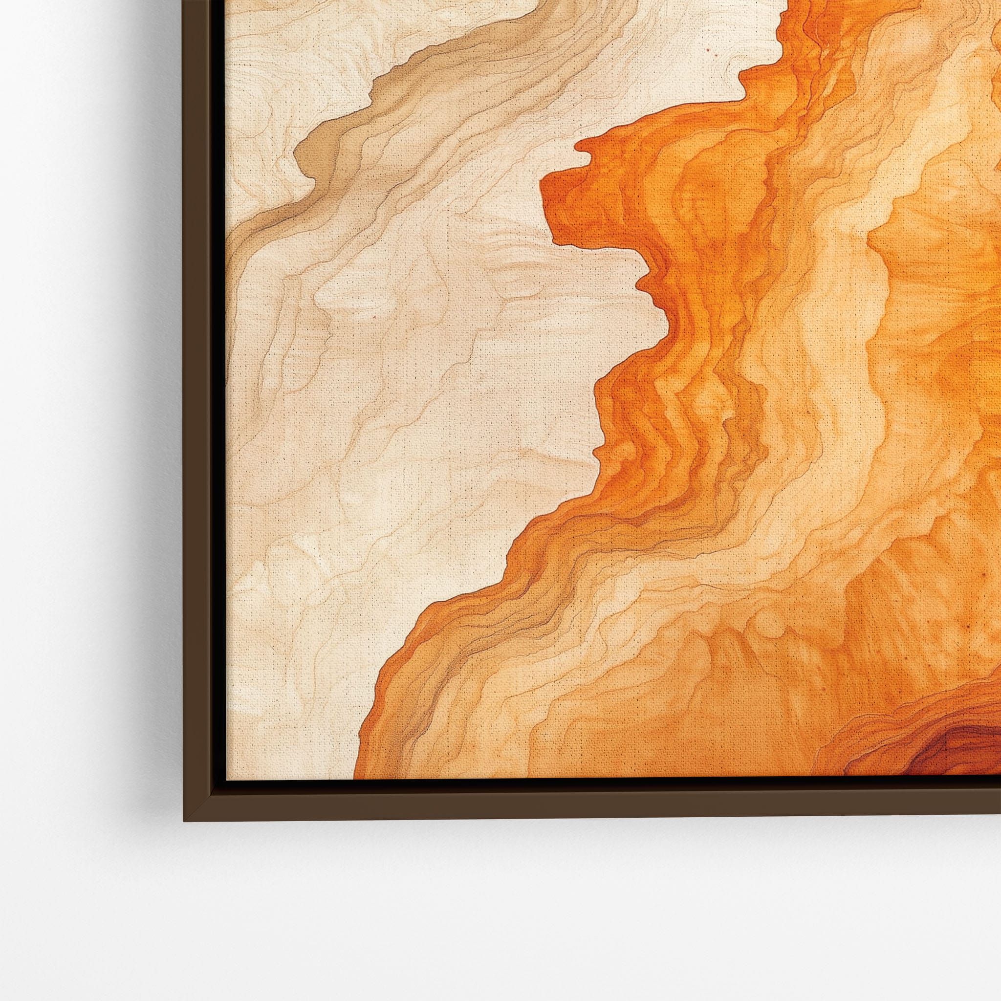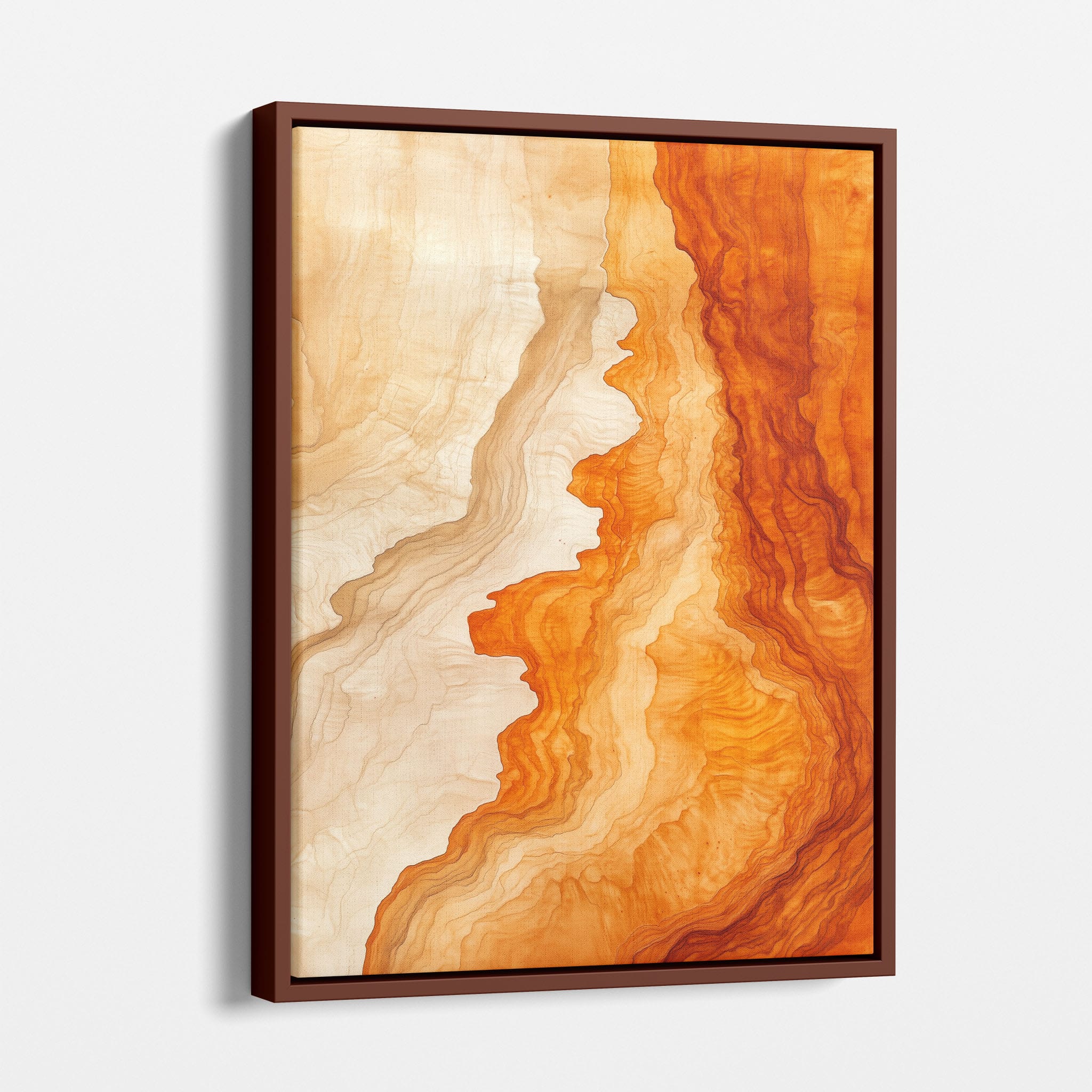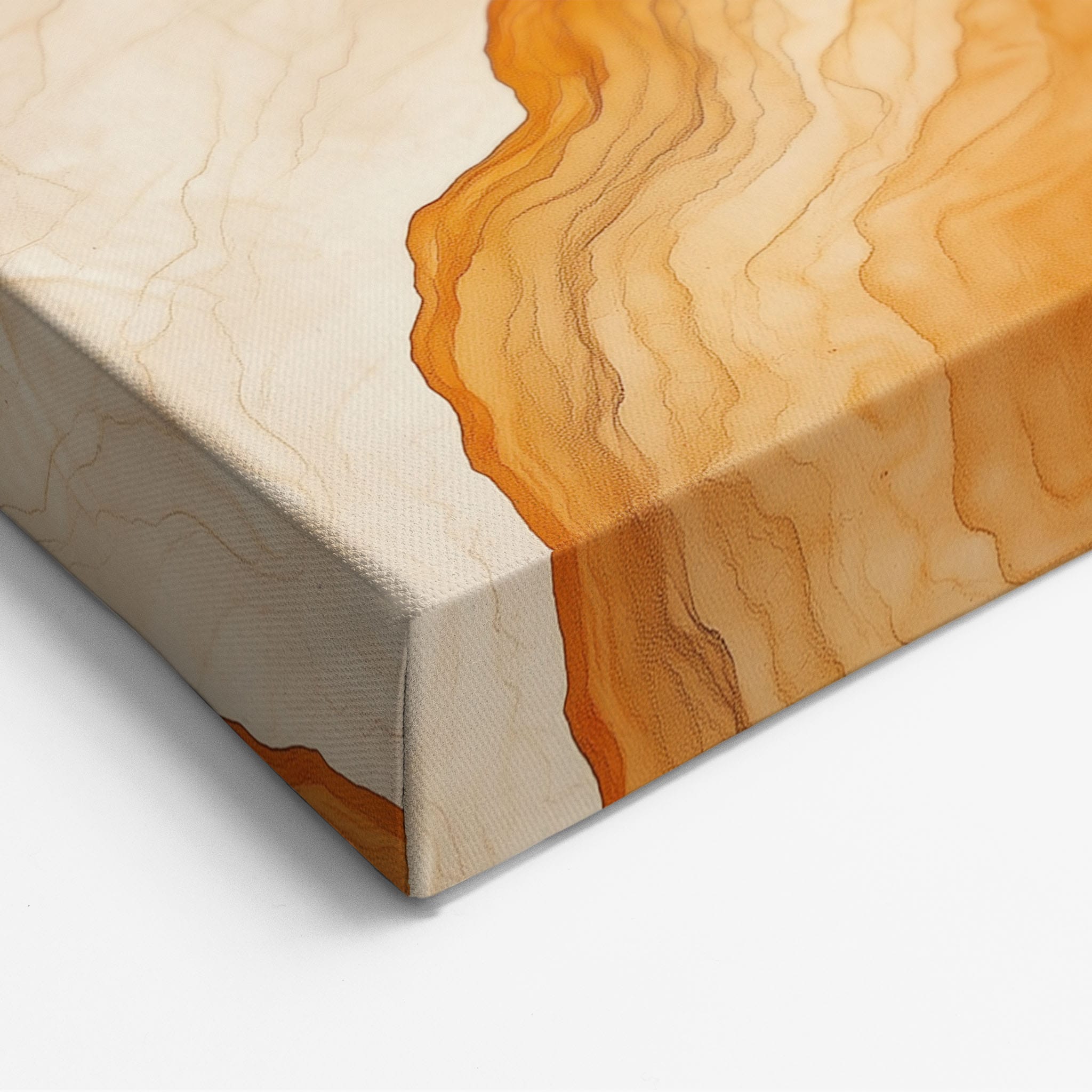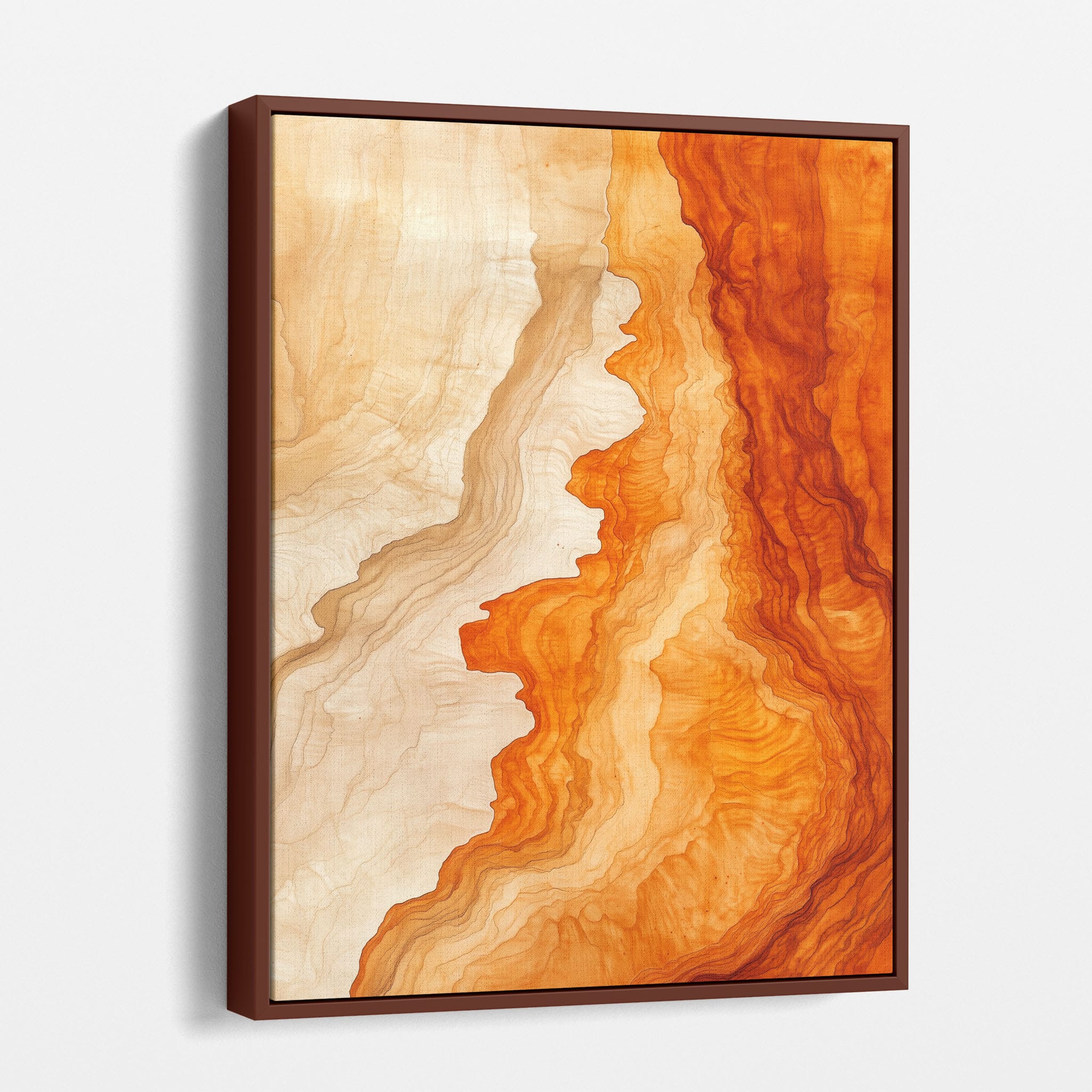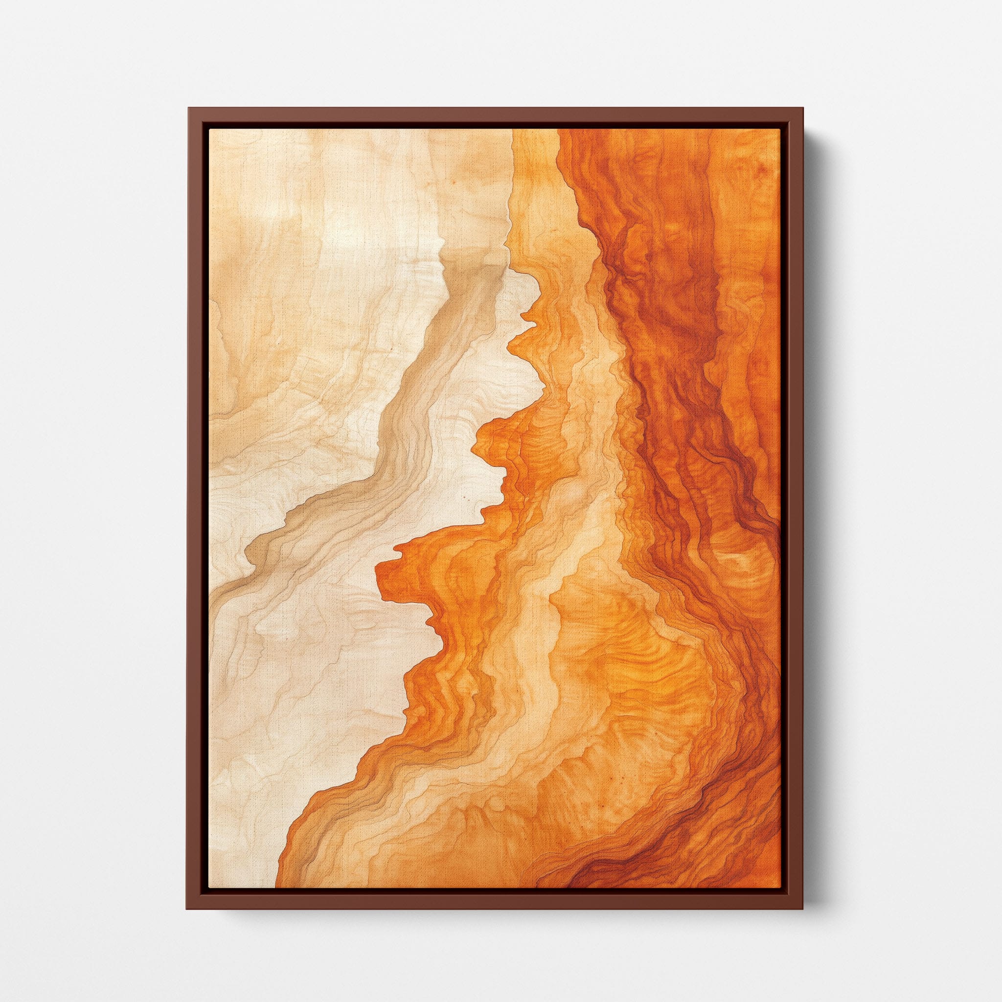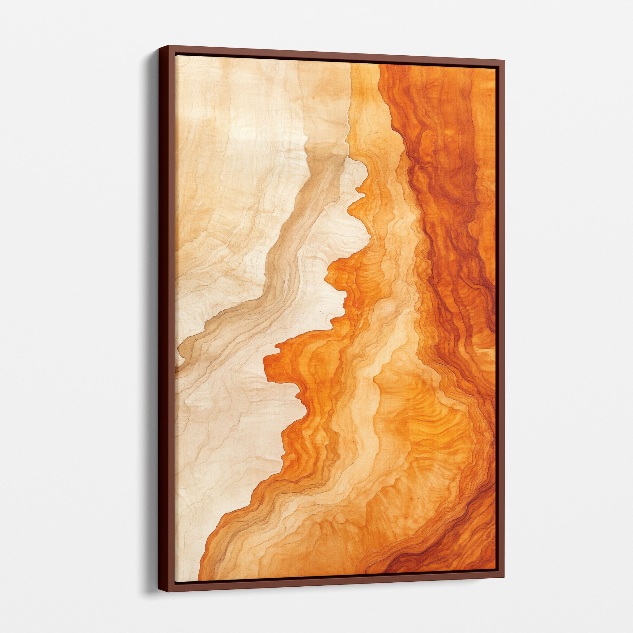 Experience the evocative power of this photographic artwork, where abstract forms and vivid colors mimic the rich tapestry of nature’s palette. The flowing lines in shades of deep oranges and soft creams capture the dynamic essence of geological strata, evoking thoughts of ancient landscapes sculpted over centuries. This piece, which resonates with abstract and surrealistic styles, invites the viewer to a visual journey through color and form. Perfect for bringing a piece of organic beauty into any contemporary space.