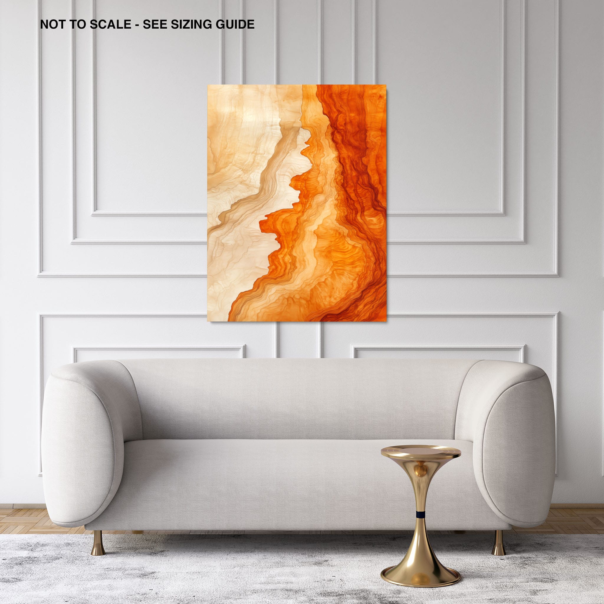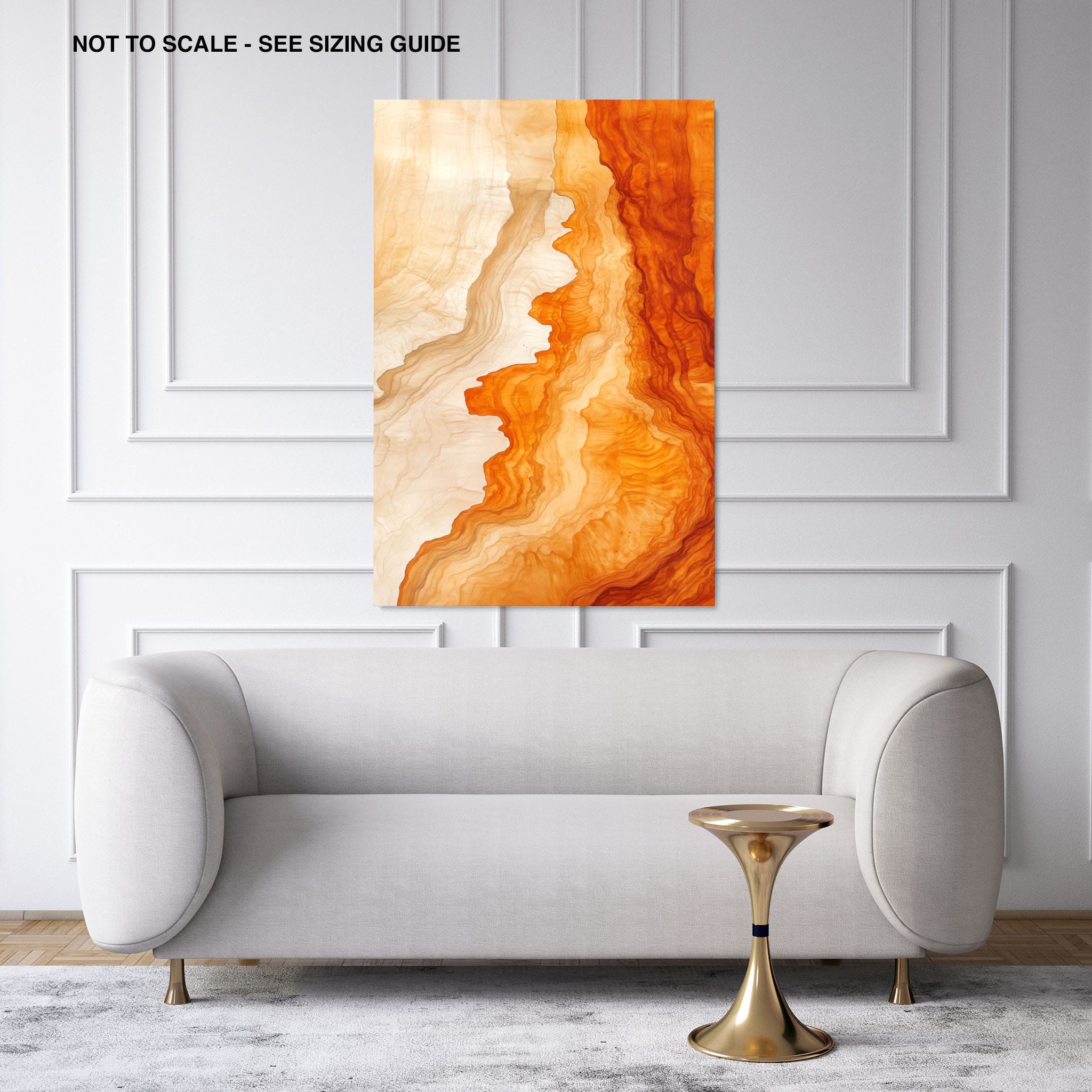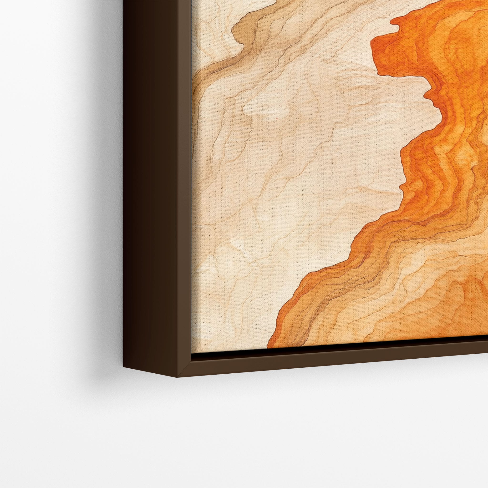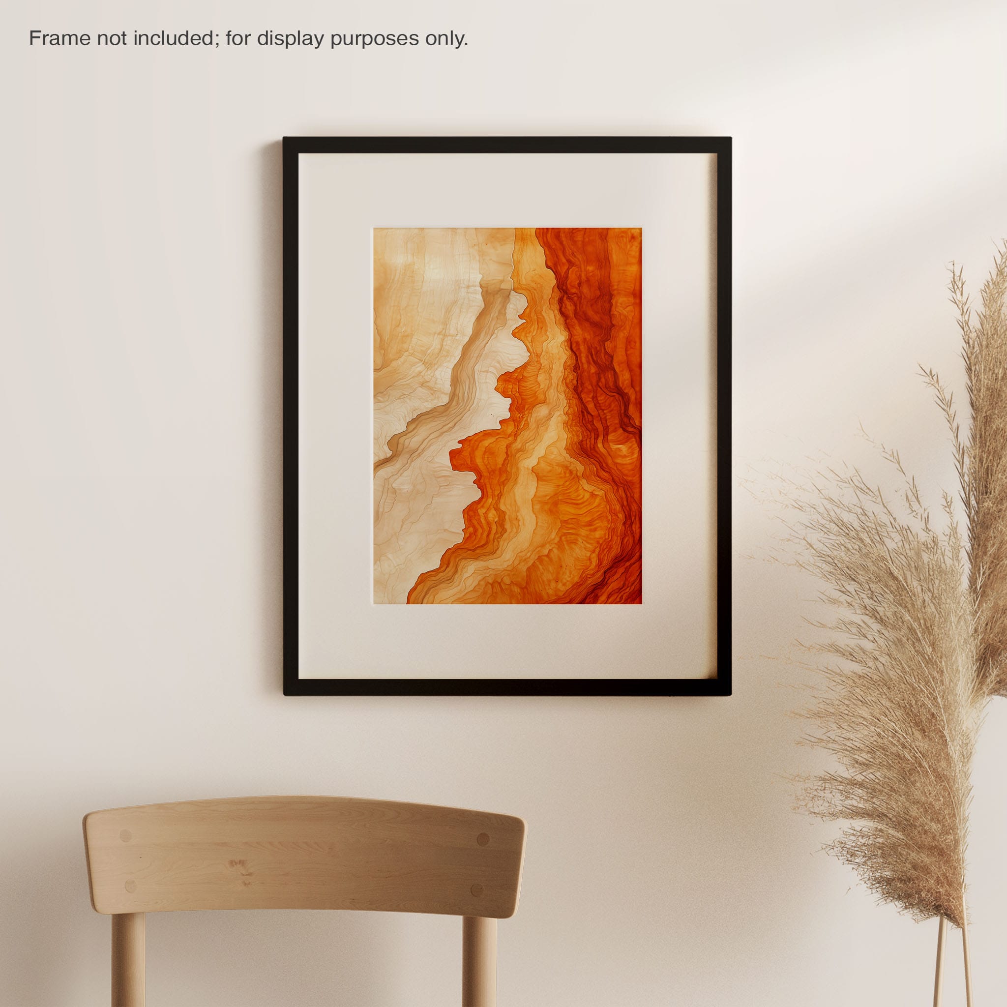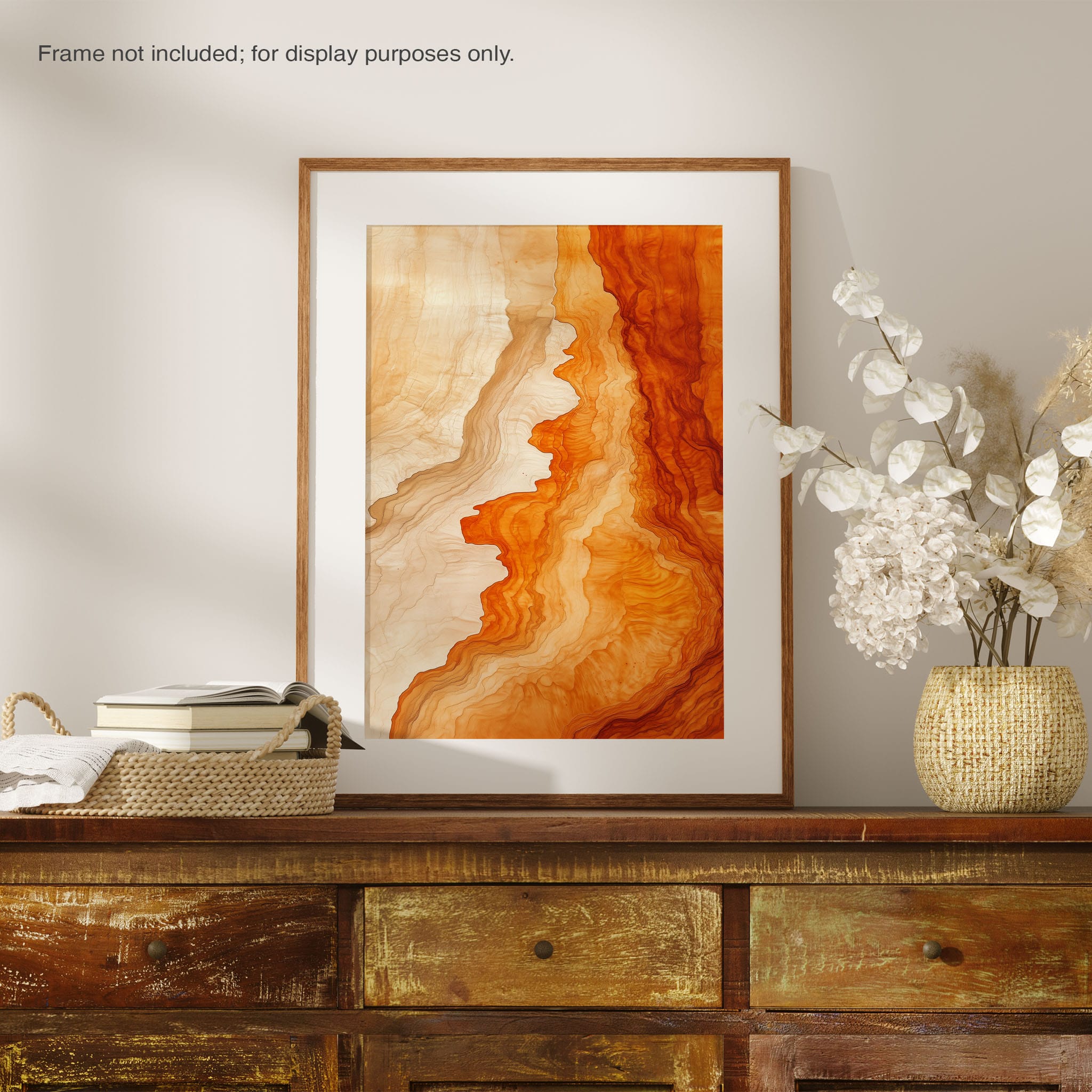 Experience the evocative power of this photographic artwork, where abstract forms and vivid colors mimic the rich tapestry of nature’s palette. The flowing lines in shades of deep oranges and soft creams capture the dynamic essence of geological strata, evoking thoughts of ancient landscapes sculpted over centuries. This piece, which resonates with abstract and surrealistic styles, invites the viewer to a visual journey through color and form. Perfect for bringing a piece of organic beauty into any contemporary space.