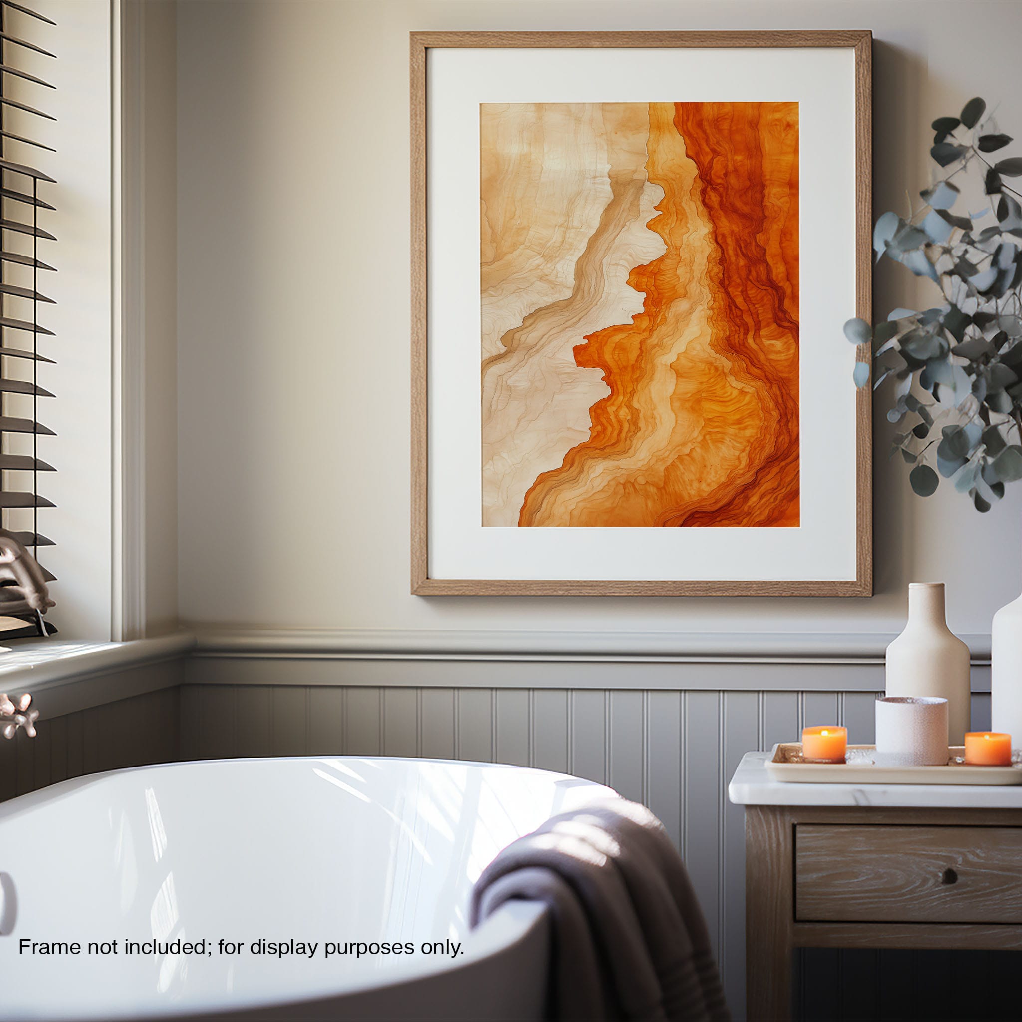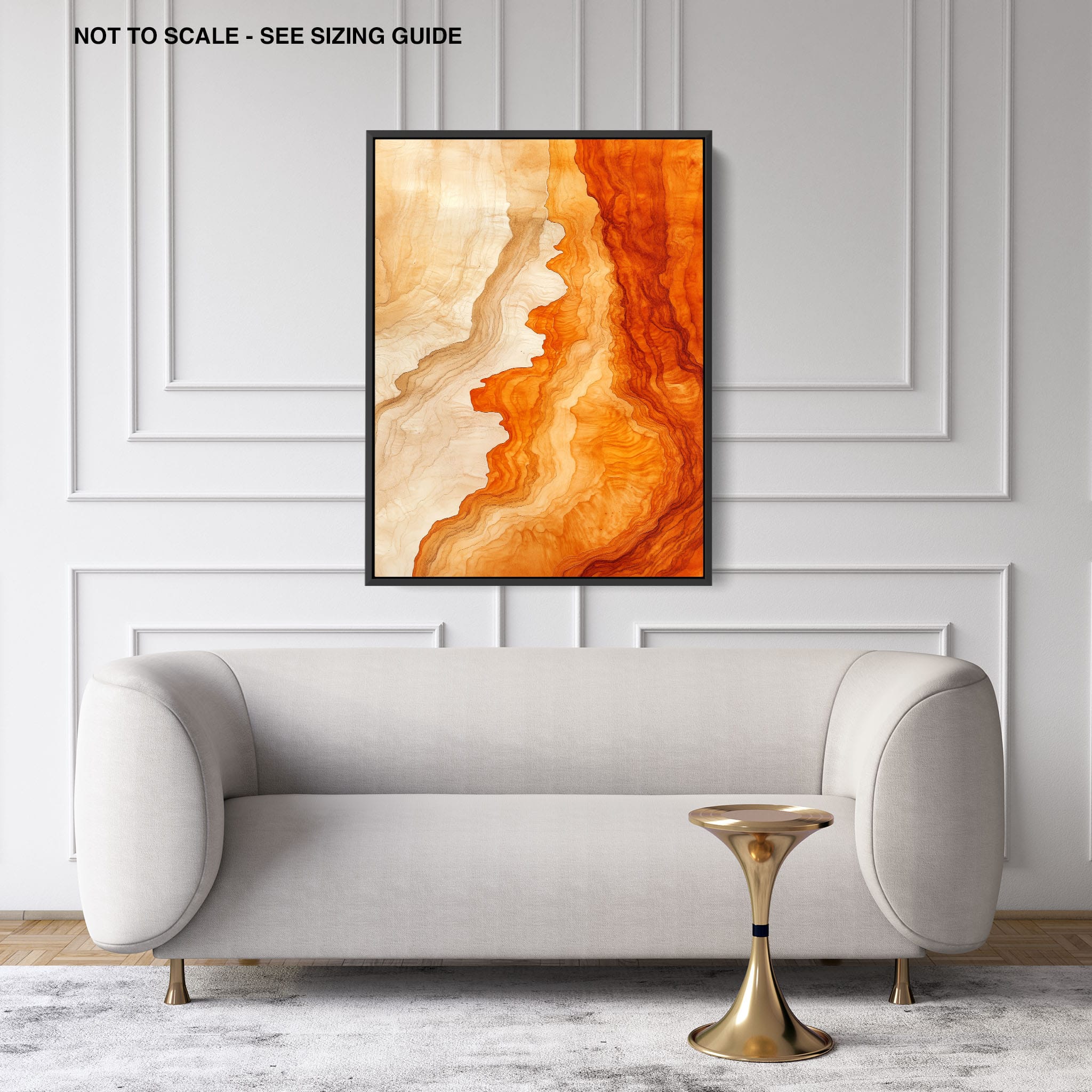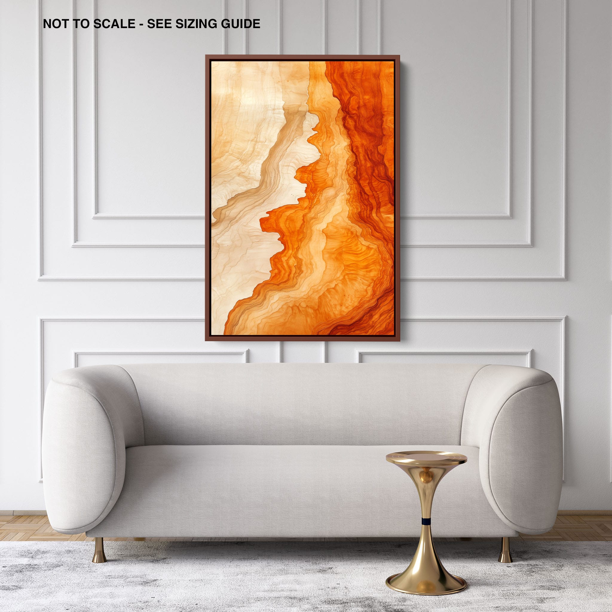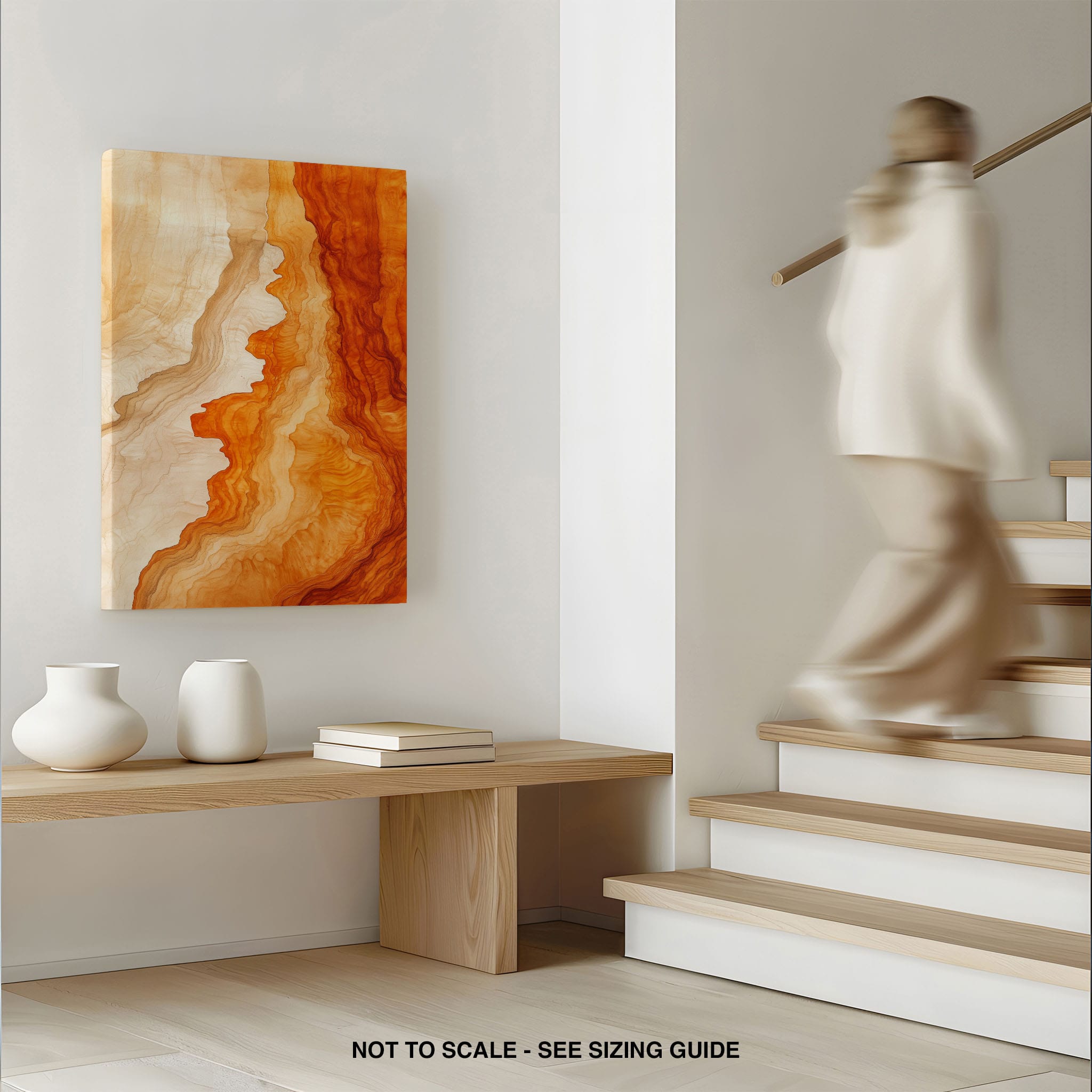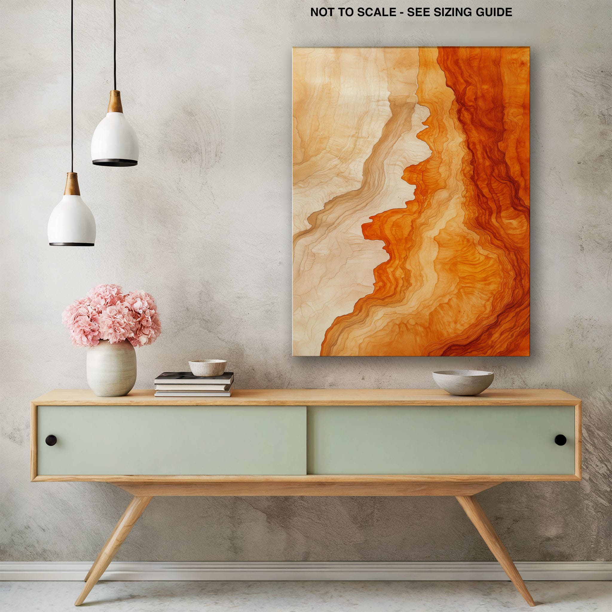 Experience the evocative power of this photographic artwork, where abstract forms and vivid colors mimic the rich tapestry of nature’s palette. The flowing lines in shades of deep oranges and soft creams capture the dynamic essence of geological strata, evoking thoughts of ancient landscapes sculpted over centuries. This piece, which resonates with abstract and surrealistic styles, invites the viewer to a visual journey through color and form. Perfect for bringing a piece of organic beauty into any contemporary space.