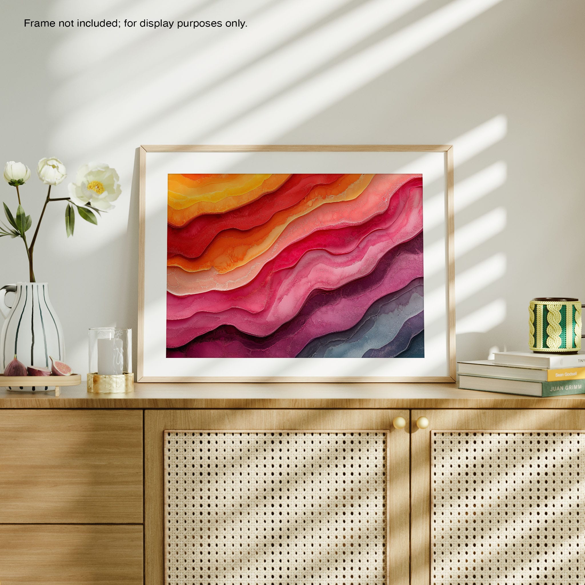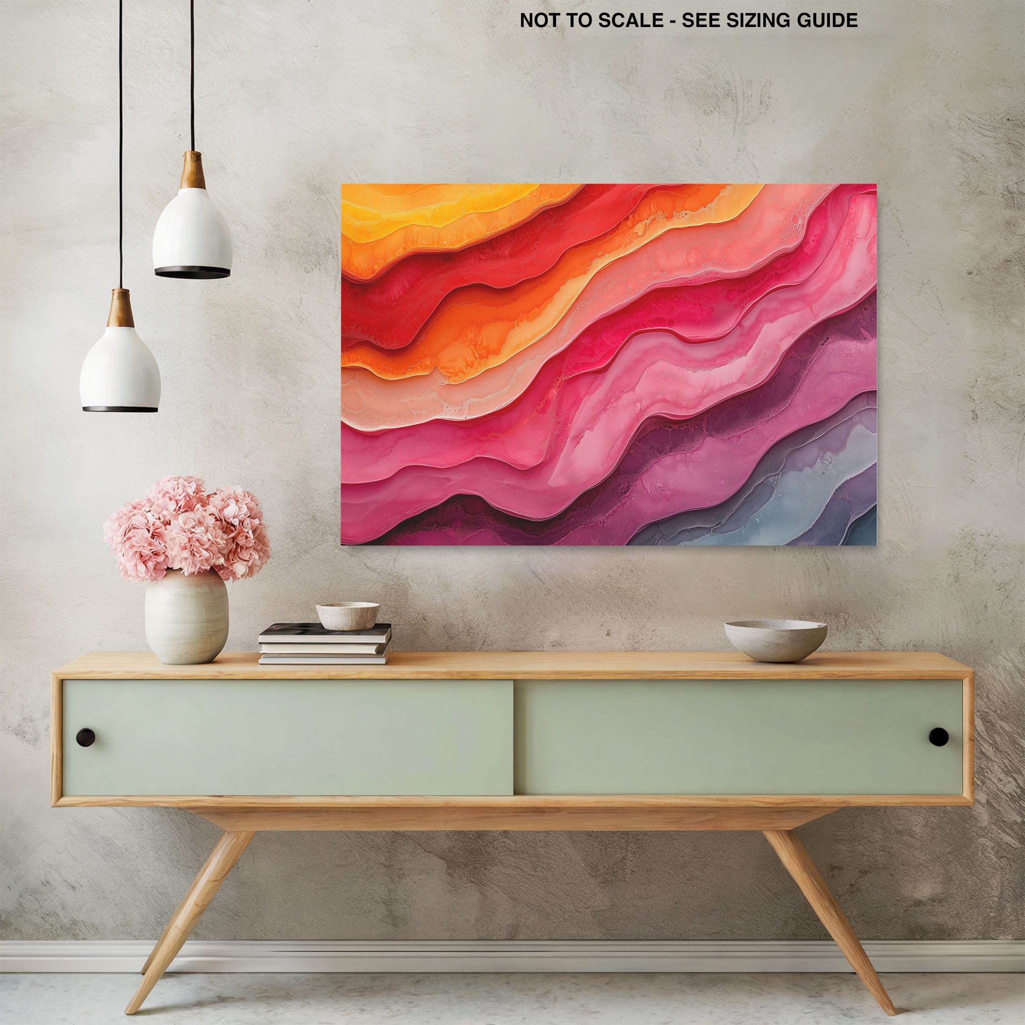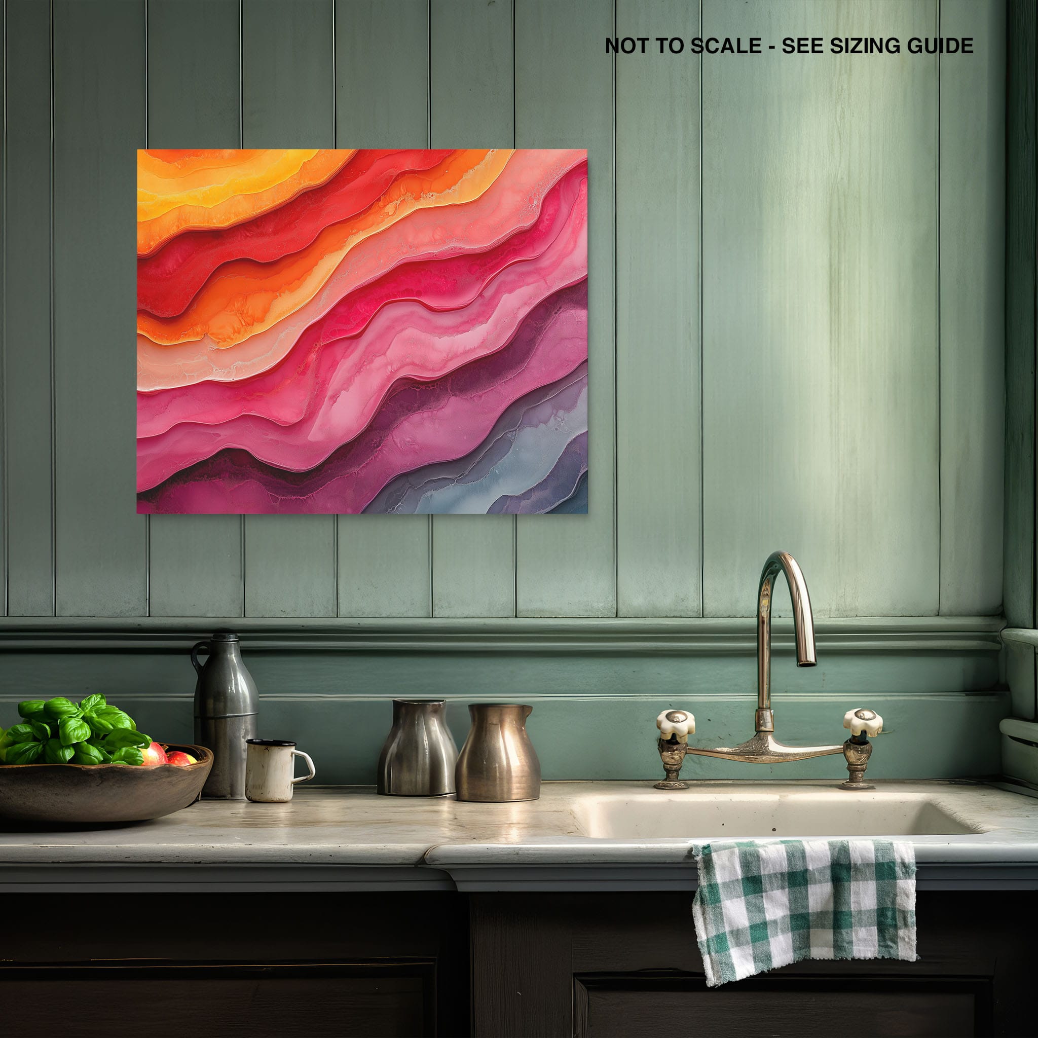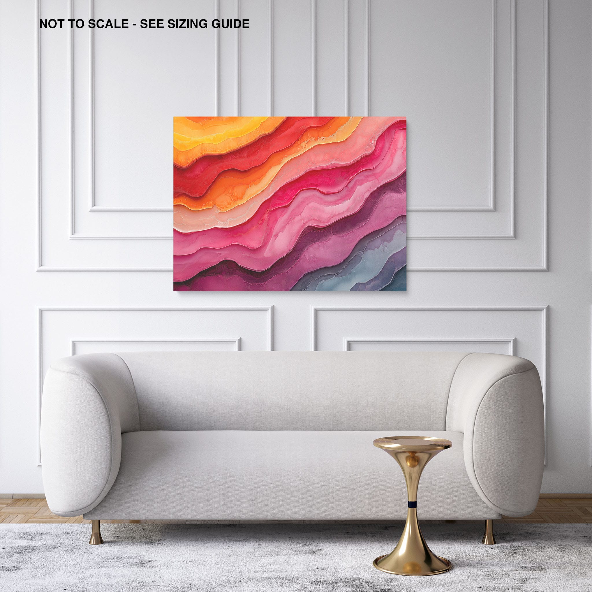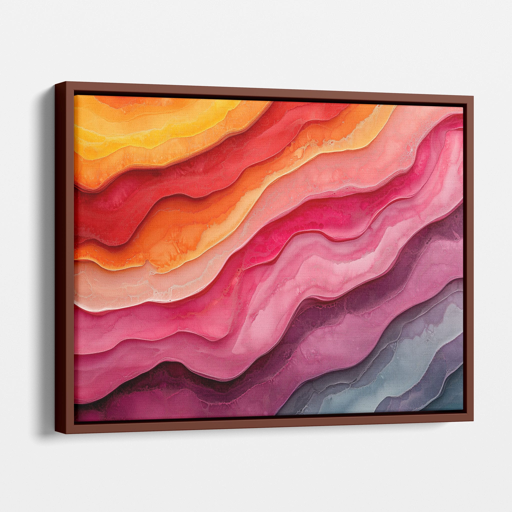 This striking piece captures undulating waves of vibrant colors, layered in depths that seem almost liquid. The use of a rich palette ranging from fiery oranges to deep, soothing purples evokes a strong emotional response, indicative of the Expressionist style. Each color seamlessly transitions into the next, creating a modern abstract that speaks to the dynamism and fluidity of emotions. This painting is a must-have for any art lover looking to add a touch of modern elegance and a splash of vivid color to their collection. A true statement piece, it enhances every space it inhabits with its captivating presence.