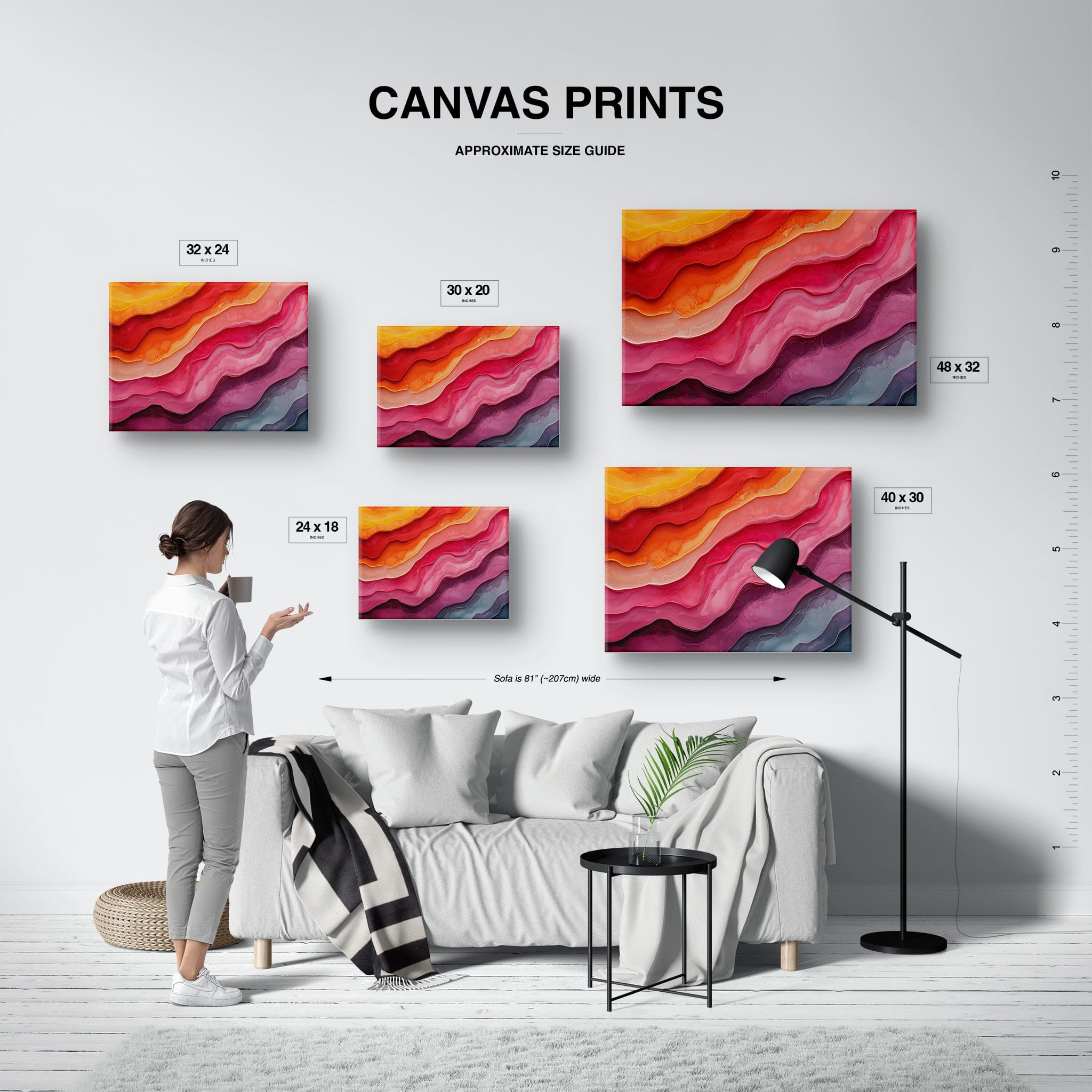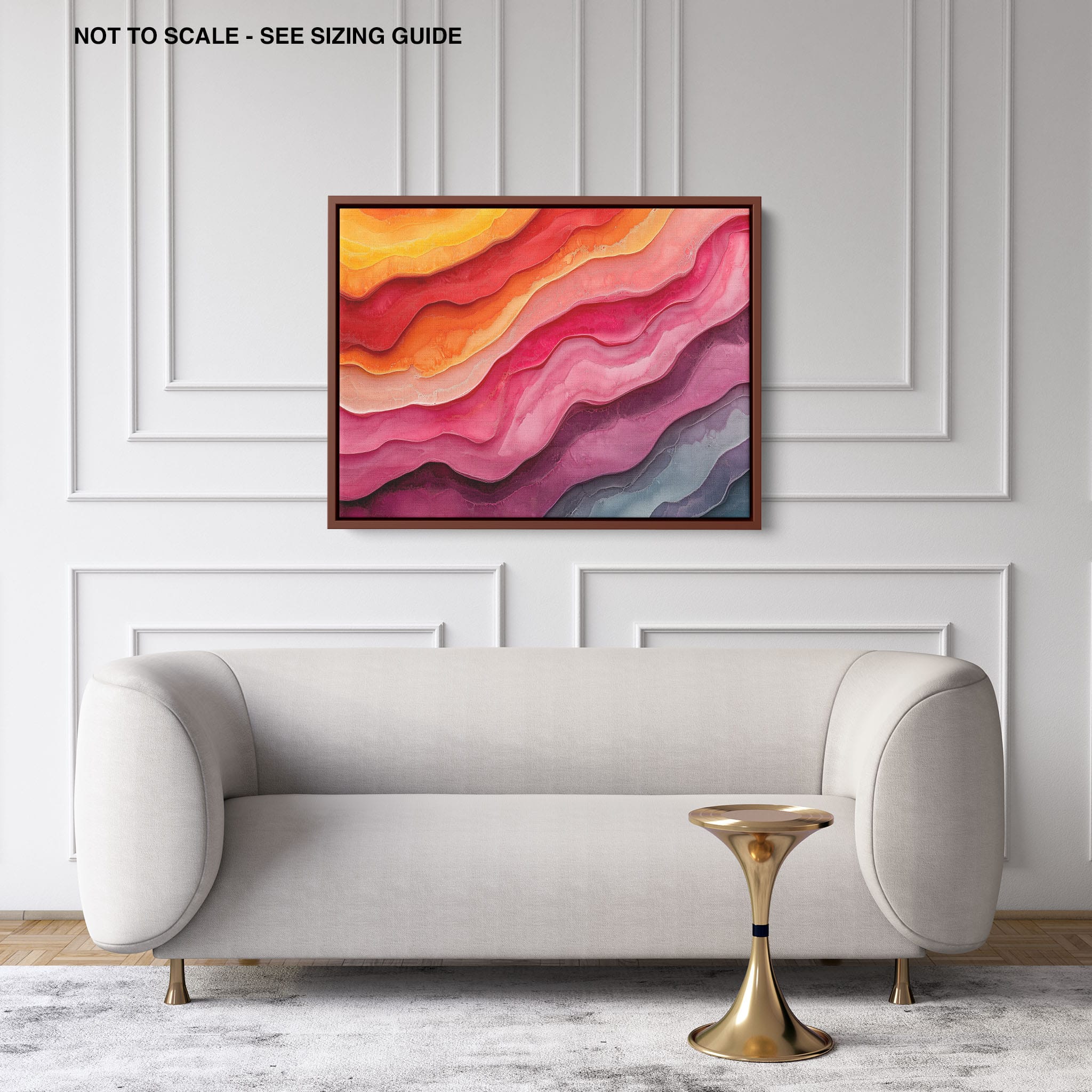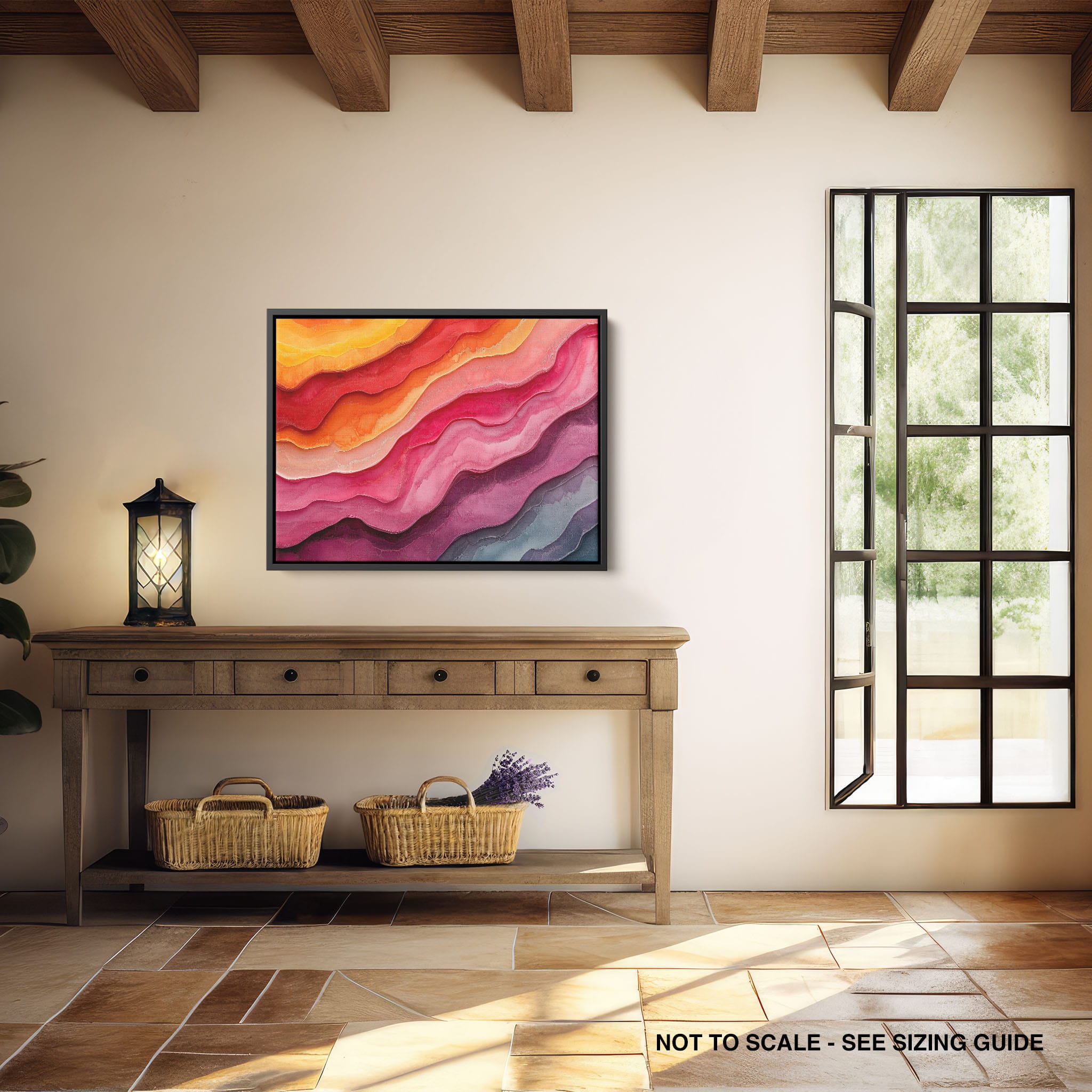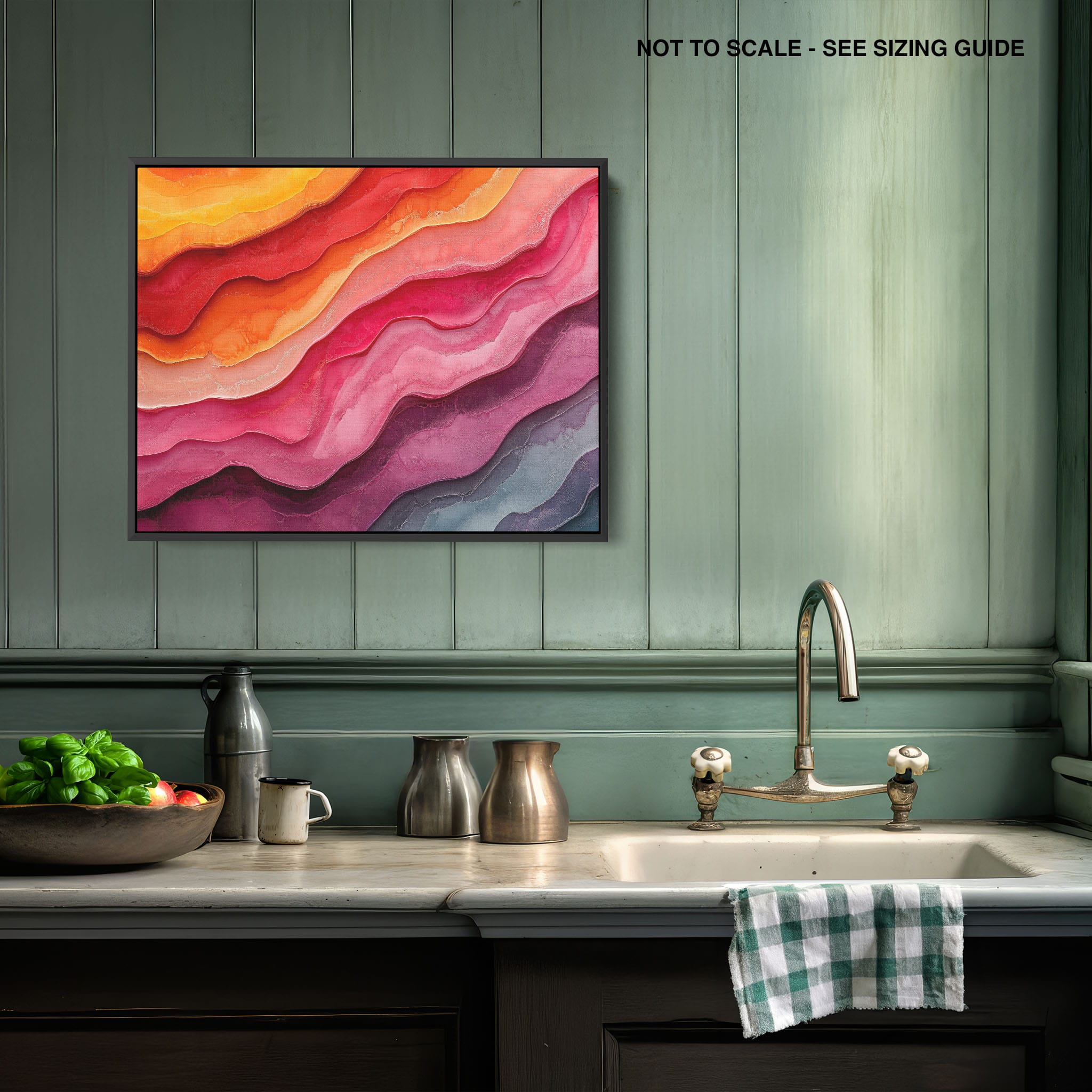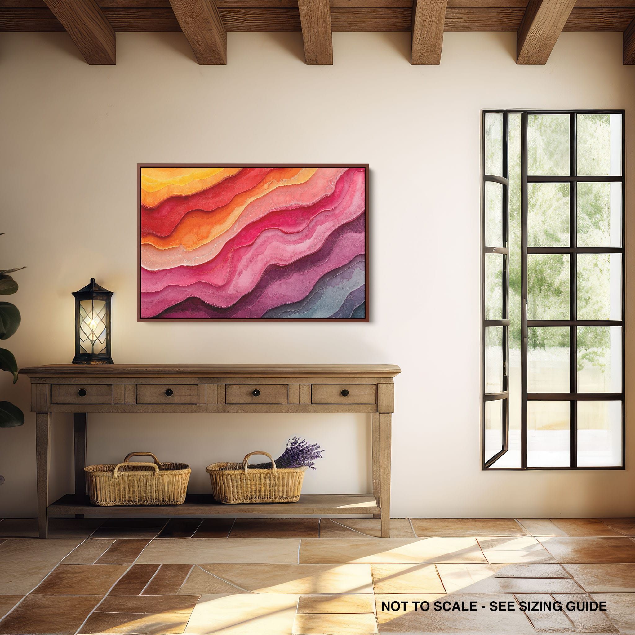 This striking piece captures undulating waves of vibrant colors, layered in depths that seem almost liquid. The use of a rich palette ranging from fiery oranges to deep, soothing purples evokes a strong emotional response, indicative of the Expressionist style. Each color seamlessly transitions into the next, creating a modern abstract that speaks to the dynamism and fluidity of emotions. This painting is a must-have for any art lover looking to add a touch of modern elegance and a splash of vivid color to their collection. A true statement piece, it enhances every space it inhabits with its captivating presence.