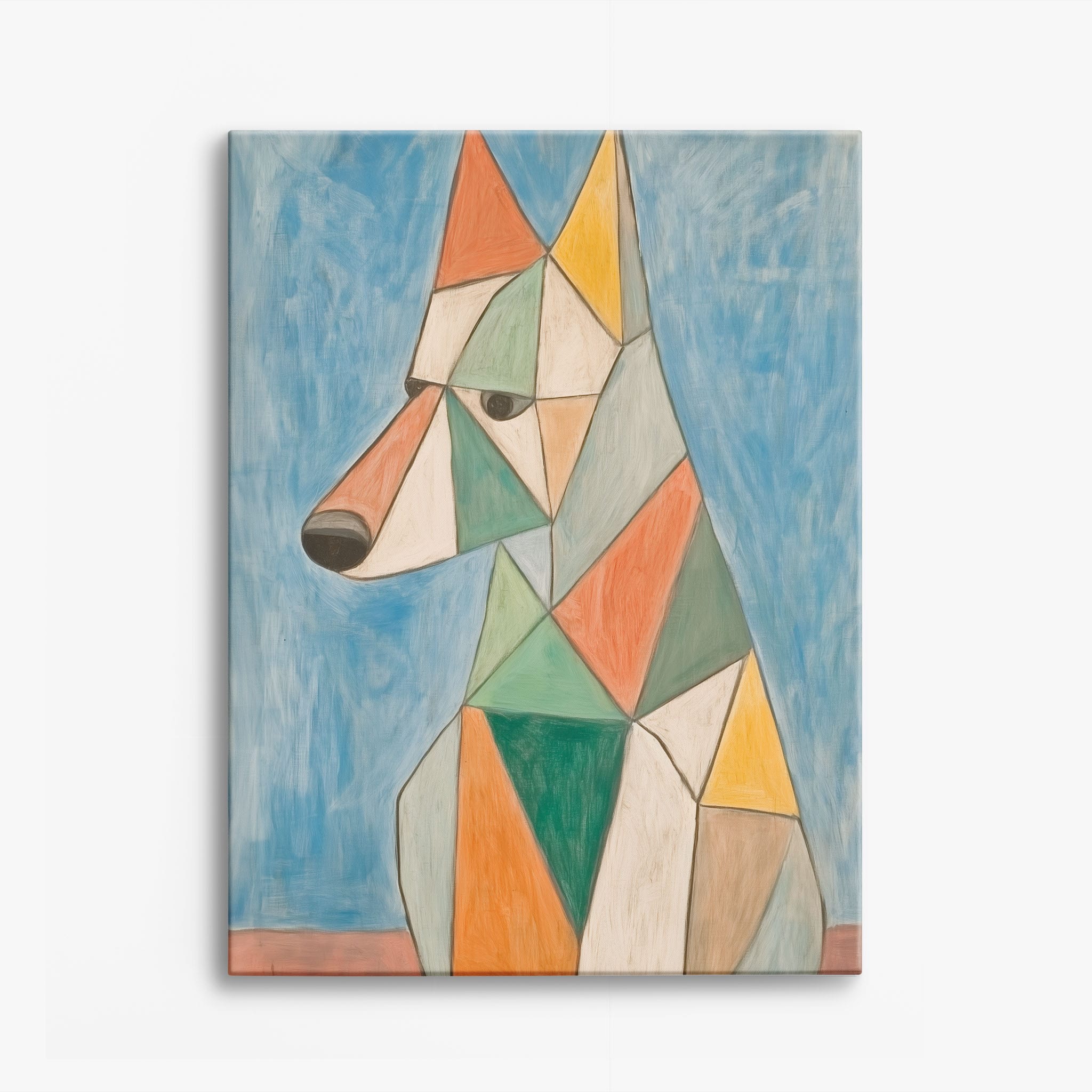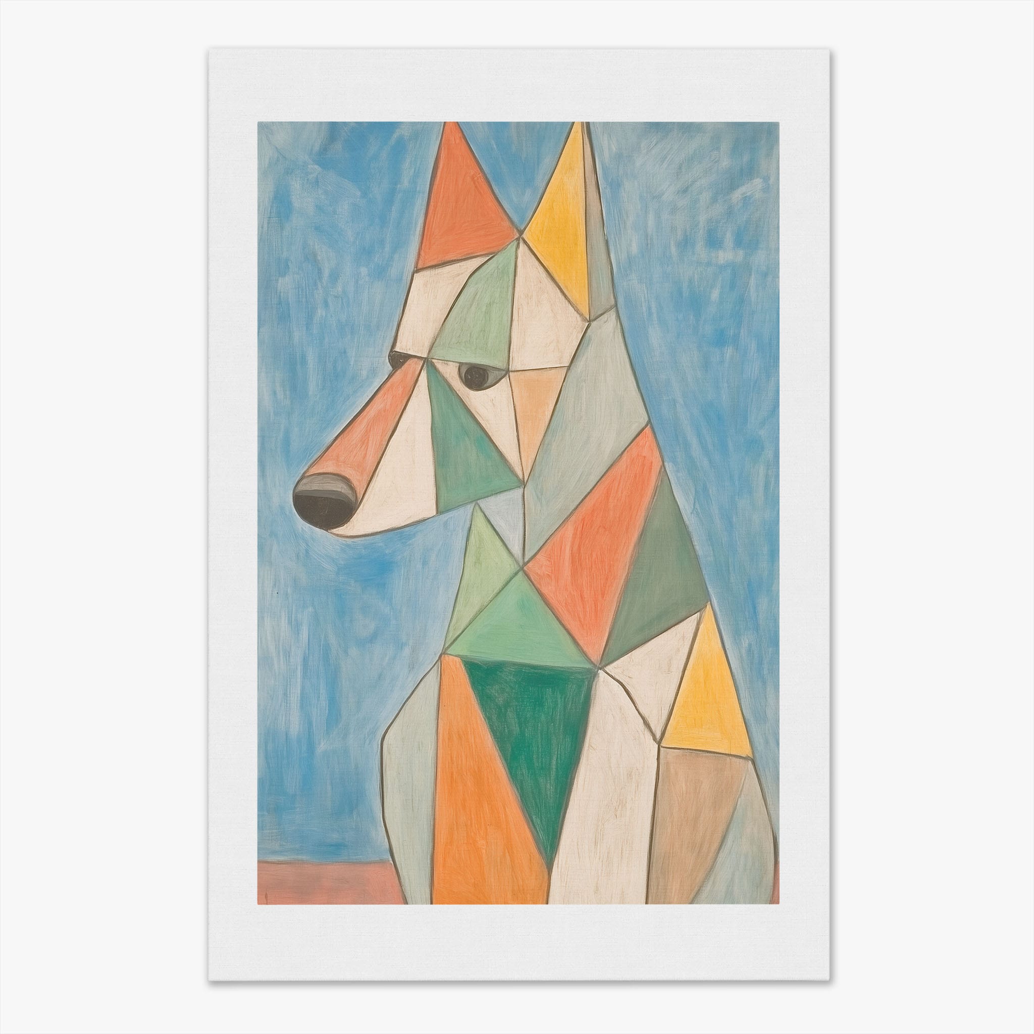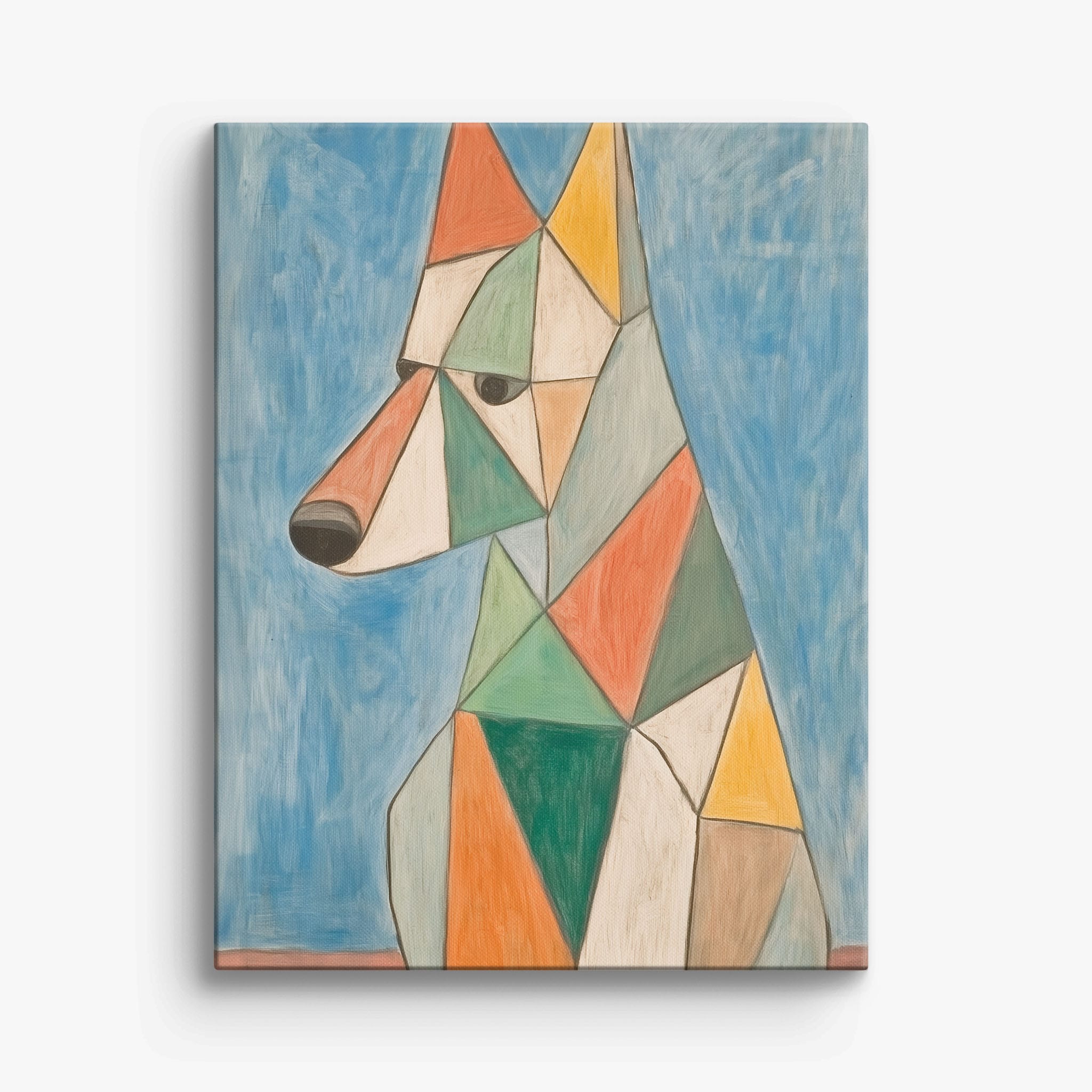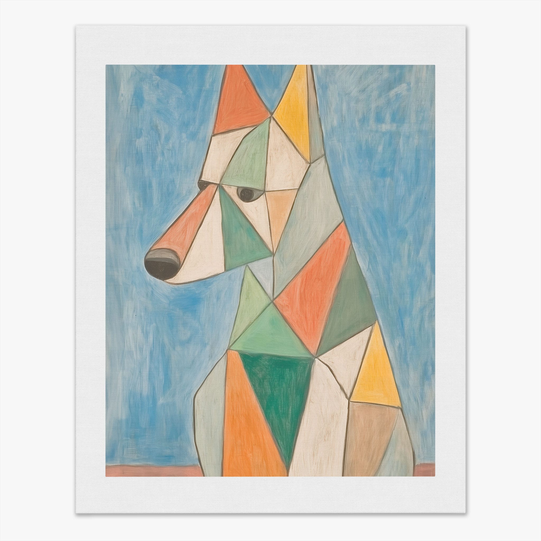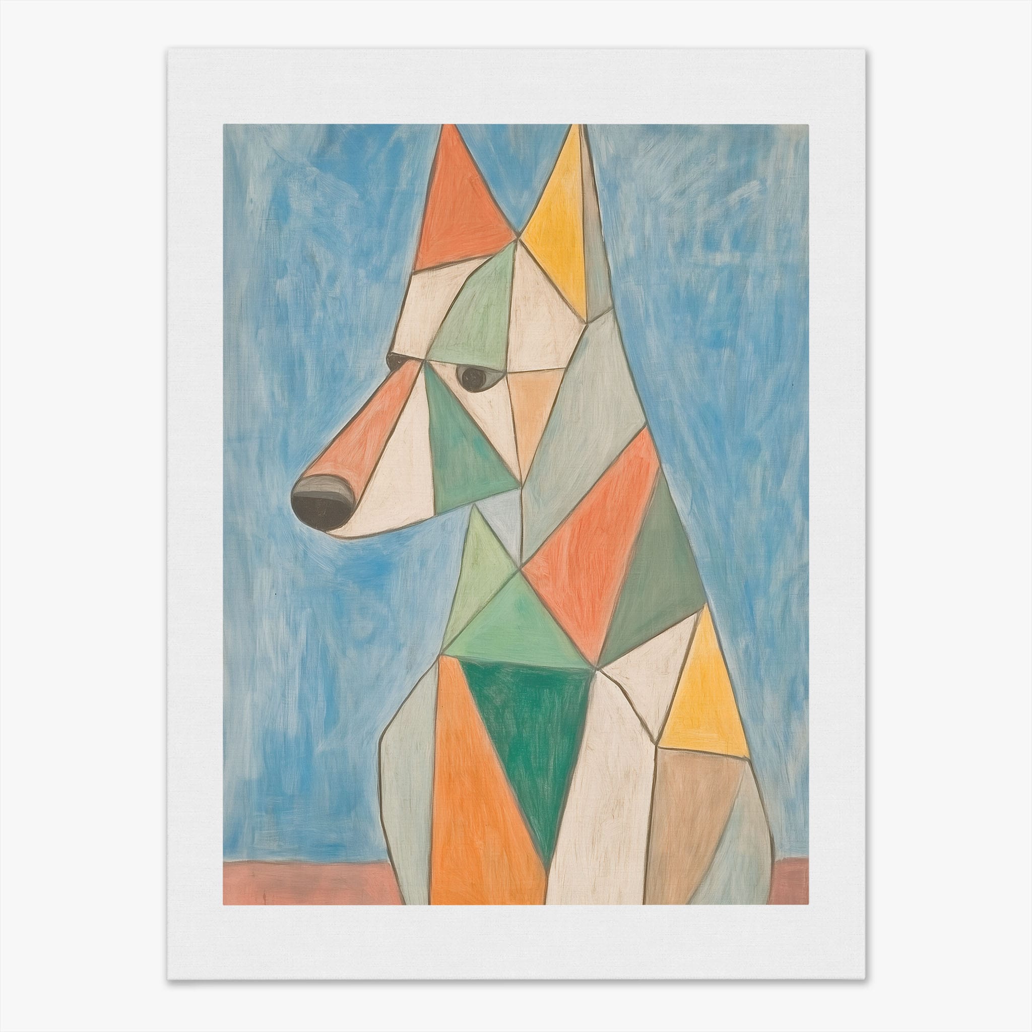This painting showcases a stylized dog composed of bold geometric shapes, rendered in a vivid palette of earthy orange, green, and soothing blues, framed by a serene sky. Advanced into the realm of Cubism, the artwork reveals the essence of the canine spirit through fragmented, intersecting forms. Perfect for modern decor enthusiasts who value the convergence of contemporary art and timeless themes, this piece invites reflection and adds a vibrant touch to any space. A must-have for admirers of animal-inspired artwork that also resonates with the simplicity and drama of modern artistry.