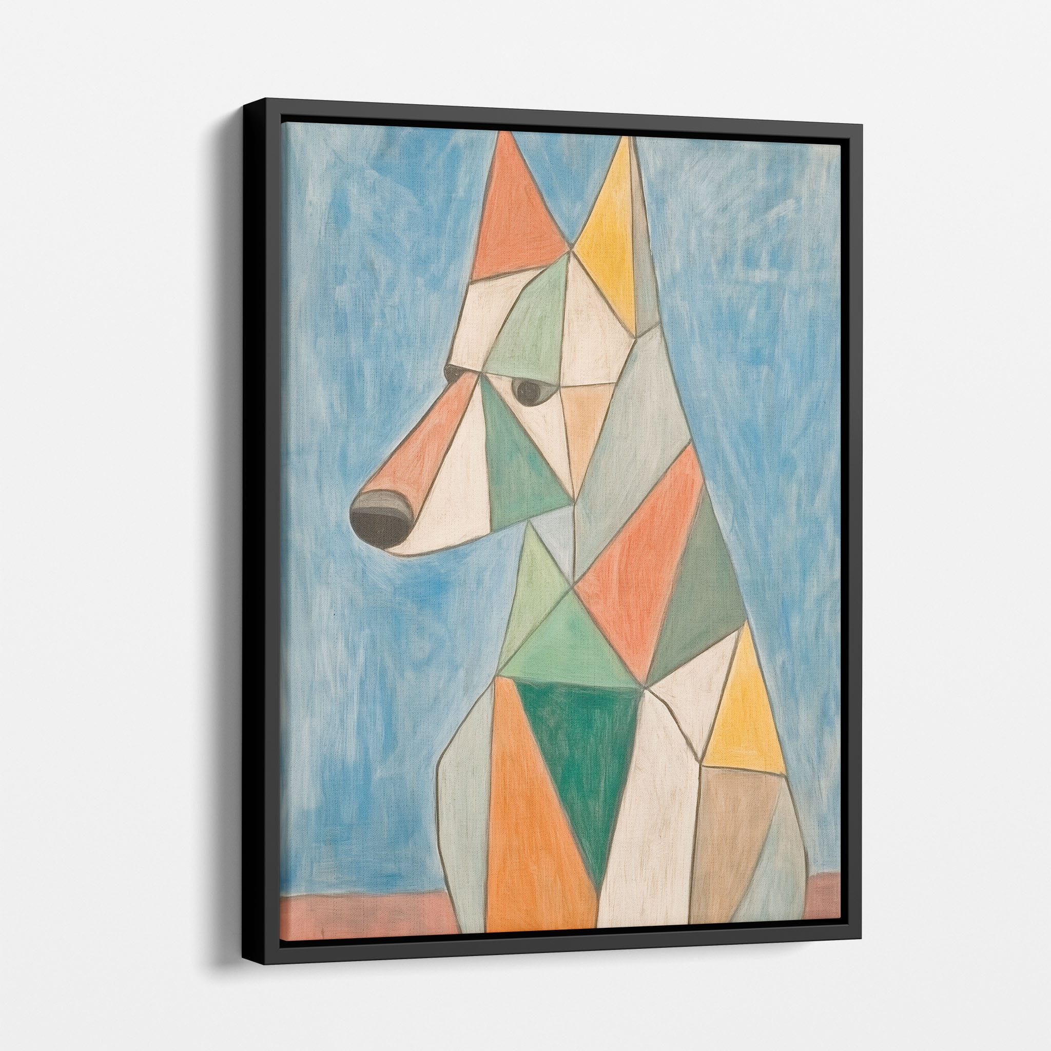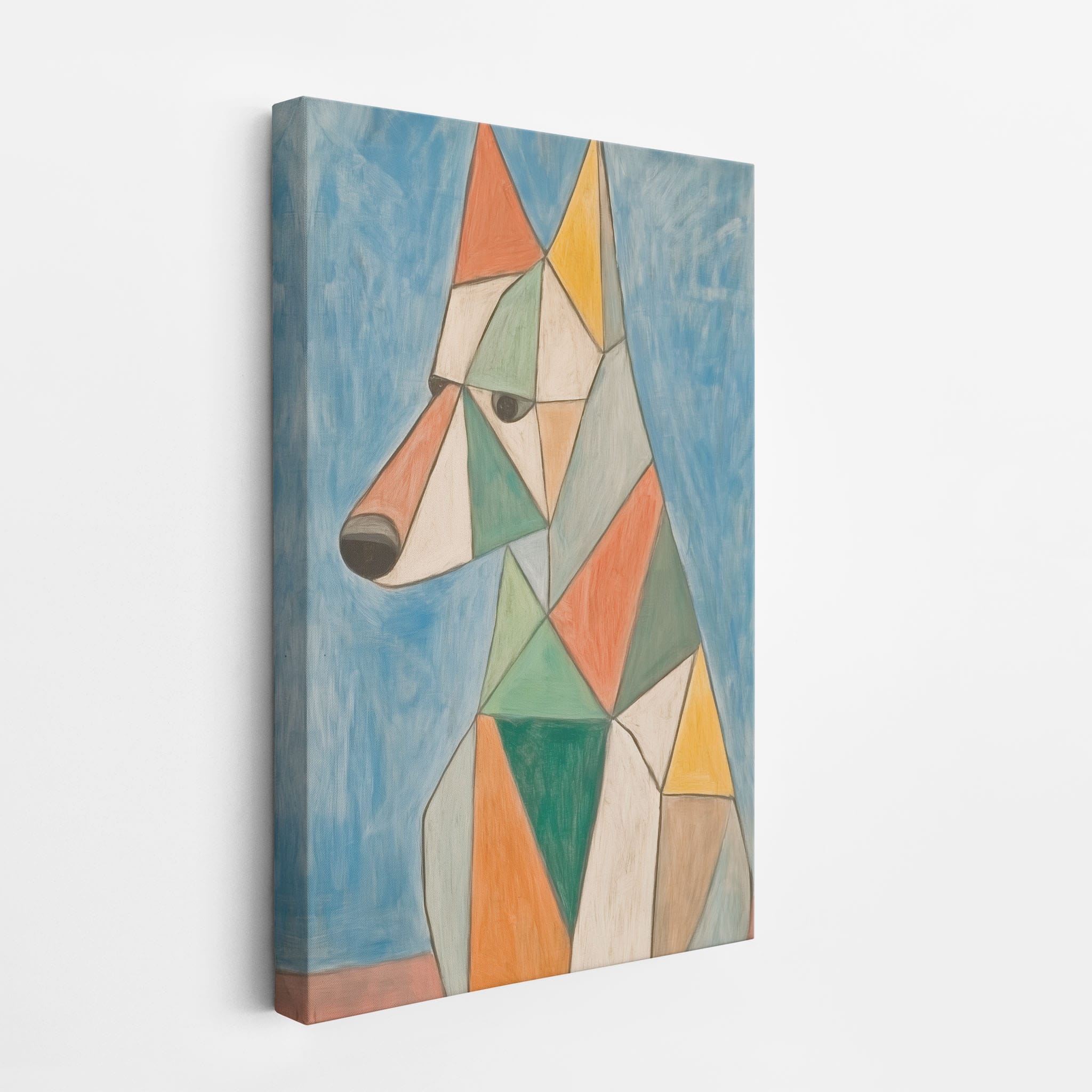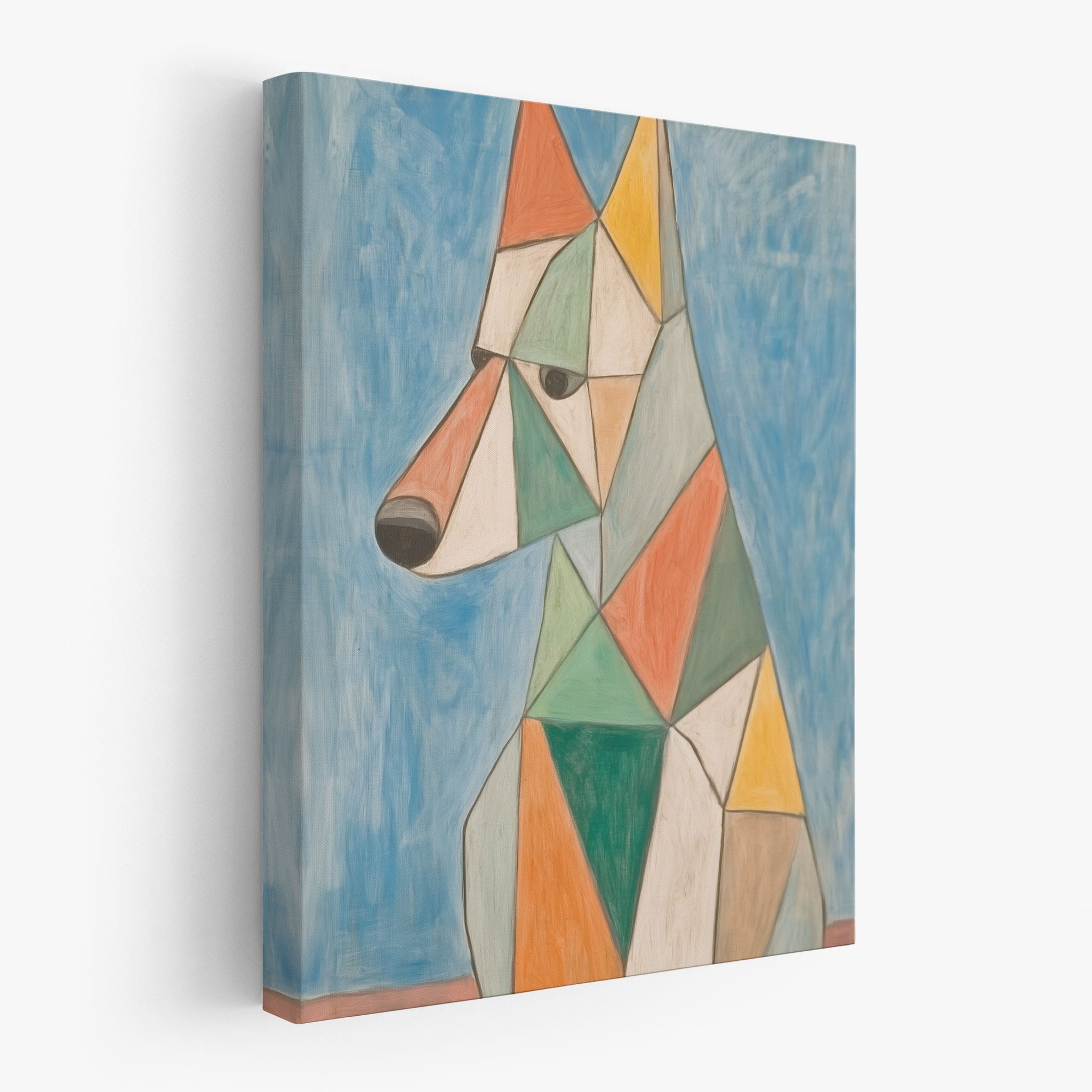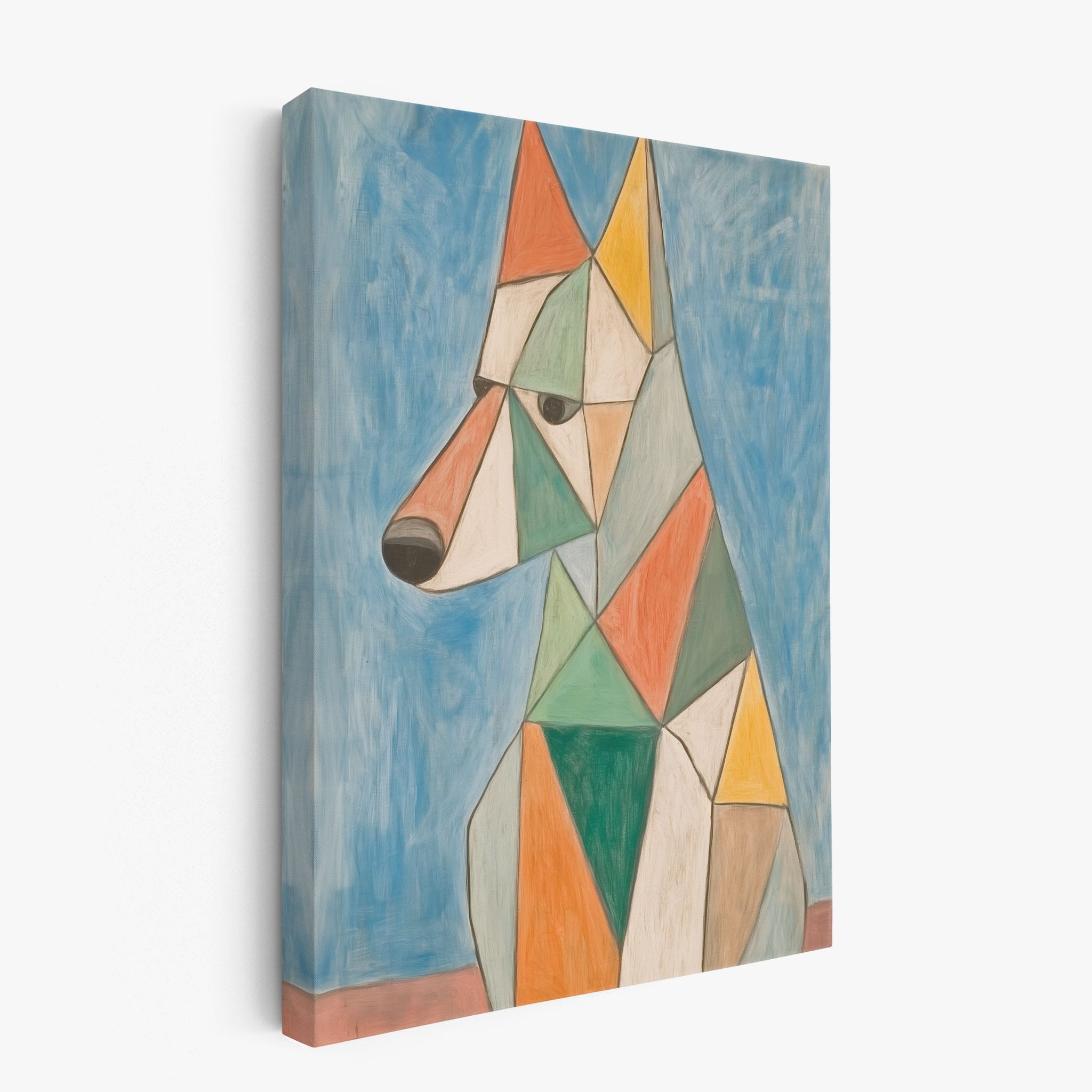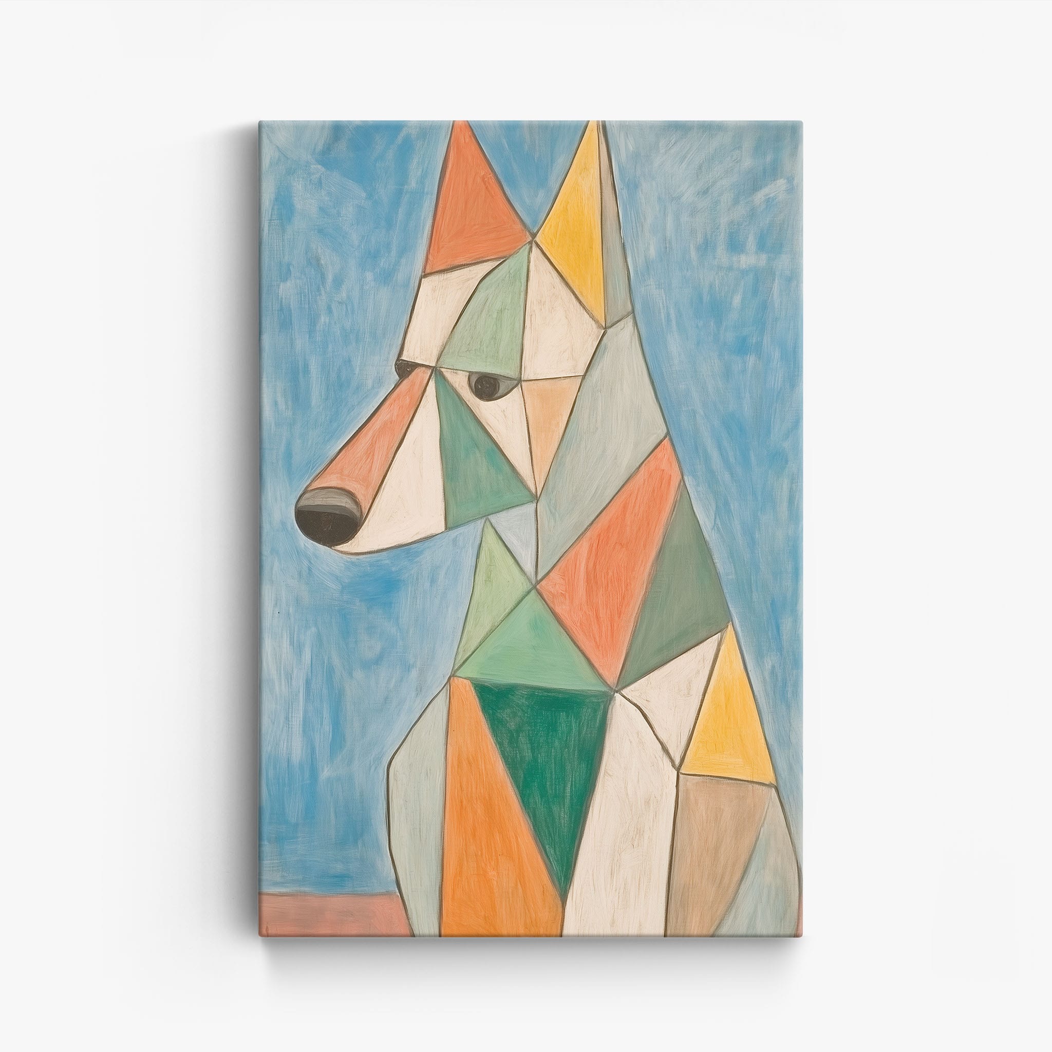 This painting showcases a stylized dog composed of bold geometric shapes, rendered in a vivid palette of earthy orange, green, and soothing blues, framed by a serene sky. Advanced into the realm of Cubism, the artwork reveals the essence of the canine spirit through fragmented, intersecting forms. Perfect for modern decor enthusiasts who value the convergence of contemporary art and timeless themes, this piece invites reflection and adds a vibrant touch to any space. A must-have for admirers of animal-inspired artwork that also resonates with the simplicity and drama of modern artistry.