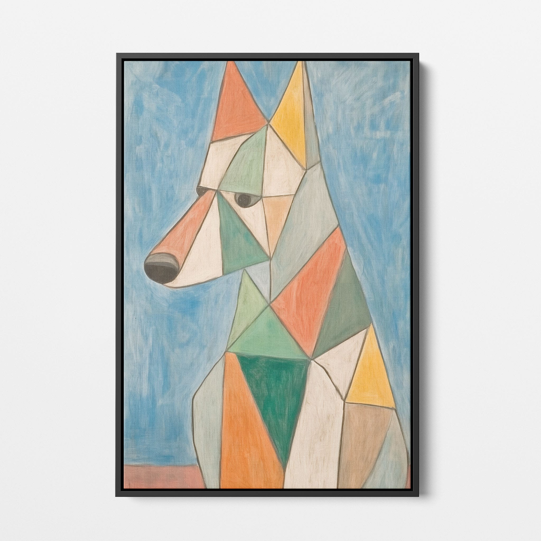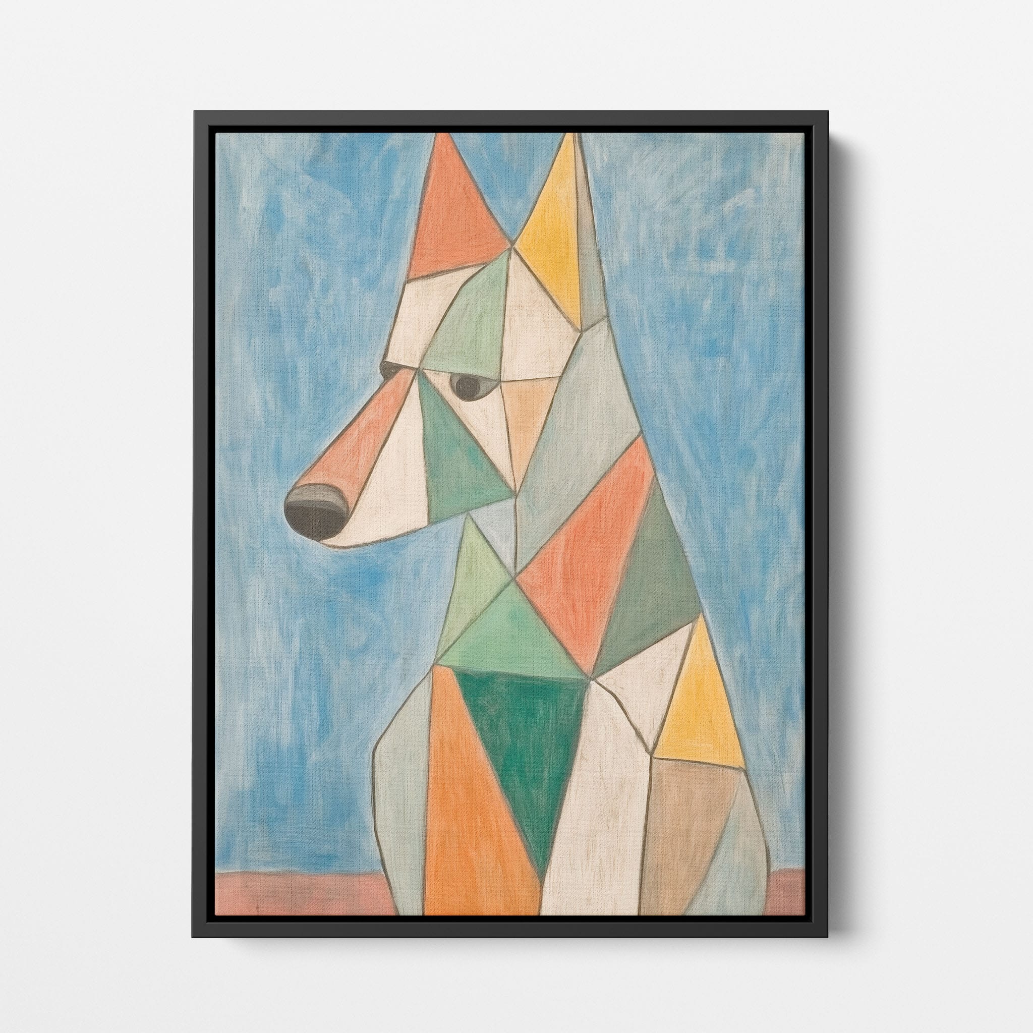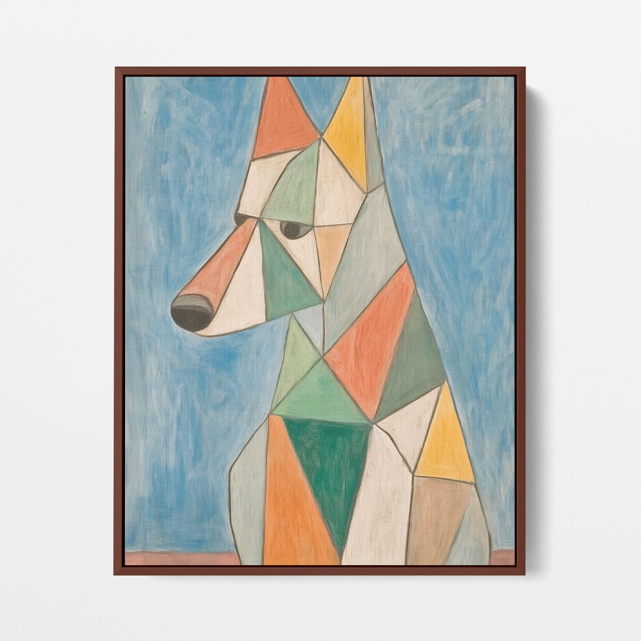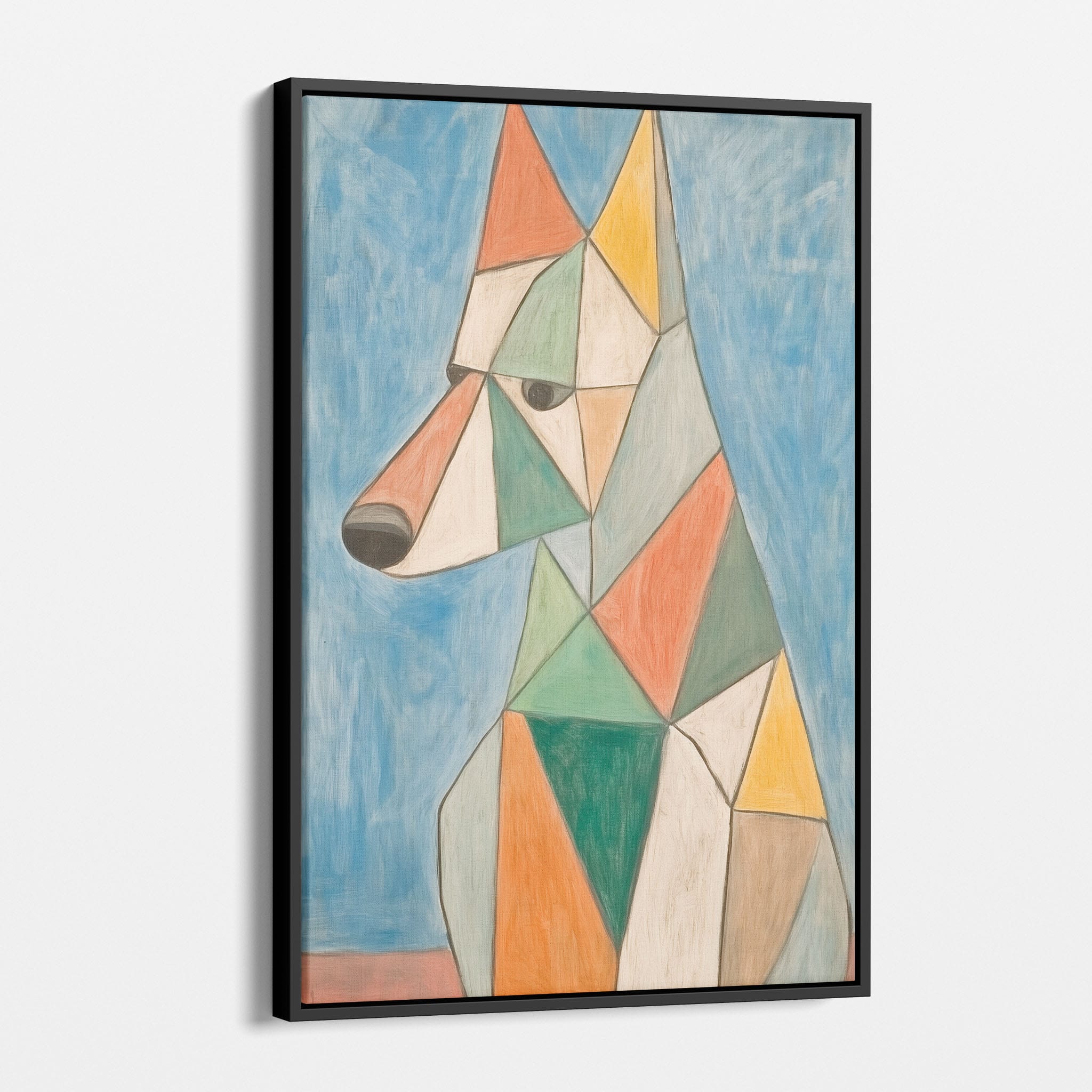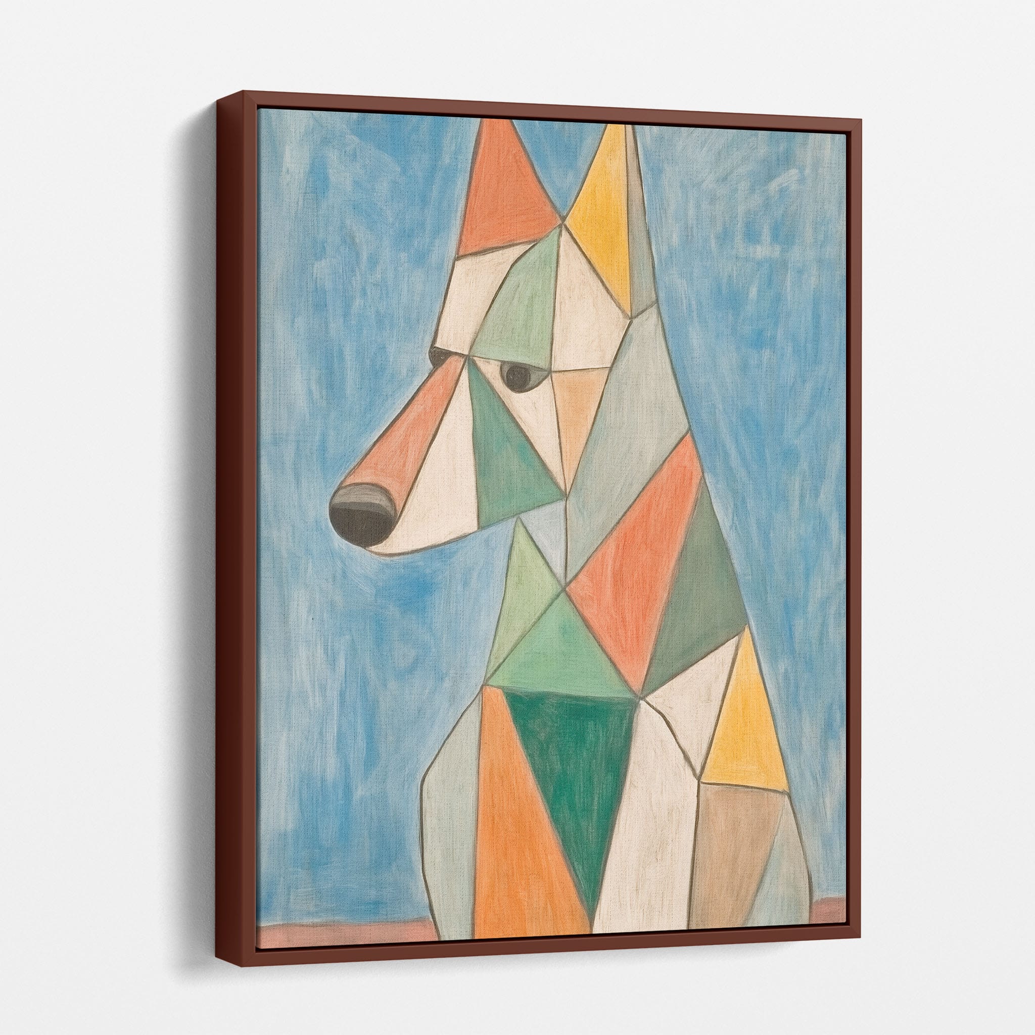 This painting showcases a stylized dog composed of bold geometric shapes, rendered in a vivid palette of earthy orange, green, and soothing blues, framed by a serene sky. Advanced into the realm of Cubism, the artwork reveals the essence of the canine spirit through fragmented, intersecting forms. Perfect for modern decor enthusiasts who value the convergence of contemporary art and timeless themes, this piece invites reflection and adds a vibrant touch to any space. A must-have for admirers of animal-inspired artwork that also resonates with the simplicity and drama of modern artistry.
