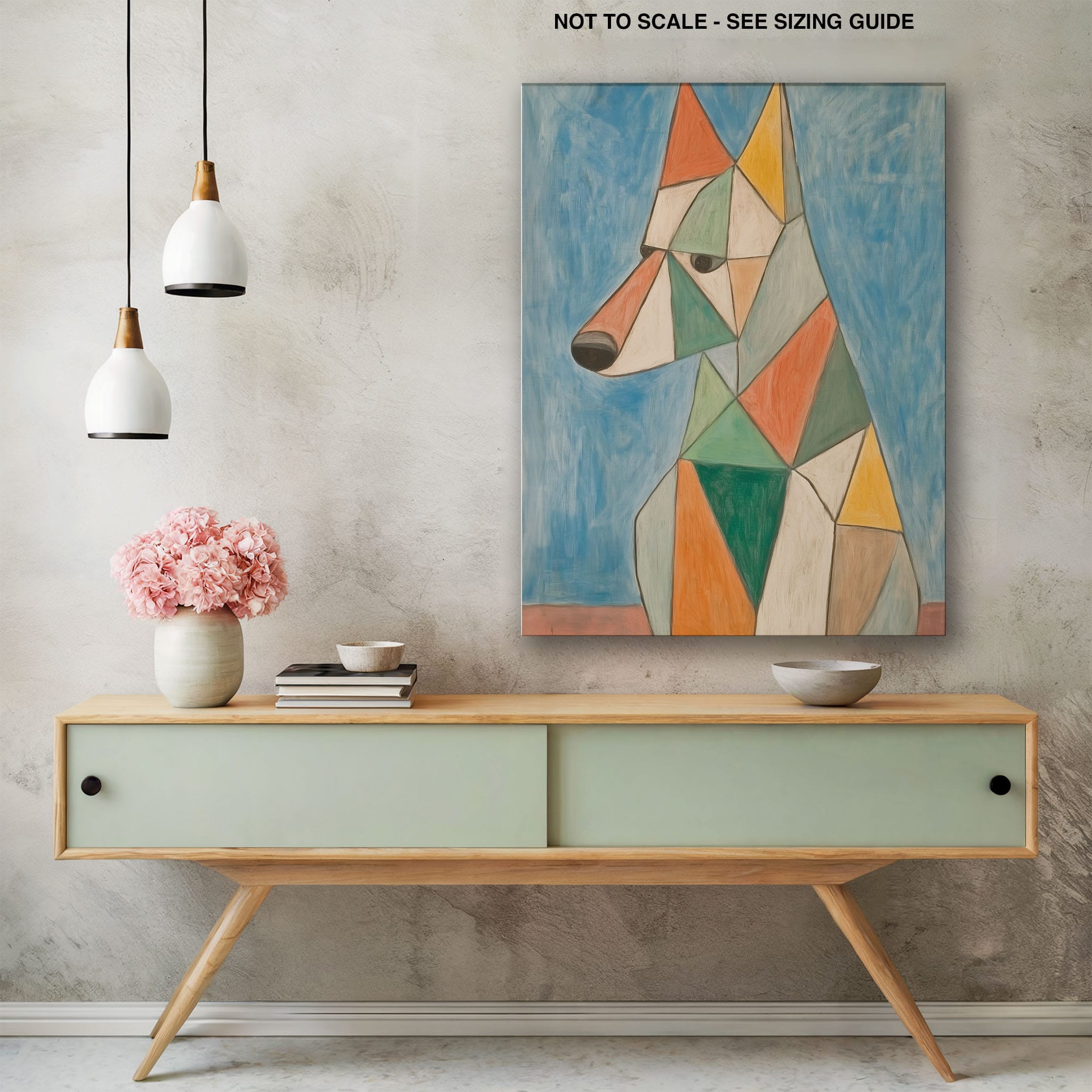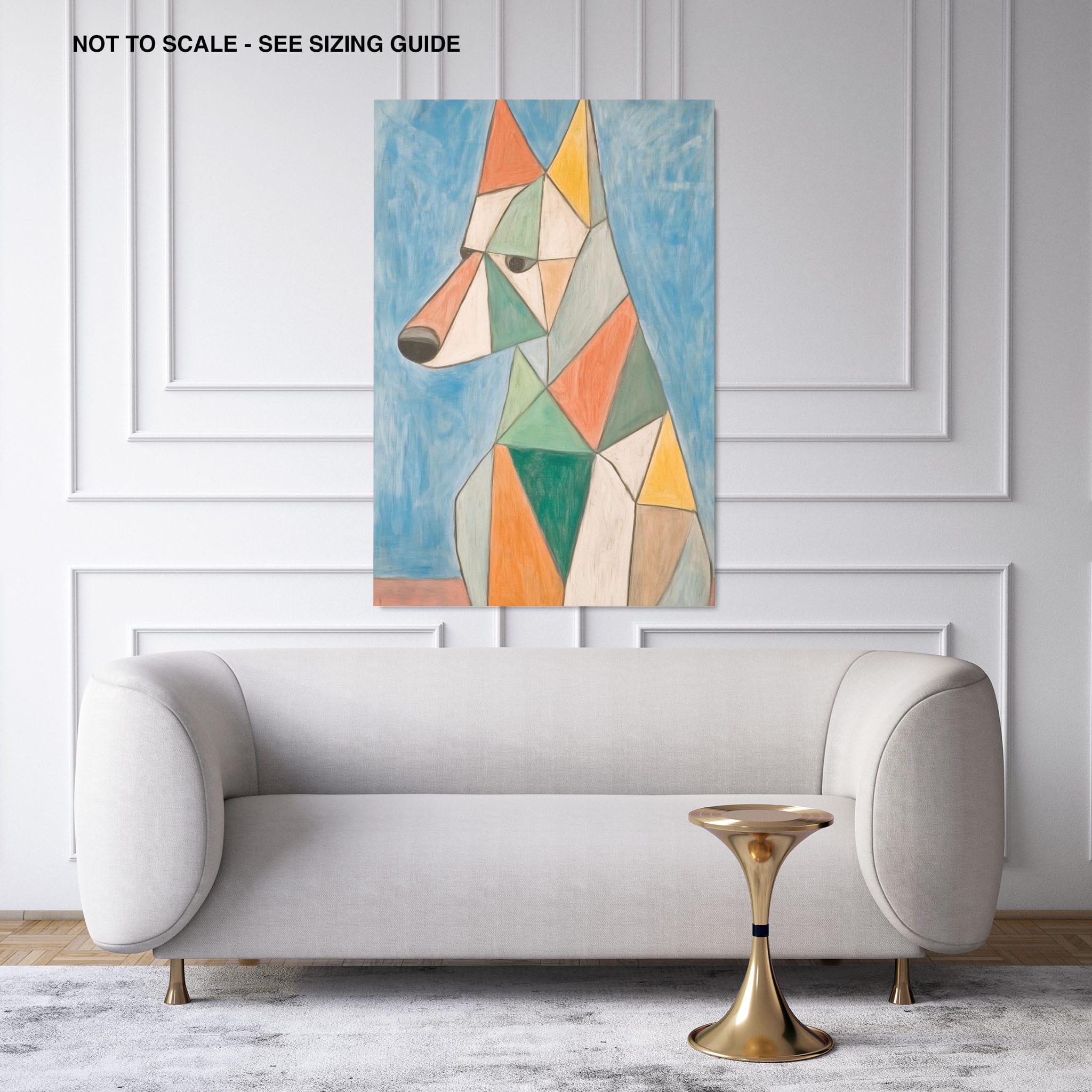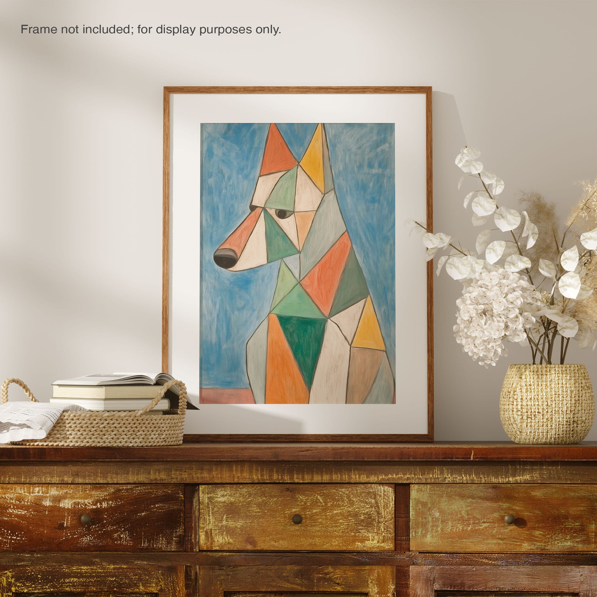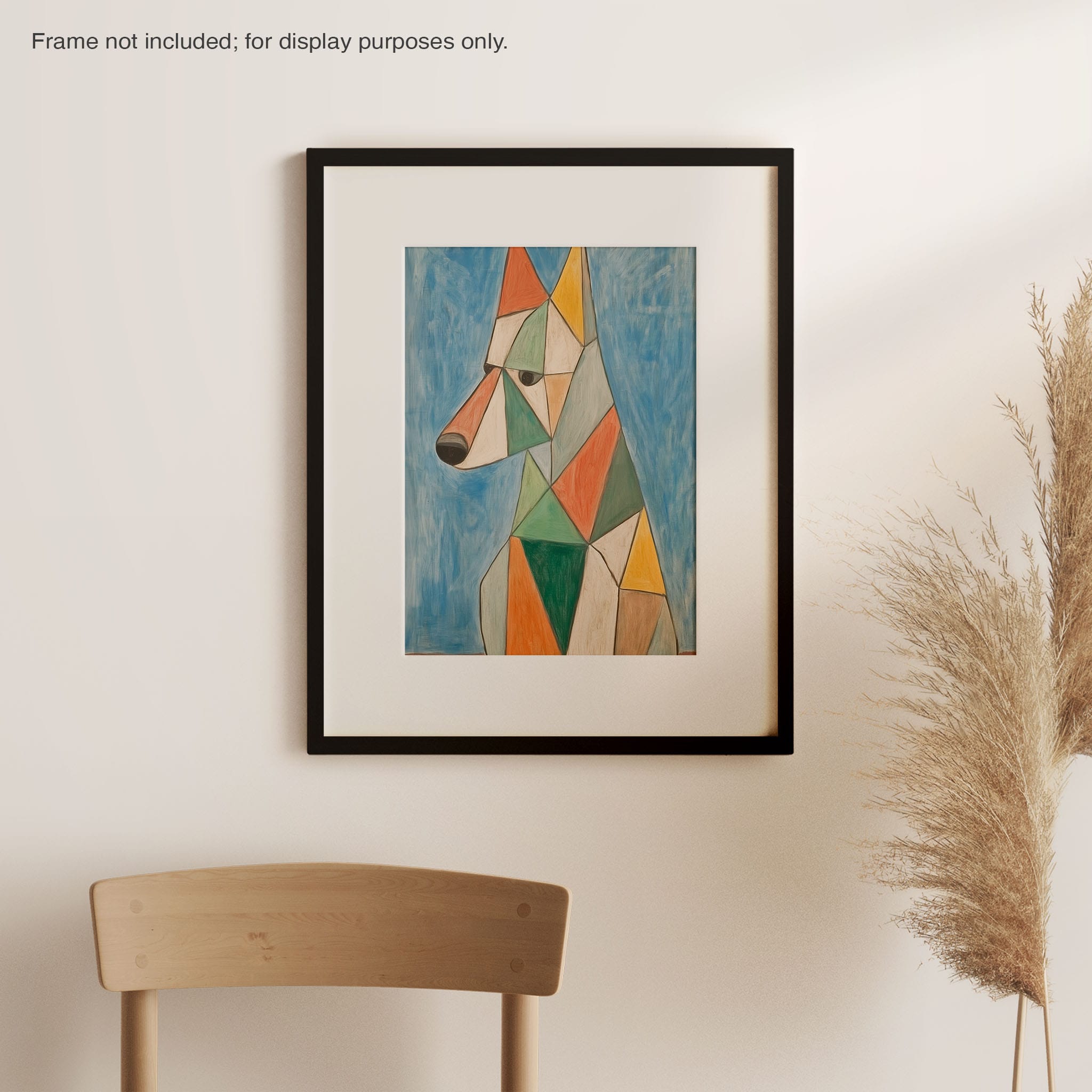 This painting showcases a stylized dog composed of bold geometric shapes, rendered in a vivid palette of earthy orange, green, and soothing blues, framed by a serene sky. Advanced into the realm of Cubism, the artwork reveals the essence of the canine spirit through fragmented, intersecting forms. Perfect for modern decor enthusiasts who value the convergence of contemporary art and timeless themes, this piece invites reflection and adds a vibrant touch to any space. A must-have for admirers of animal-inspired artwork that also resonates with the simplicity and drama of modern artistry.