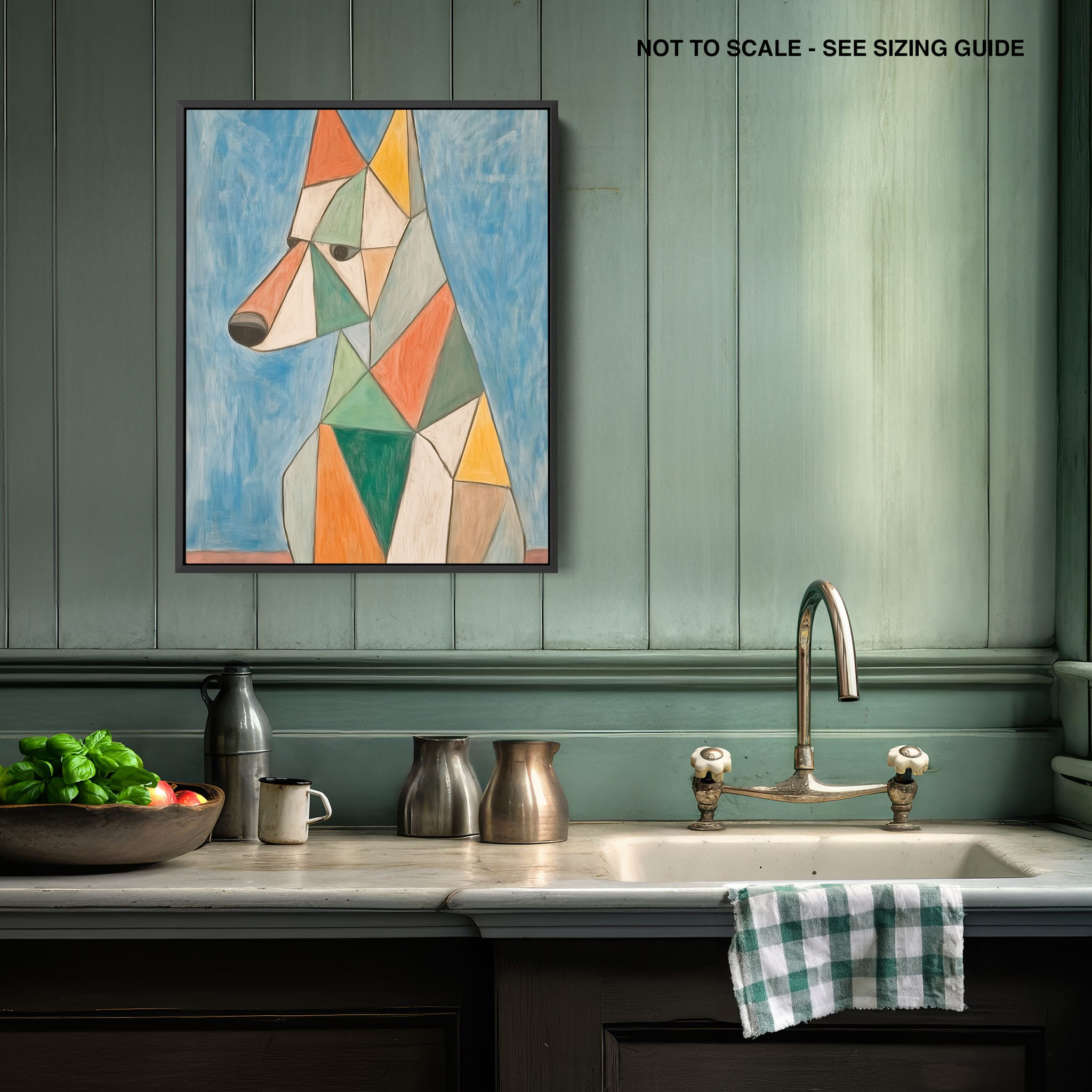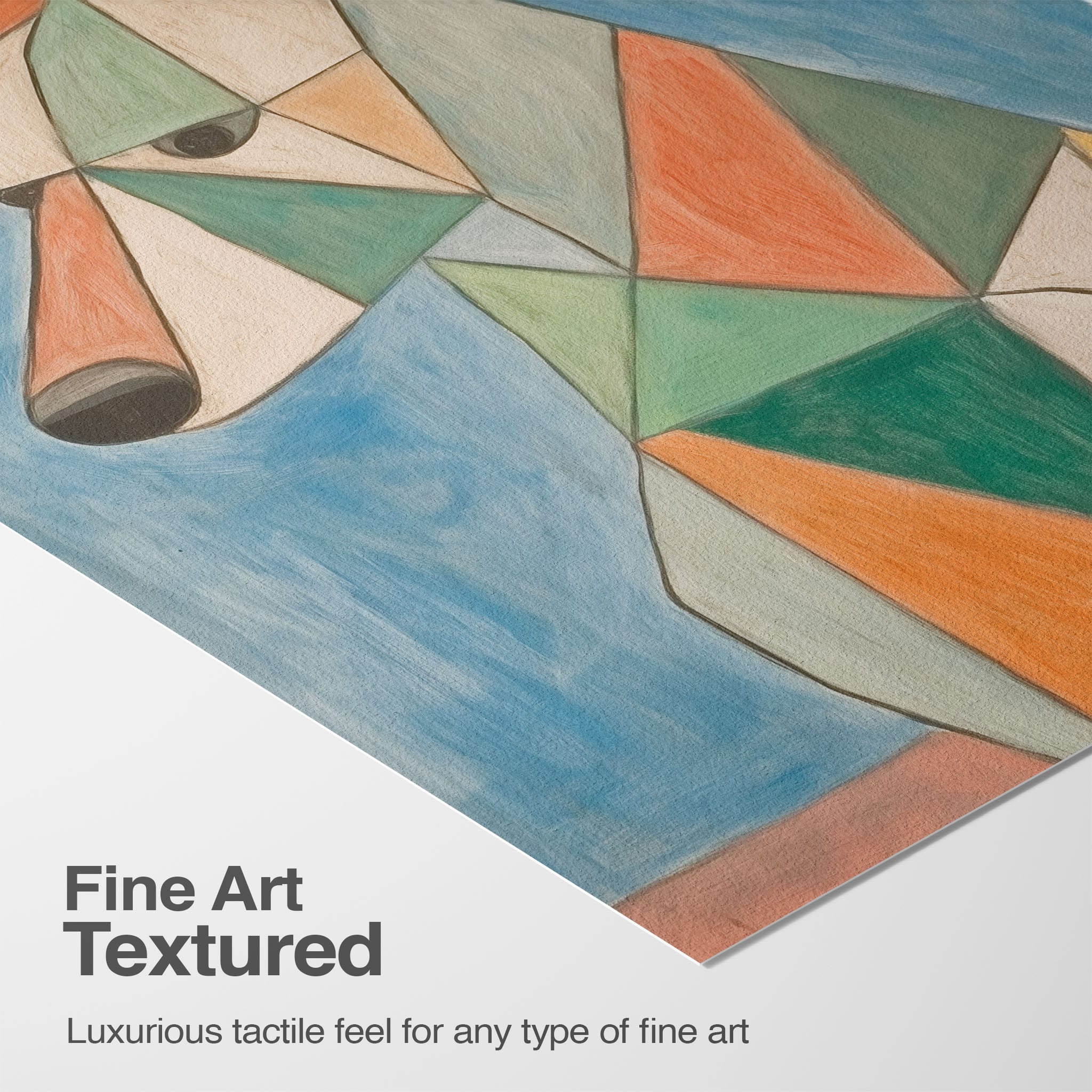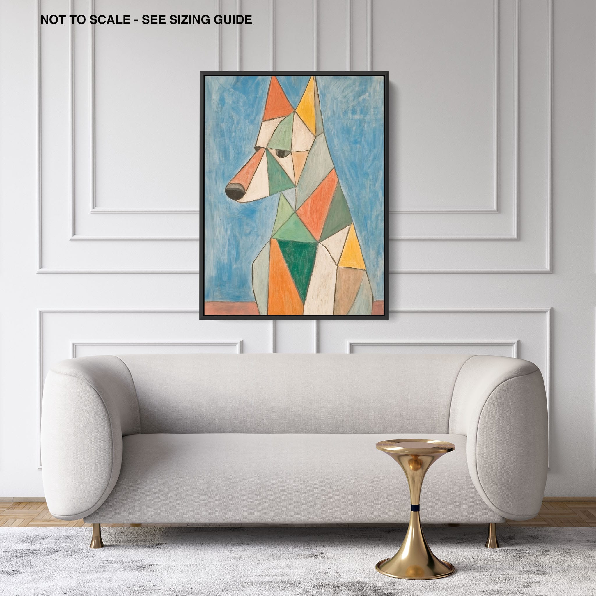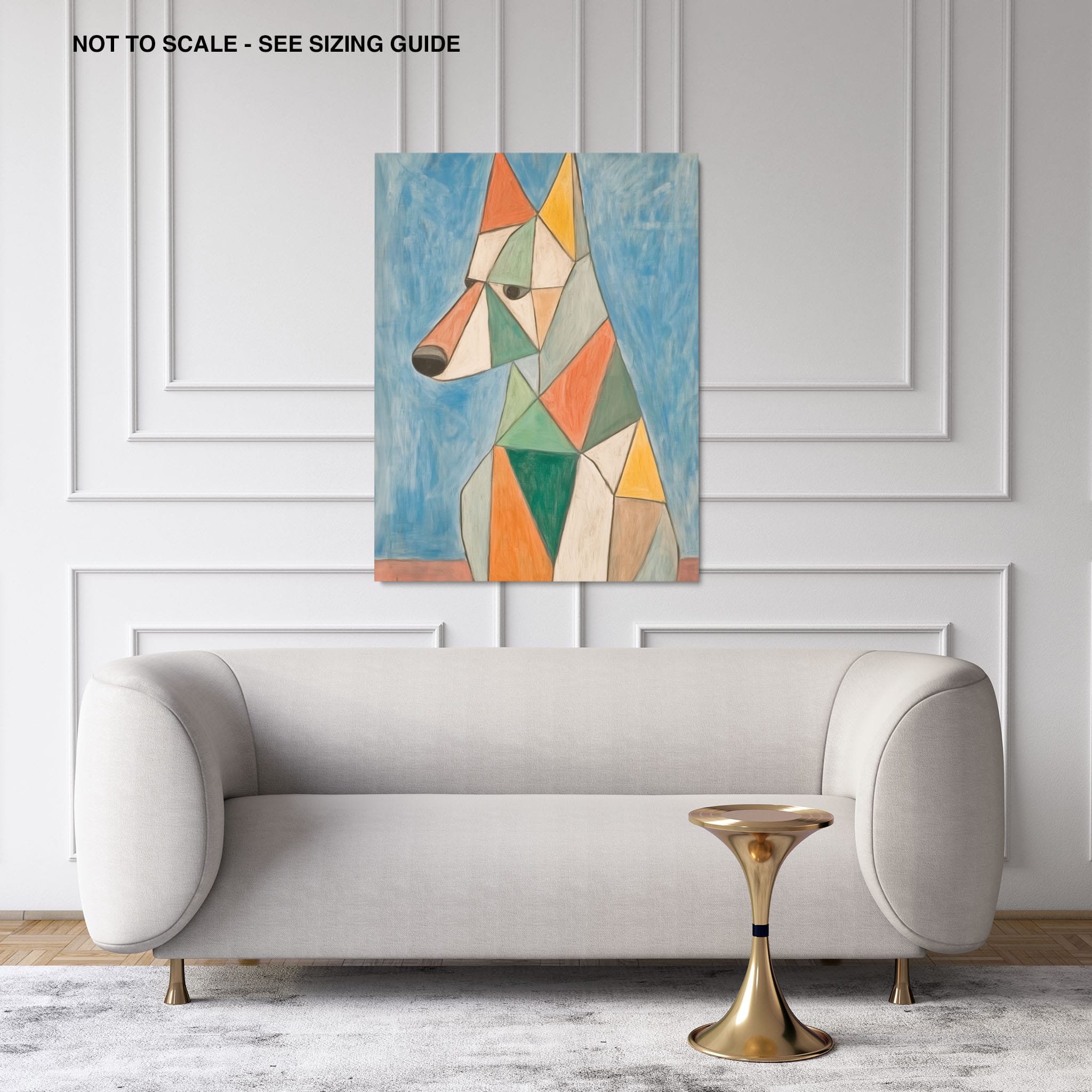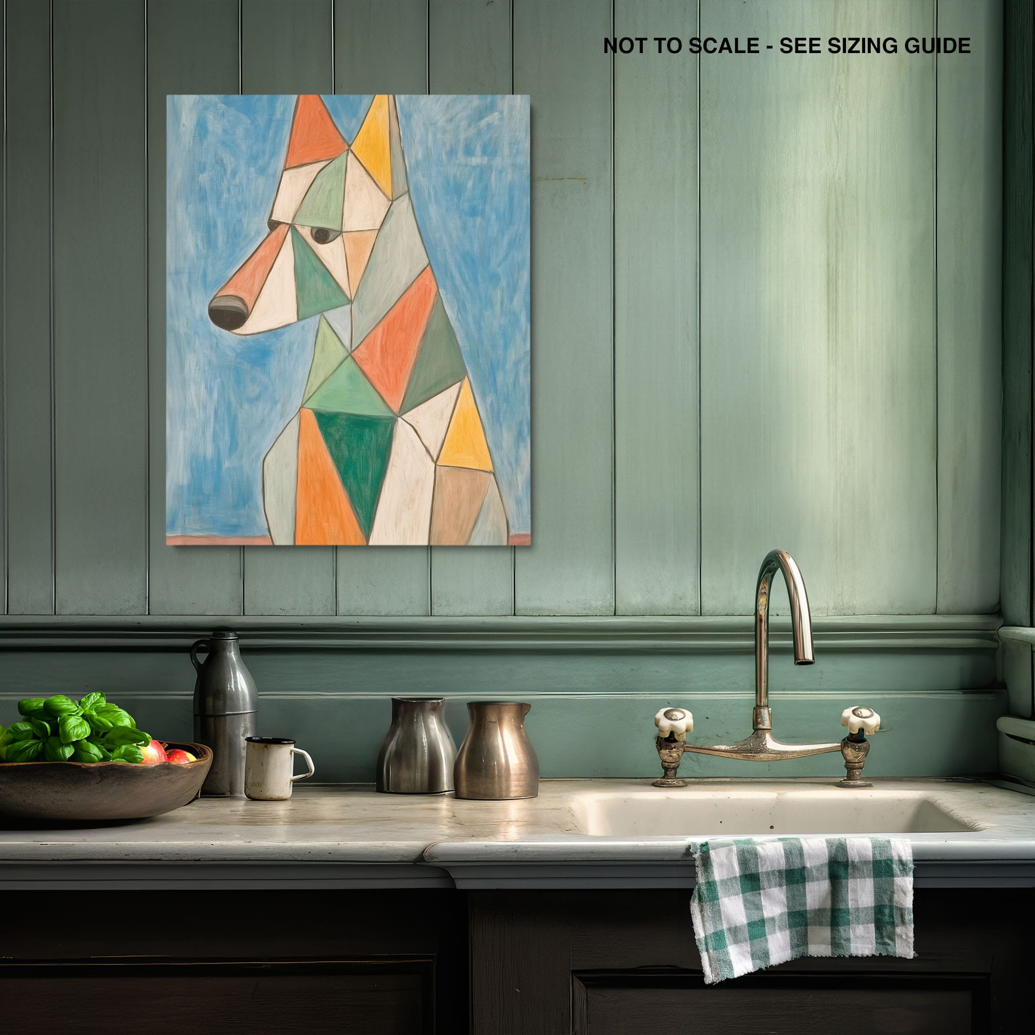 This painting showcases a stylized dog composed of bold geometric shapes, rendered in a vivid palette of earthy orange, green, and soothing blues, framed by a serene sky. Advanced into the realm of Cubism, the artwork reveals the essence of the canine spirit through fragmented, intersecting forms. Perfect for modern decor enthusiasts who value the convergence of contemporary art and timeless themes, this piece invites reflection and adds a vibrant touch to any space. A must-have for admirers of animal-inspired artwork that also resonates with the simplicity and drama of modern artistry.