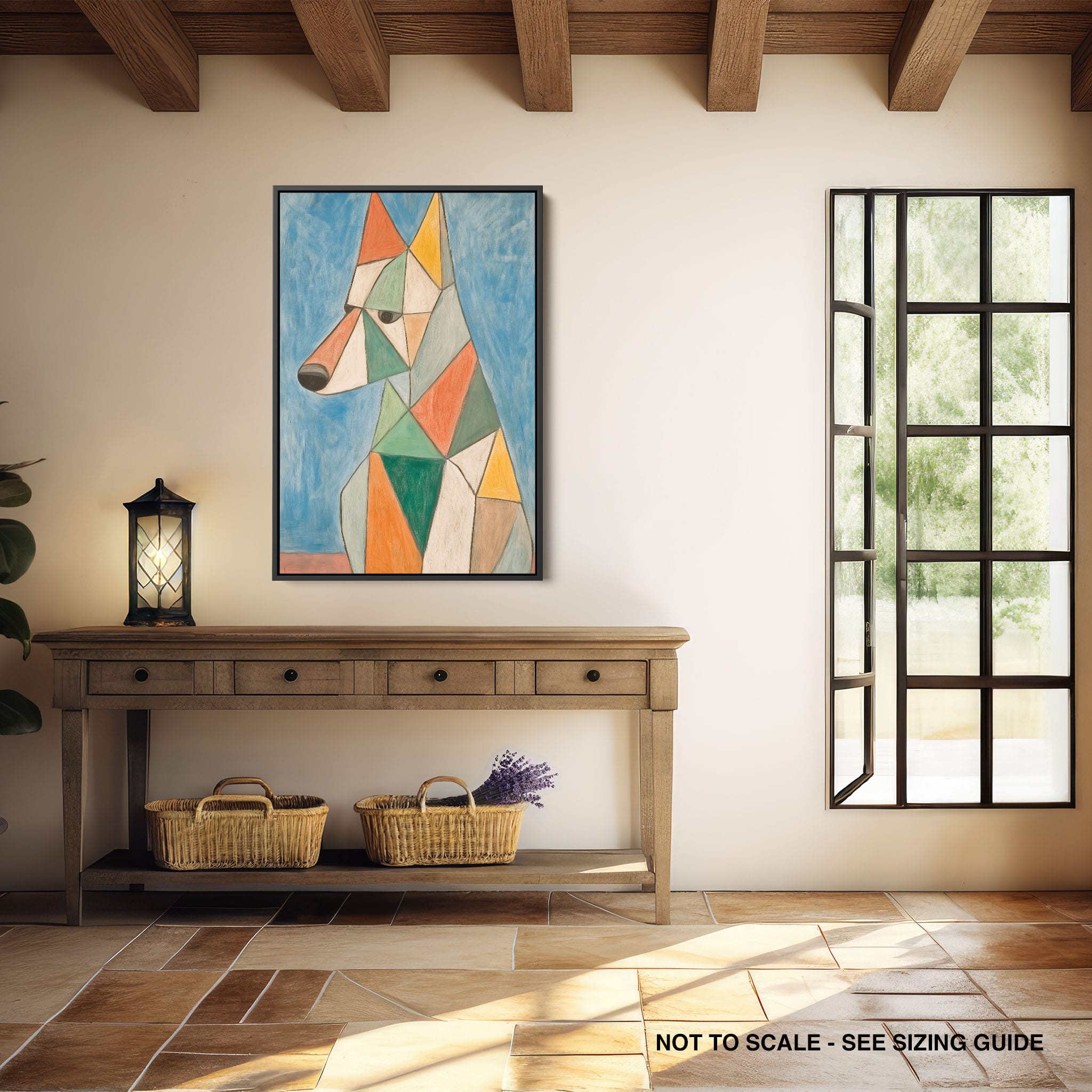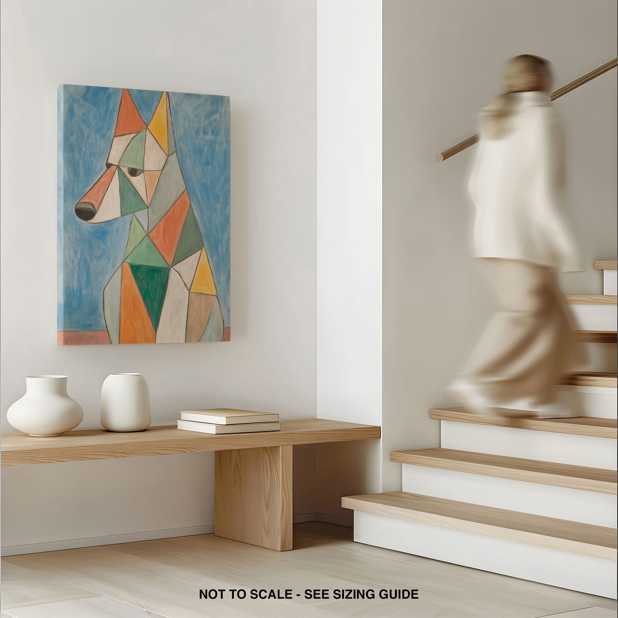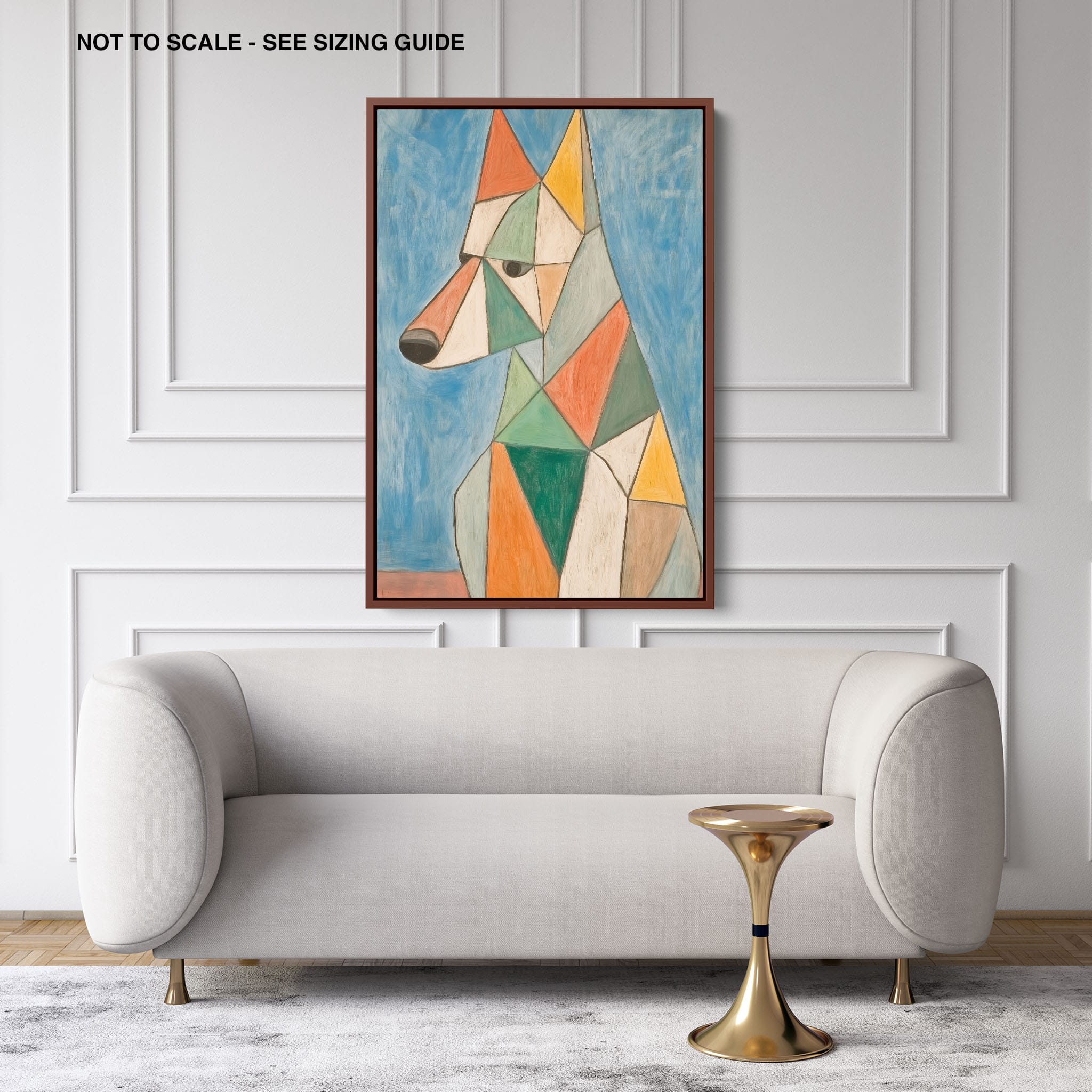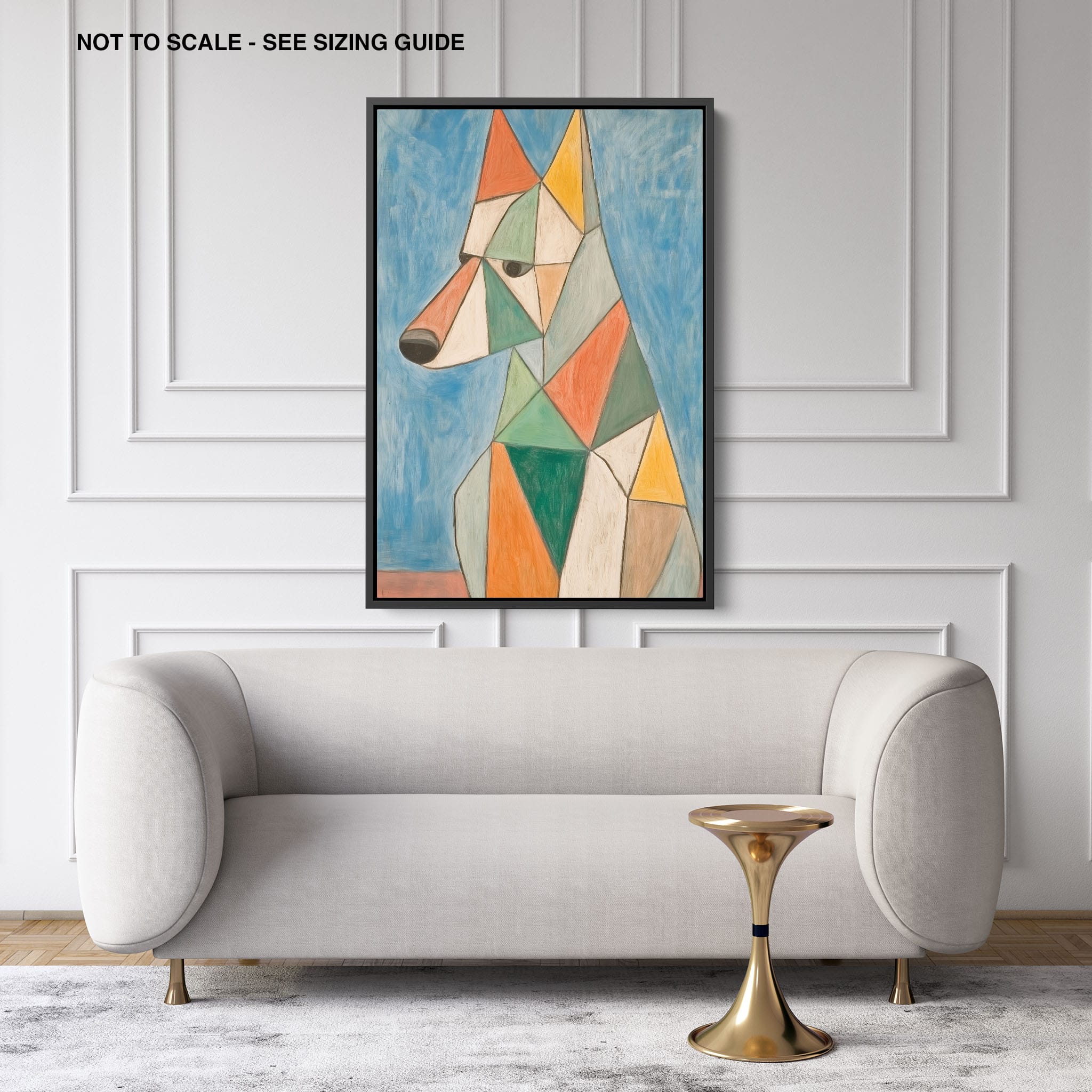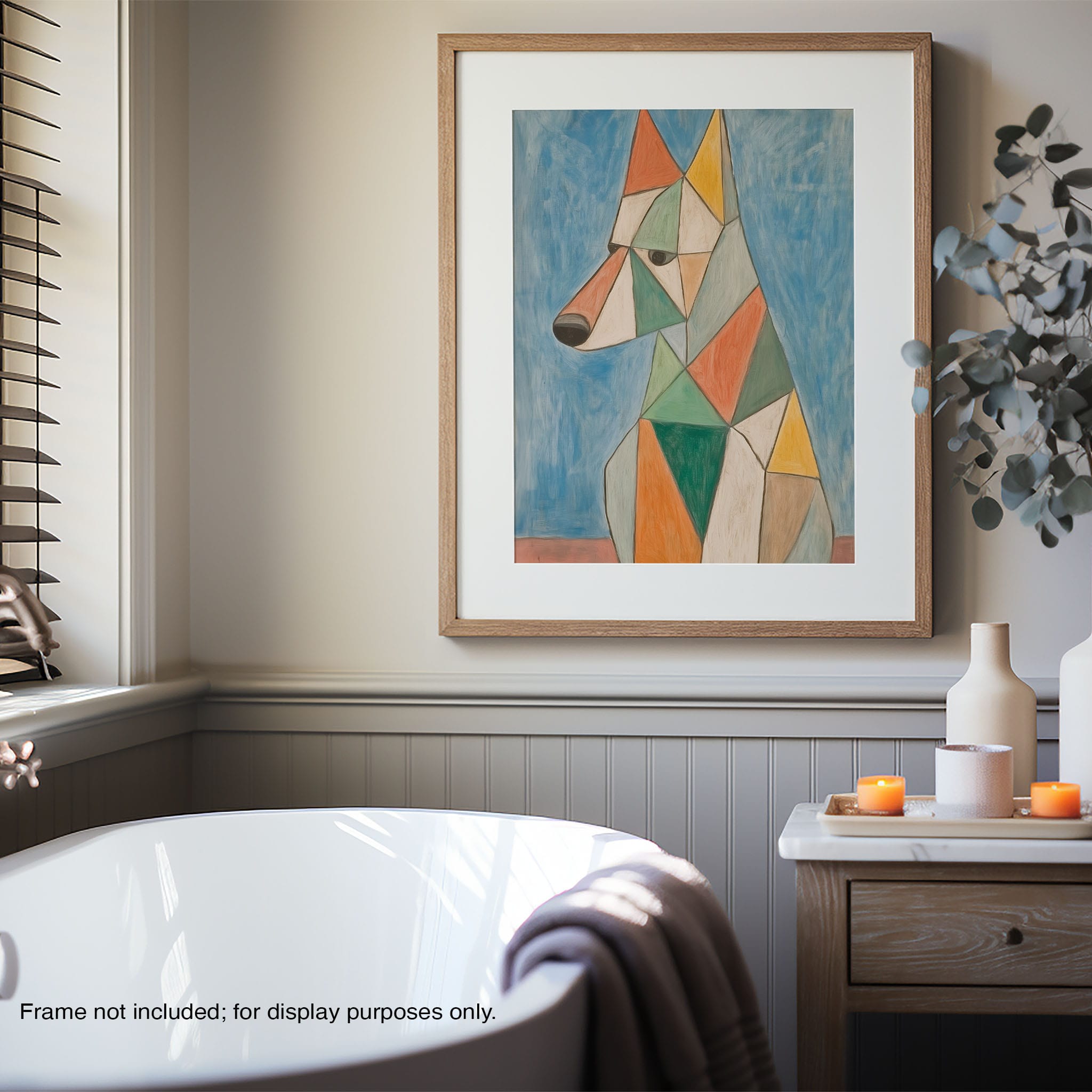 This painting showcases a stylized dog composed of bold geometric shapes, rendered in a vivid palette of earthy orange, green, and soothing blues, framed by a serene sky. Advanced into the realm of Cubism, the artwork reveals the essence of the canine spirit through fragmented, intersecting forms. Perfect for modern decor enthusiasts who value the convergence of contemporary art and timeless themes, this piece invites reflection and adds a vibrant touch to any space. A must-have for admirers of animal-inspired artwork that also resonates with the simplicity and drama of modern artistry.