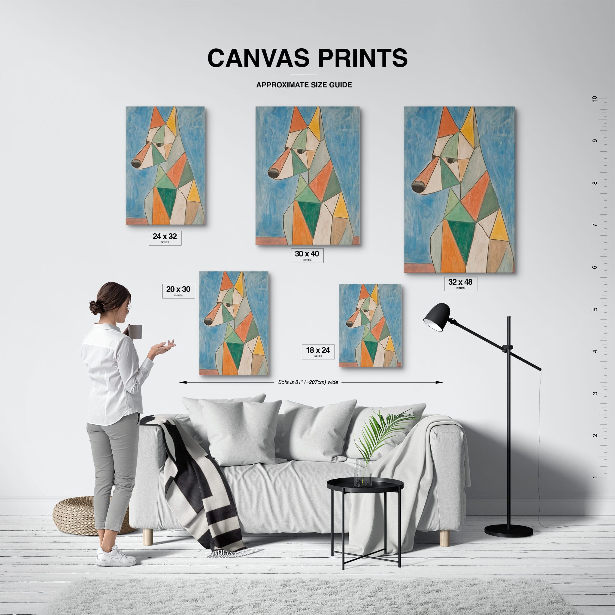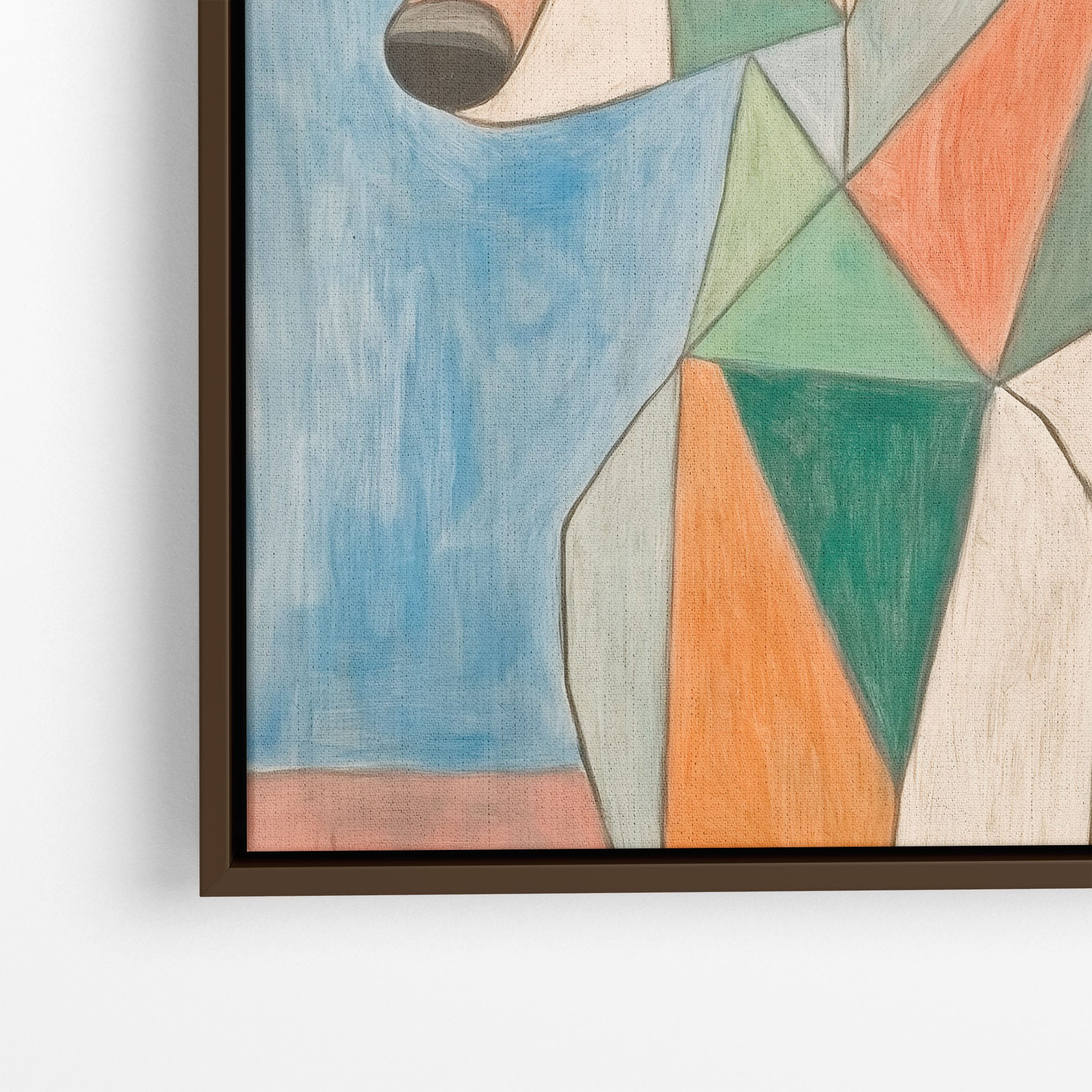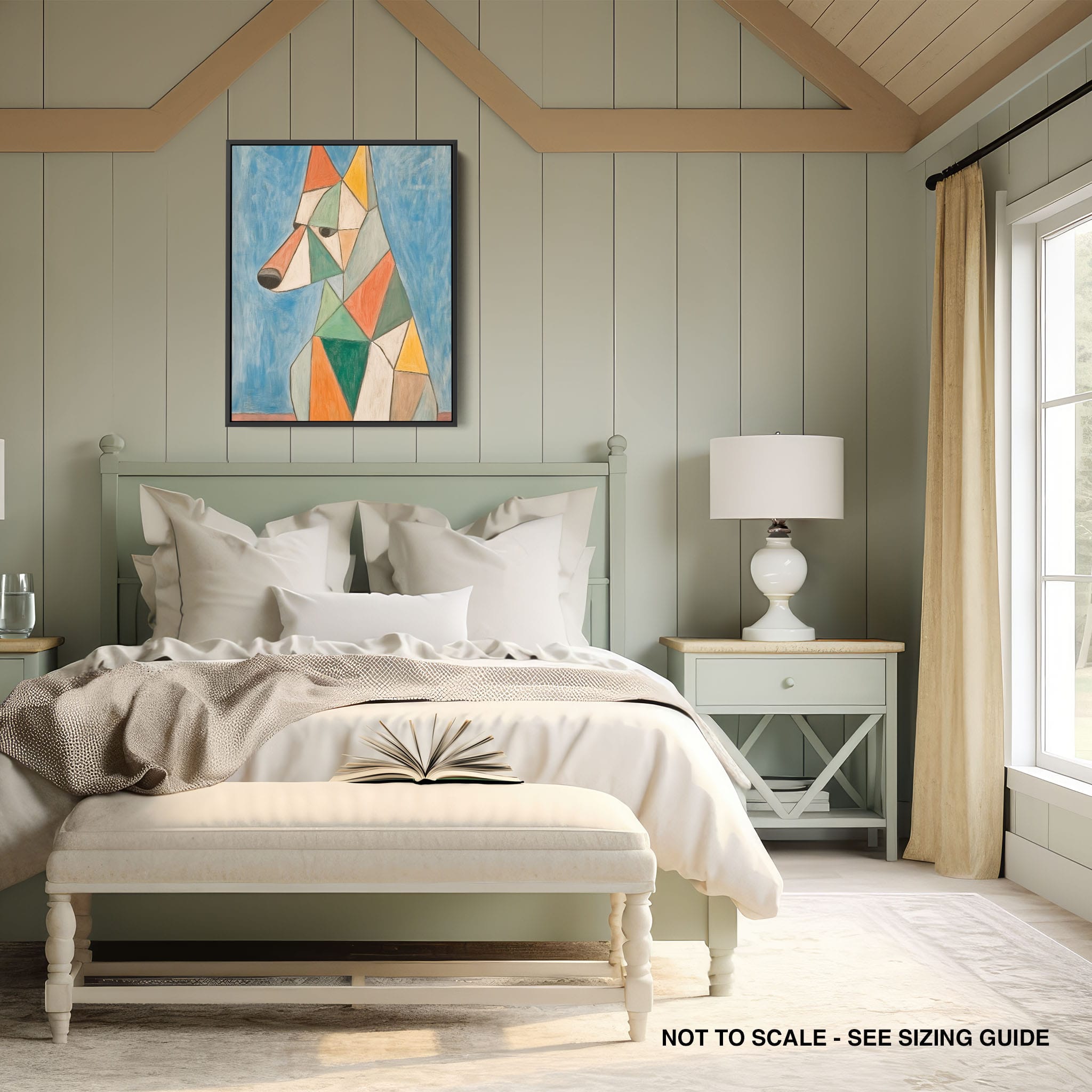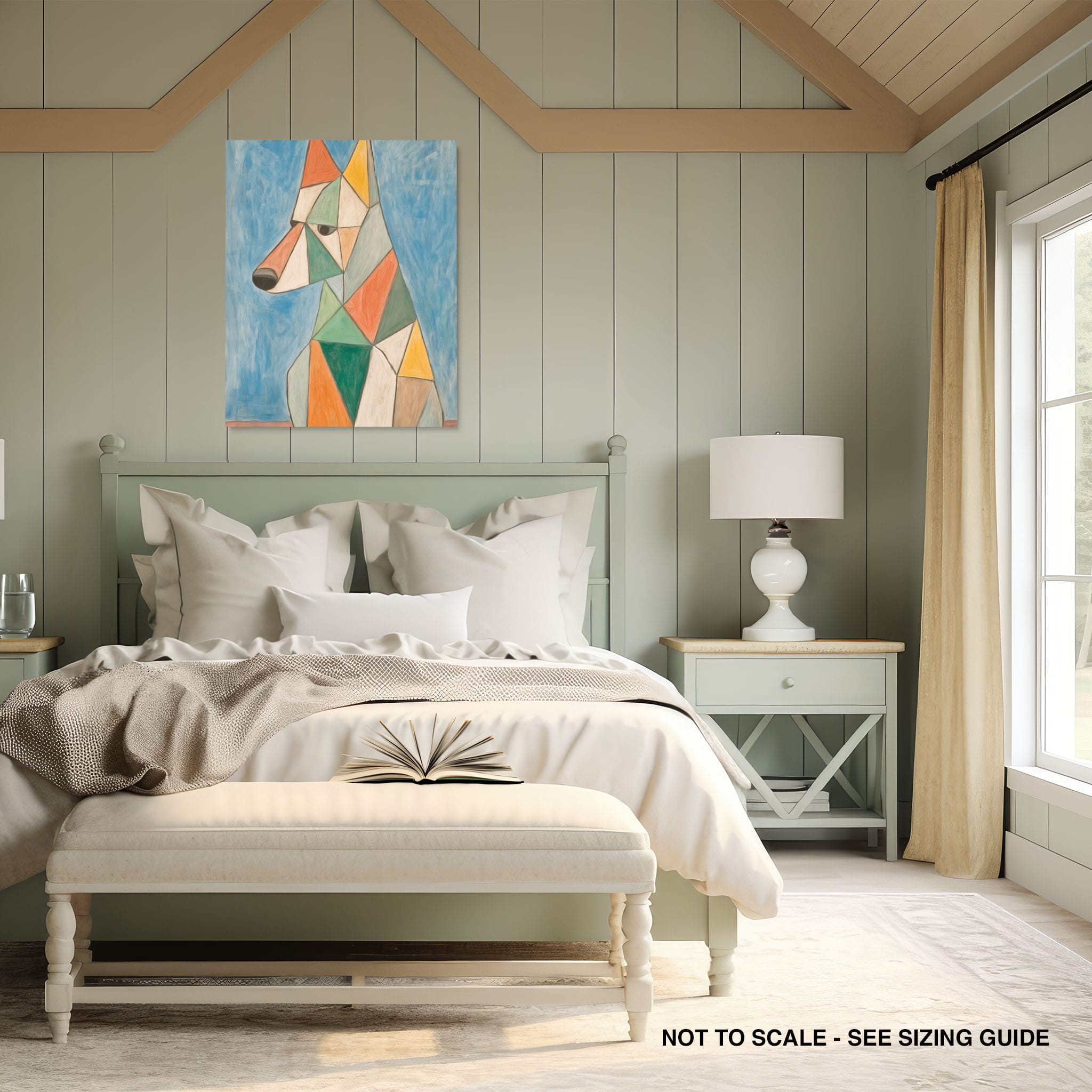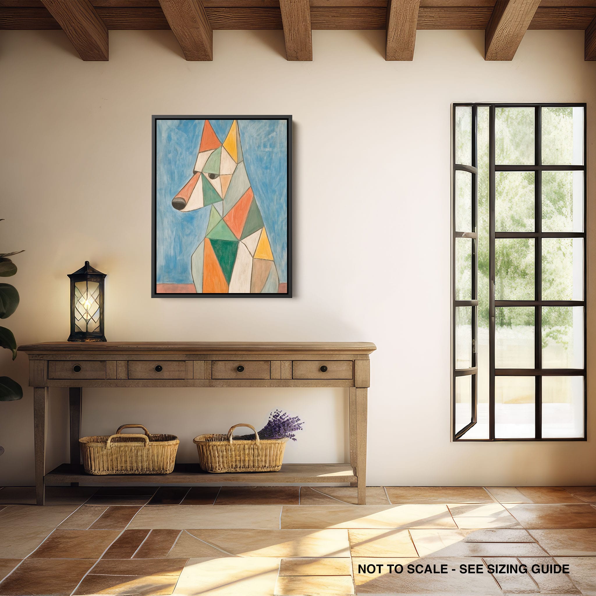 This painting showcases a stylized dog composed of bold geometric shapes, rendered in a vivid palette of earthy orange, green, and soothing blues, framed by a serene sky. Advanced into the realm of Cubism, the artwork reveals the essence of the canine spirit through fragmented, intersecting forms. Perfect for modern decor enthusiasts who value the convergence of contemporary art and timeless themes, this piece invites reflection and adds a vibrant touch to any space. A must-have for admirers of animal-inspired artwork that also resonates with the simplicity and drama of modern artistry.