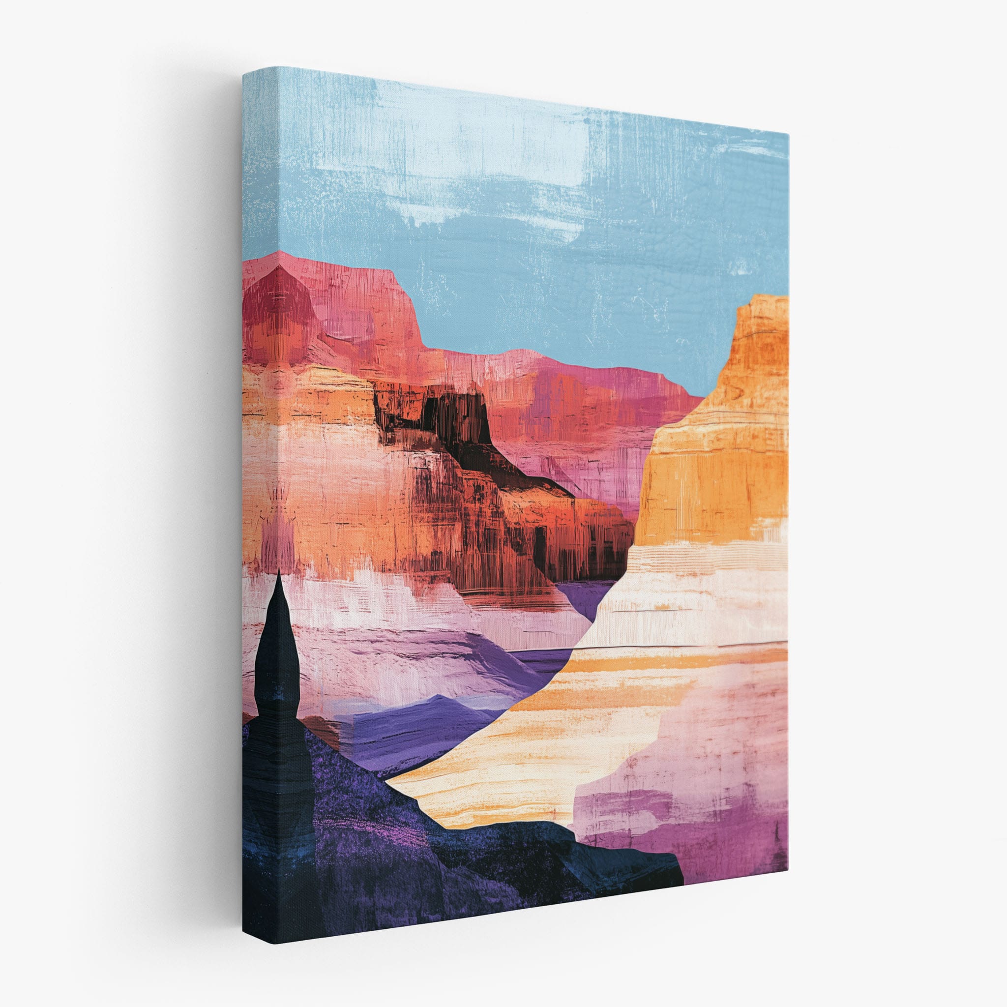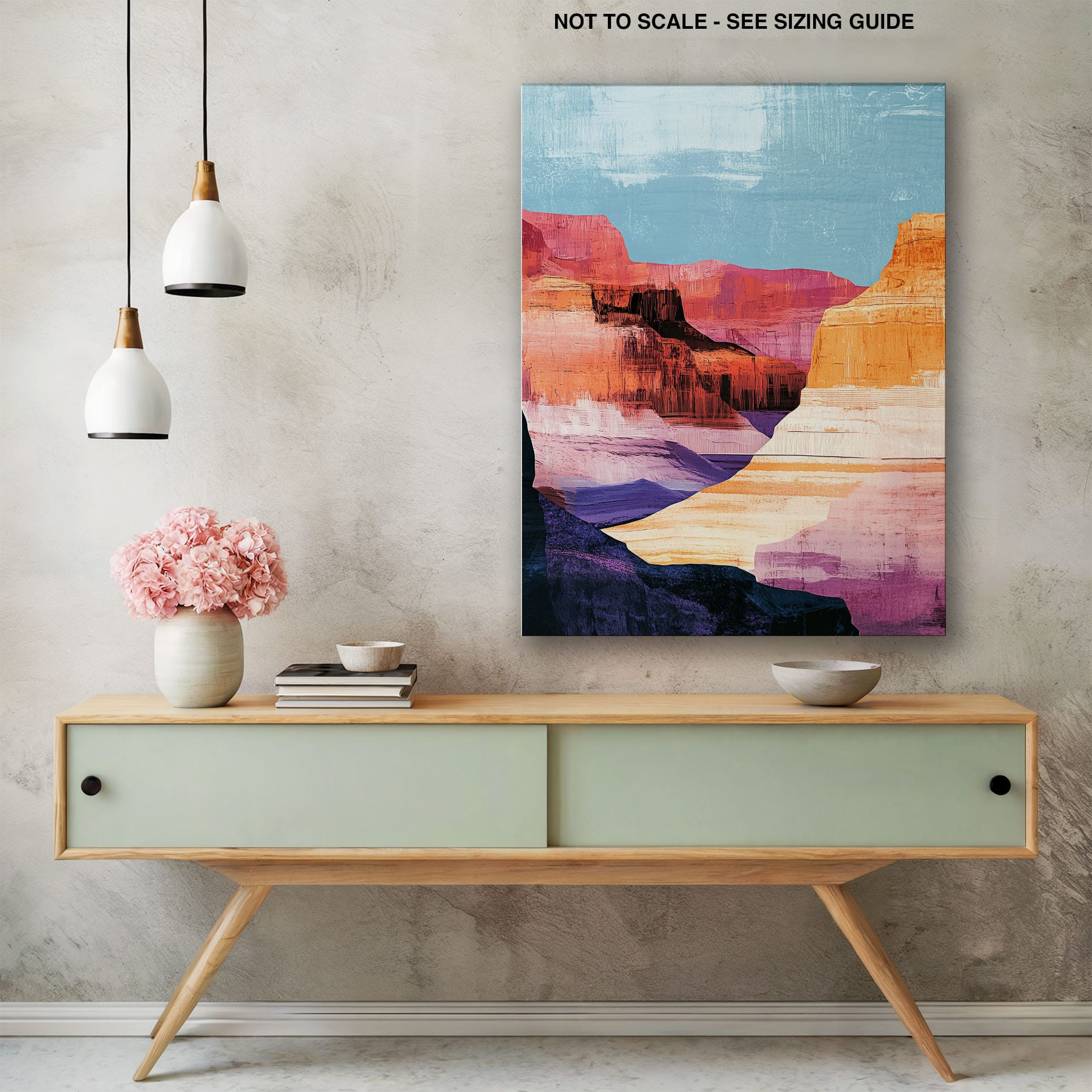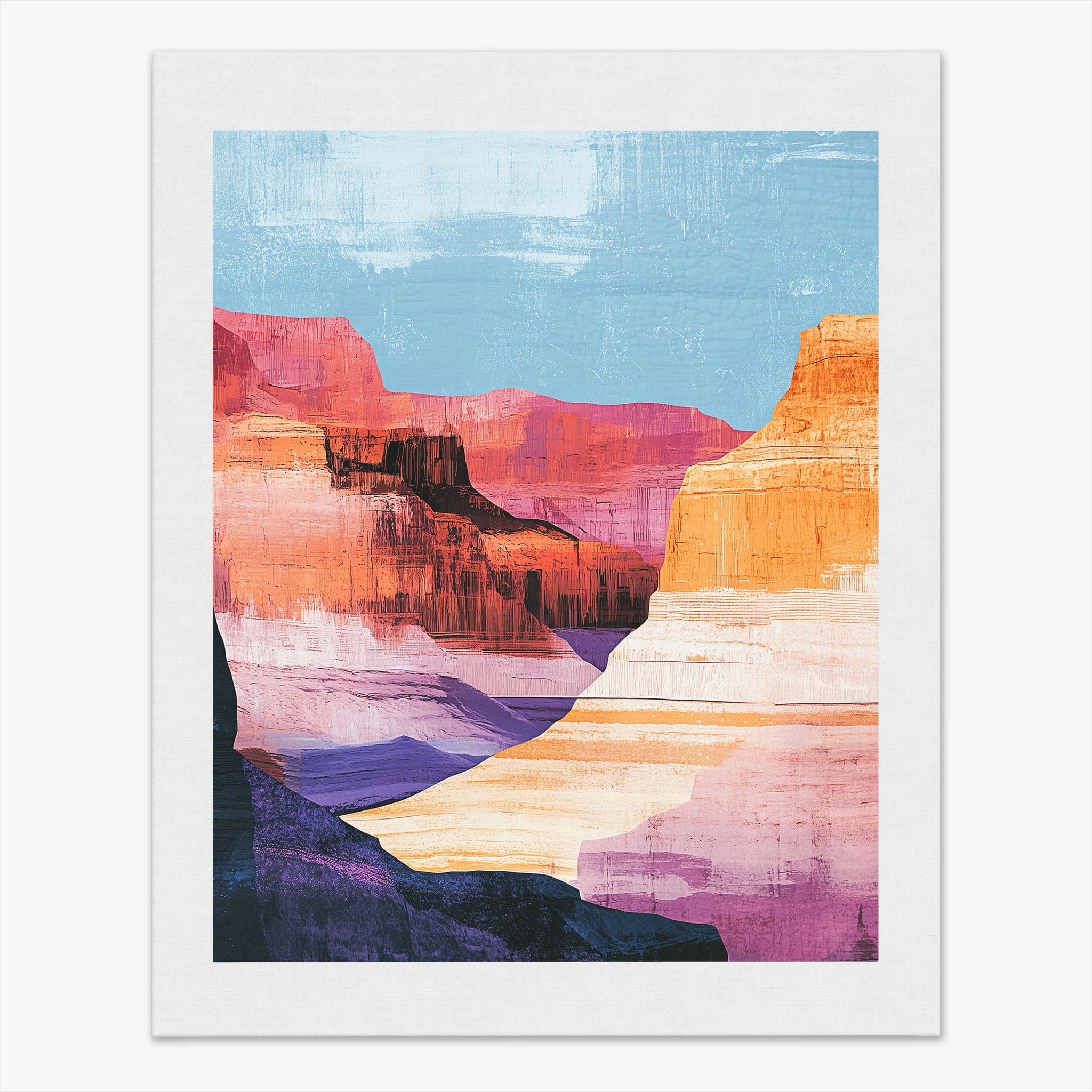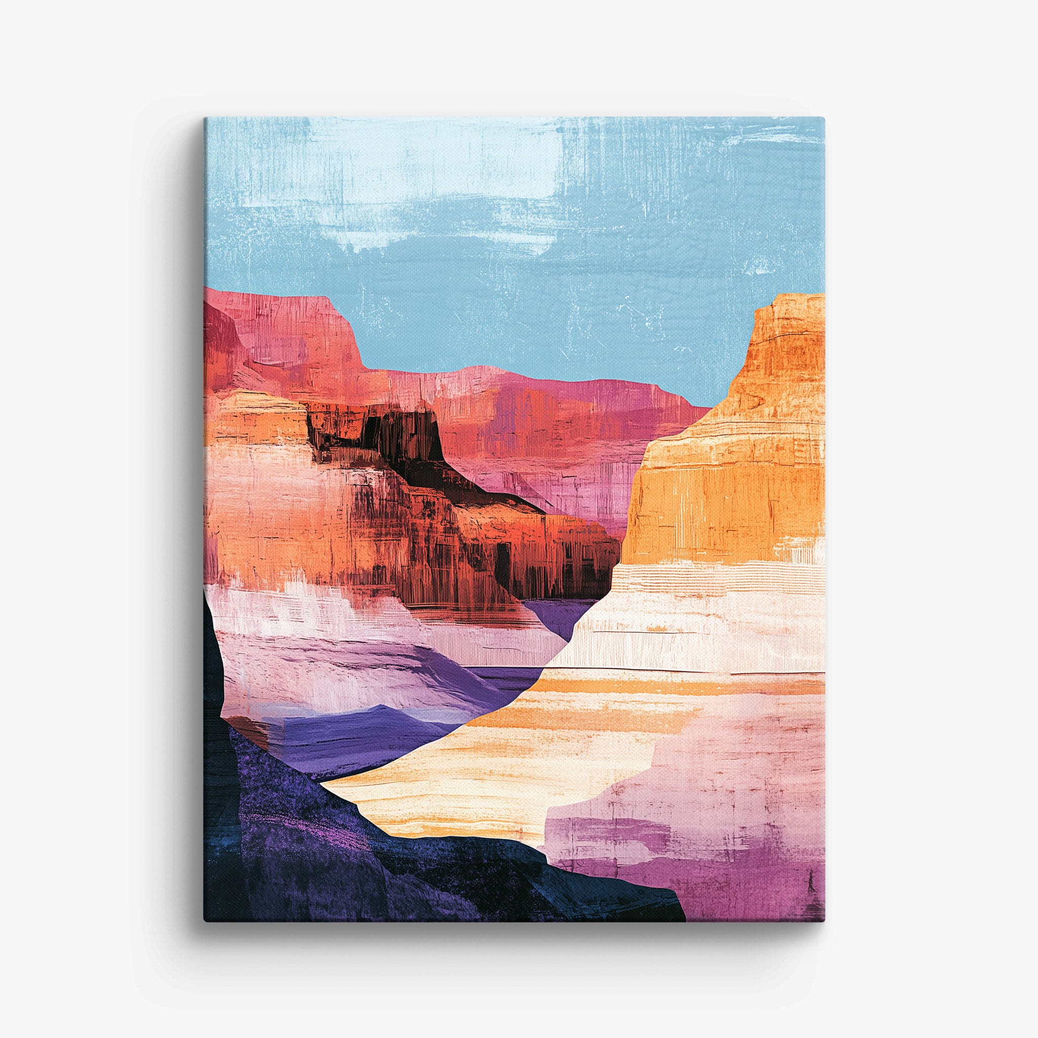 This digital illustration presents a striking landscape with sharp, geometric forms and vibrant layers of color, portraying an abstract interpretation of majestic cliffs and expansive skies. The artist uses a mix of calm and bold hues, ranging from serene blues to vivid oranges and purples, to craft a modern aesthetic that invites contemplation and admiration. Ideal for lovers of landscapes with a contemporary twist, this piece can transform any room by adding a touch of sophistication and color. Elevate your home decor with this unique artwork that seamlessly blends abstract art with geometric precision.