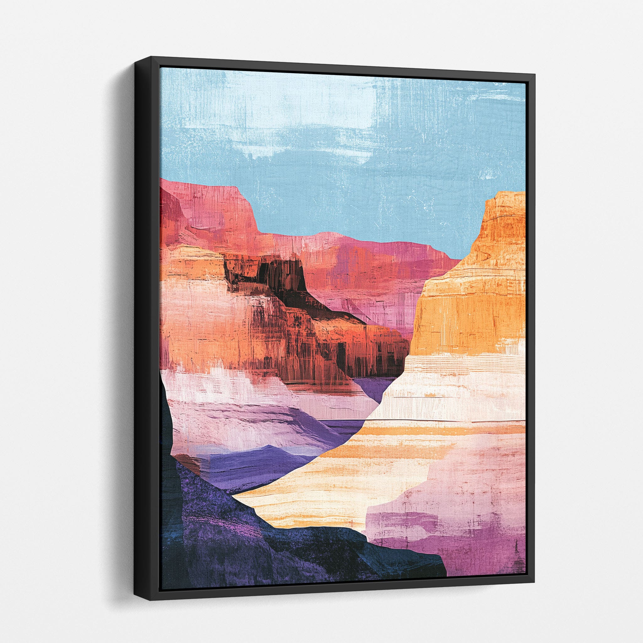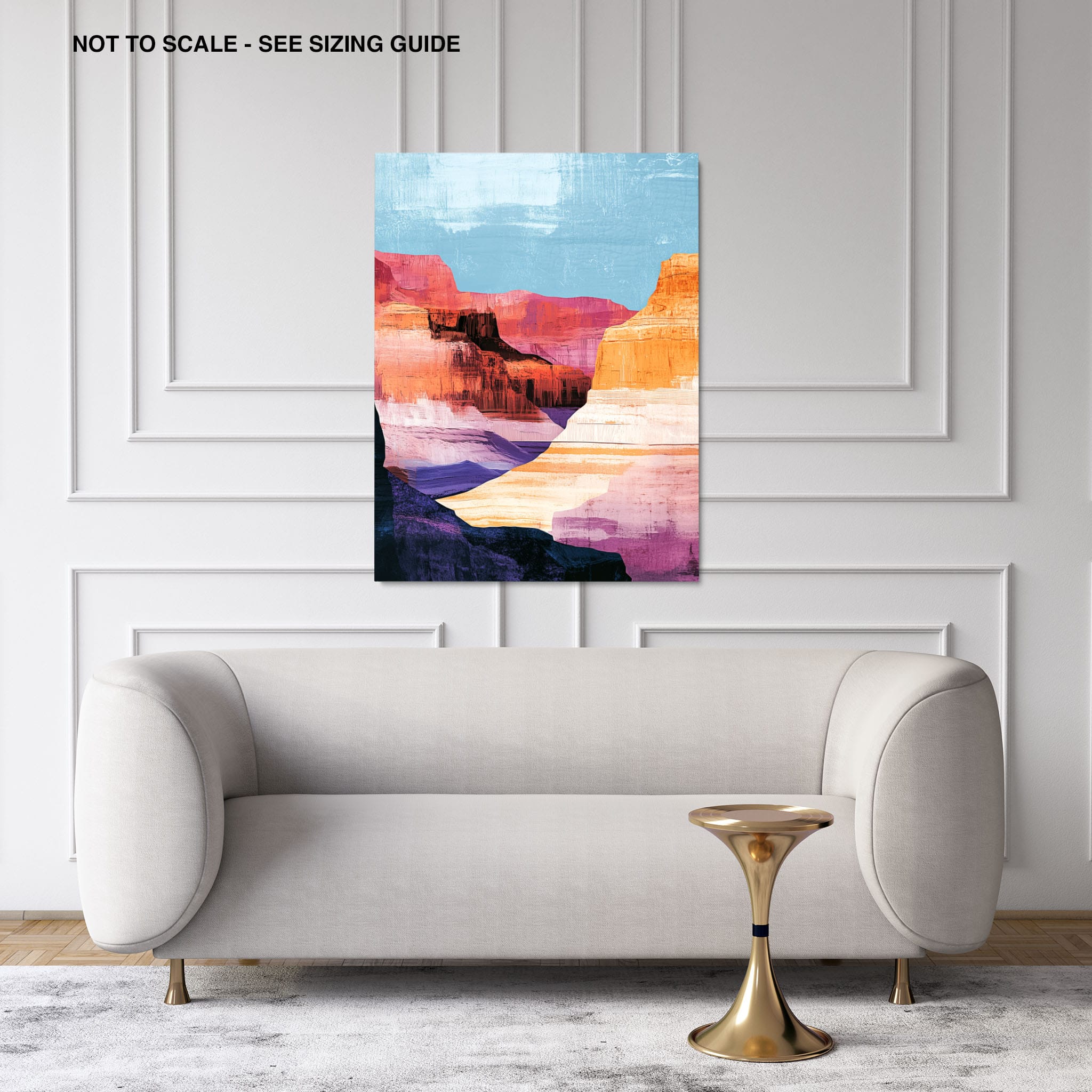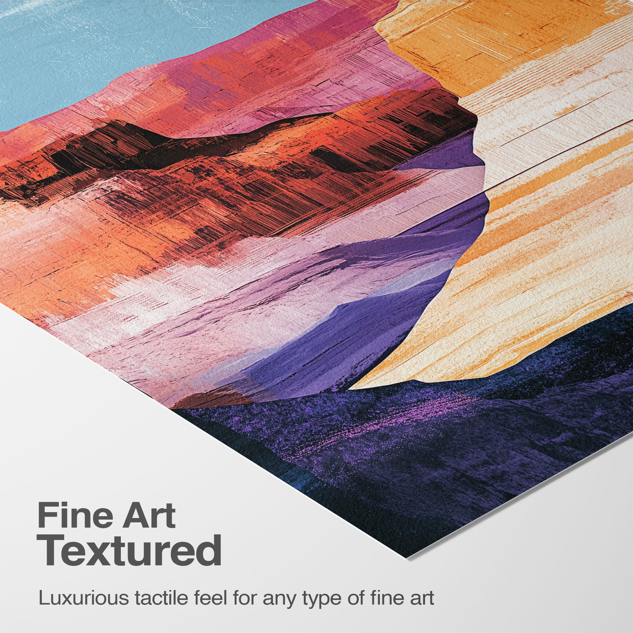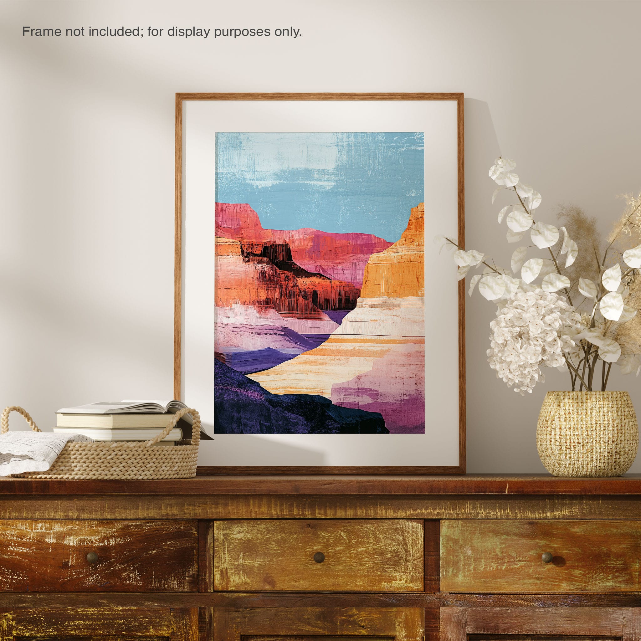 This digital illustration presents a striking landscape with sharp, geometric forms and vibrant layers of color, portraying an abstract interpretation of majestic cliffs and expansive skies. The artist uses a mix of calm and bold hues, ranging from serene blues to vivid oranges and purples, to craft a modern aesthetic that invites contemplation and admiration. Ideal for lovers of landscapes with a contemporary twist, this piece can transform any room by adding a touch of sophistication and color. Elevate your home decor with this unique artwork that seamlessly blends abstract art with geometric precision.