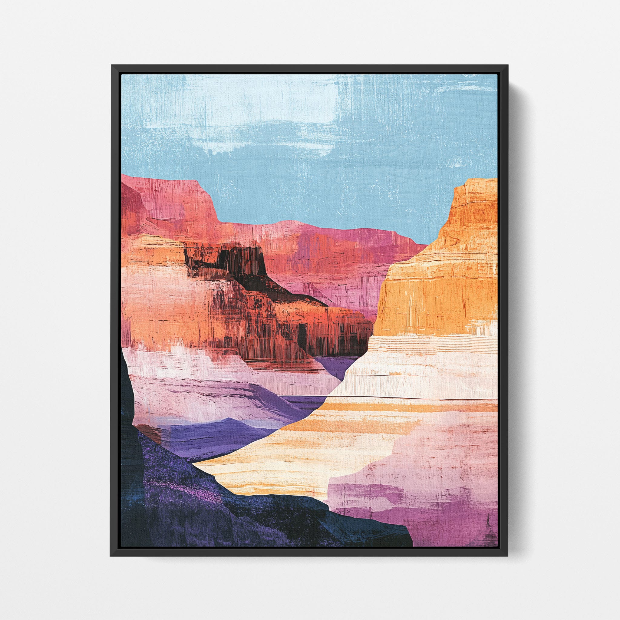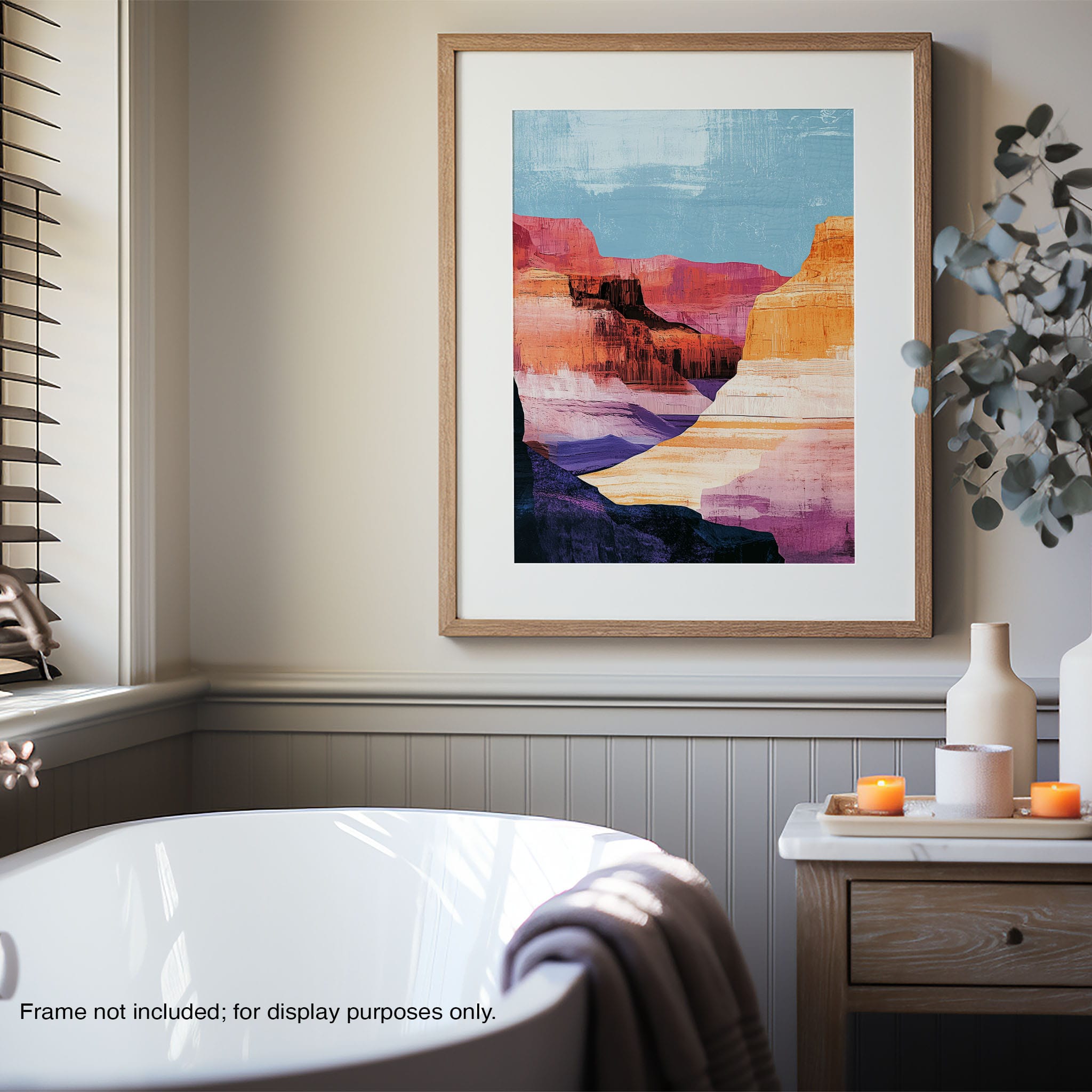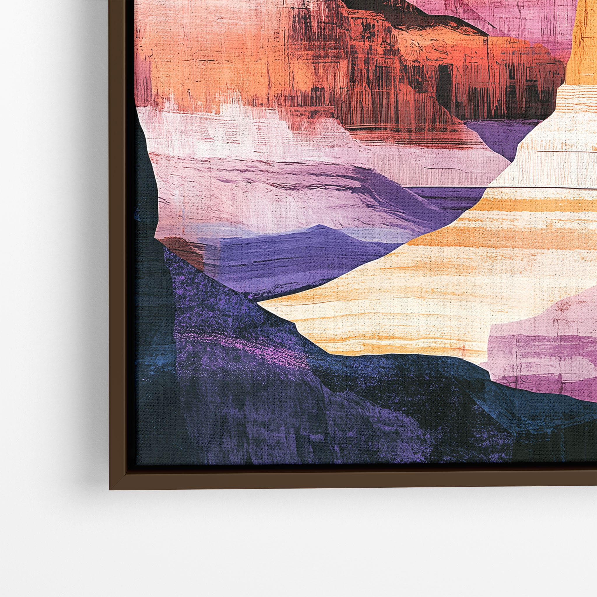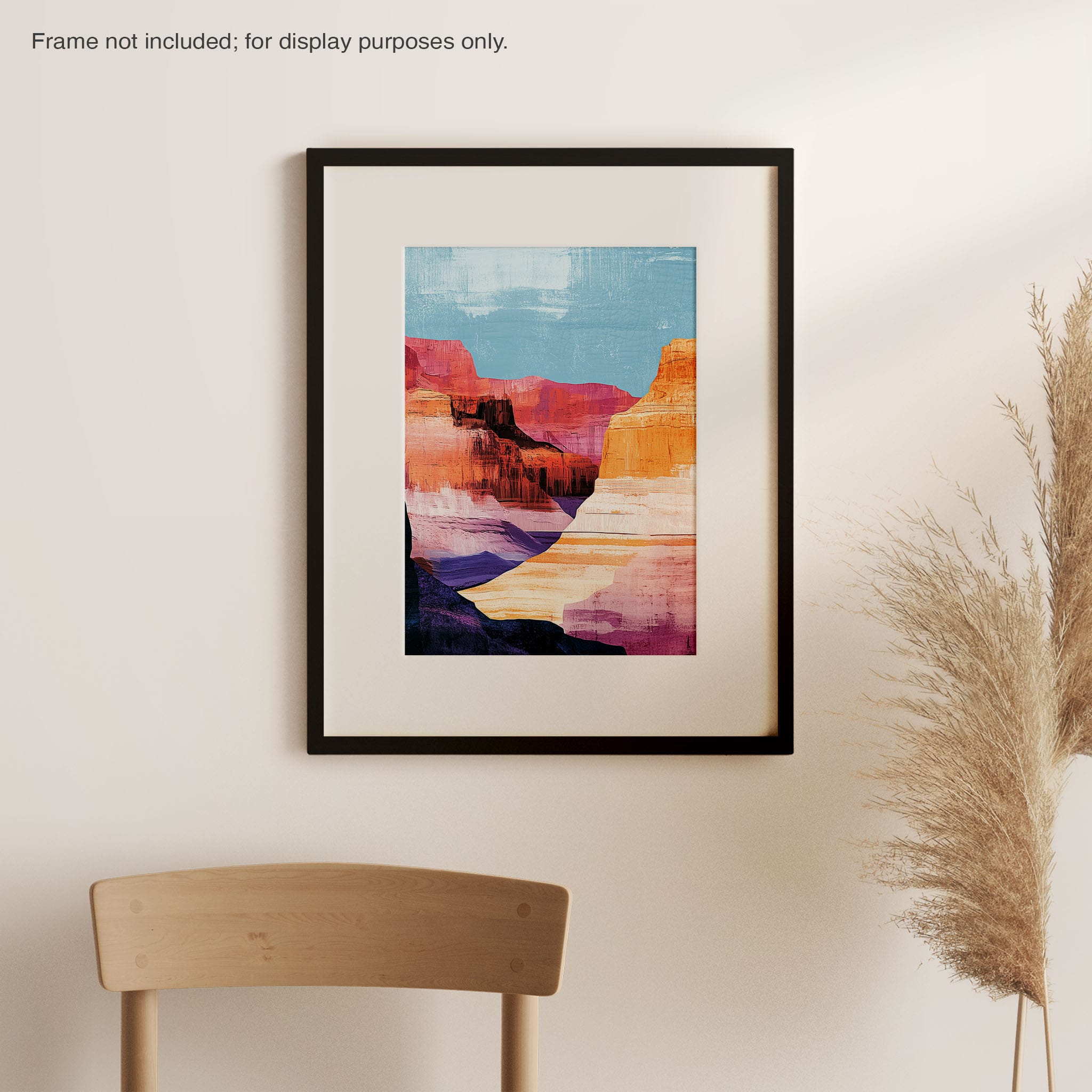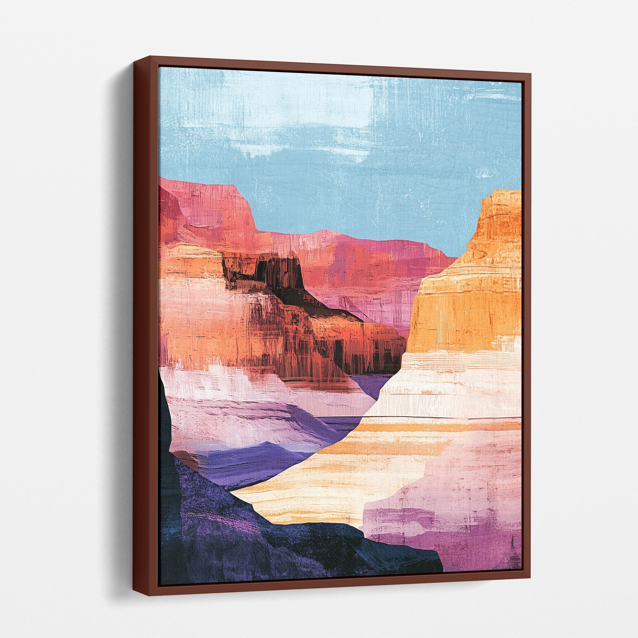 This digital illustration presents a striking landscape with sharp, geometric forms and vibrant layers of color, portraying an abstract interpretation of majestic cliffs and expansive skies. The artist uses a mix of calm and bold hues, ranging from serene blues to vivid oranges and purples, to craft a modern aesthetic that invites contemplation and admiration. Ideal for lovers of landscapes with a contemporary twist, this piece can transform any room by adding a touch of sophistication and color. Elevate your home decor with this unique artwork that seamlessly blends abstract art with geometric precision.