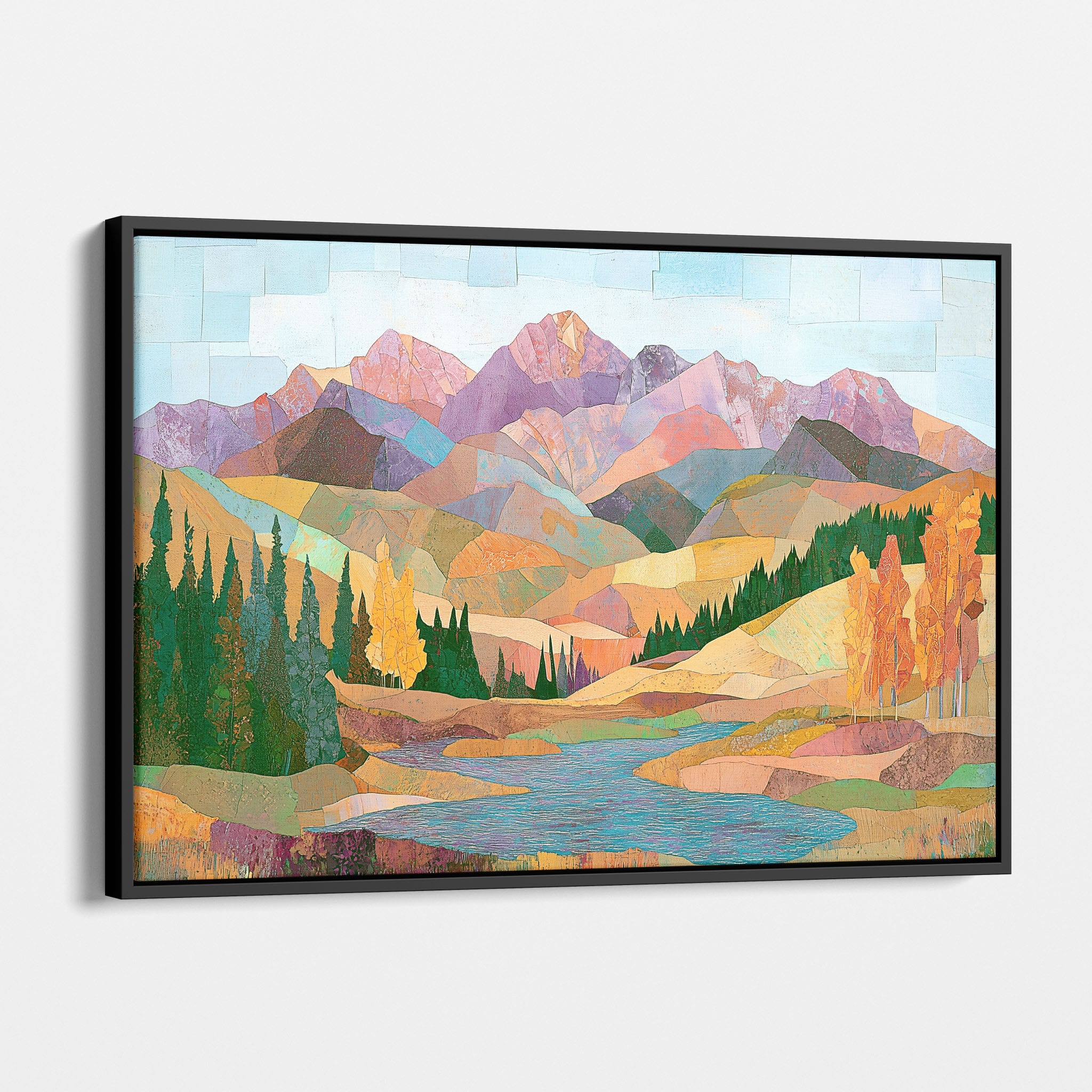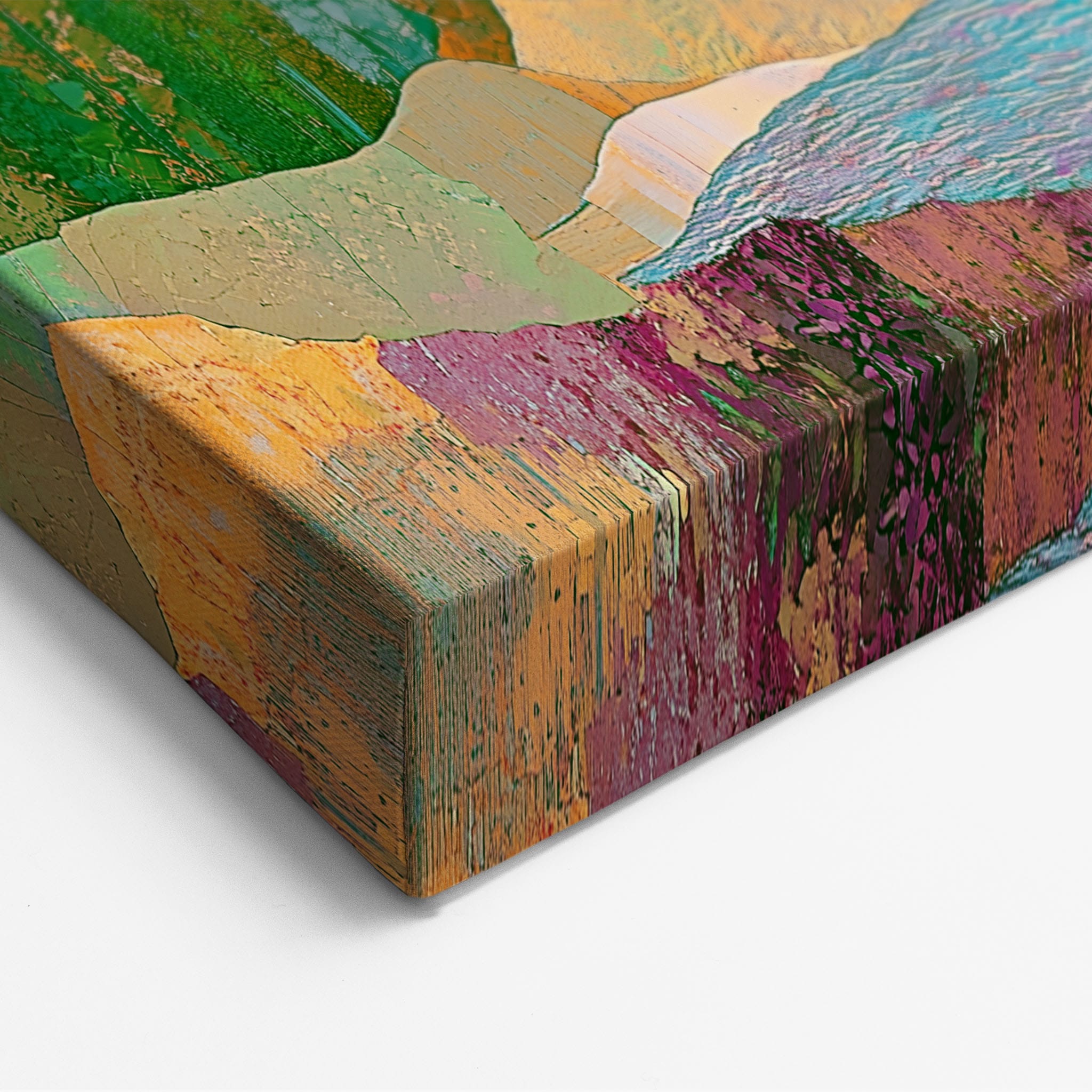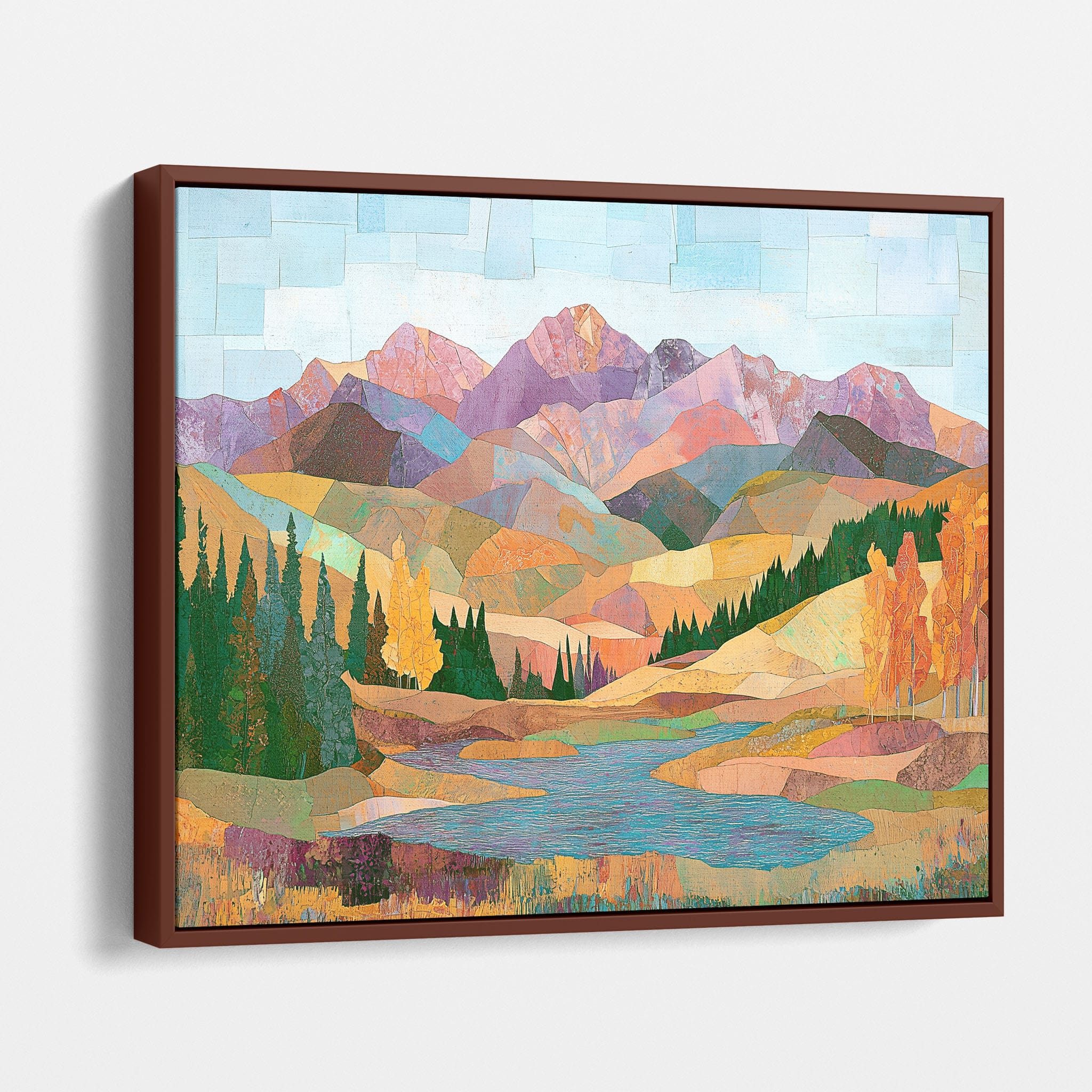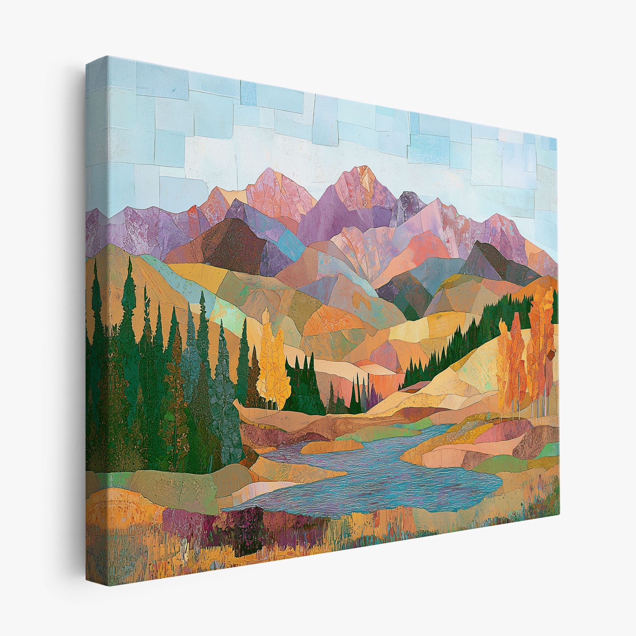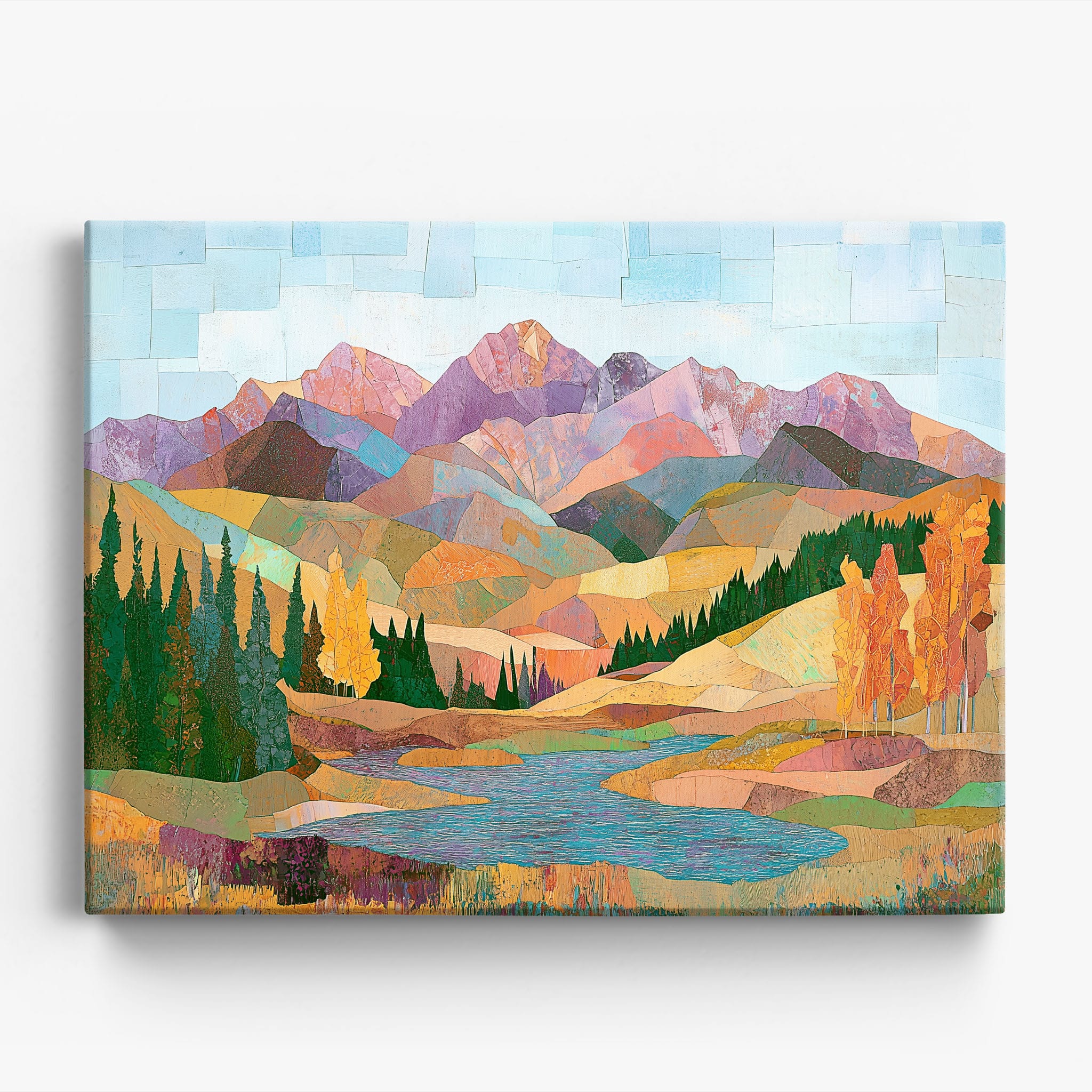 This vibrant painting uses geometric shapes to create a surreal landscape that merges dream-like mountains with vividly colored forests. The methodic arrangement of colors and shapes invites viewers into a serene yet dynamic environment. The painting cleverly balances warm and cool tones, making it a visually stunning piece for any modern art enthusiast. Ideal for adding a touch of color and uniqueness to any space, this artwork is not just a decor but a conversation starter for those who appreciate contemporary interpretations of natural scenery.
