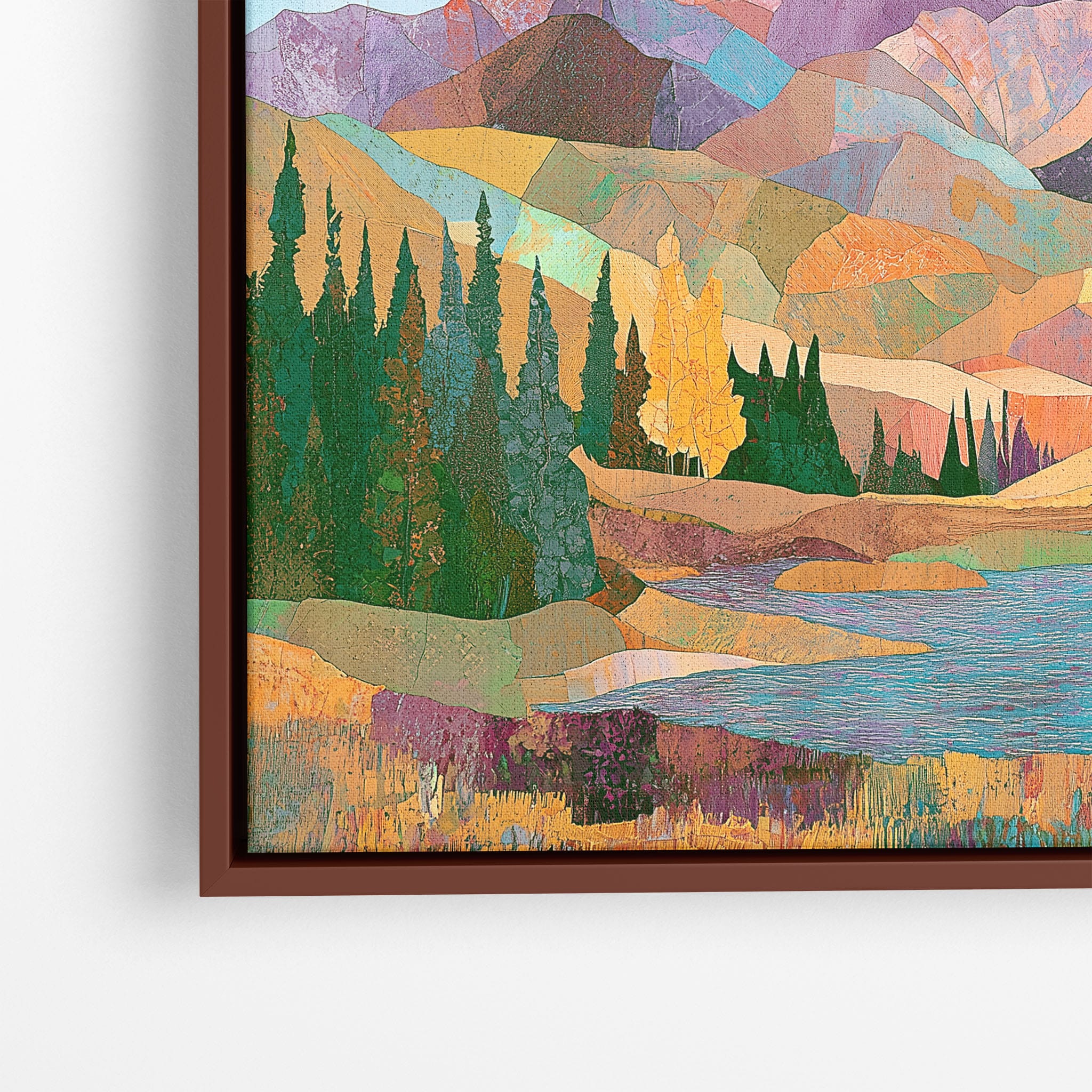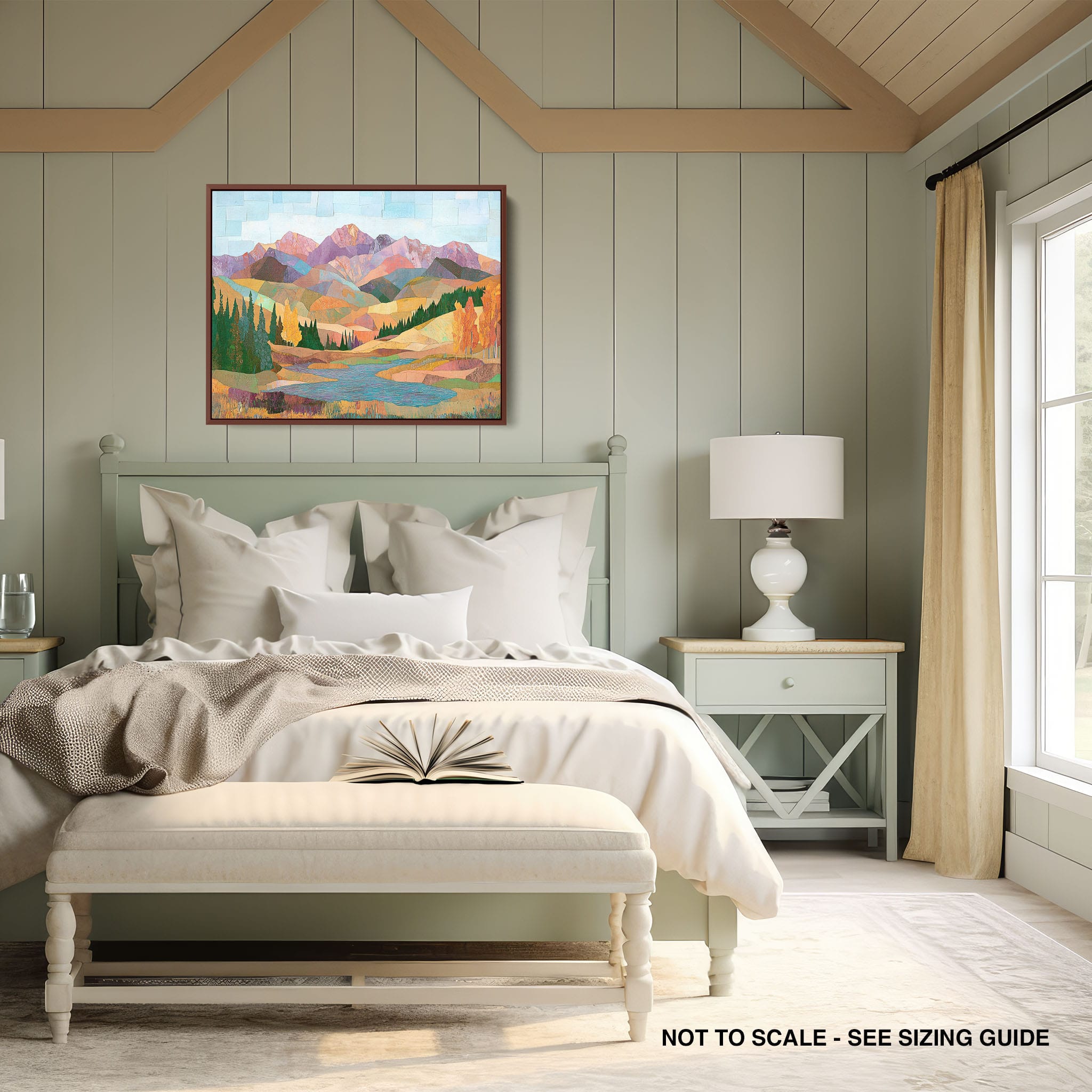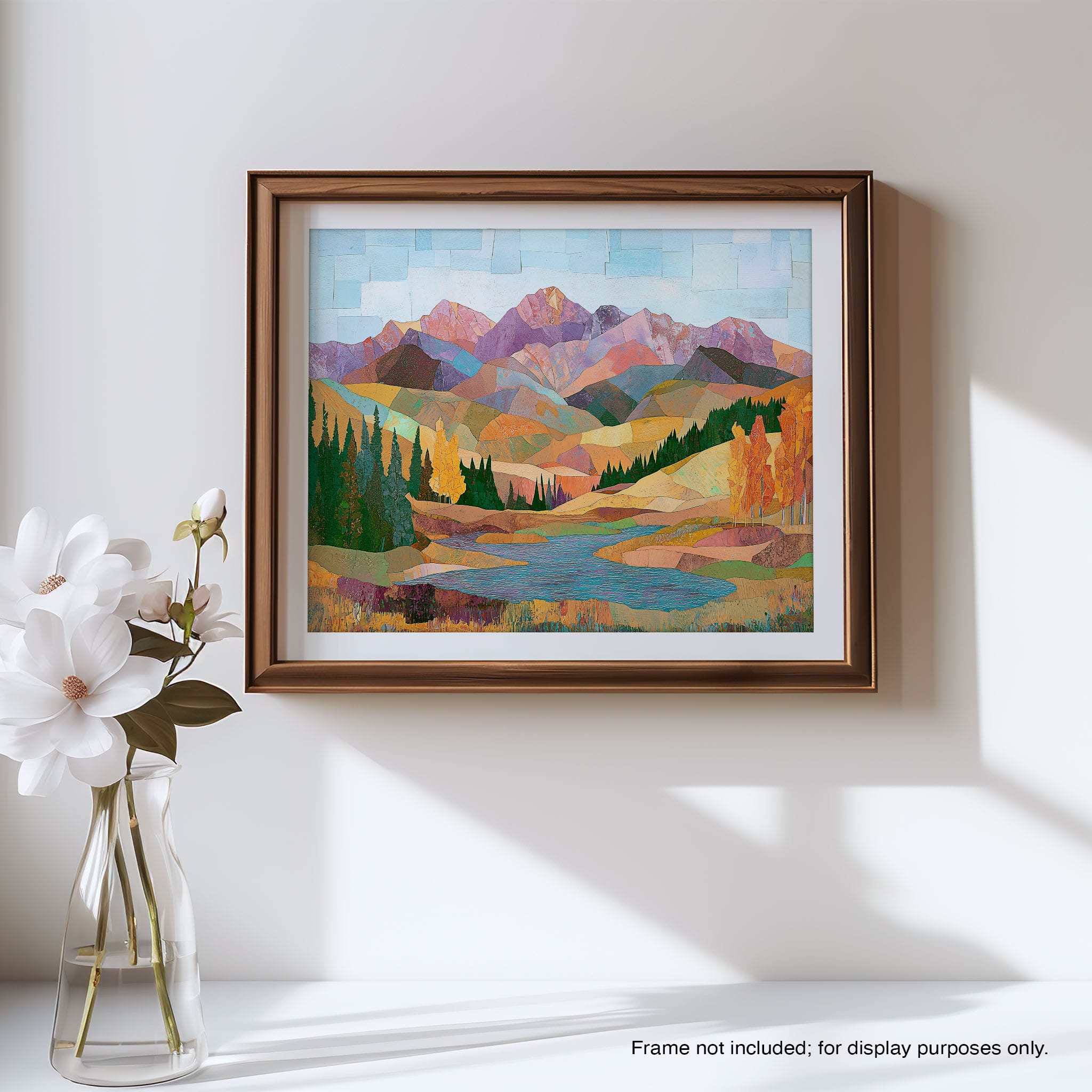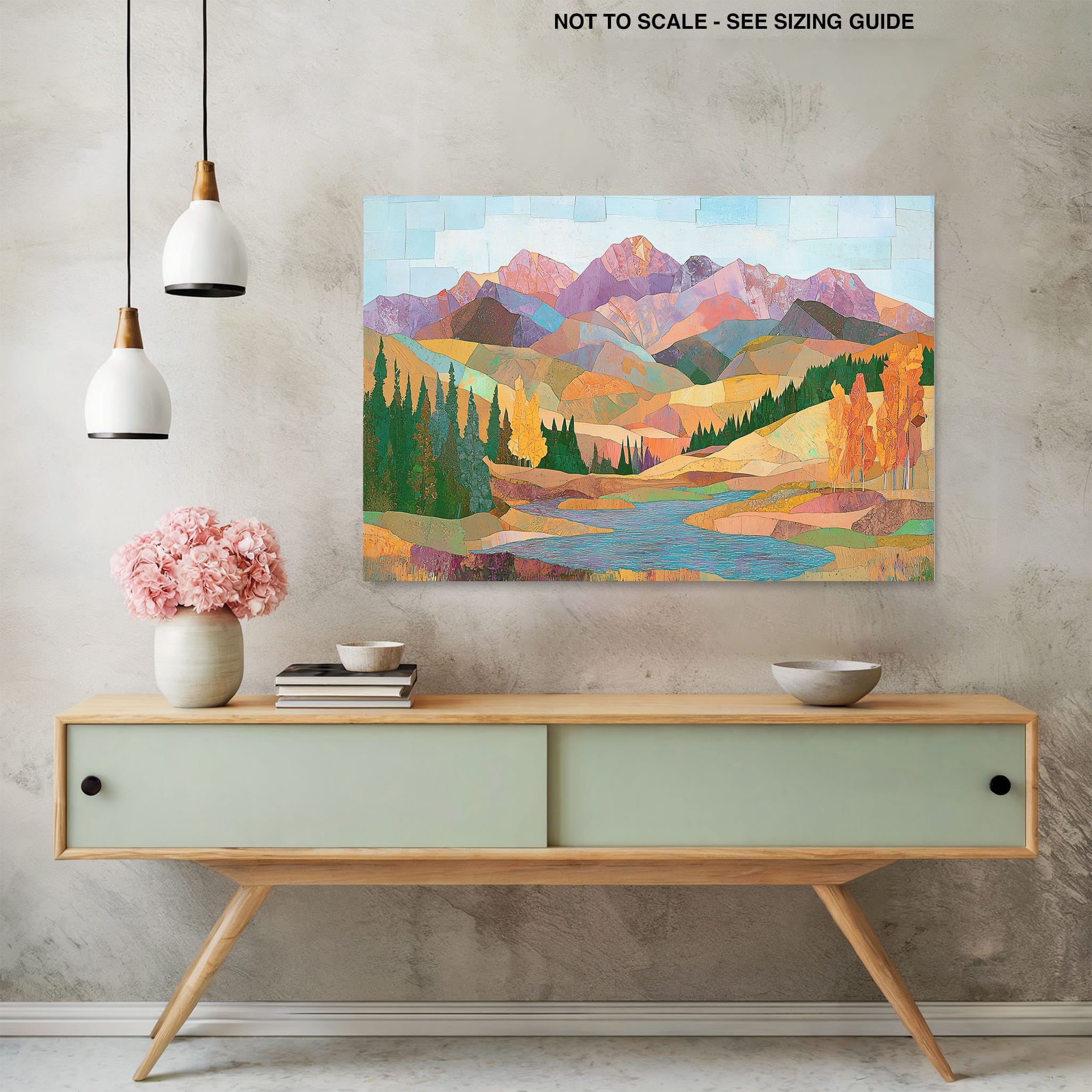 This vibrant painting uses geometric shapes to create a surreal landscape that merges dream-like mountains with vividly colored forests. The methodic arrangement of colors and shapes invites viewers into a serene yet dynamic environment. The painting cleverly balances warm and cool tones, making it a visually stunning piece for any modern art enthusiast. Ideal for adding a touch of color and uniqueness to any space, this artwork is not just a decor but a conversation starter for those who appreciate contemporary interpretations of natural scenery.
