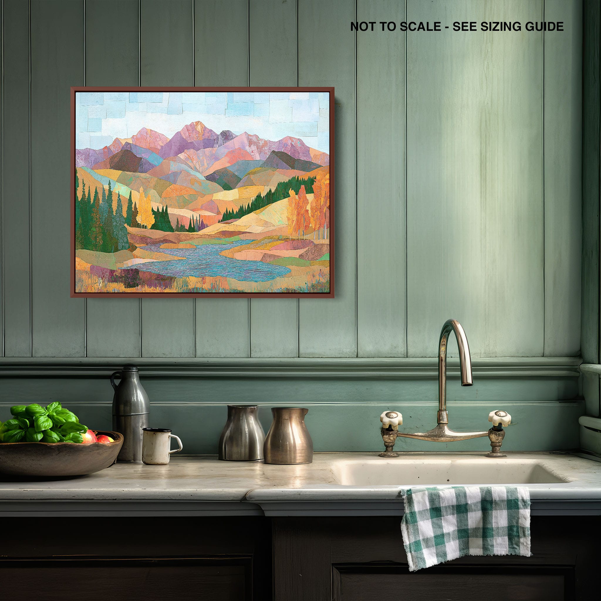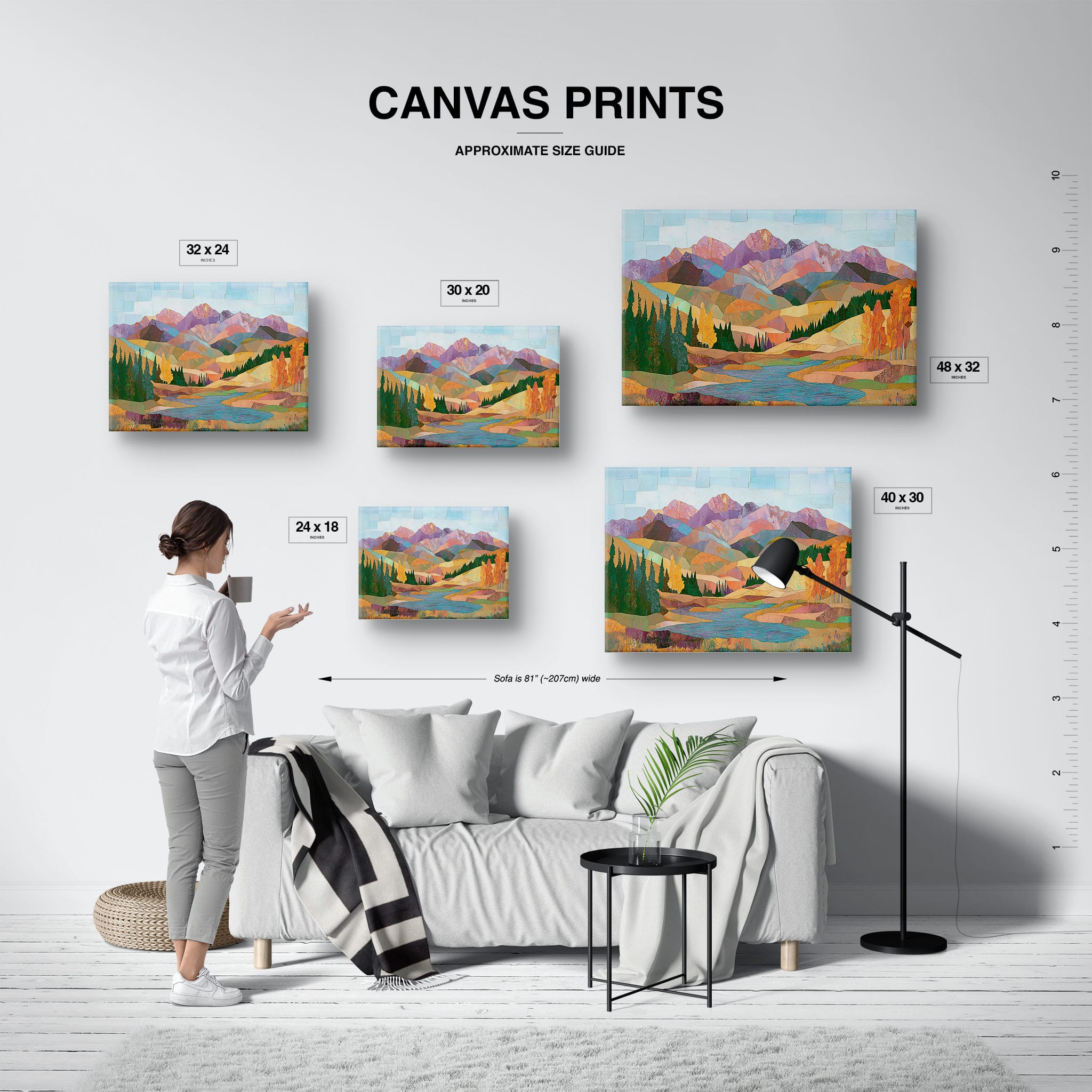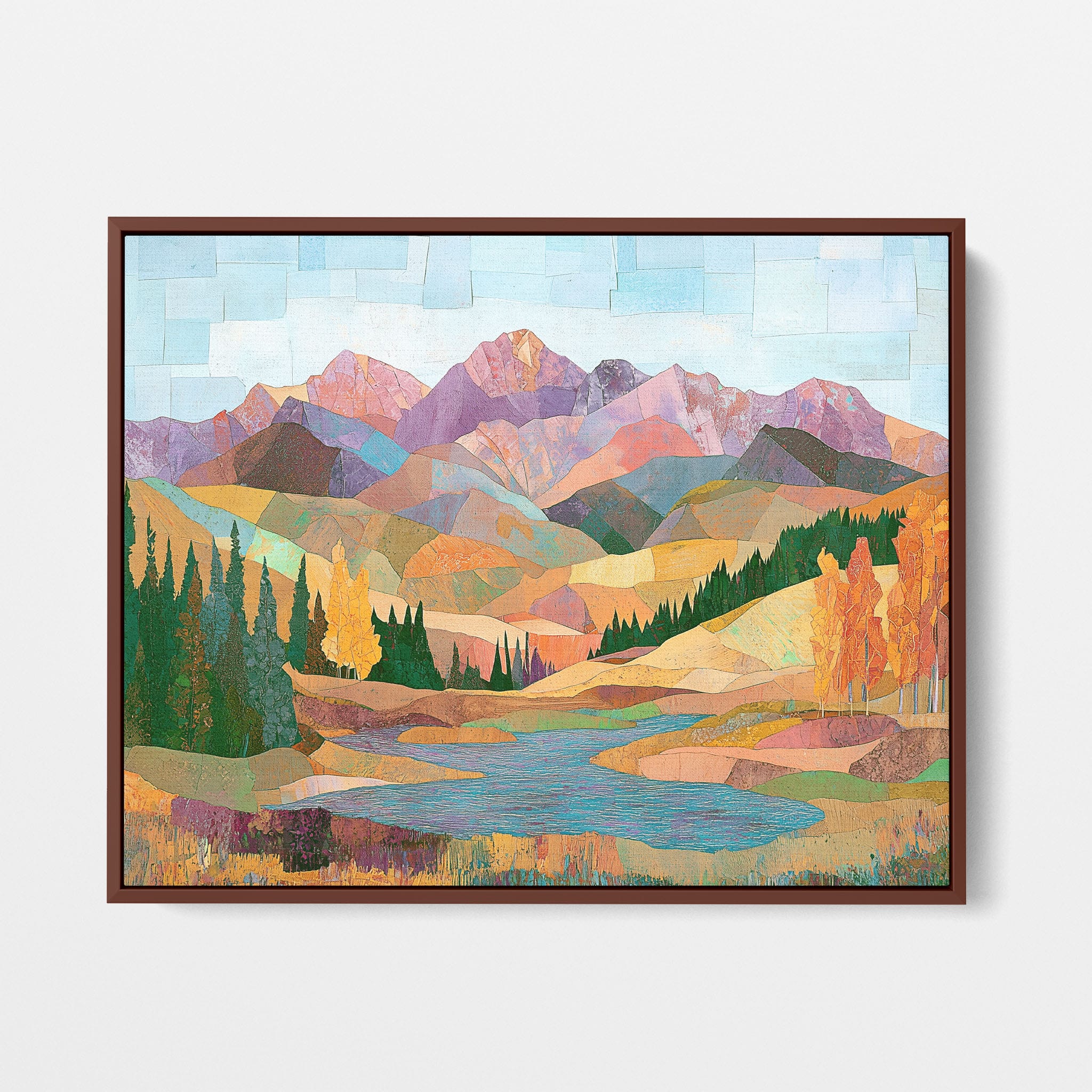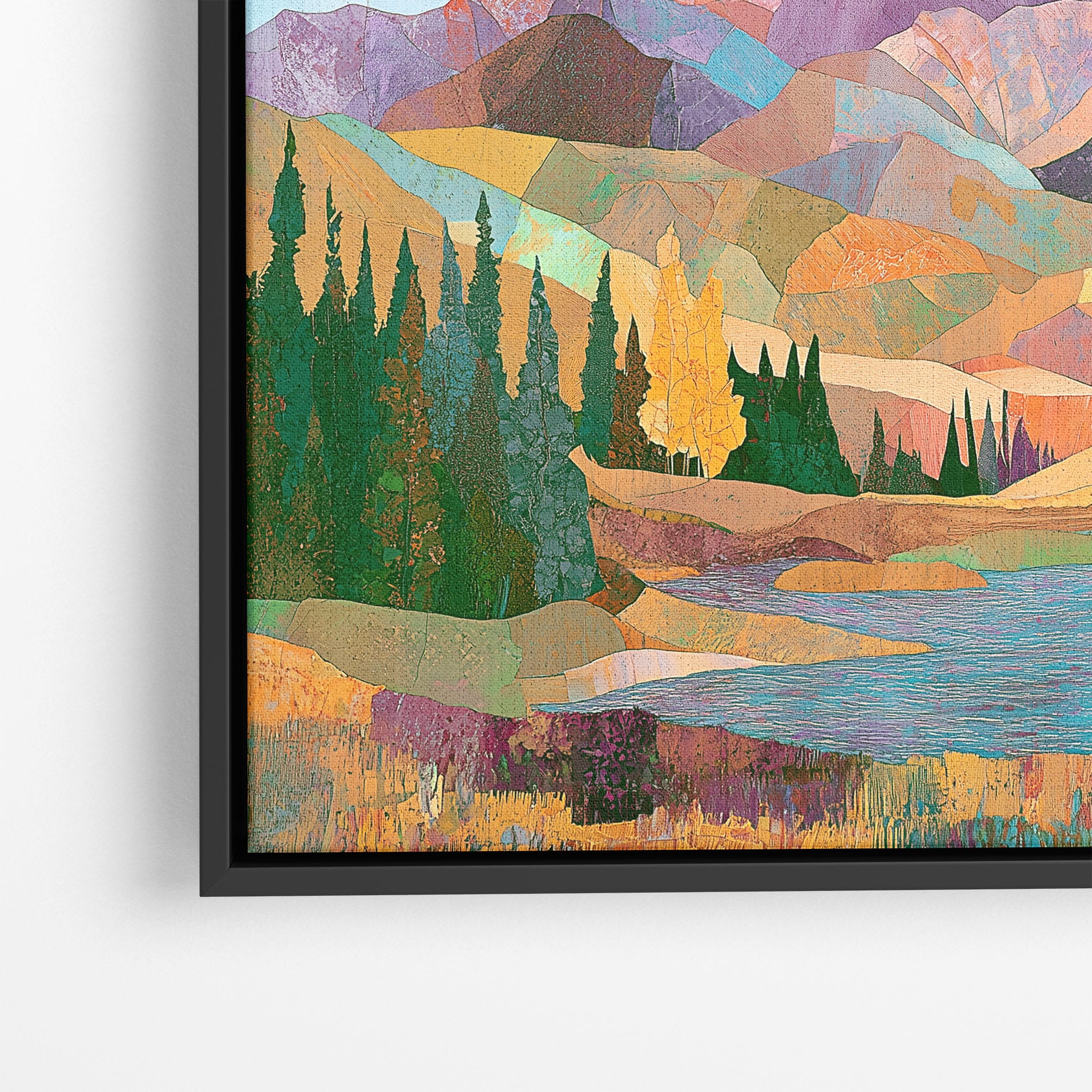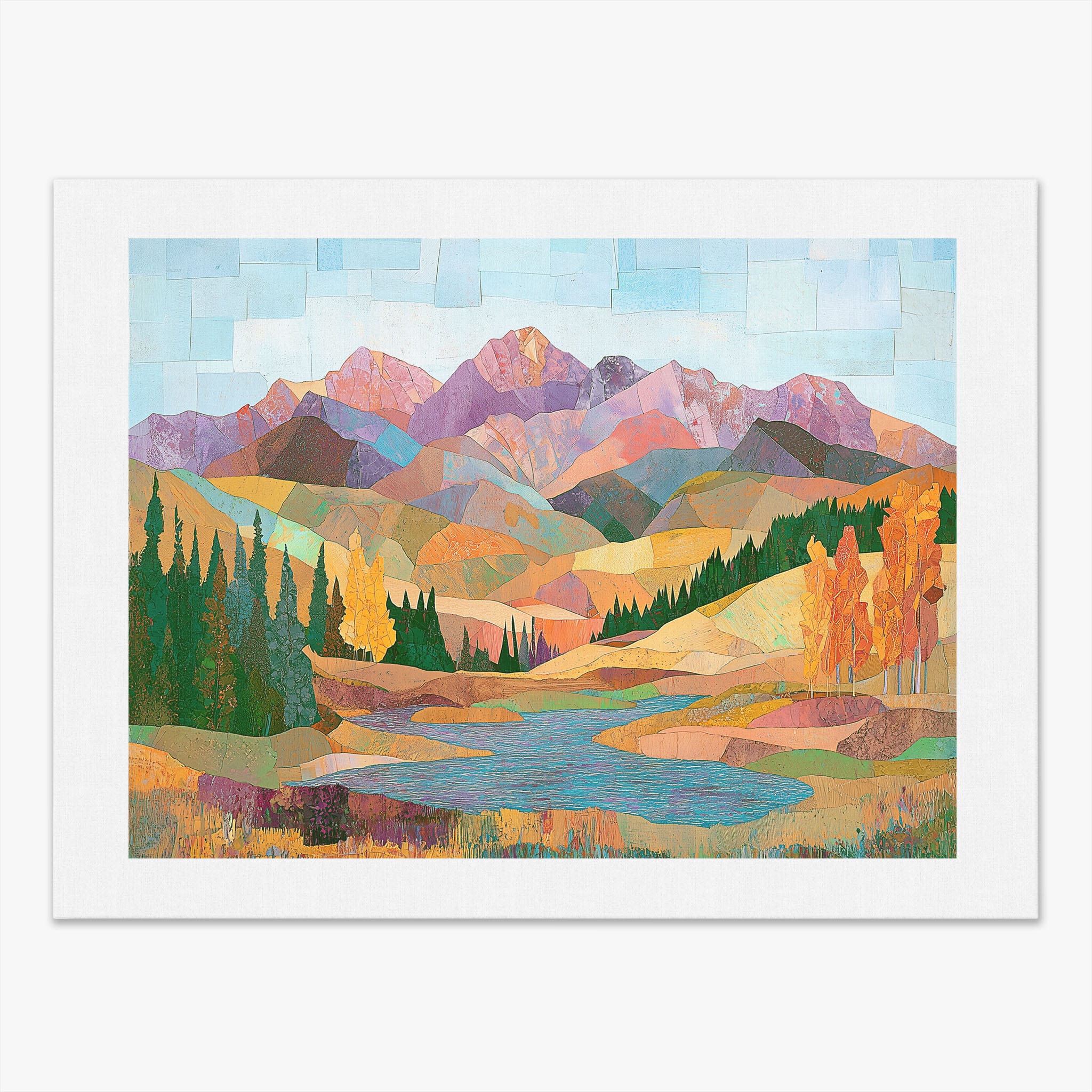 This vibrant painting uses geometric shapes to create a surreal landscape that merges dream-like mountains with vividly colored forests. The methodic arrangement of colors and shapes invites viewers into a serene yet dynamic environment. The painting cleverly balances warm and cool tones, making it a visually stunning piece for any modern art enthusiast. Ideal for adding a touch of color and uniqueness to any space, this artwork is not just a decor but a conversation starter for those who appreciate contemporary interpretations of natural scenery.