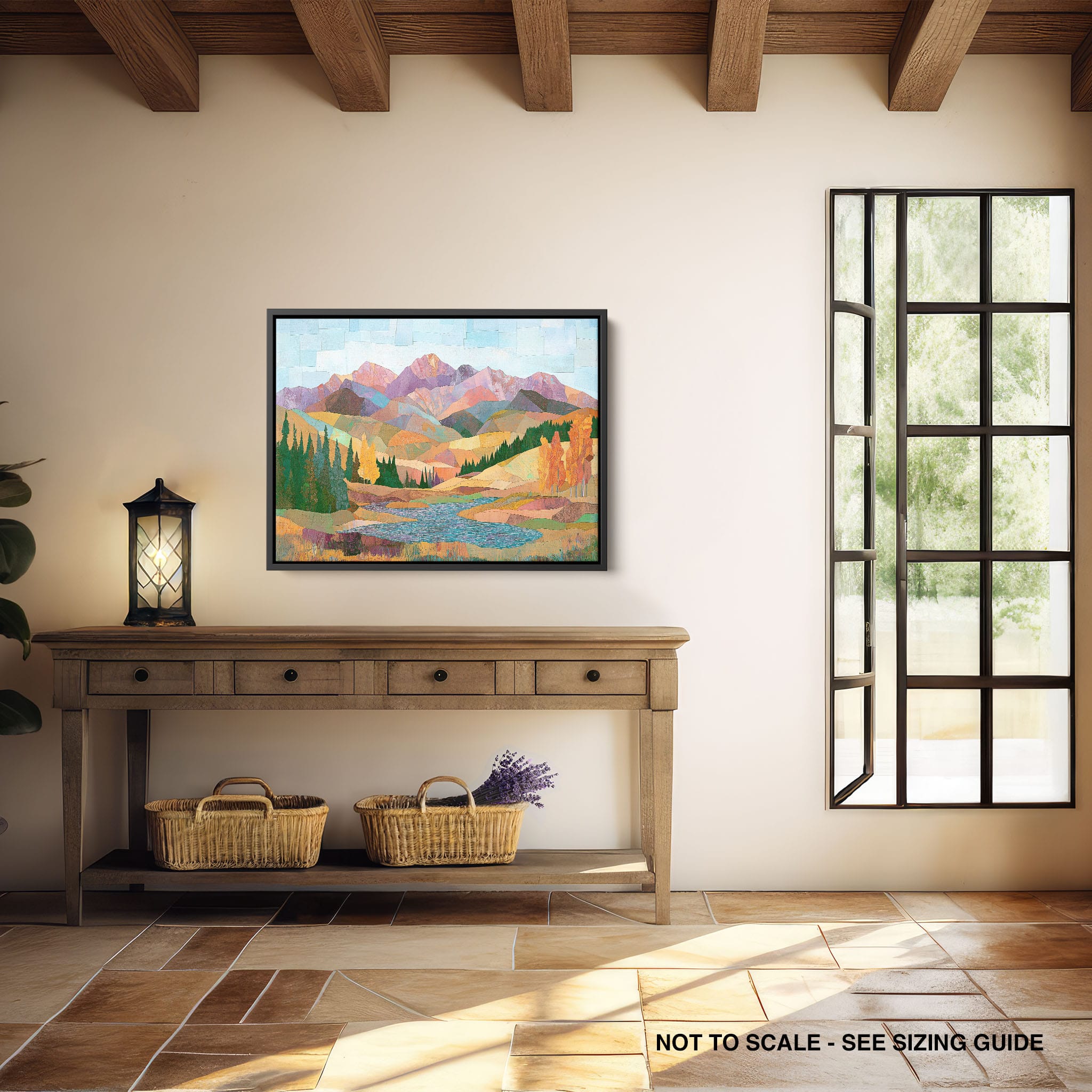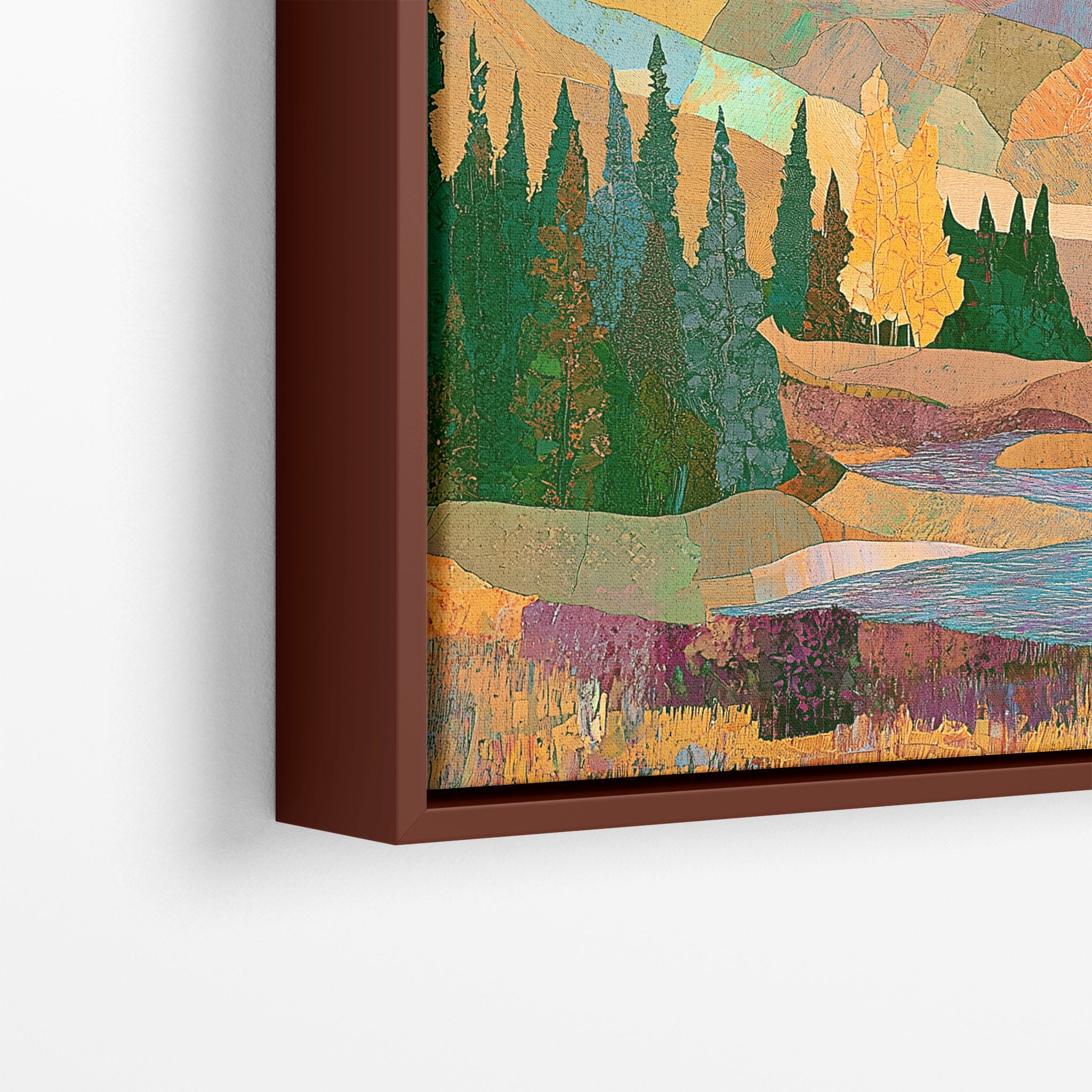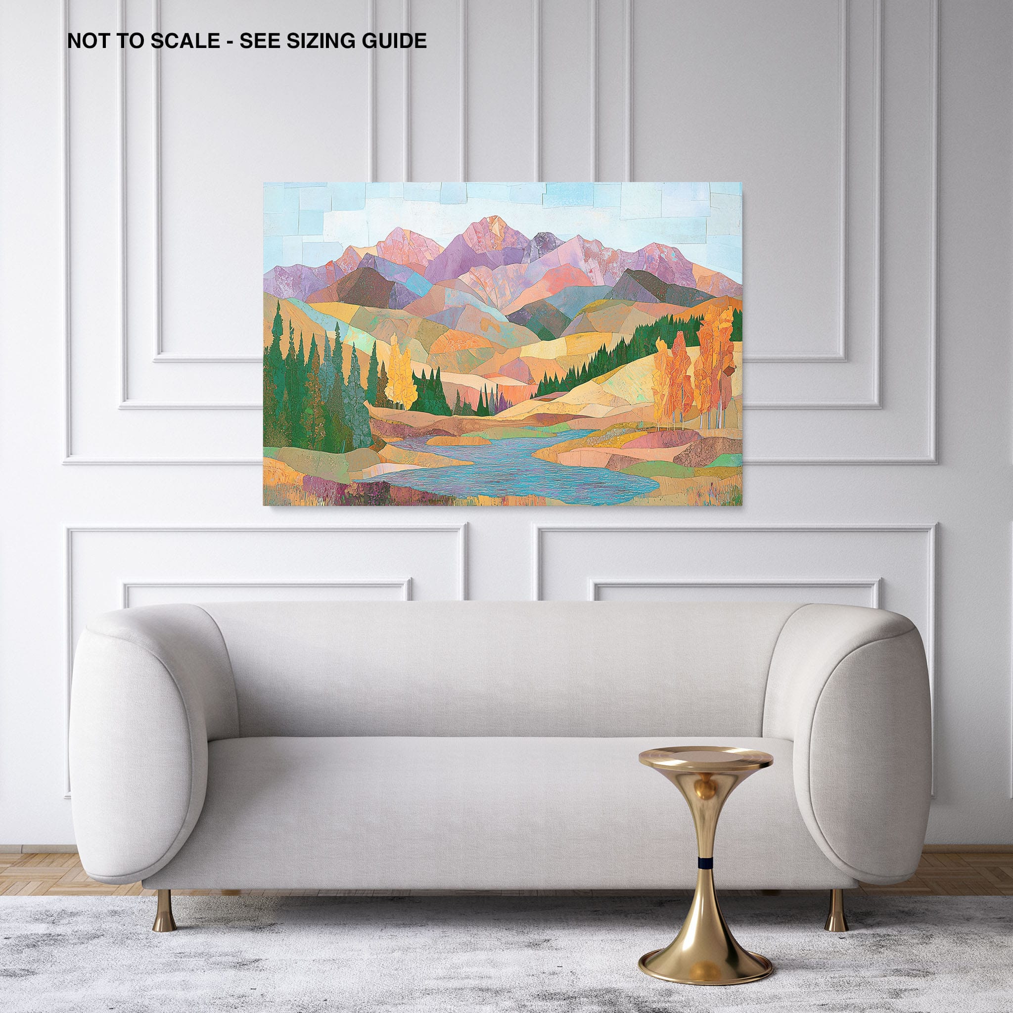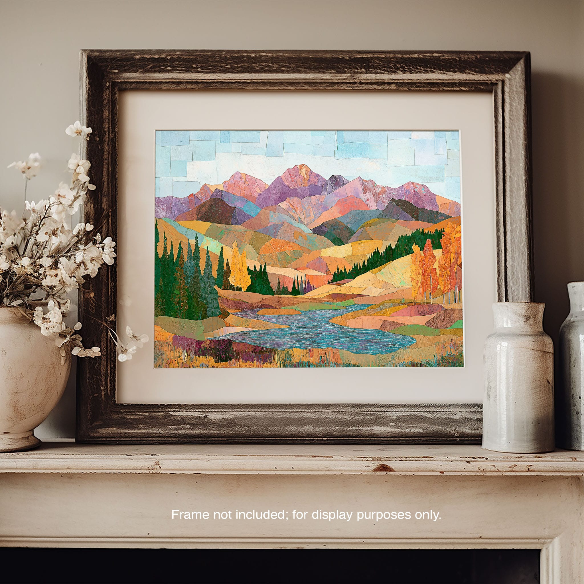 This vibrant painting uses geometric shapes to create a surreal landscape that merges dream-like mountains with vividly colored forests. The methodic arrangement of colors and shapes invites viewers into a serene yet dynamic environment. The painting cleverly balances warm and cool tones, making it a visually stunning piece for any modern art enthusiast. Ideal for adding a touch of color and uniqueness to any space, this artwork is not just a decor but a conversation starter for those who appreciate contemporary interpretations of natural scenery.