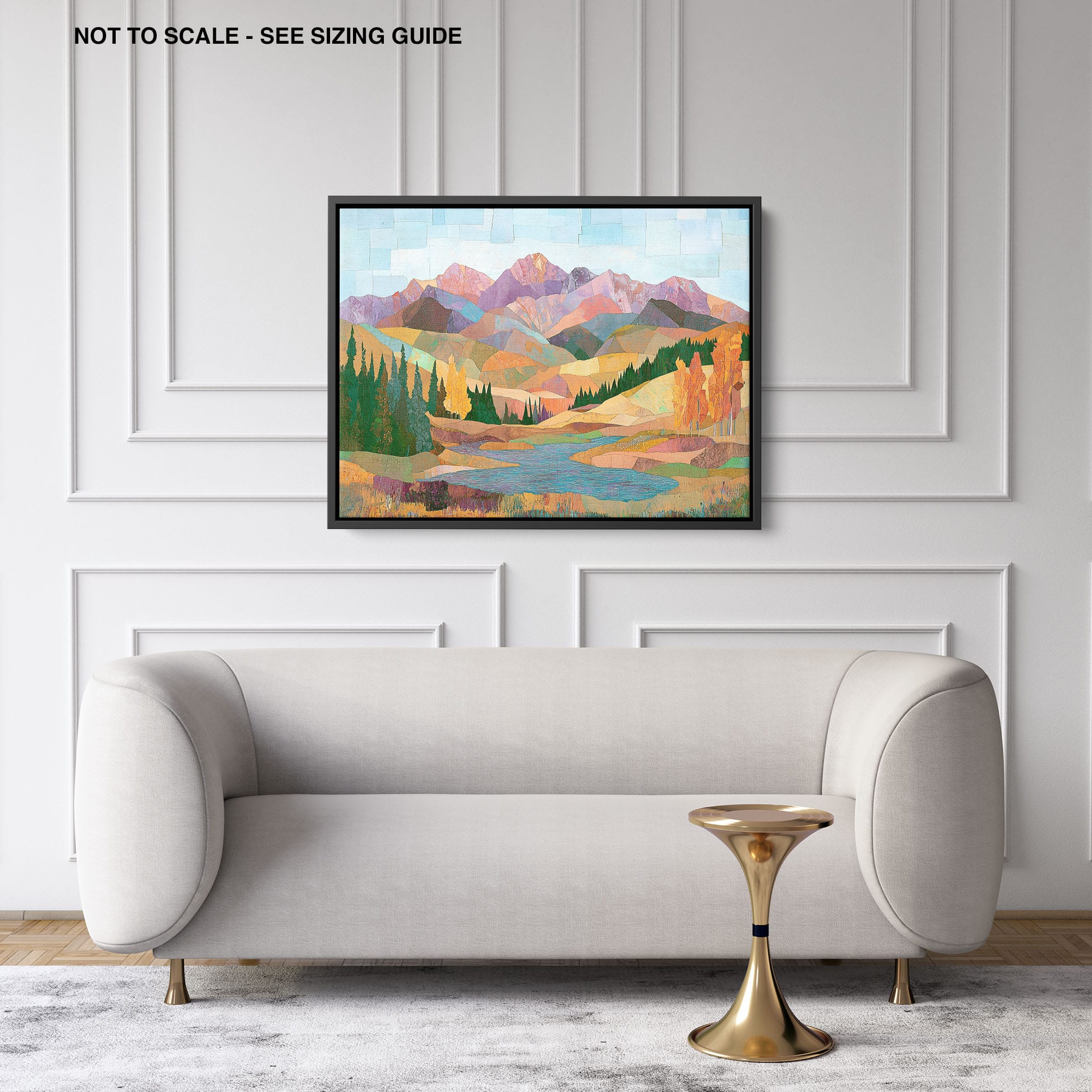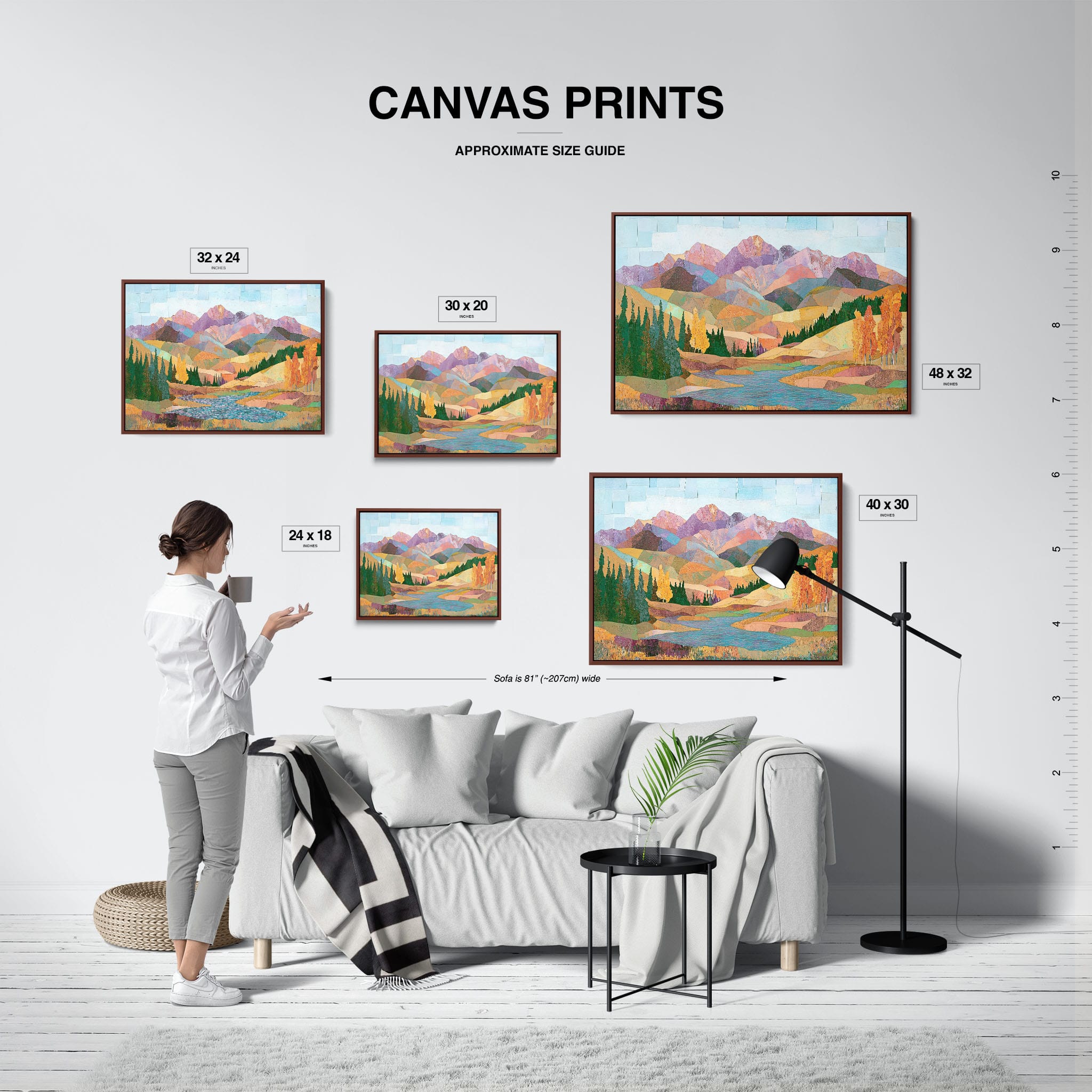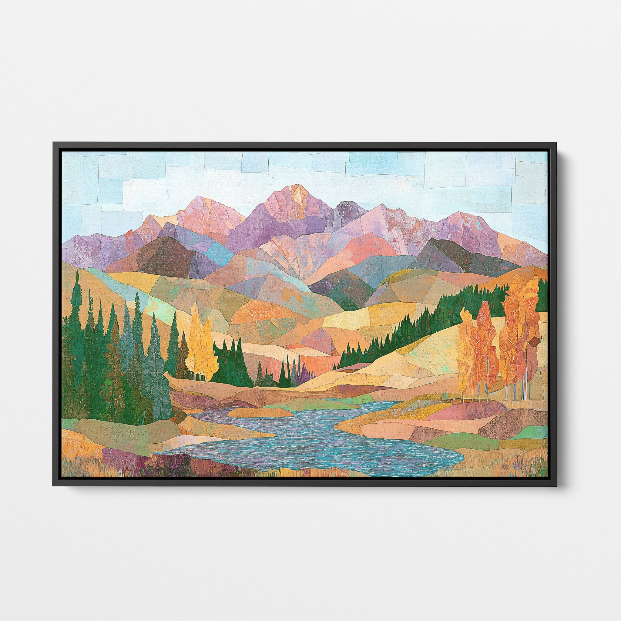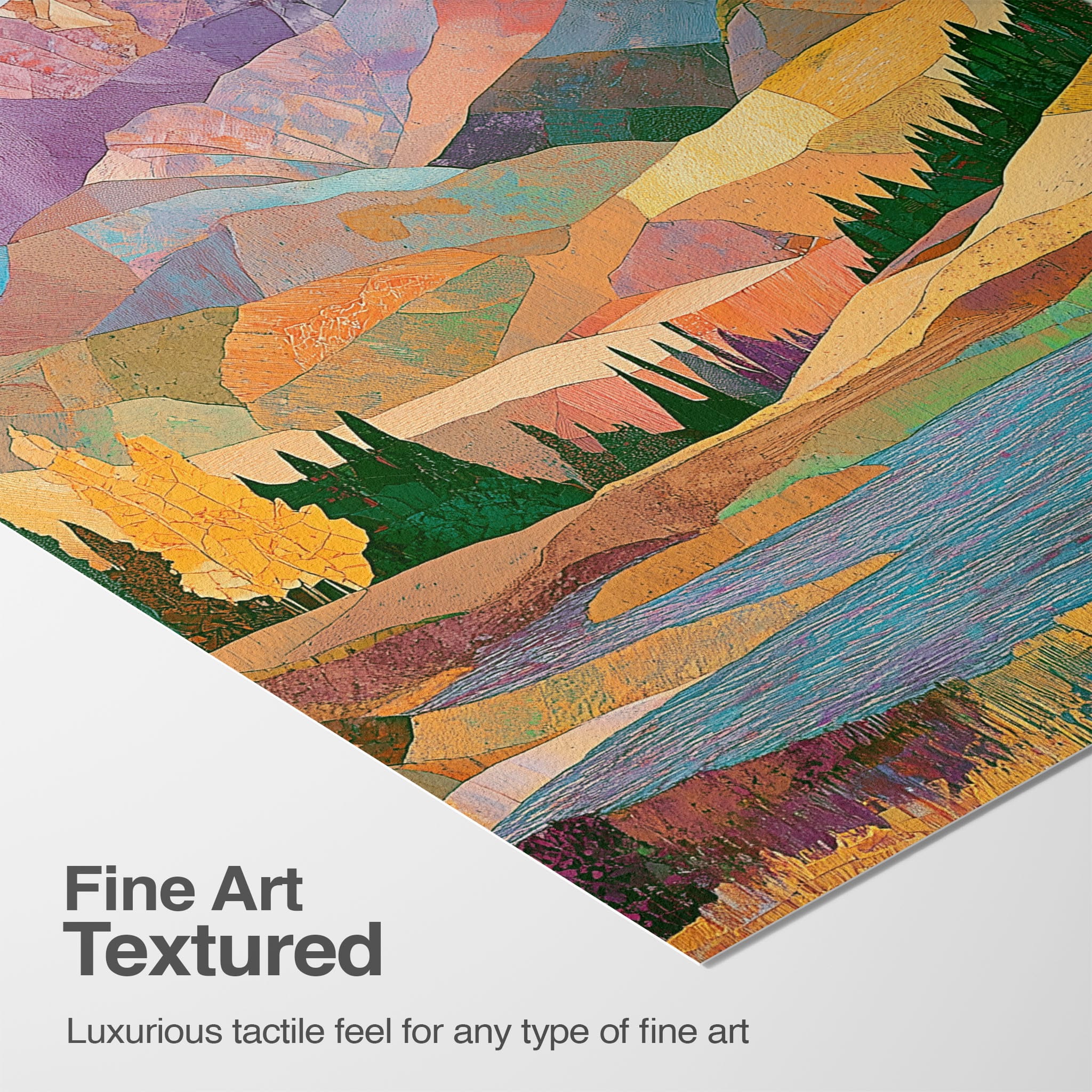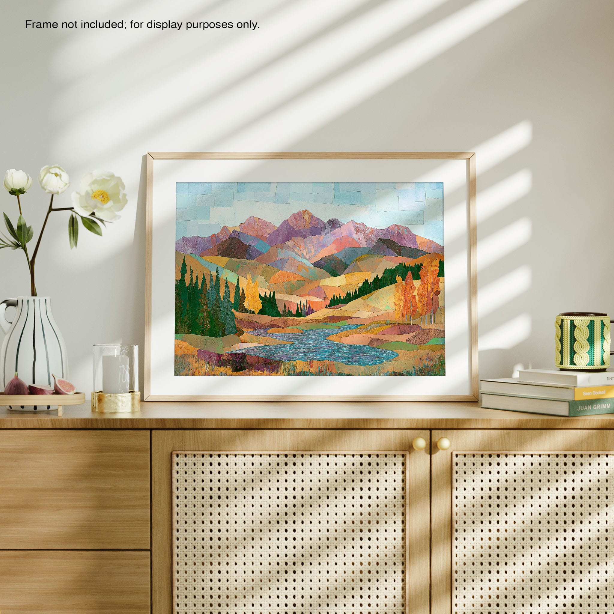This vibrant painting uses geometric shapes to create a surreal landscape that merges dream-like mountains with vividly colored forests. The methodic arrangement of colors and shapes invites viewers into a serene yet dynamic environment. The painting cleverly balances warm and cool tones, making it a visually stunning piece for any modern art enthusiast. Ideal for adding a touch of color and uniqueness to any space, this artwork is not just a decor but a conversation starter for those who appreciate contemporary interpretations of natural scenery.