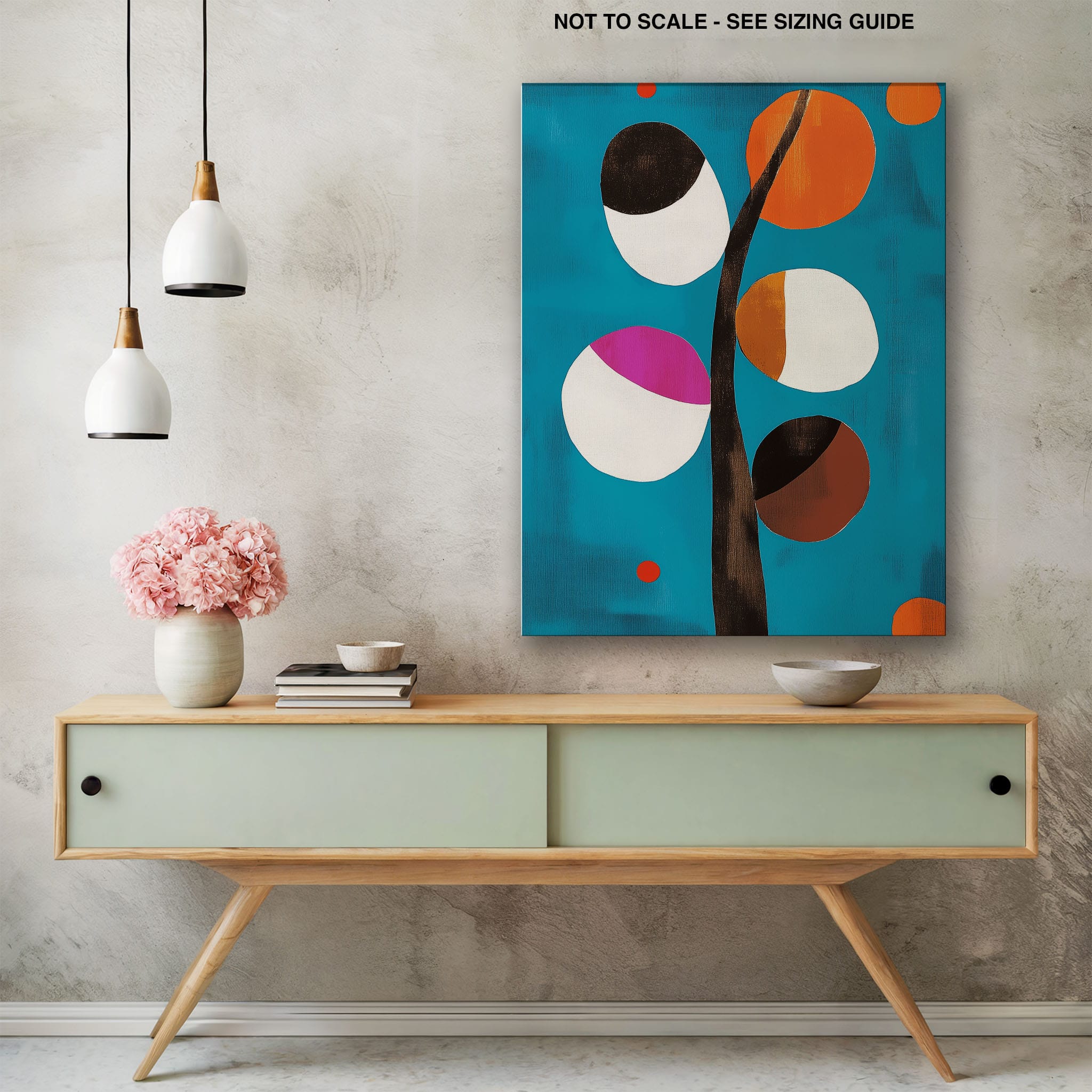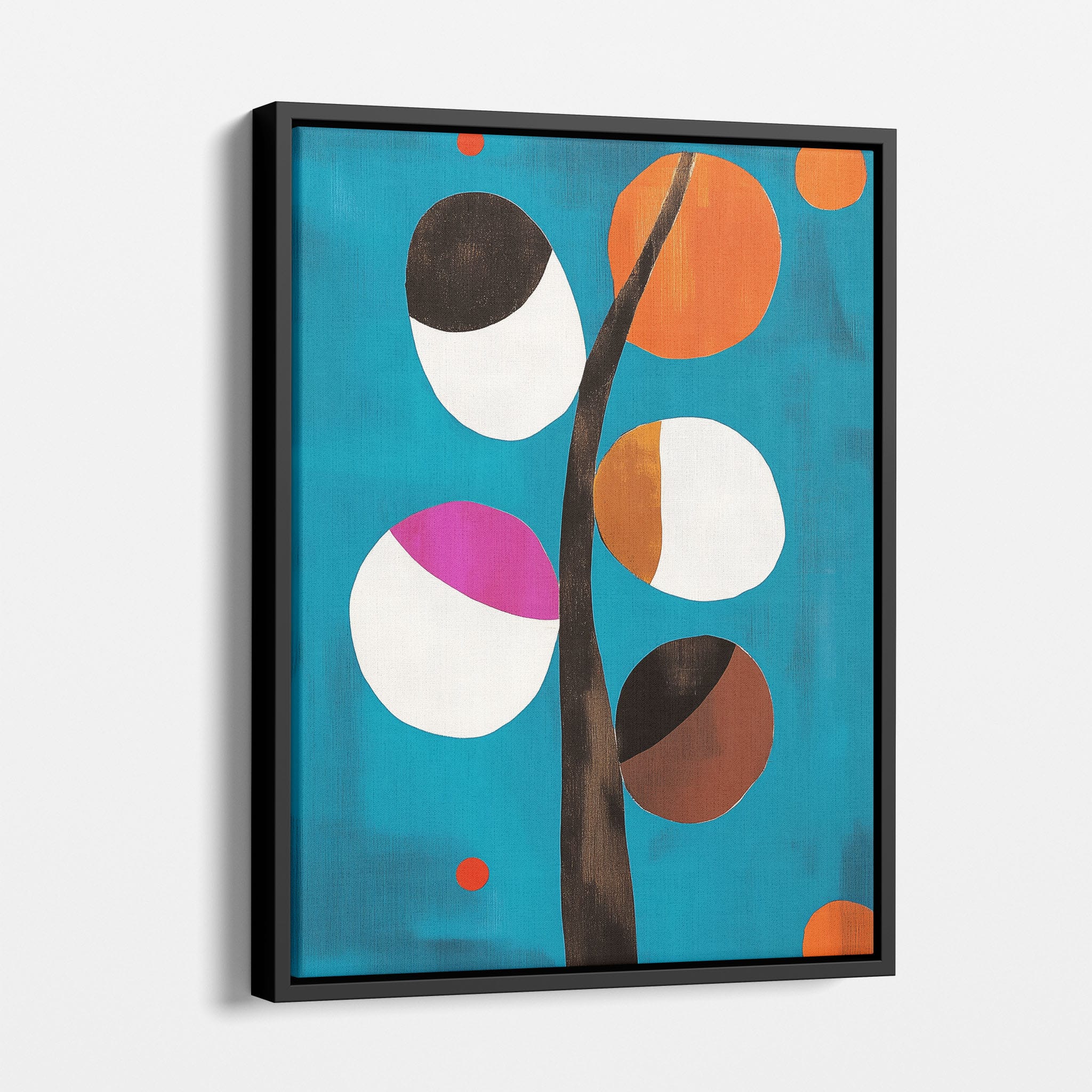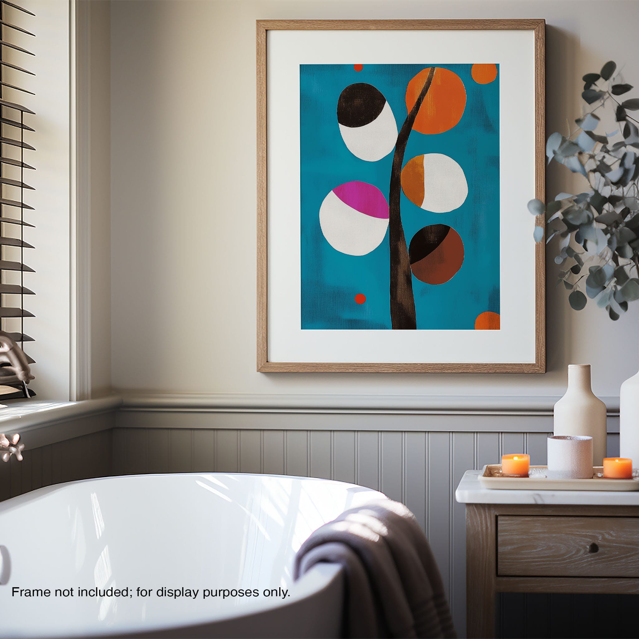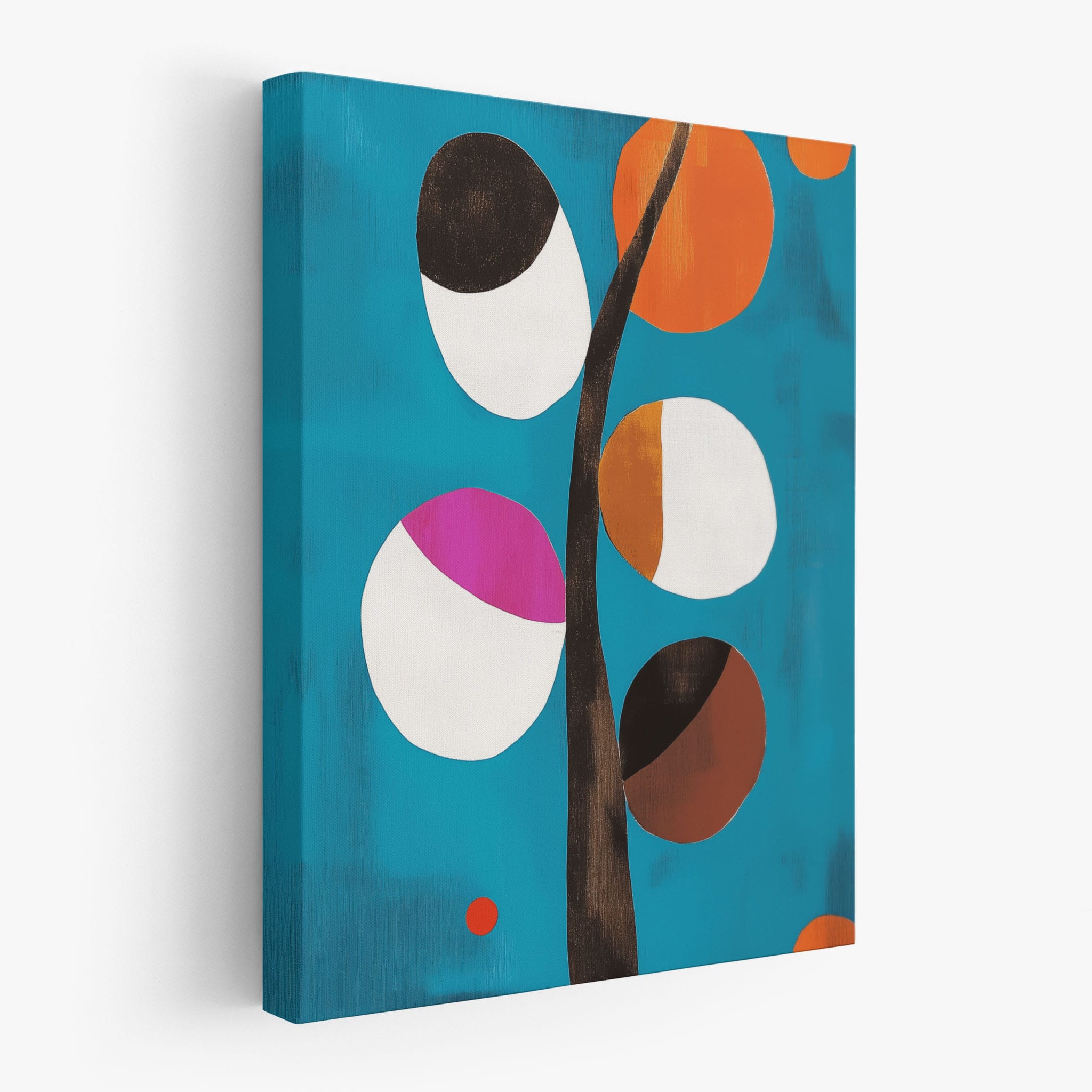 This painting melds geometric precision with a vibrant, modern aesthetic. Bold circles in shades of orange, white, and pink float playfully against a soothing aqua background, separated by a stark black vertical line that adds a striking visual contrast. The simplicity of shapes combined with the engaging color palette offers a visually arresting piece that suits any contemporary space. Add this striking painting to your collection to introduce a touch of modern chic and geometric allure, perfect for revitalizing any room.