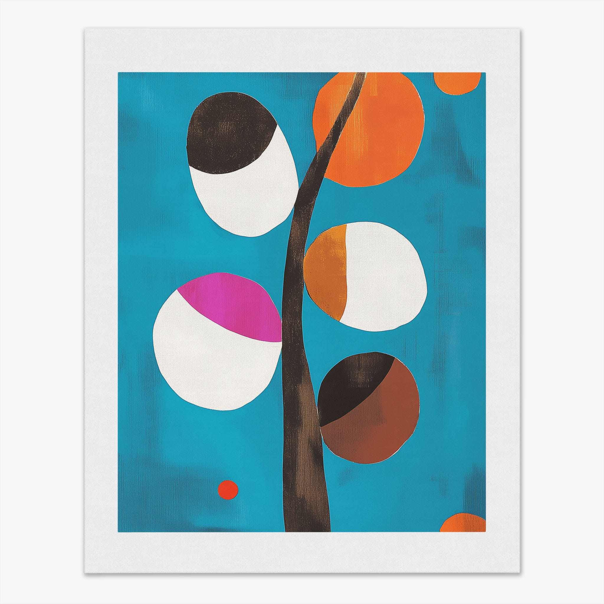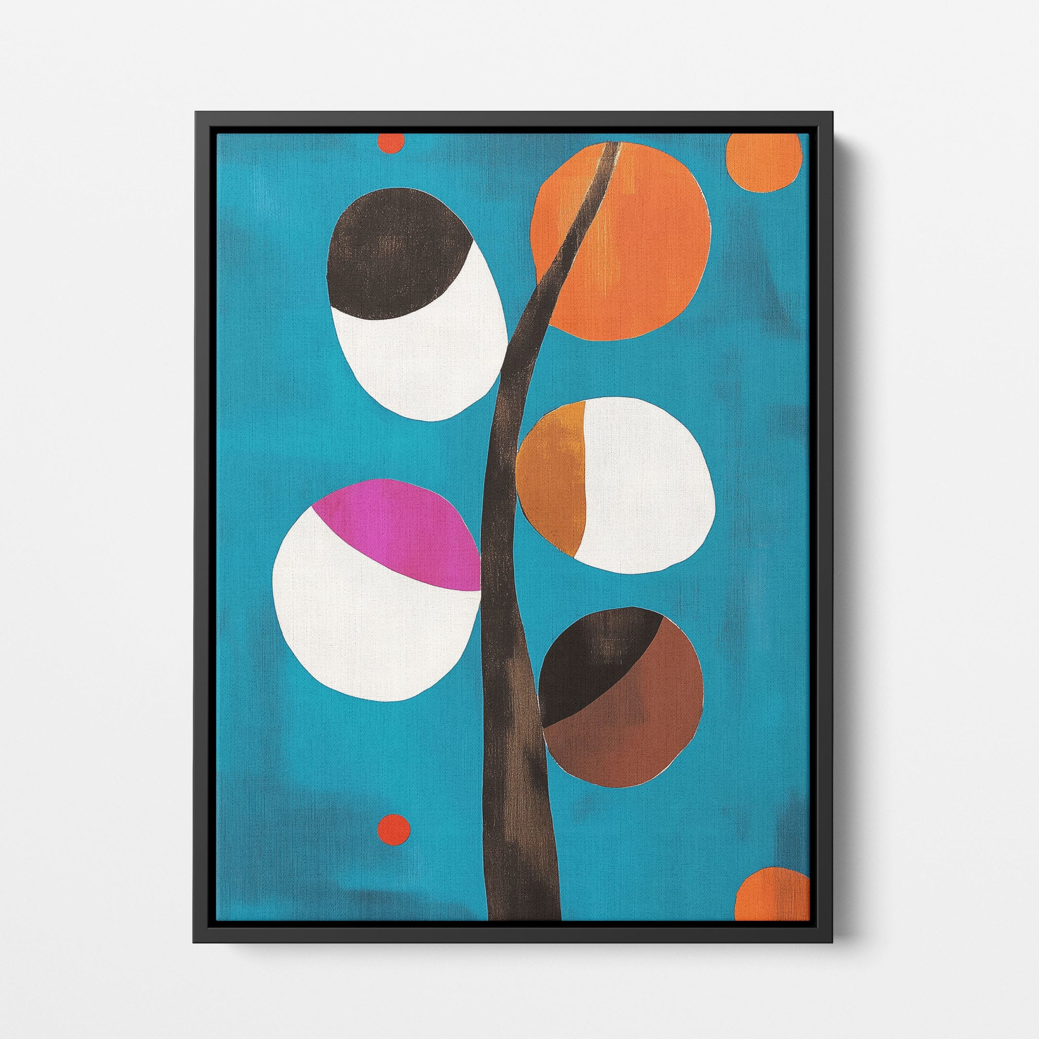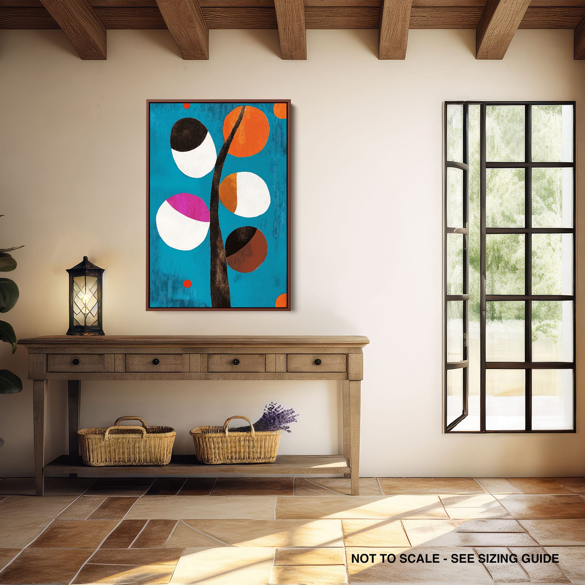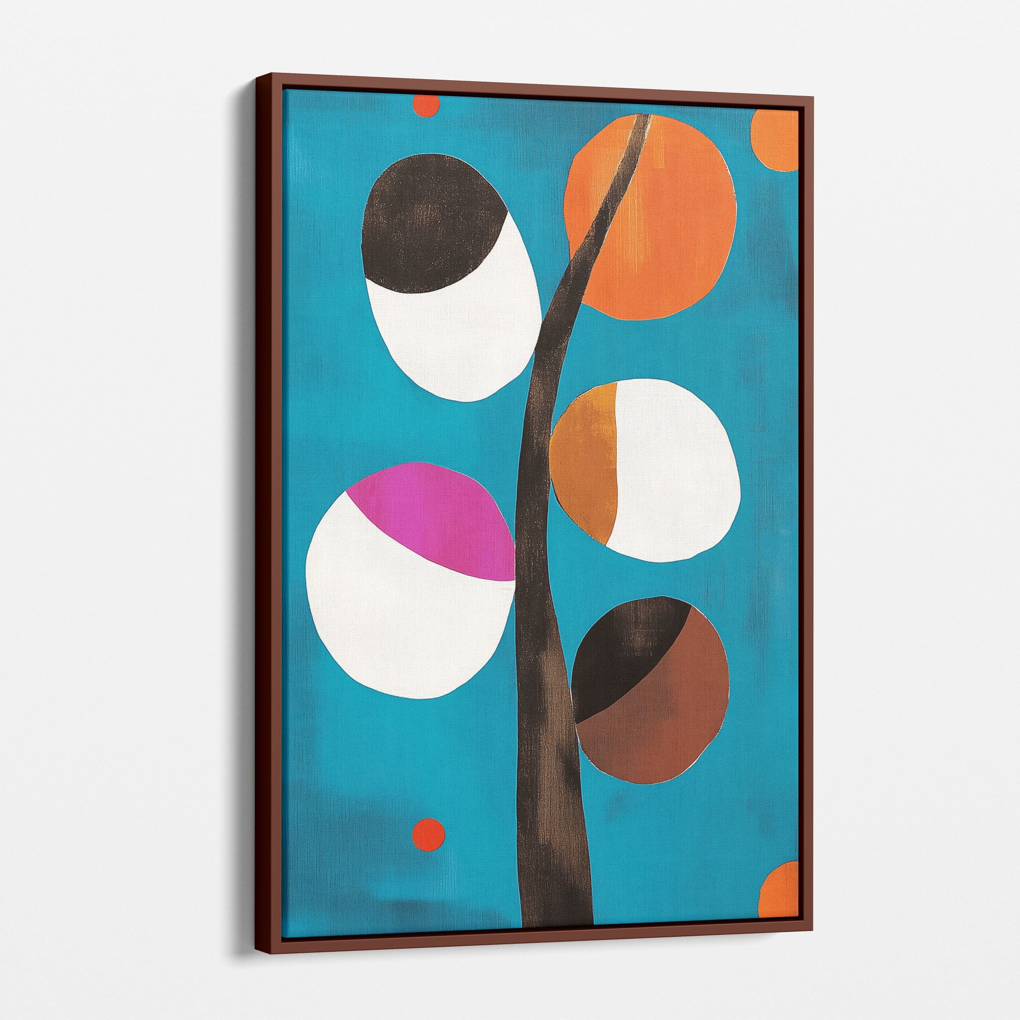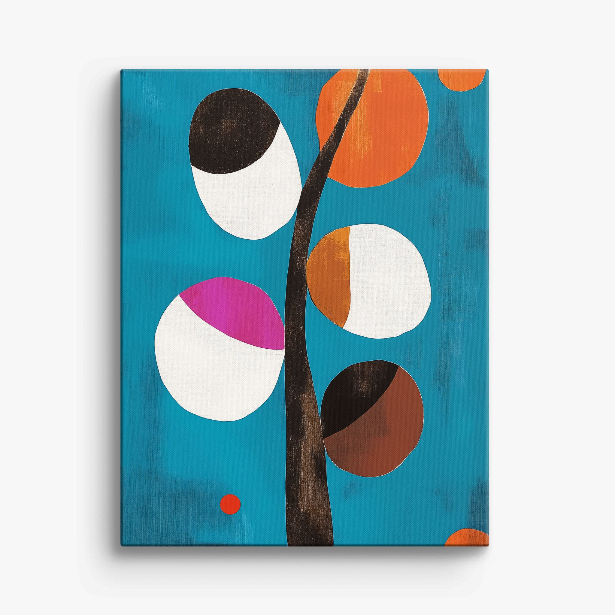 This painting melds geometric precision with a vibrant, modern aesthetic. Bold circles in shades of orange, white, and pink float playfully against a soothing aqua background, separated by a stark black vertical line that adds a striking visual contrast. The simplicity of shapes combined with the engaging color palette offers a visually arresting piece that suits any contemporary space. Add this striking painting to your collection to introduce a touch of modern chic and geometric allure, perfect for revitalizing any room.