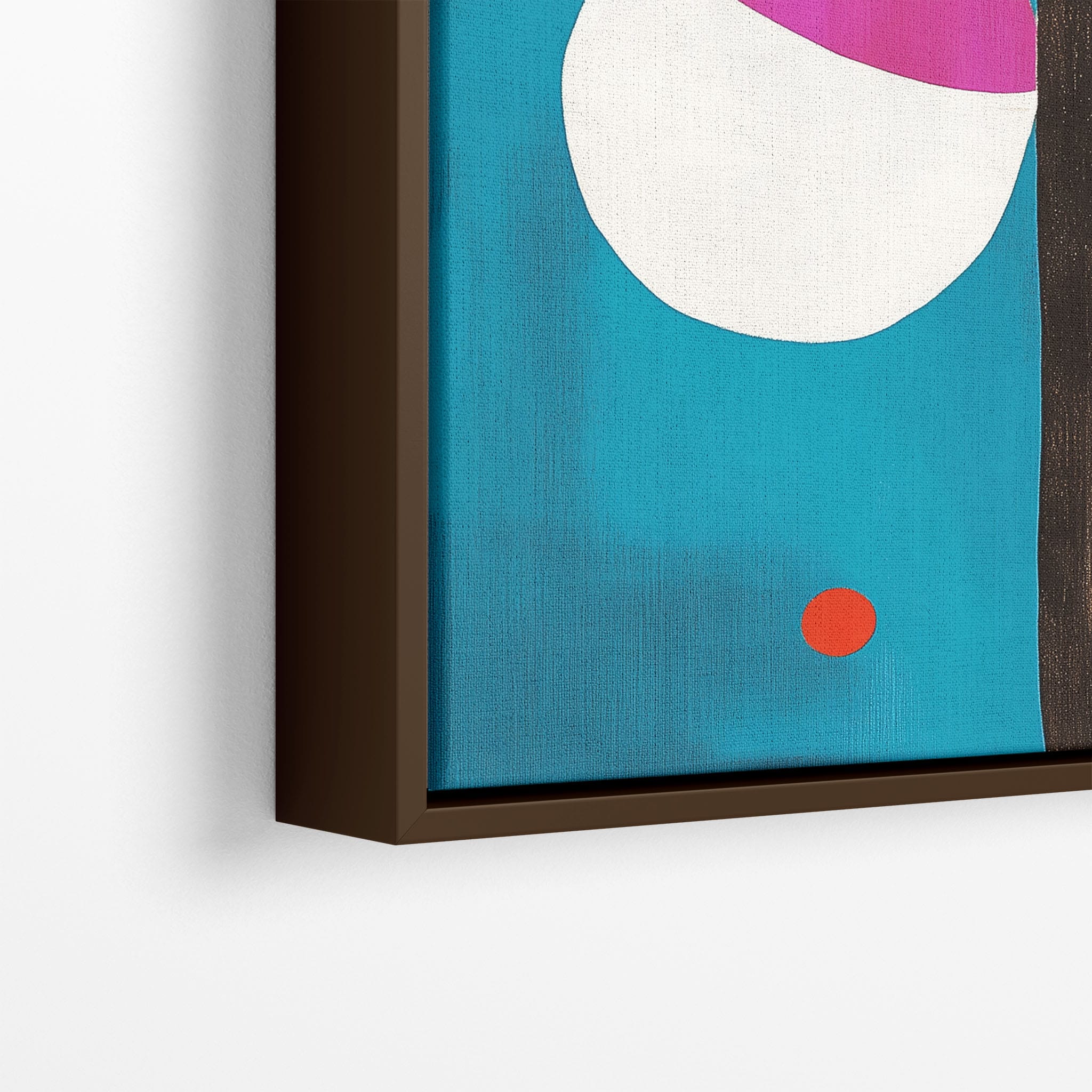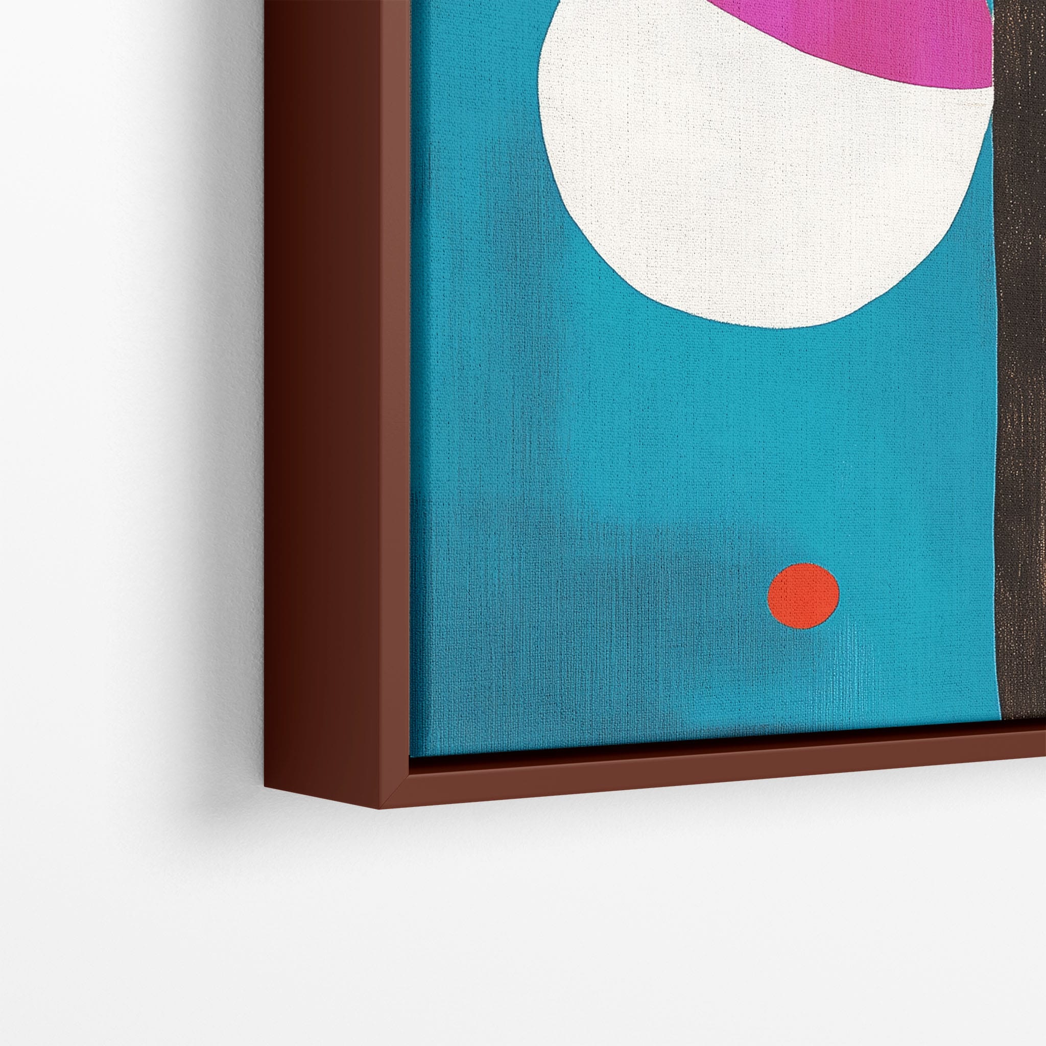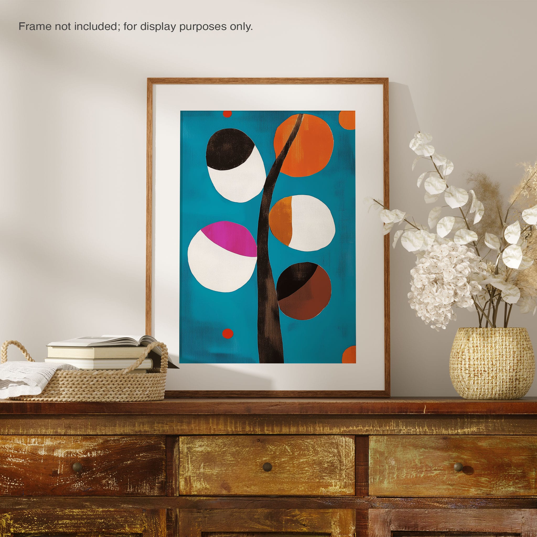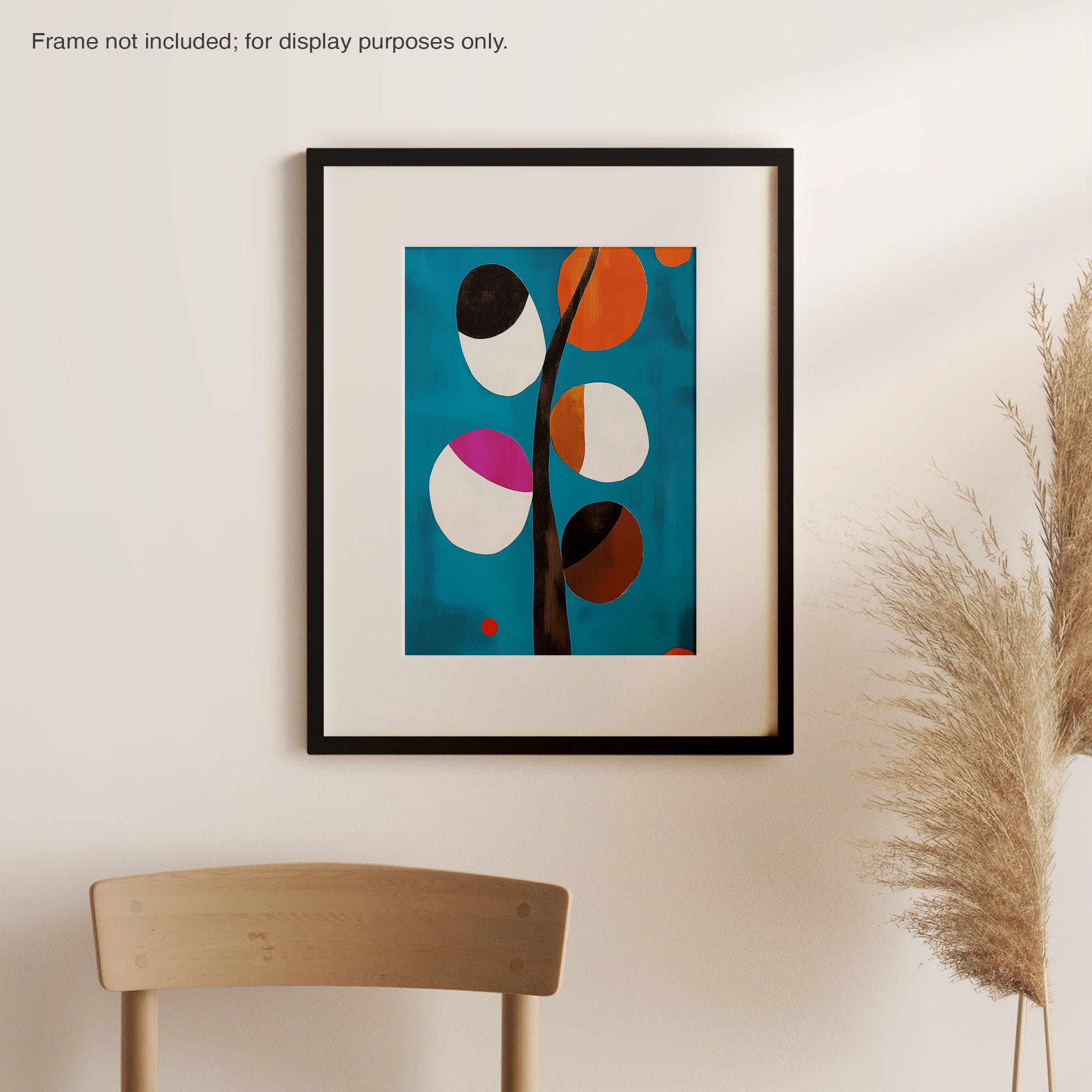 This painting melds geometric precision with a vibrant, modern aesthetic. Bold circles in shades of orange, white, and pink float playfully against a soothing aqua background, separated by a stark black vertical line that adds a striking visual contrast. The simplicity of shapes combined with the engaging color palette offers a visually arresting piece that suits any contemporary space. Add this striking painting to your collection to introduce a touch of modern chic and geometric allure, perfect for revitalizing any room.