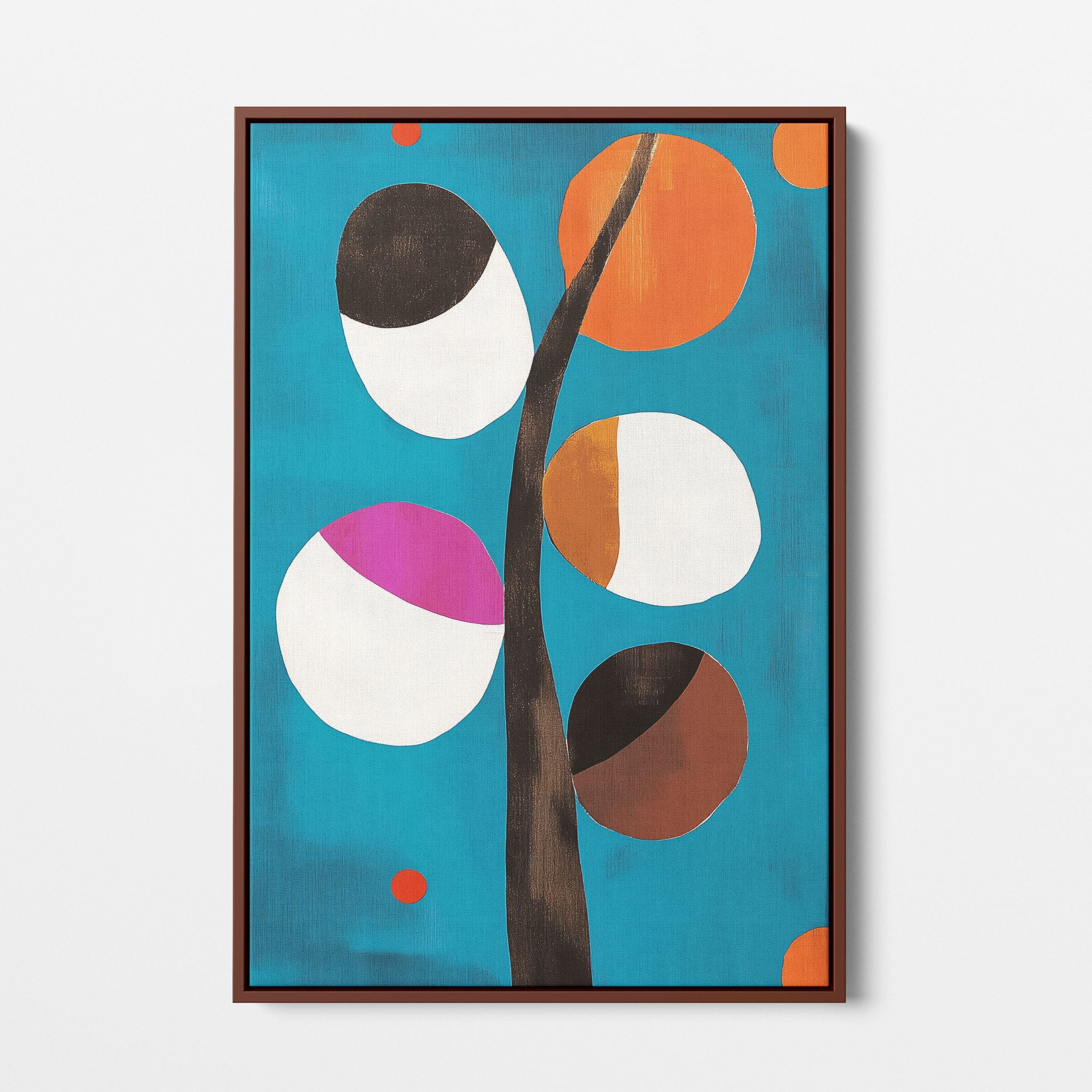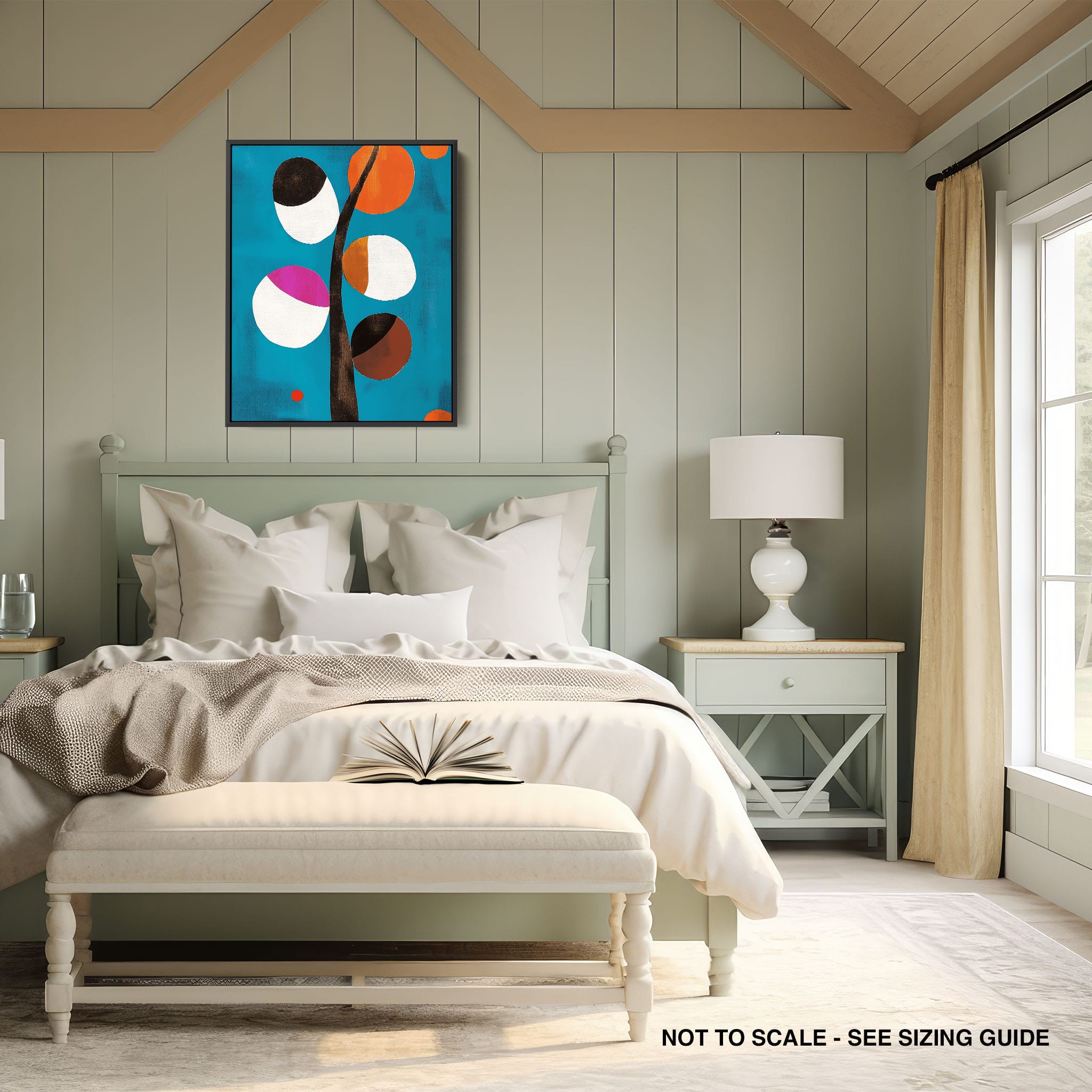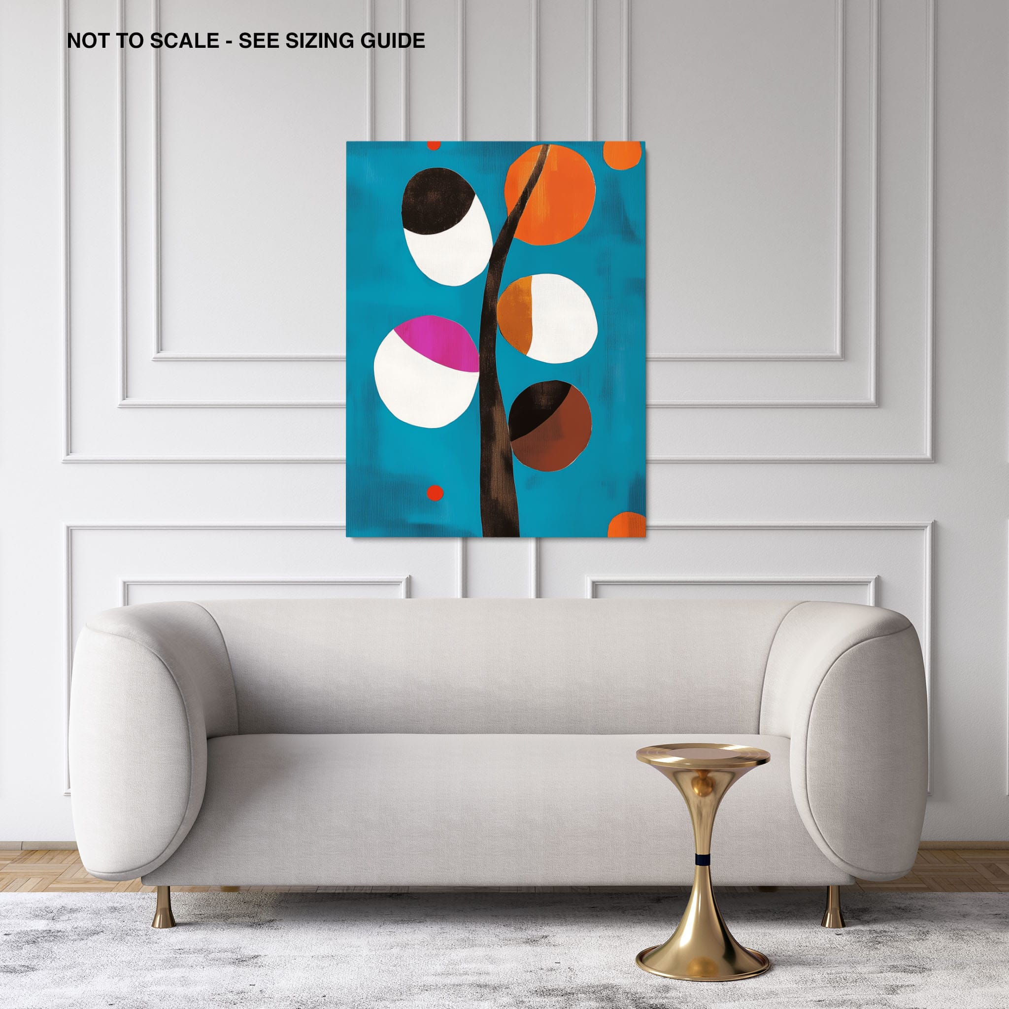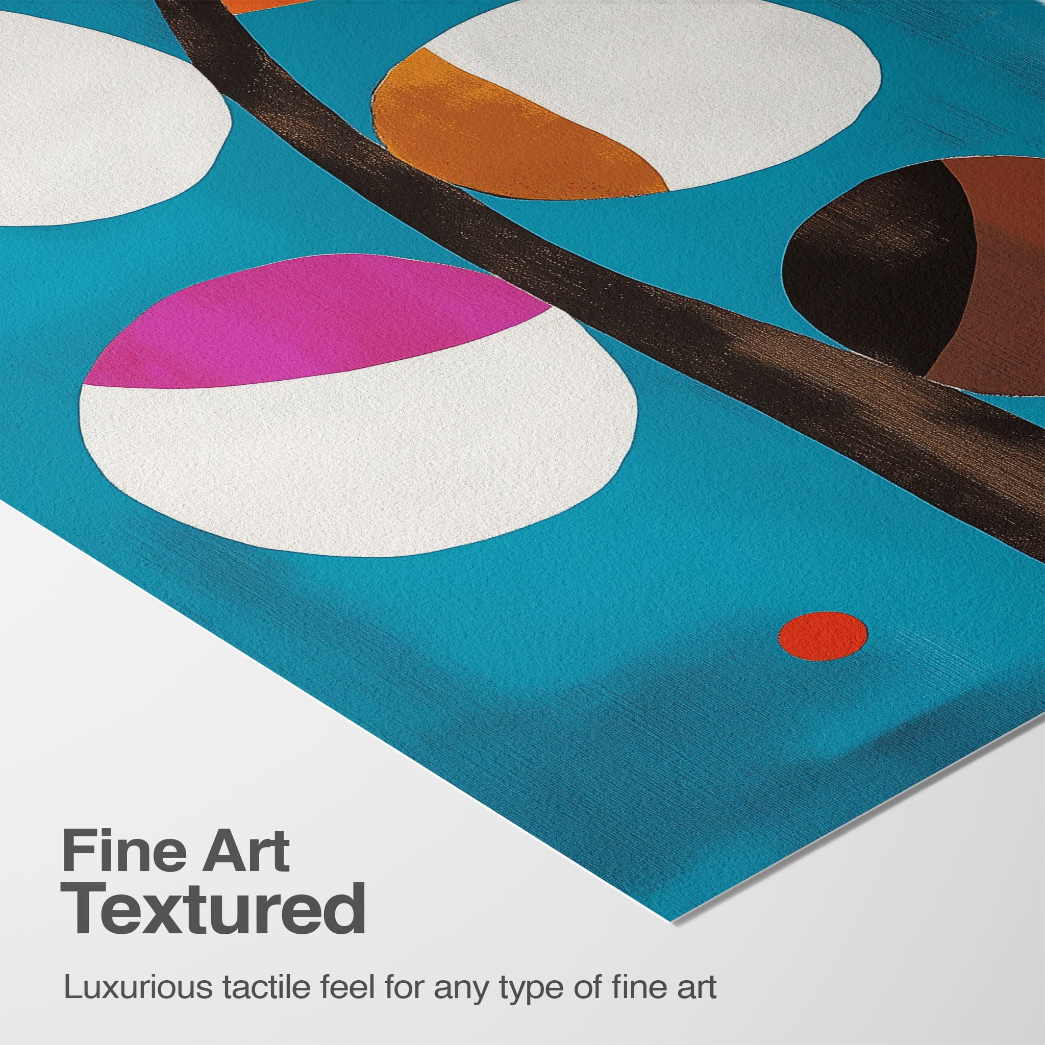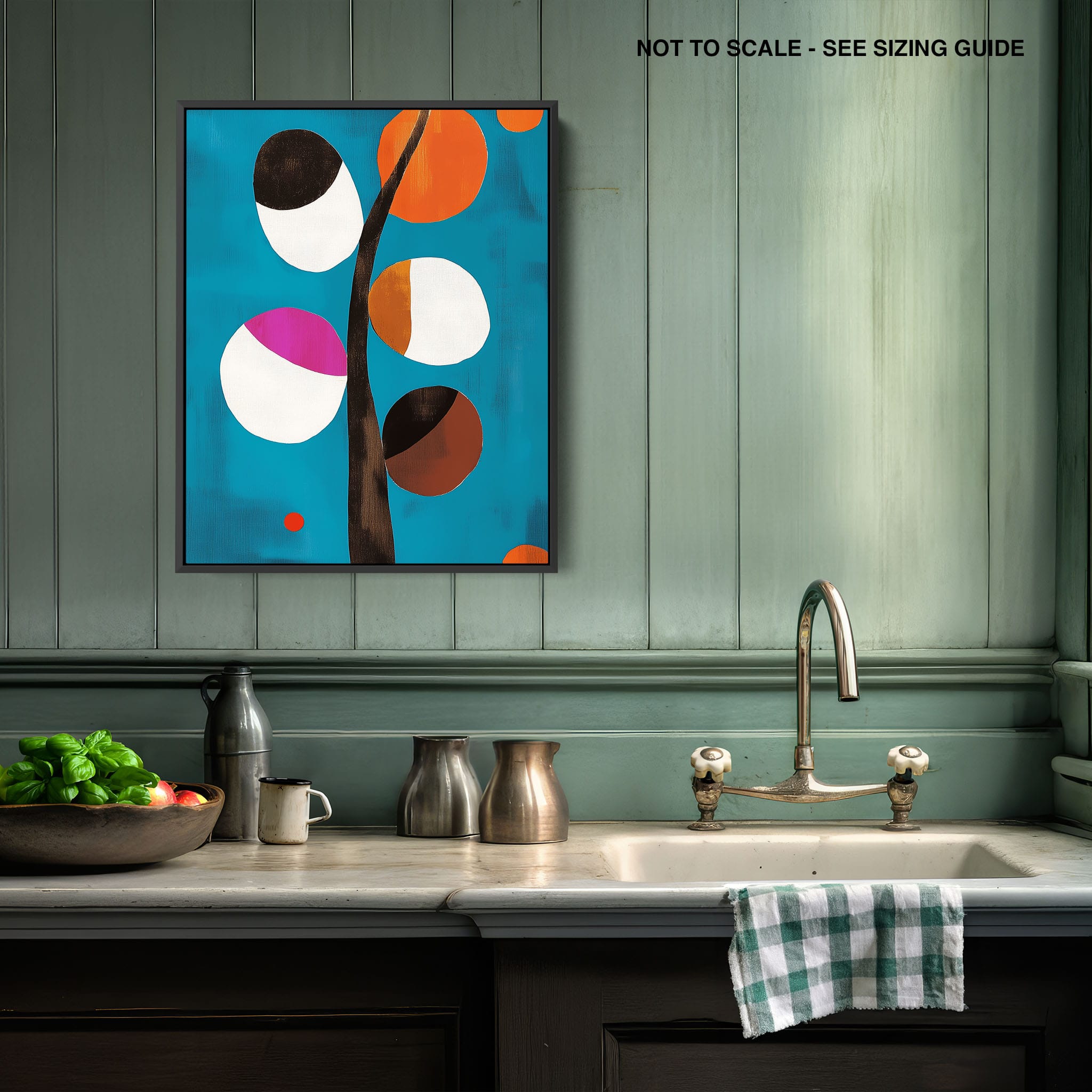 This painting melds geometric precision with a vibrant, modern aesthetic. Bold circles in shades of orange, white, and pink float playfully against a soothing aqua background, separated by a stark black vertical line that adds a striking visual contrast. The simplicity of shapes combined with the engaging color palette offers a visually arresting piece that suits any contemporary space. Add this striking painting to your collection to introduce a touch of modern chic and geometric allure, perfect for revitalizing any room.