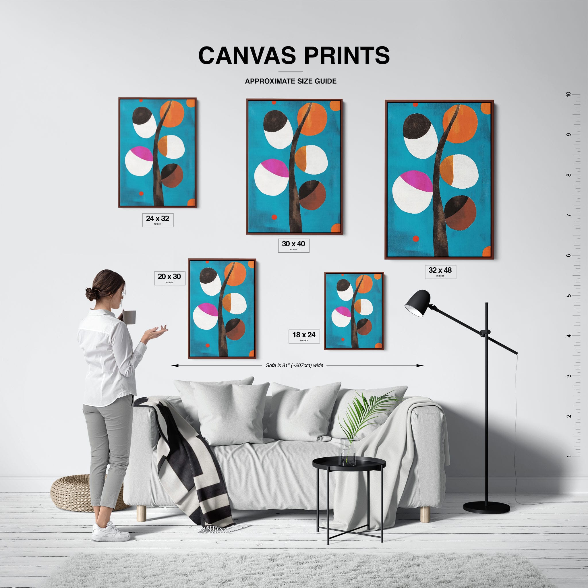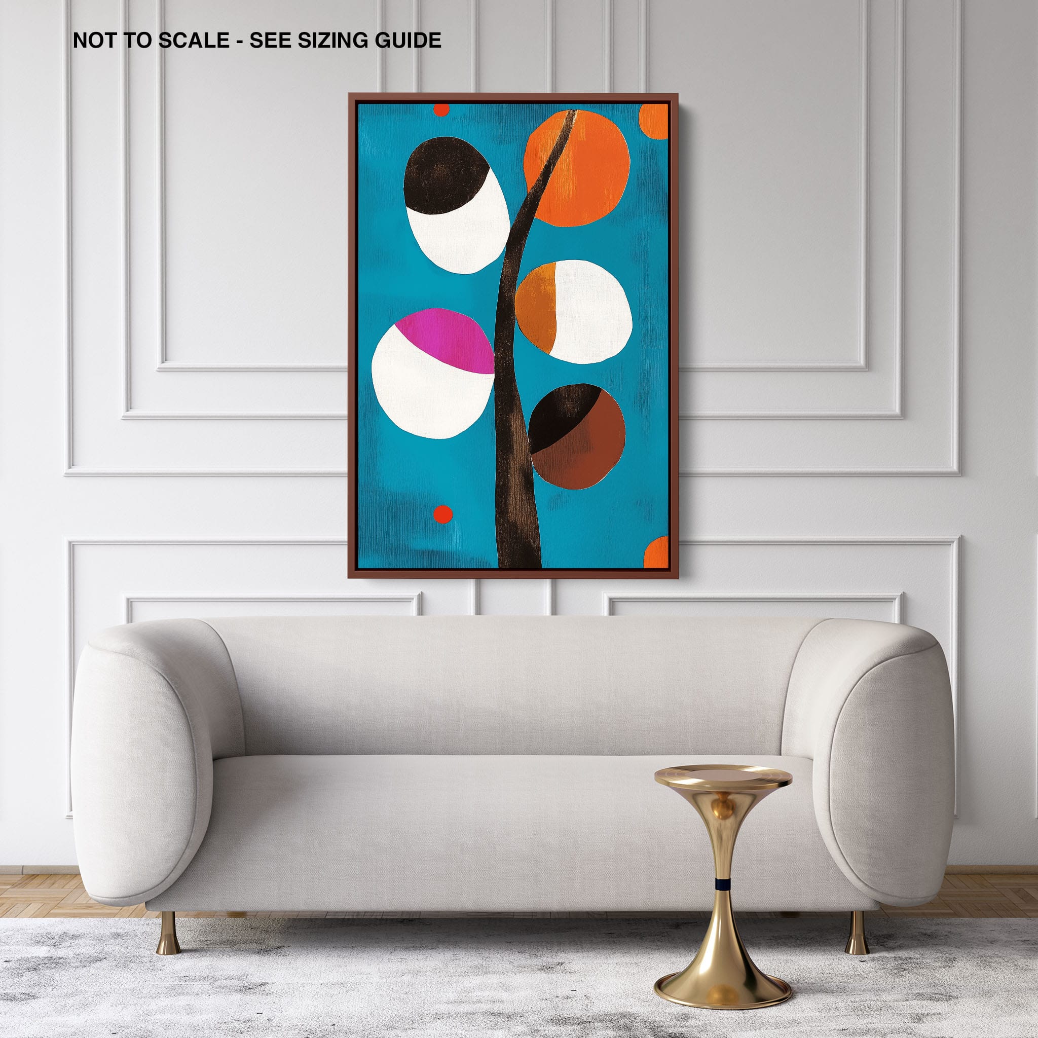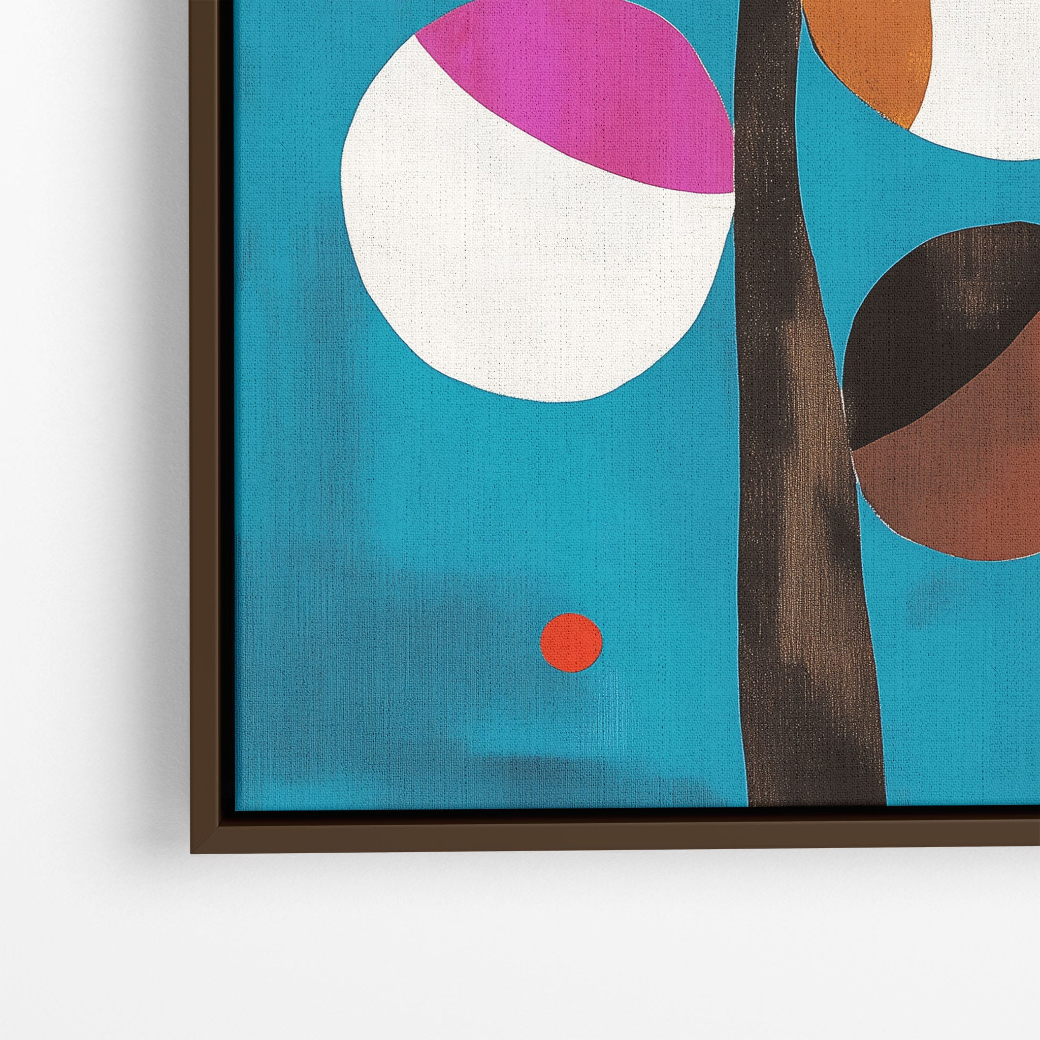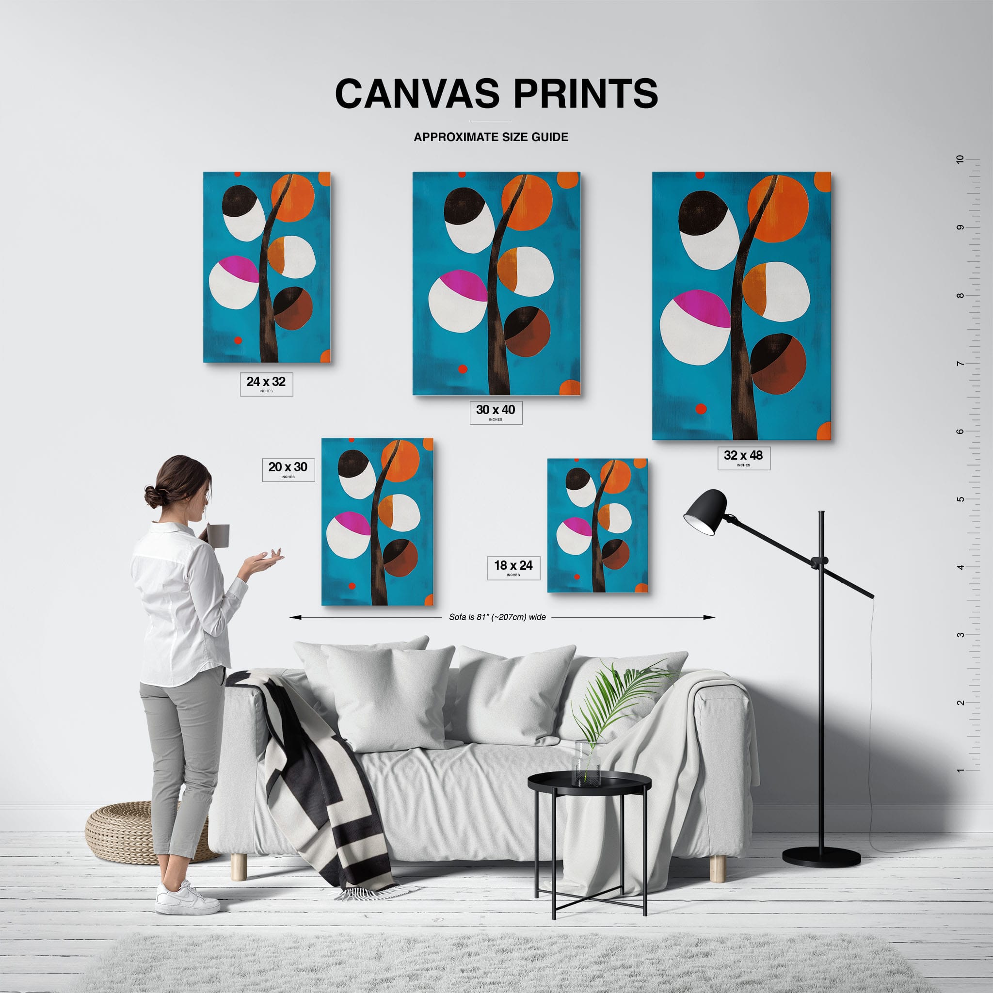 This painting melds geometric precision with a vibrant, modern aesthetic. Bold circles in shades of orange, white, and pink float playfully against a soothing aqua background, separated by a stark black vertical line that adds a striking visual contrast. The simplicity of shapes combined with the engaging color palette offers a visually arresting piece that suits any contemporary space. Add this striking painting to your collection to introduce a touch of modern chic and geometric allure, perfect for revitalizing any room.