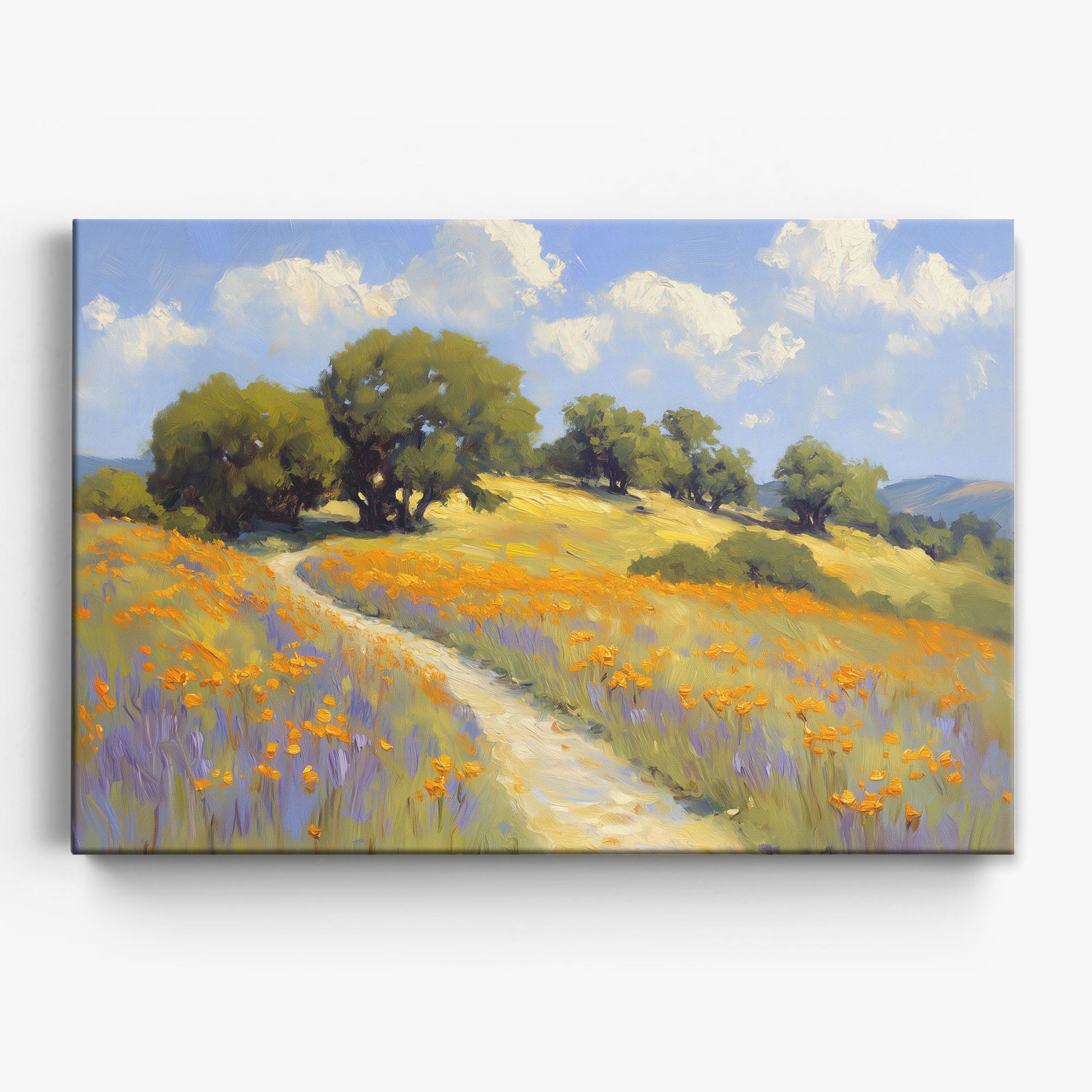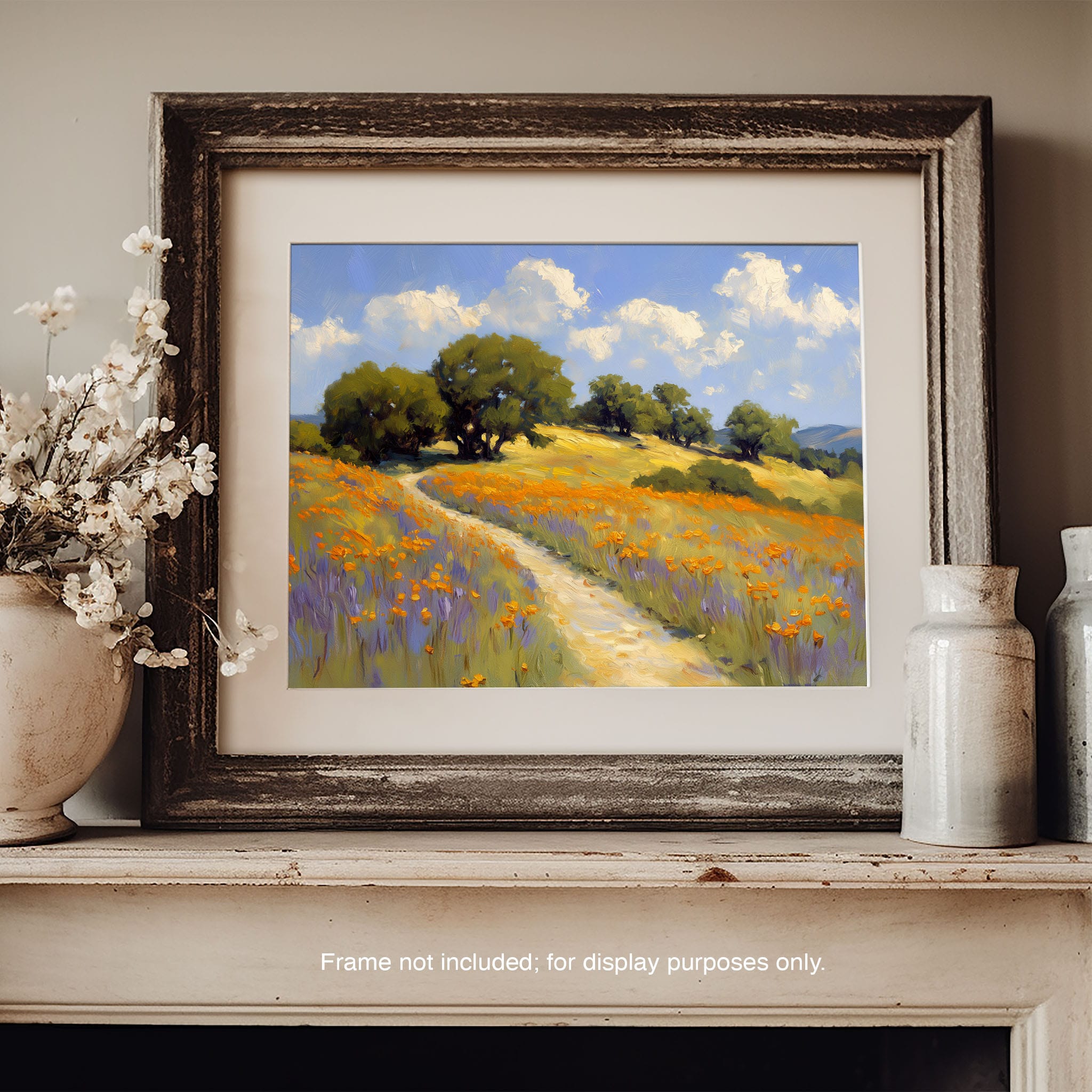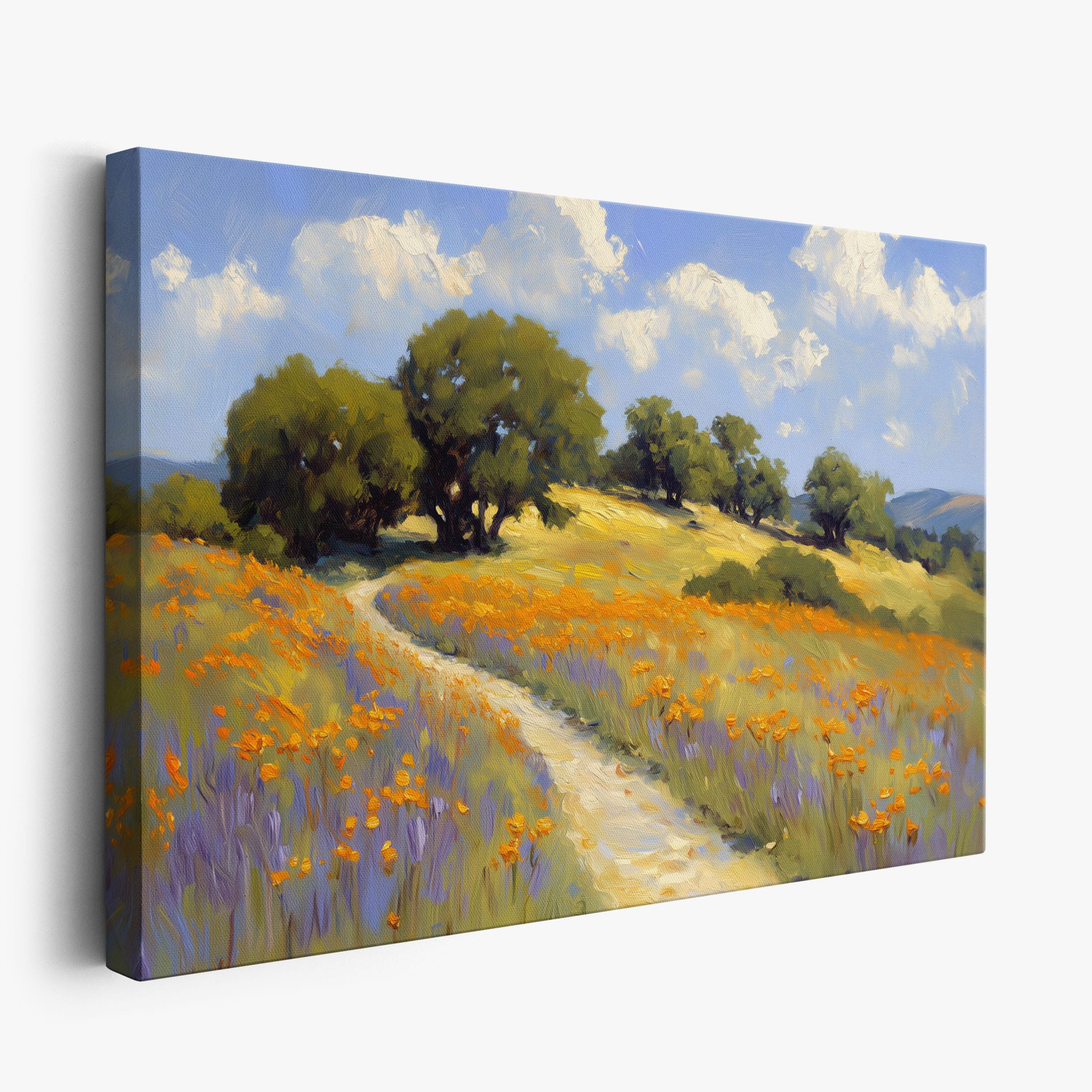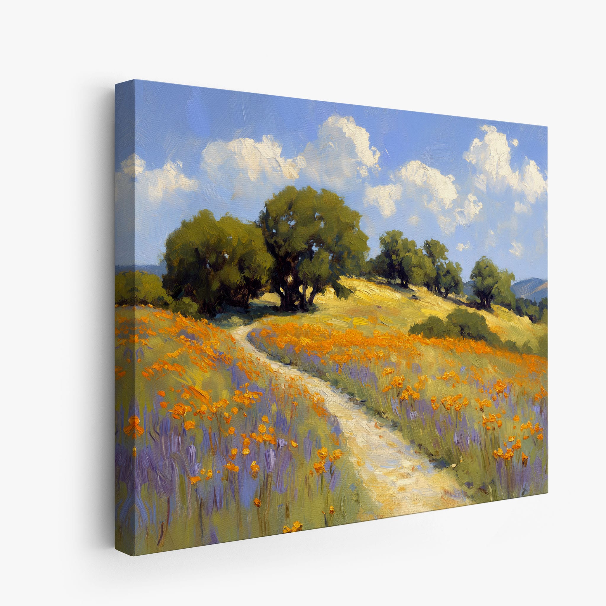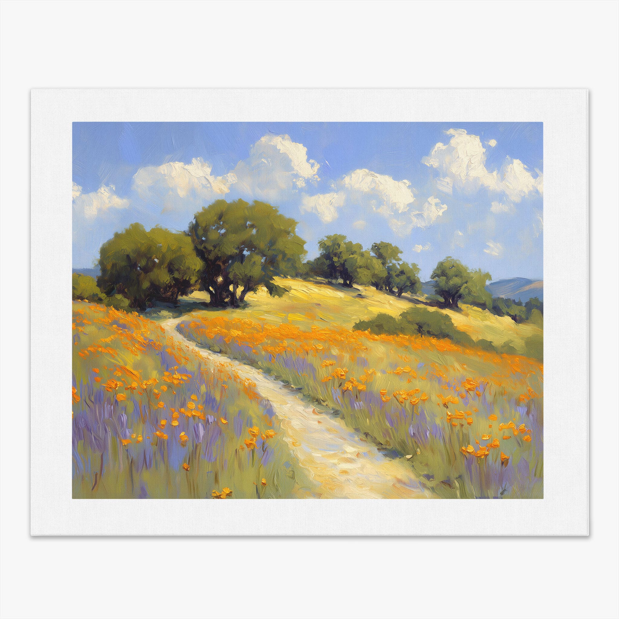 This painting captures the serene beauty of a sunlit meadow, adorned with vibrant orange and purple wildflowers, fluttering under a clear summer sky. The skilled brushwork enhances the lush greenery of the ancient trees casting dappled shadows over the winding path. Perfect for lovers of nature and tranquil landscapes, this high-quality painting brings a breath of fresh air and a touch of summer warmth into any room. It’s an ideal choice for anyone looking to add a splash of color and the innate charm of the great outdoors to their home décor.