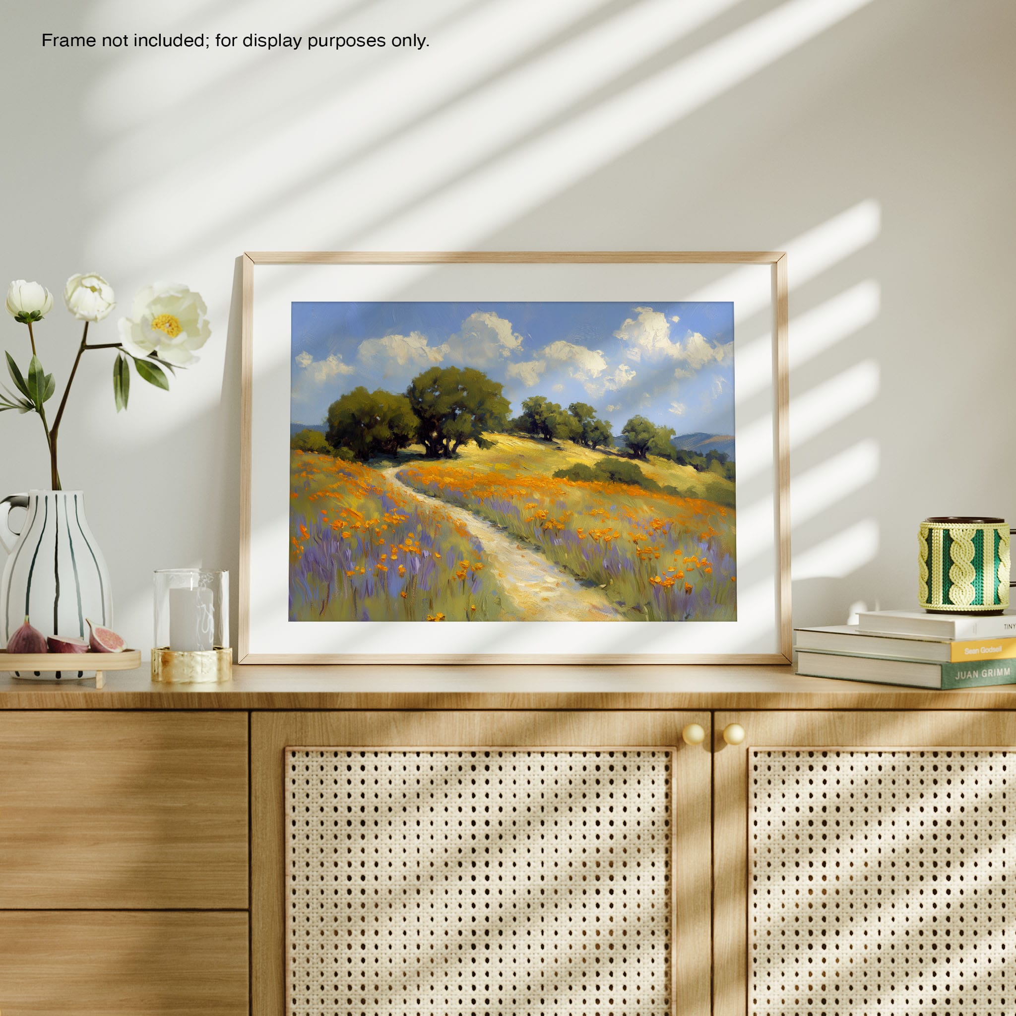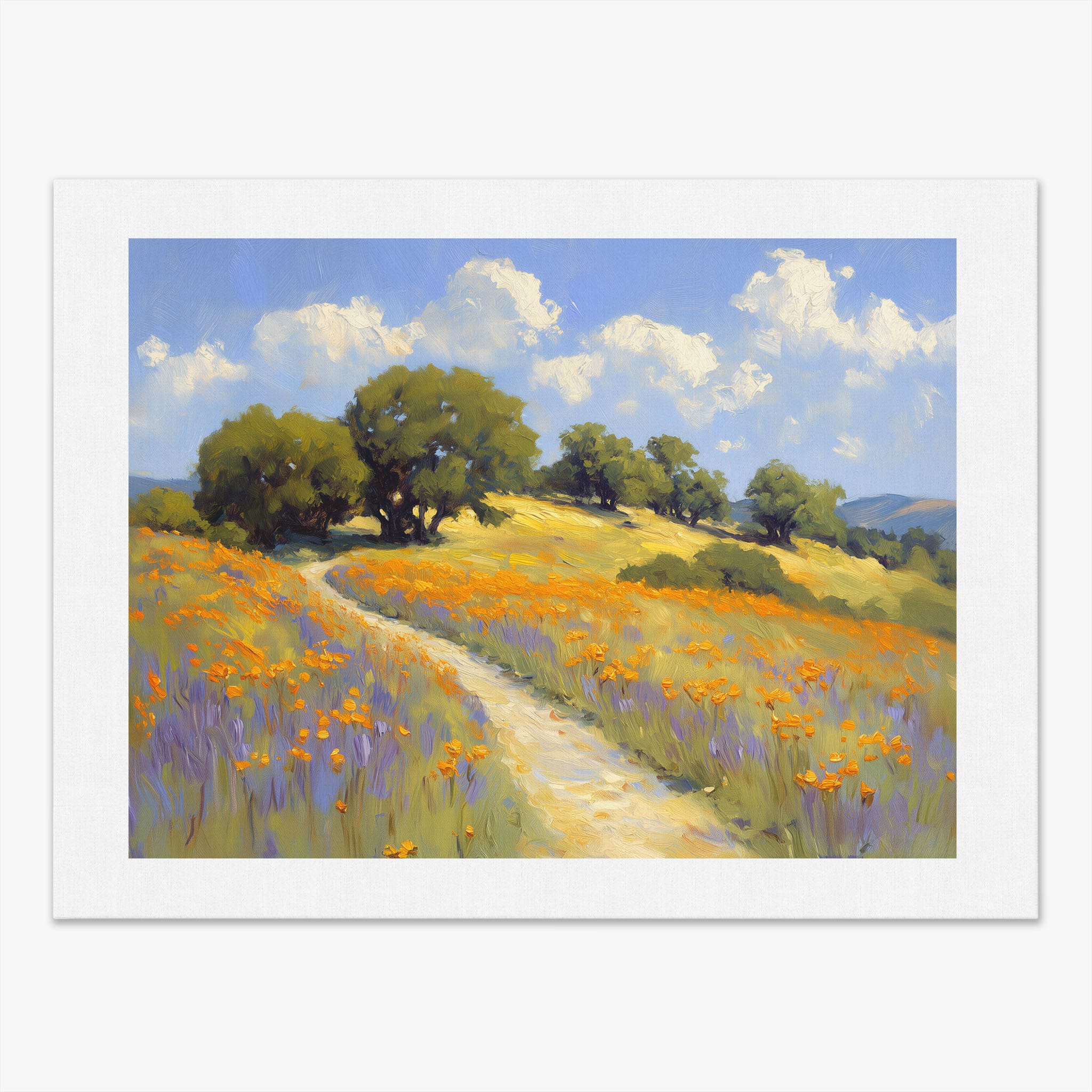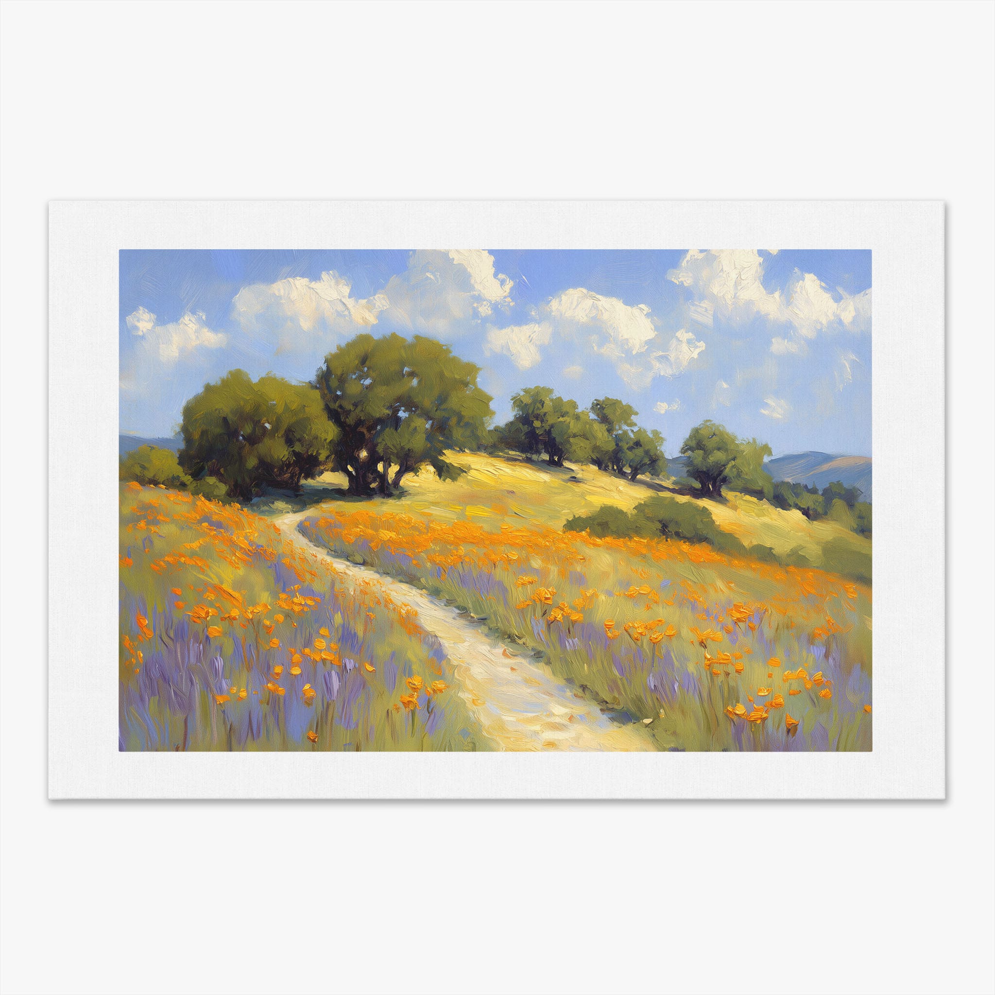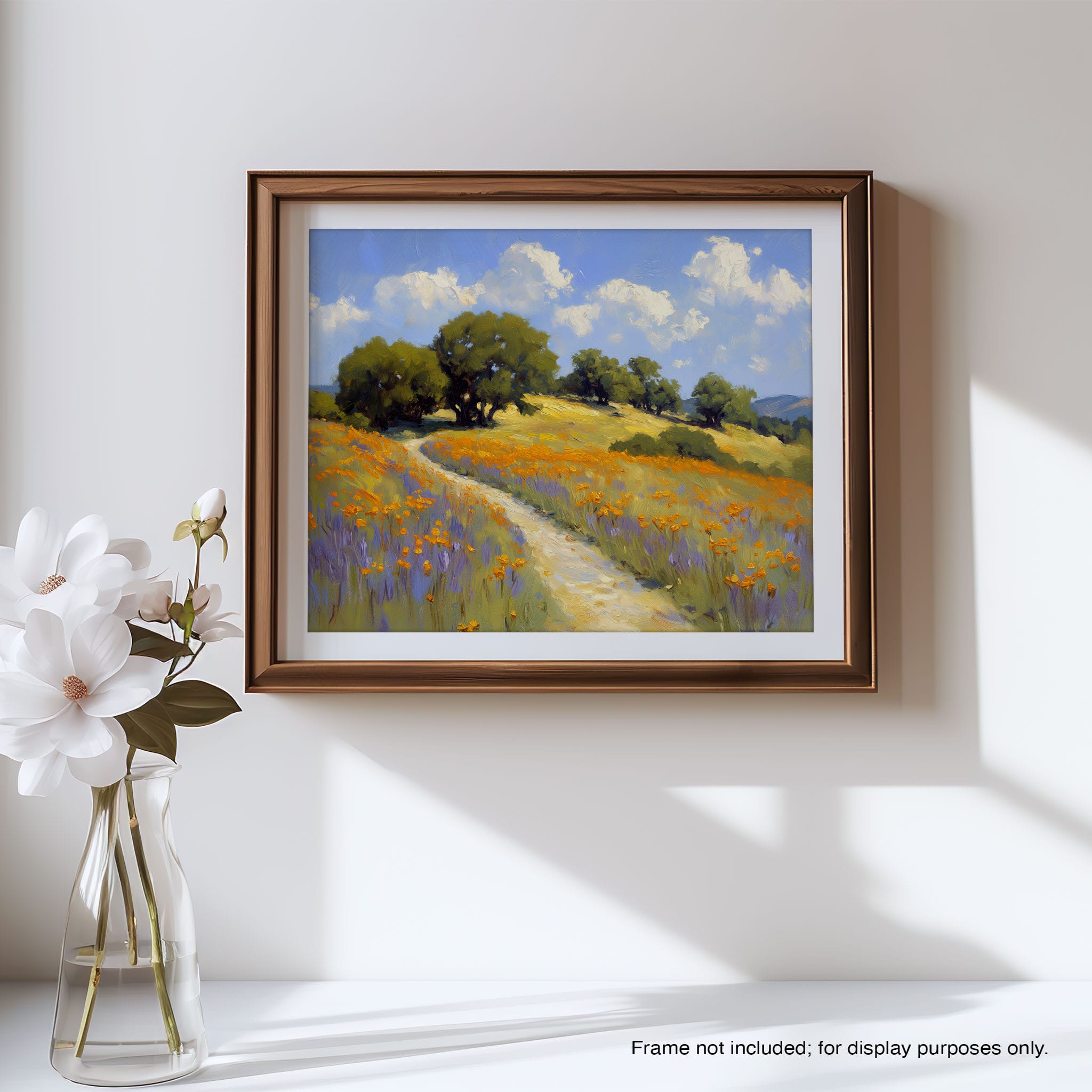 This painting captures the serene beauty of a sunlit meadow, adorned with vibrant orange and purple wildflowers, fluttering under a clear summer sky. The skilled brushwork enhances the lush greenery of the ancient trees casting dappled shadows over the winding path. Perfect for lovers of nature and tranquil landscapes, this high-quality painting brings a breath of fresh air and a touch of summer warmth into any room. It’s an ideal choice for anyone looking to add a splash of color and the innate charm of the great outdoors to their home décor.