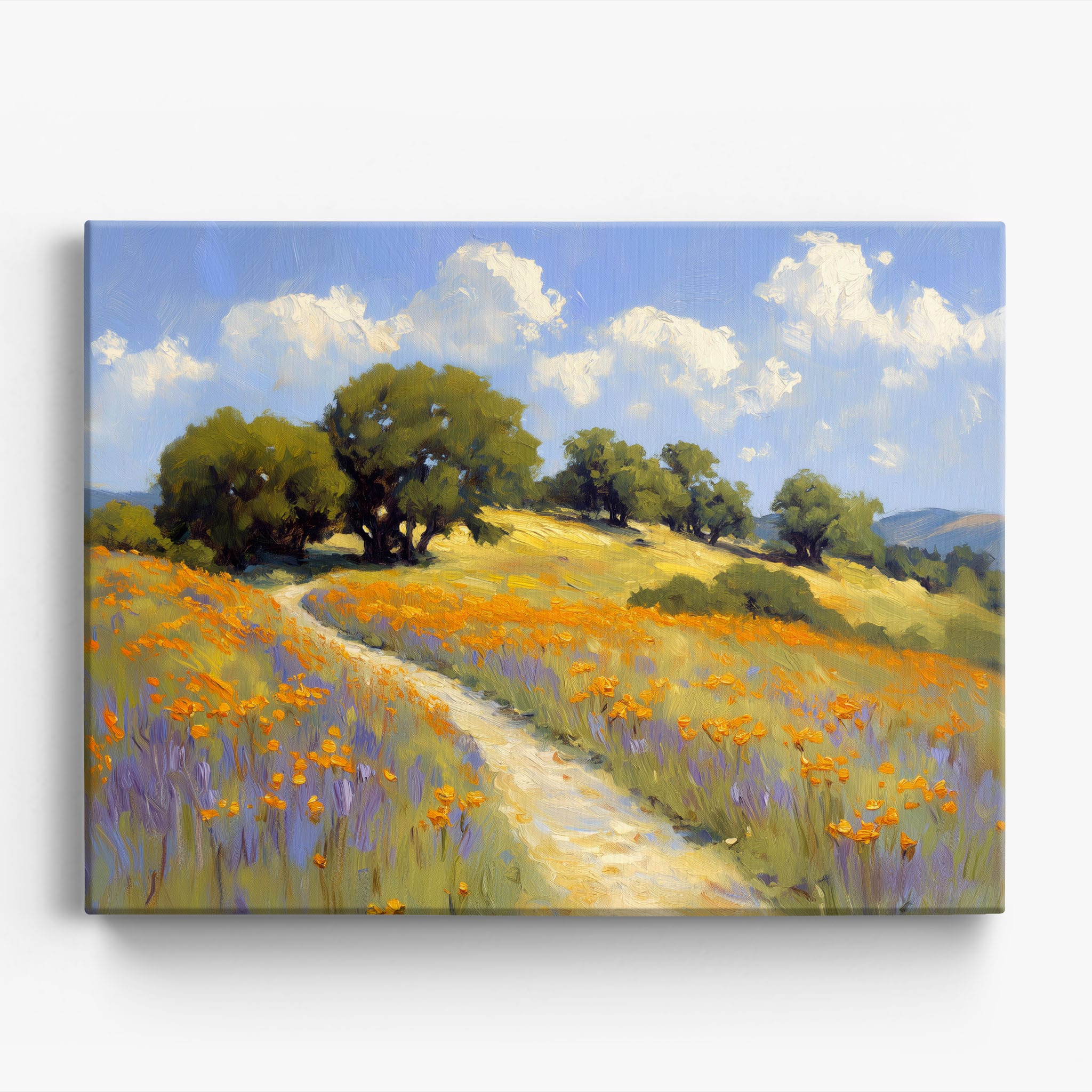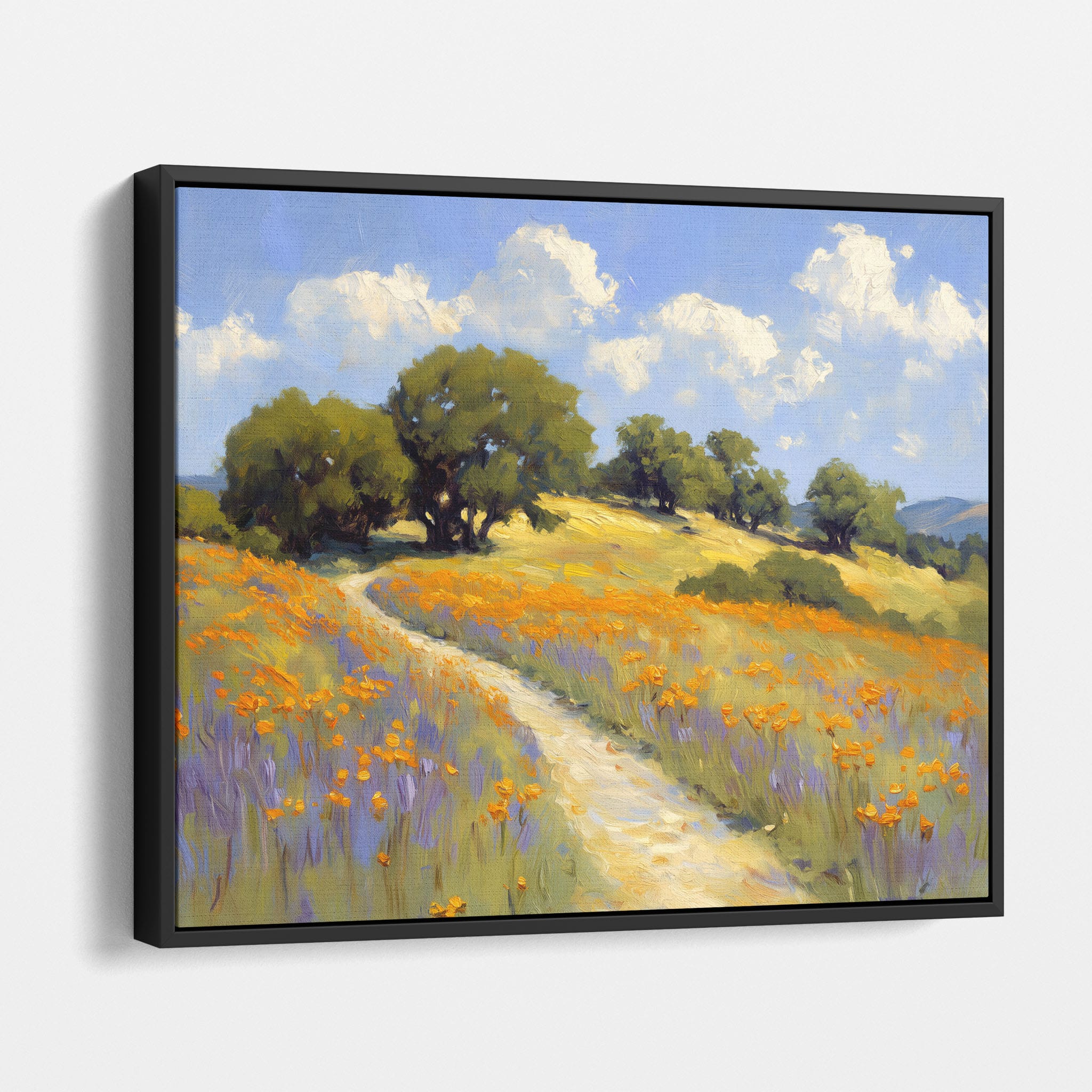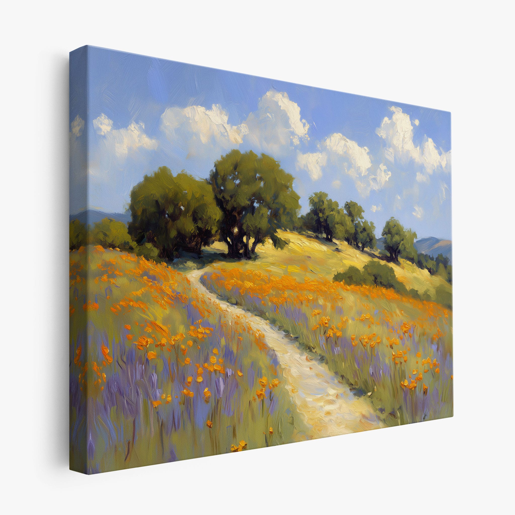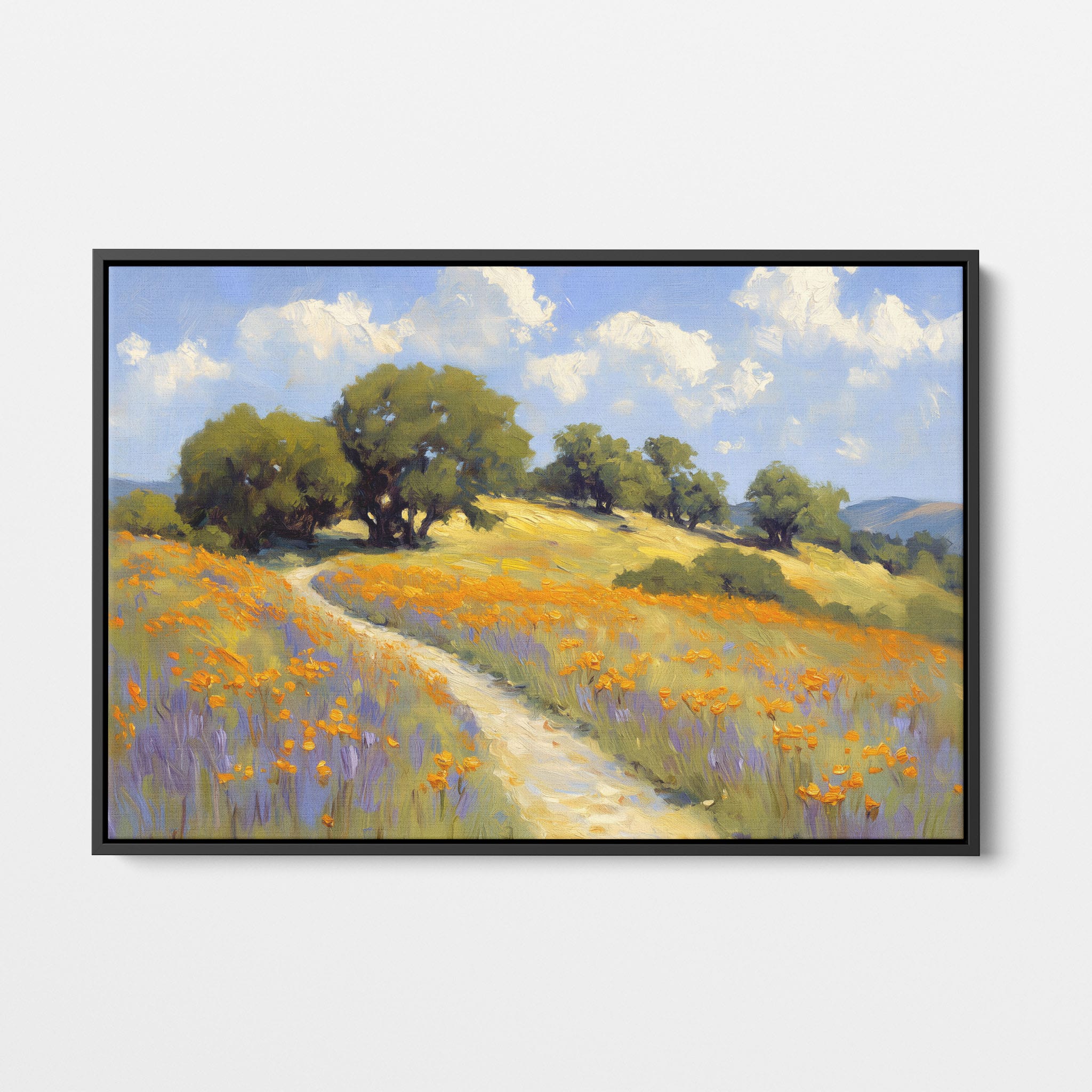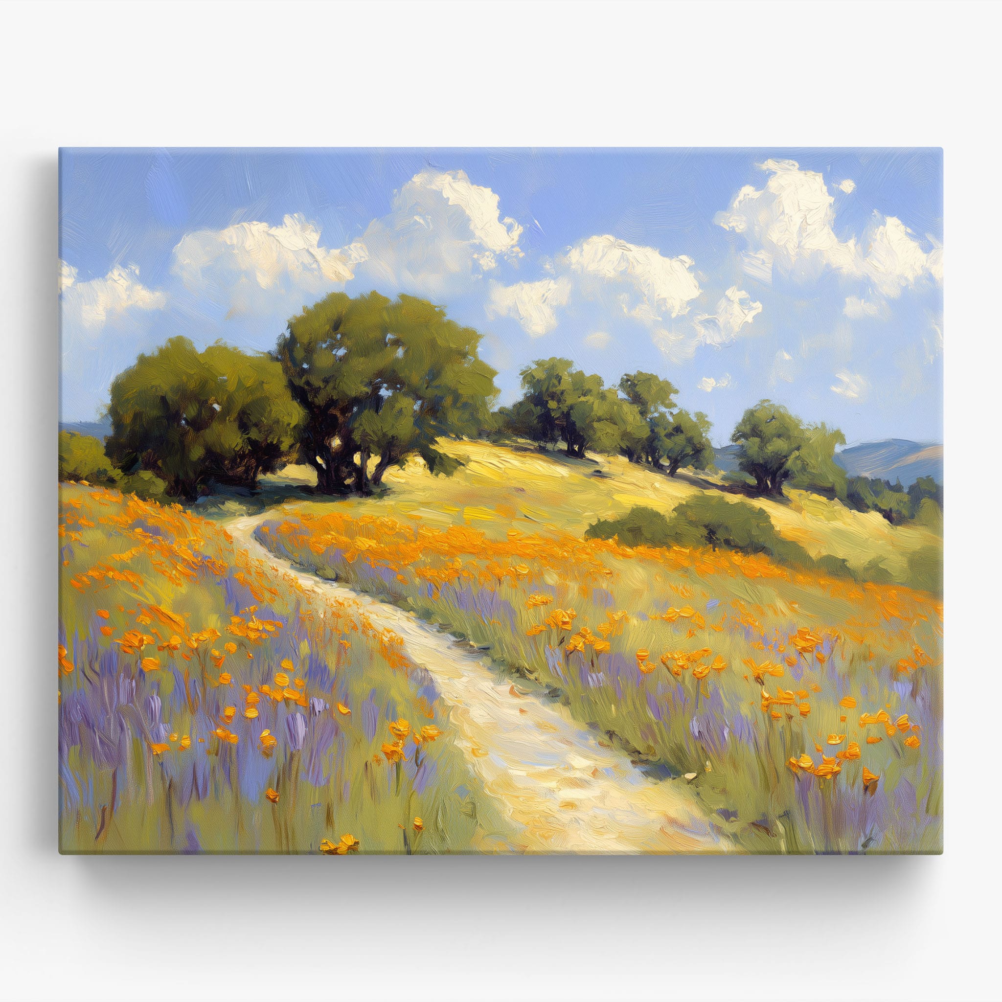 This painting captures the serene beauty of a sunlit meadow, adorned with vibrant orange and purple wildflowers, fluttering under a clear summer sky. The skilled brushwork enhances the lush greenery of the ancient trees casting dappled shadows over the winding path. Perfect for lovers of nature and tranquil landscapes, this high-quality painting brings a breath of fresh air and a touch of summer warmth into any room. It’s an ideal choice for anyone looking to add a splash of color and the innate charm of the great outdoors to their home décor.