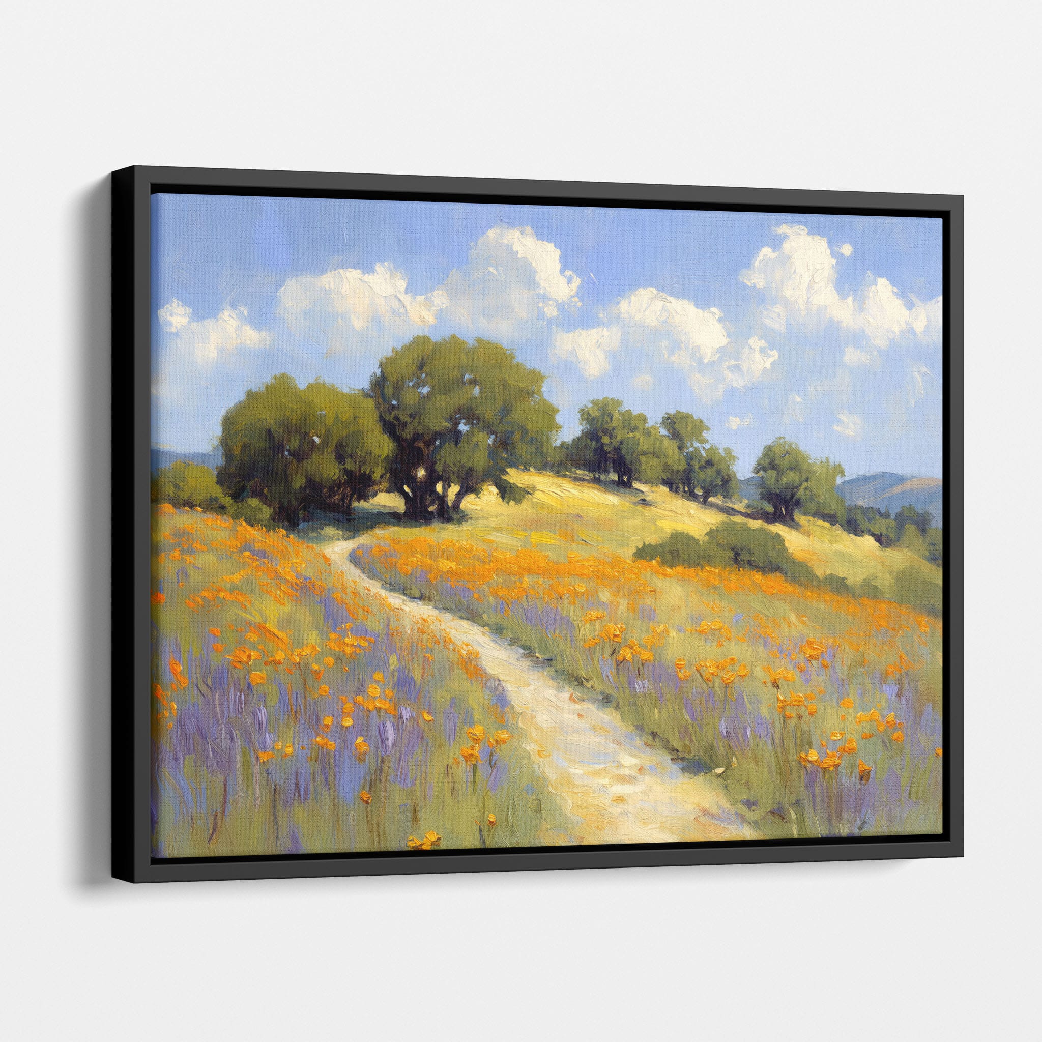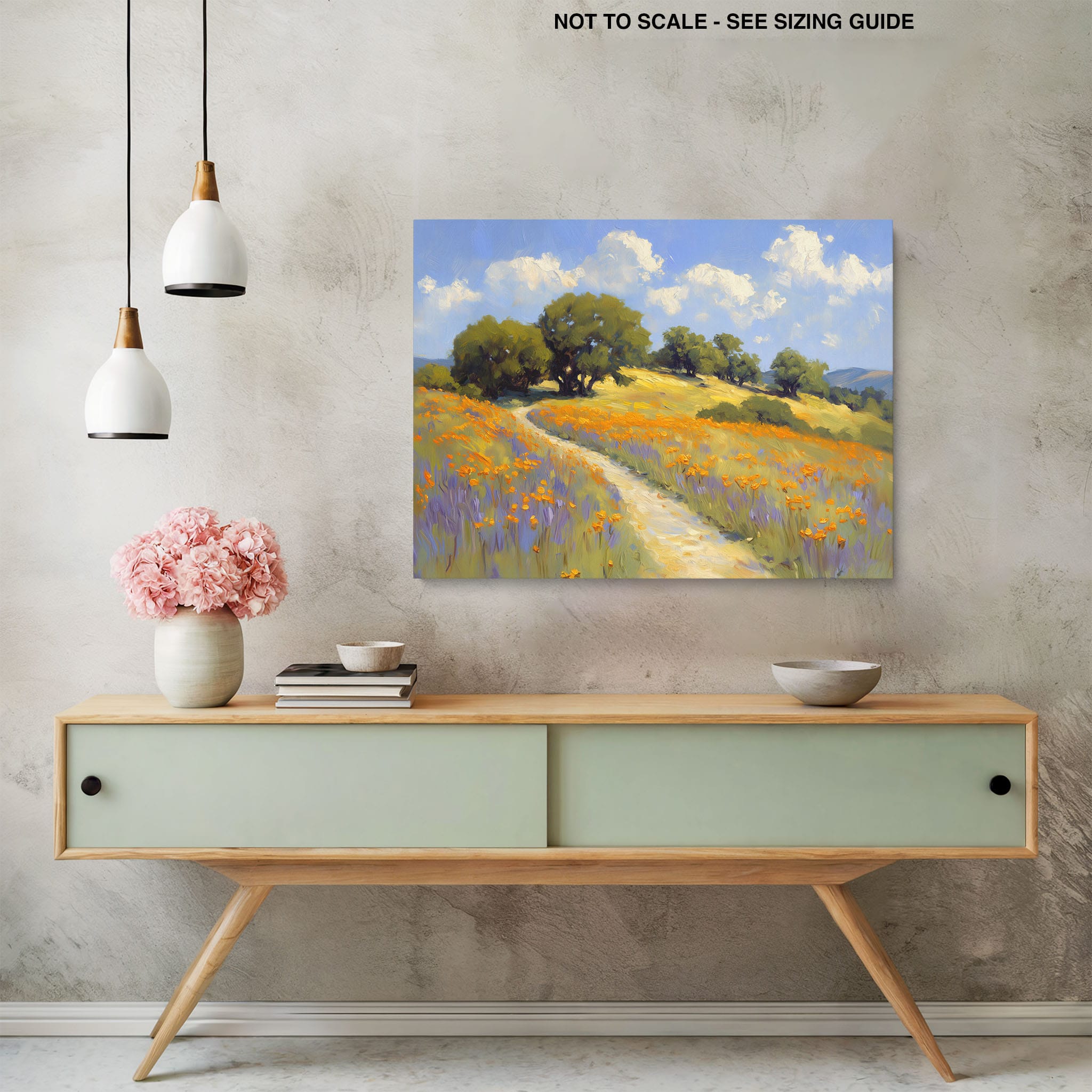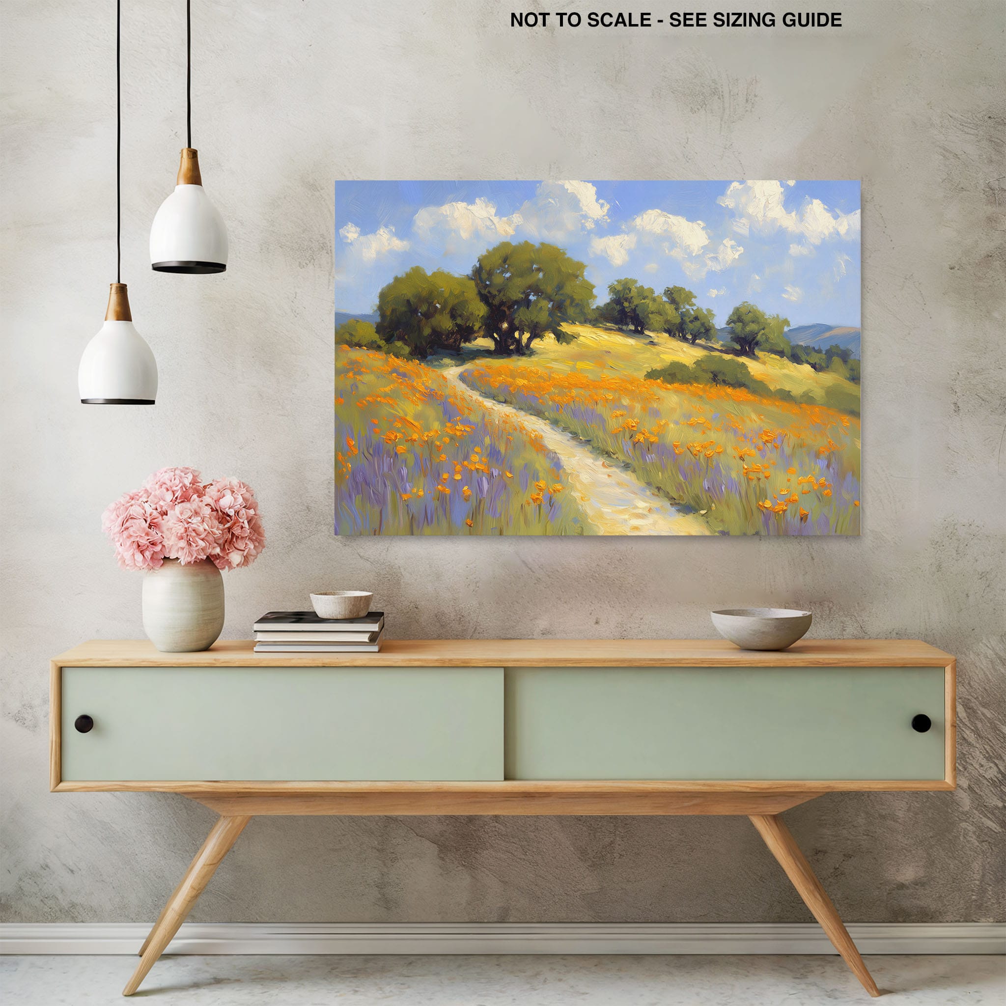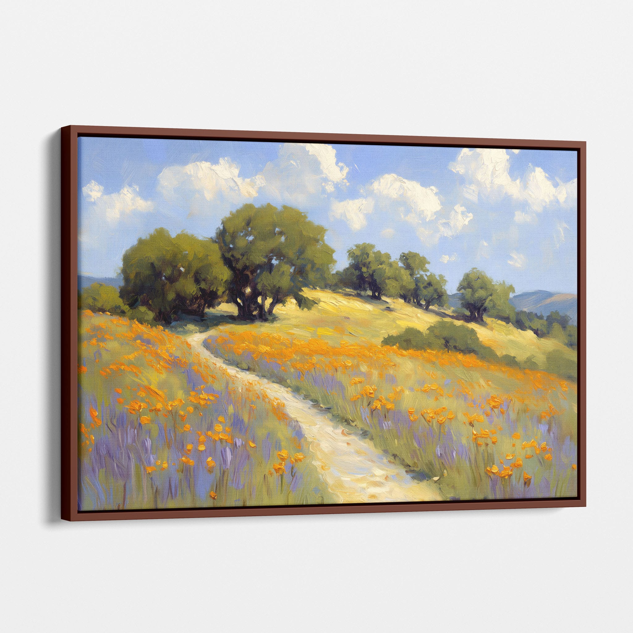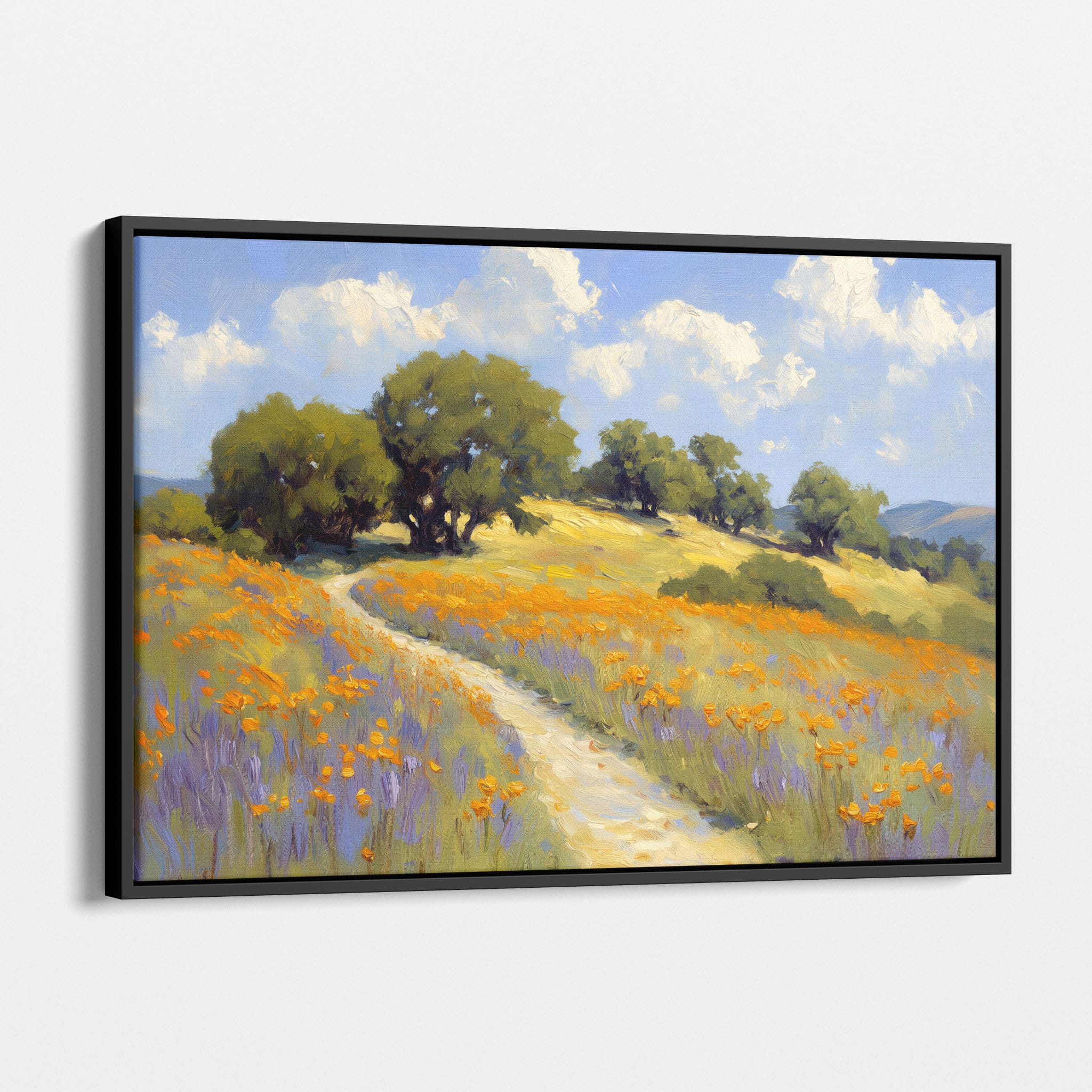 This painting captures the serene beauty of a sunlit meadow, adorned with vibrant orange and purple wildflowers, fluttering under a clear summer sky. The skilled brushwork enhances the lush greenery of the ancient trees casting dappled shadows over the winding path. Perfect for lovers of nature and tranquil landscapes, this high-quality painting brings a breath of fresh air and a touch of summer warmth into any room. It’s an ideal choice for anyone looking to add a splash of color and the innate charm of the great outdoors to their home décor.