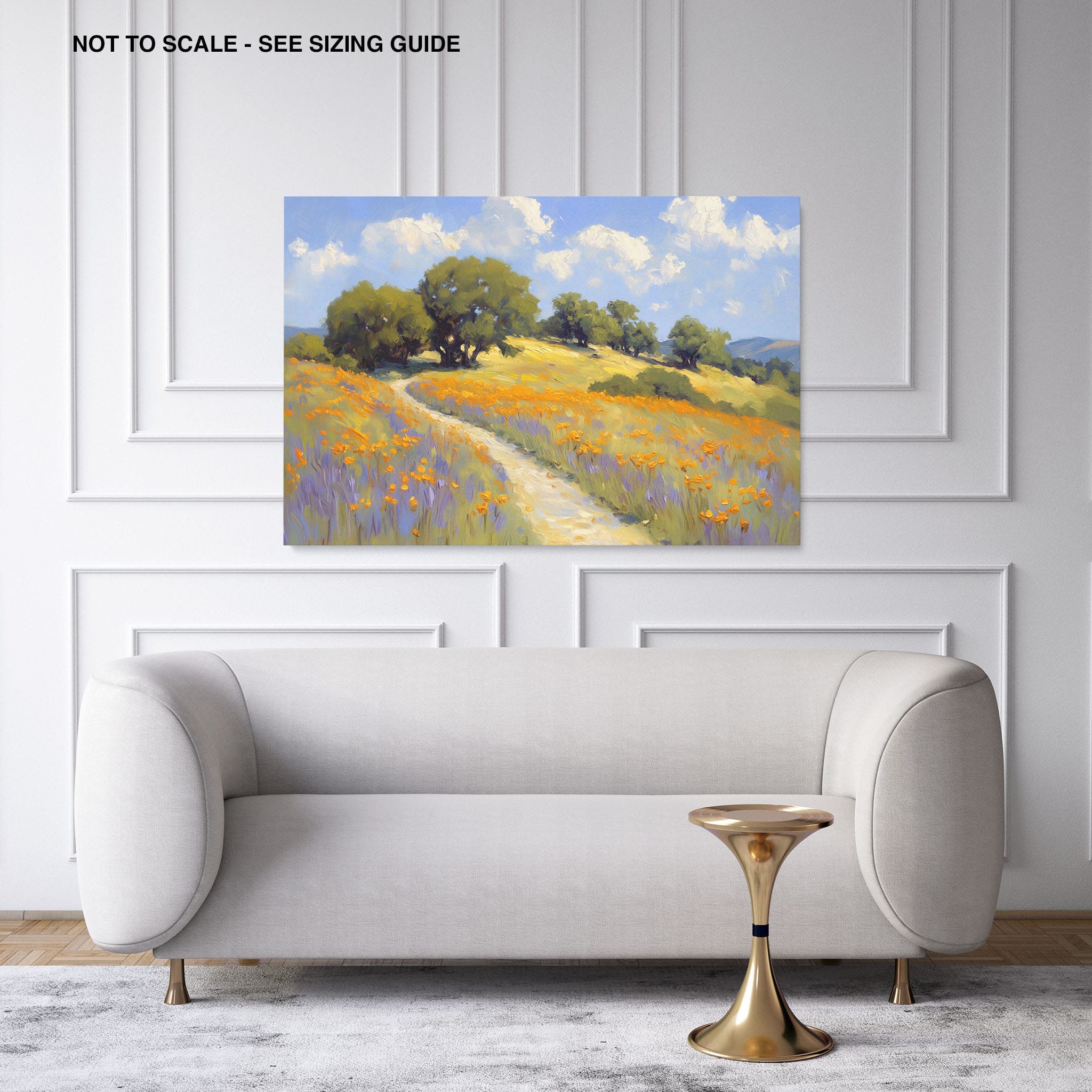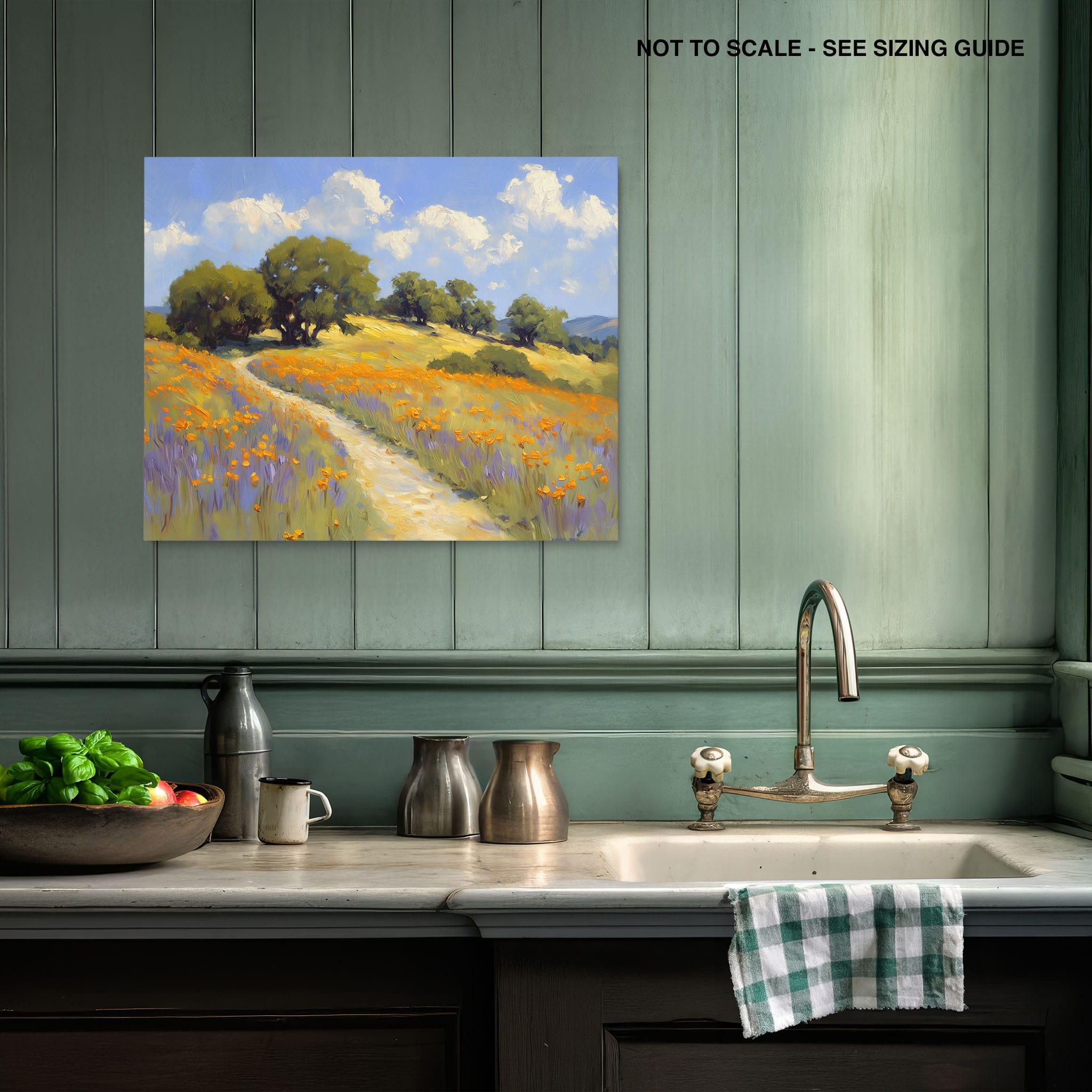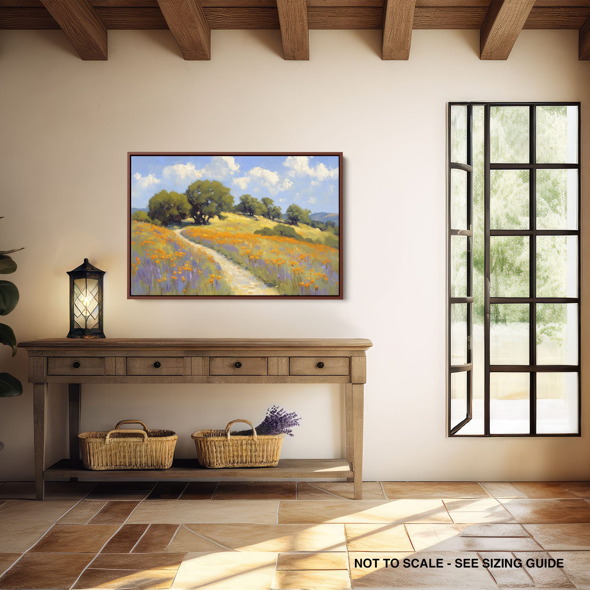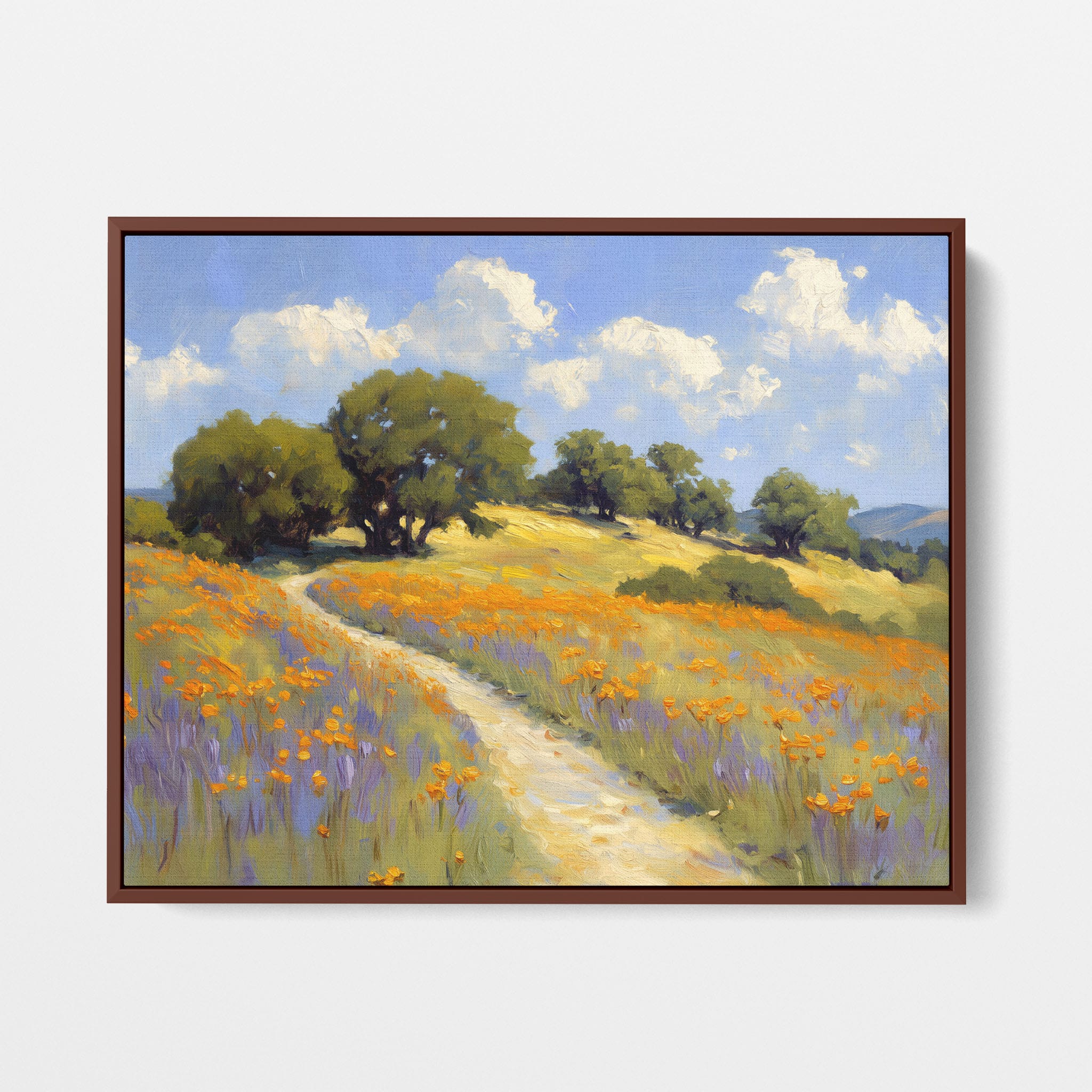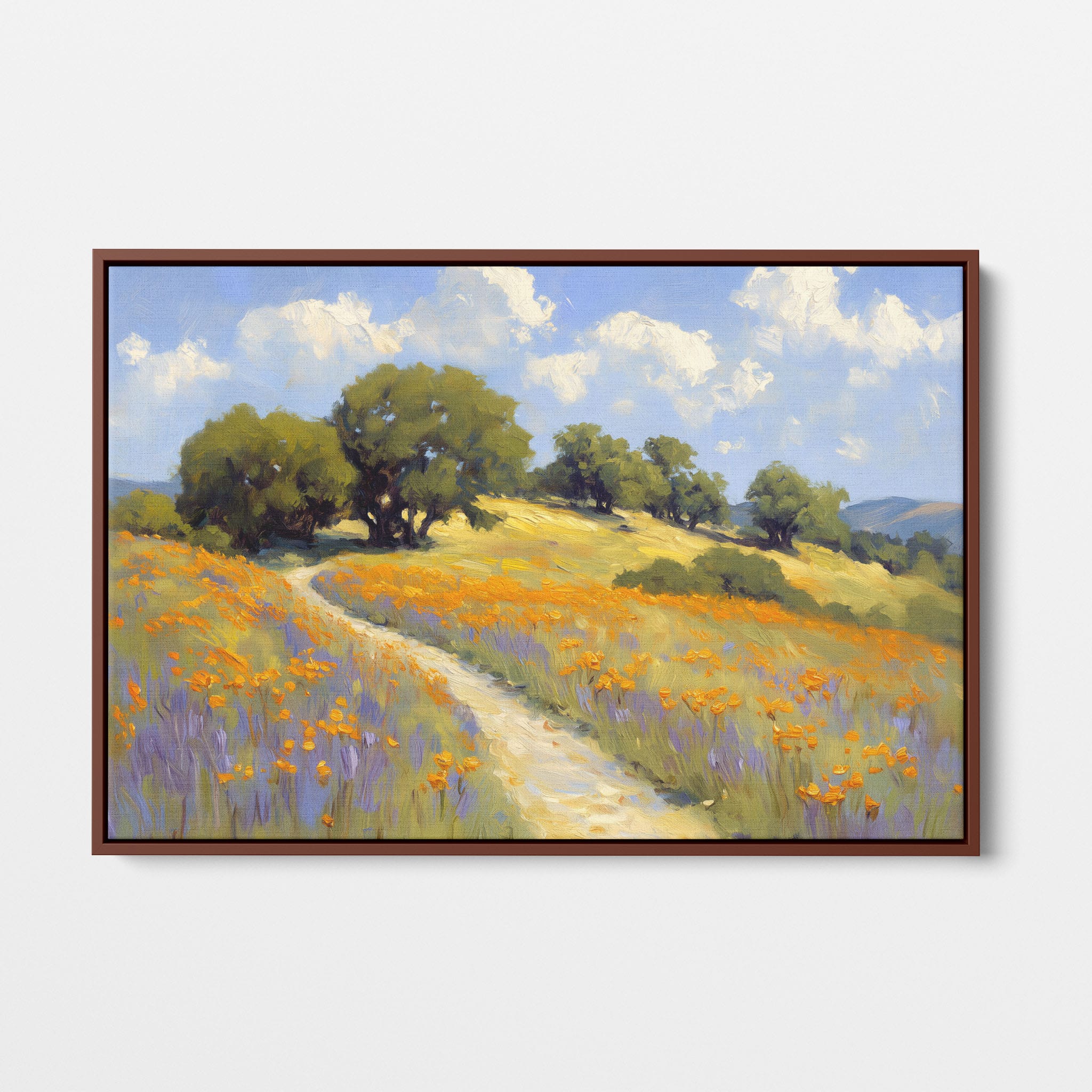 This painting captures the serene beauty of a sunlit meadow, adorned with vibrant orange and purple wildflowers, fluttering under a clear summer sky. The skilled brushwork enhances the lush greenery of the ancient trees casting dappled shadows over the winding path. Perfect for lovers of nature and tranquil landscapes, this high-quality painting brings a breath of fresh air and a touch of summer warmth into any room. It’s an ideal choice for anyone looking to add a splash of color and the innate charm of the great outdoors to their home décor.