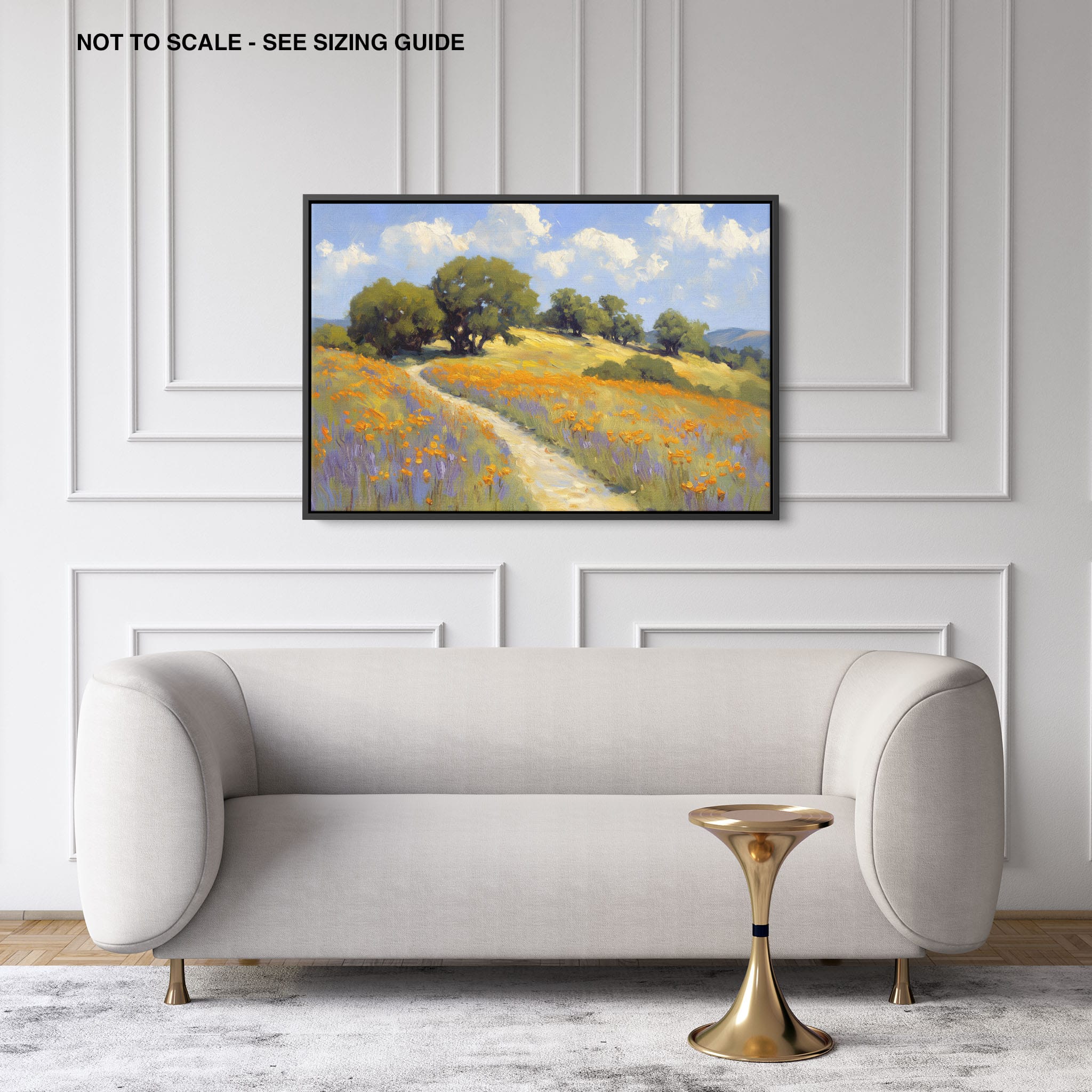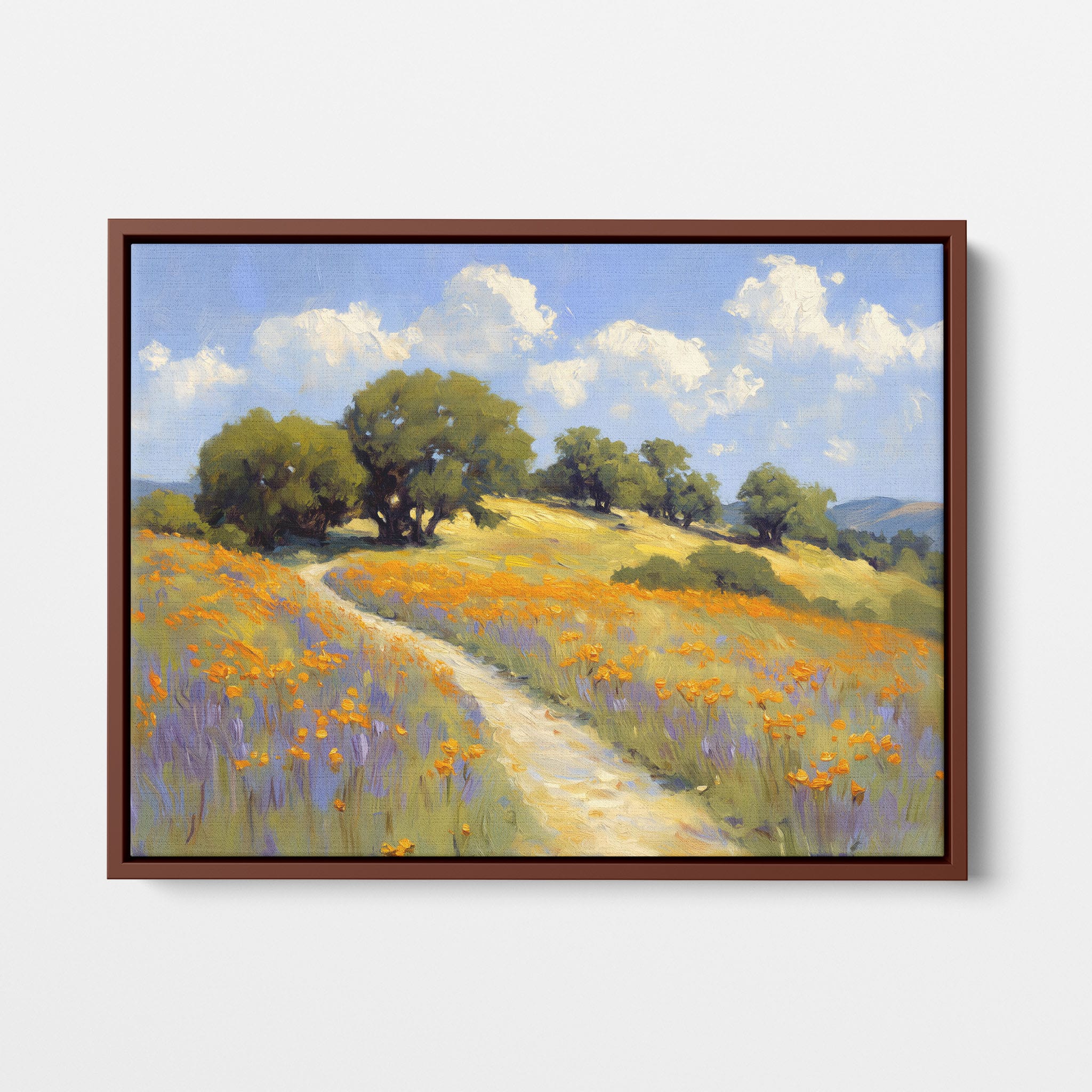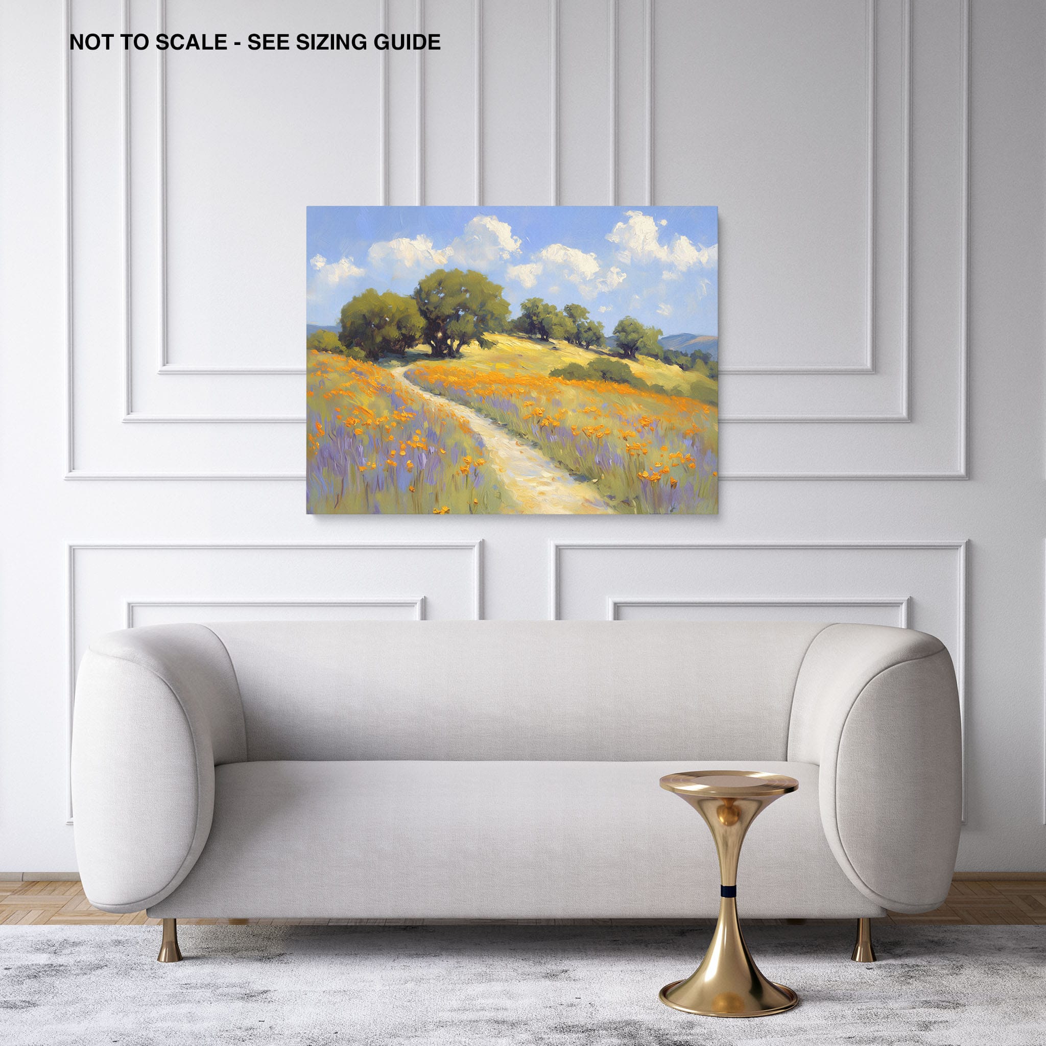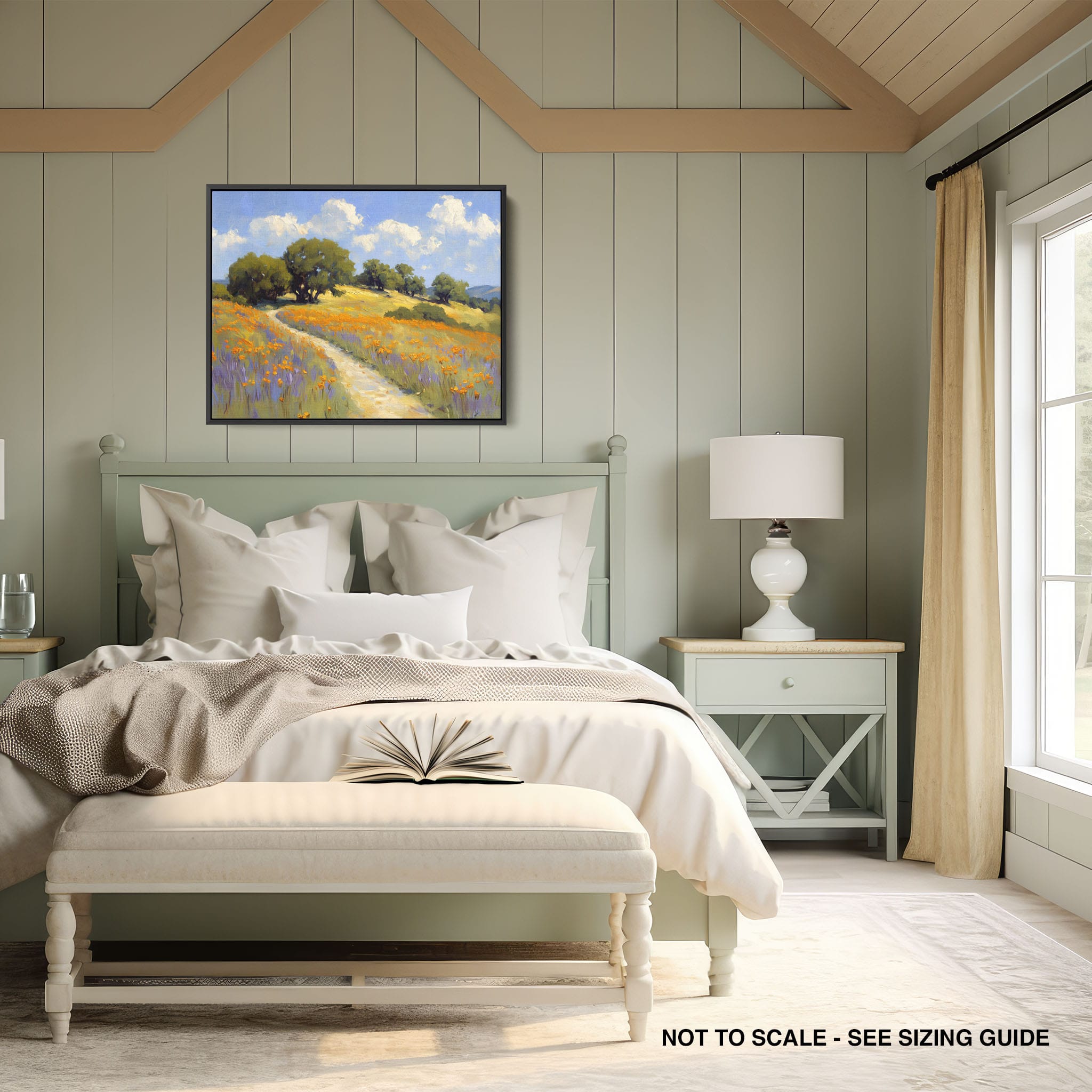 This painting captures the serene beauty of a sunlit meadow, adorned with vibrant orange and purple wildflowers, fluttering under a clear summer sky. The skilled brushwork enhances the lush greenery of the ancient trees casting dappled shadows over the winding path. Perfect for lovers of nature and tranquil landscapes, this high-quality painting brings a breath of fresh air and a touch of summer warmth into any room. It’s an ideal choice for anyone looking to add a splash of color and the innate charm of the great outdoors to their home décor.