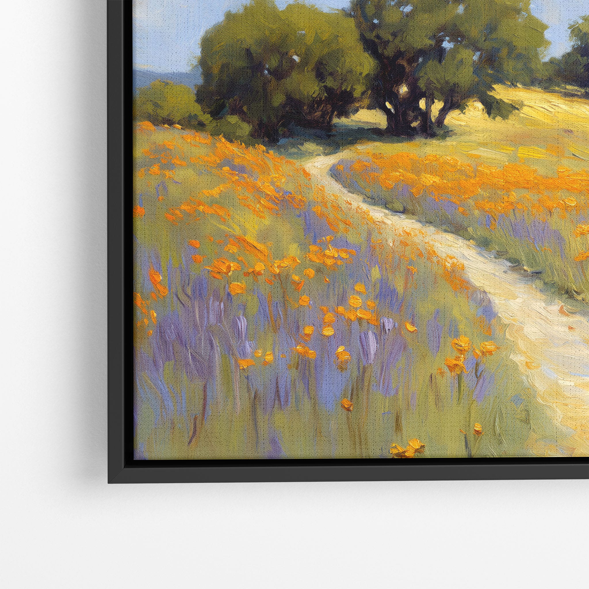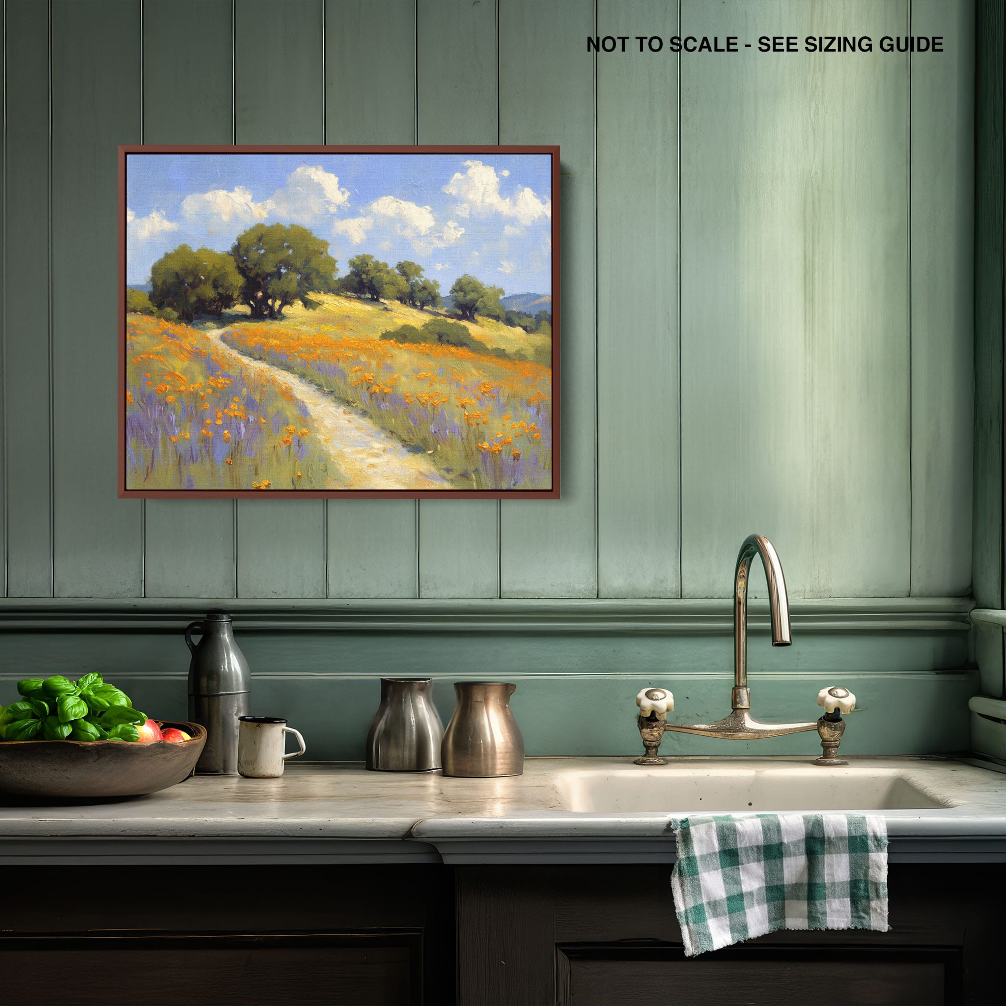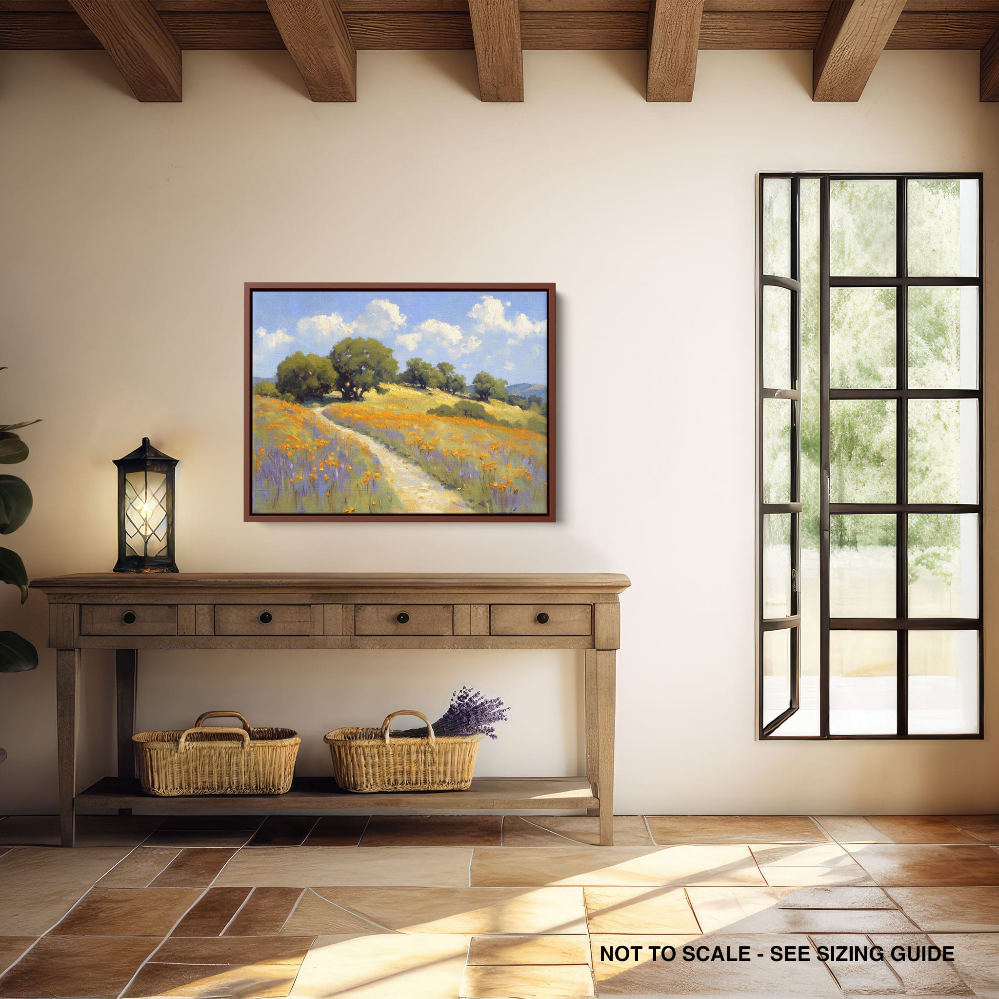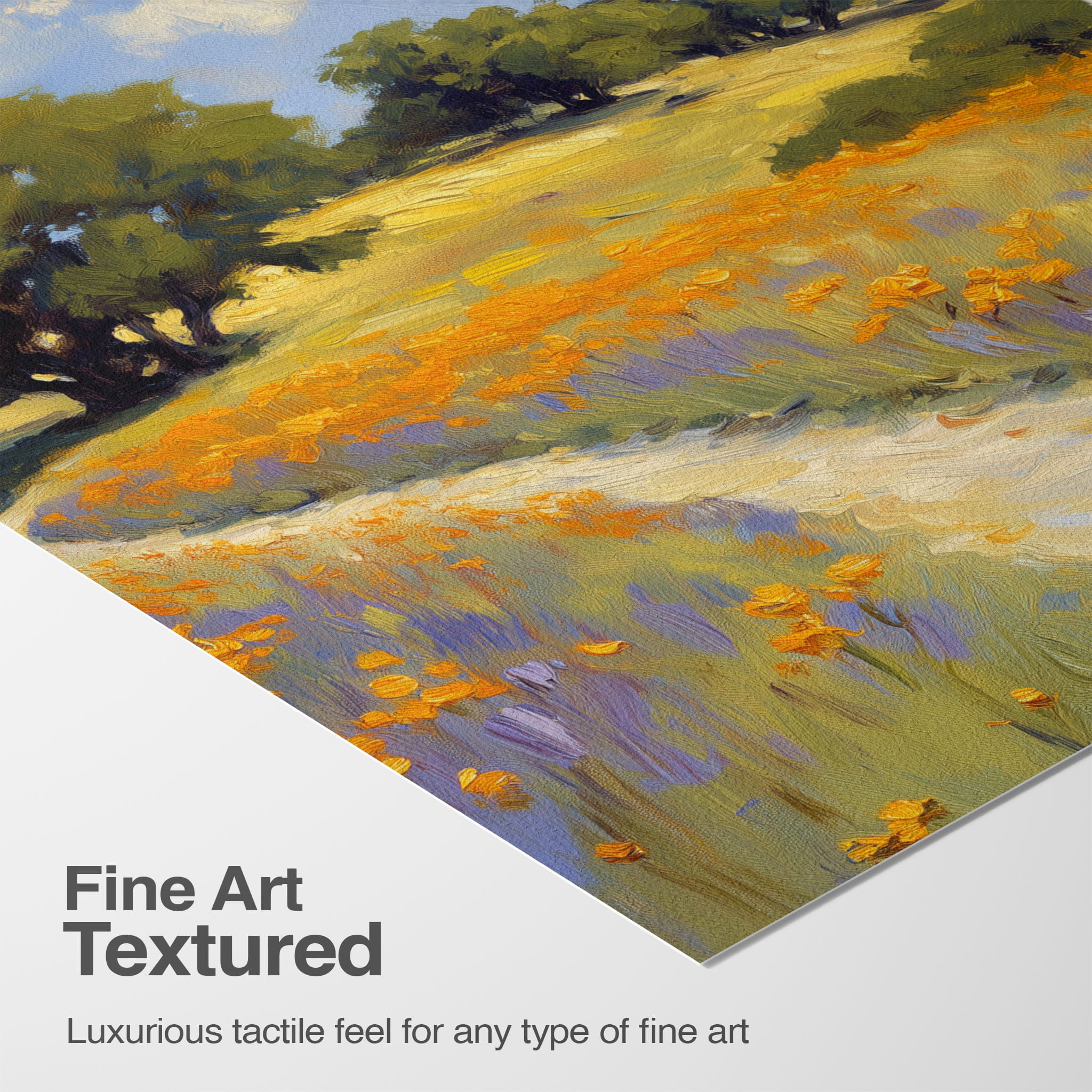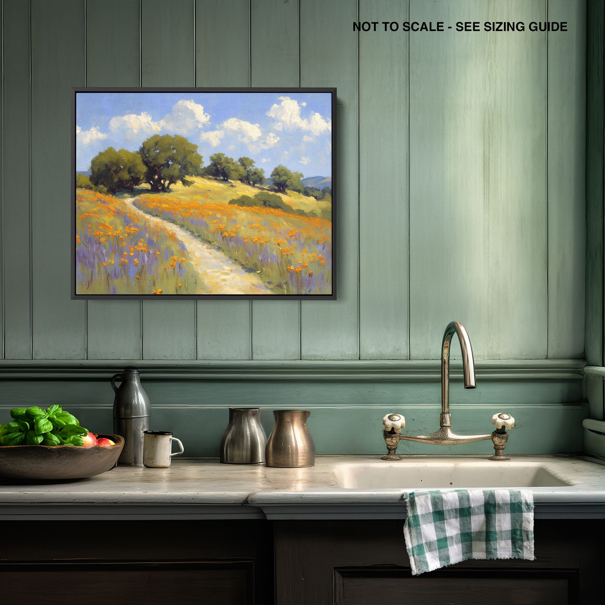 This painting captures the serene beauty of a sunlit meadow, adorned with vibrant orange and purple wildflowers, fluttering under a clear summer sky. The skilled brushwork enhances the lush greenery of the ancient trees casting dappled shadows over the winding path. Perfect for lovers of nature and tranquil landscapes, this high-quality painting brings a breath of fresh air and a touch of summer warmth into any room. It’s an ideal choice for anyone looking to add a splash of color and the innate charm of the great outdoors to their home décor.