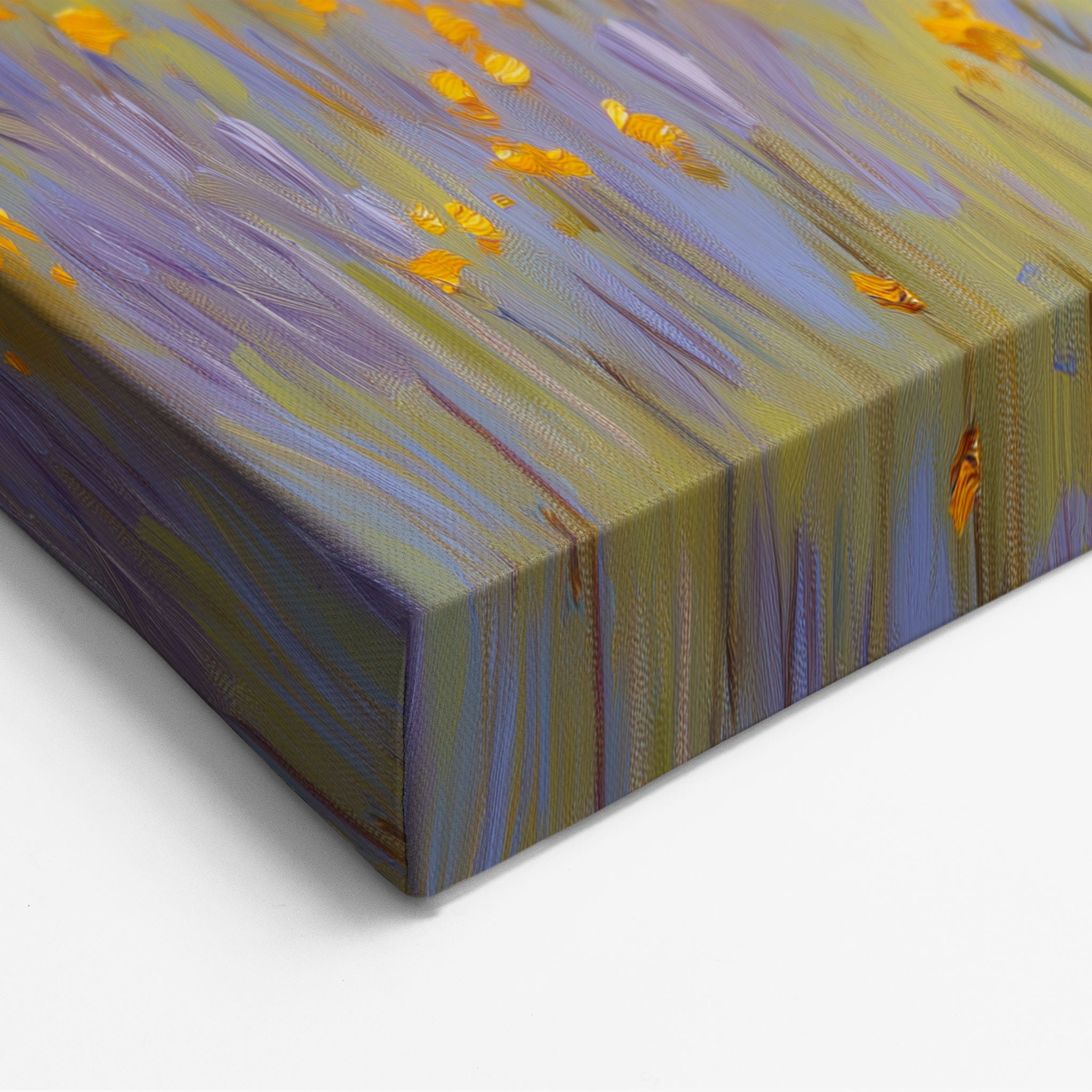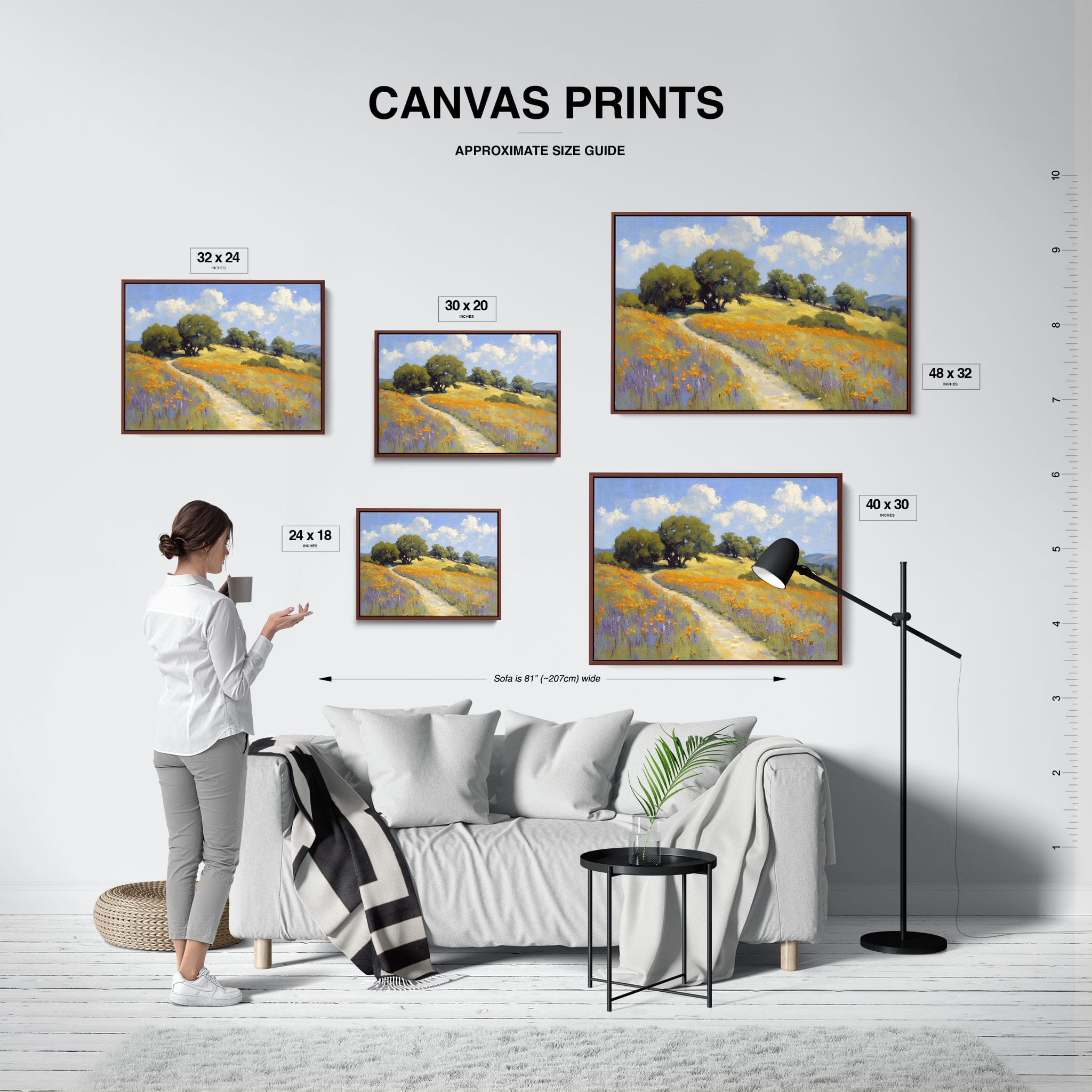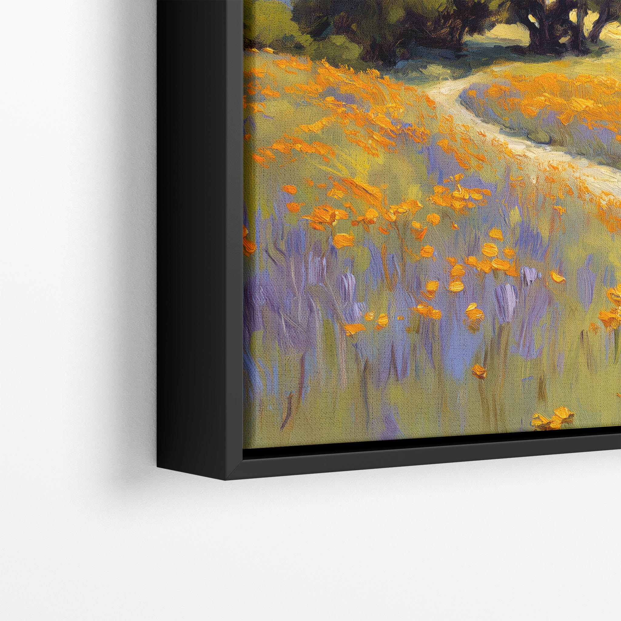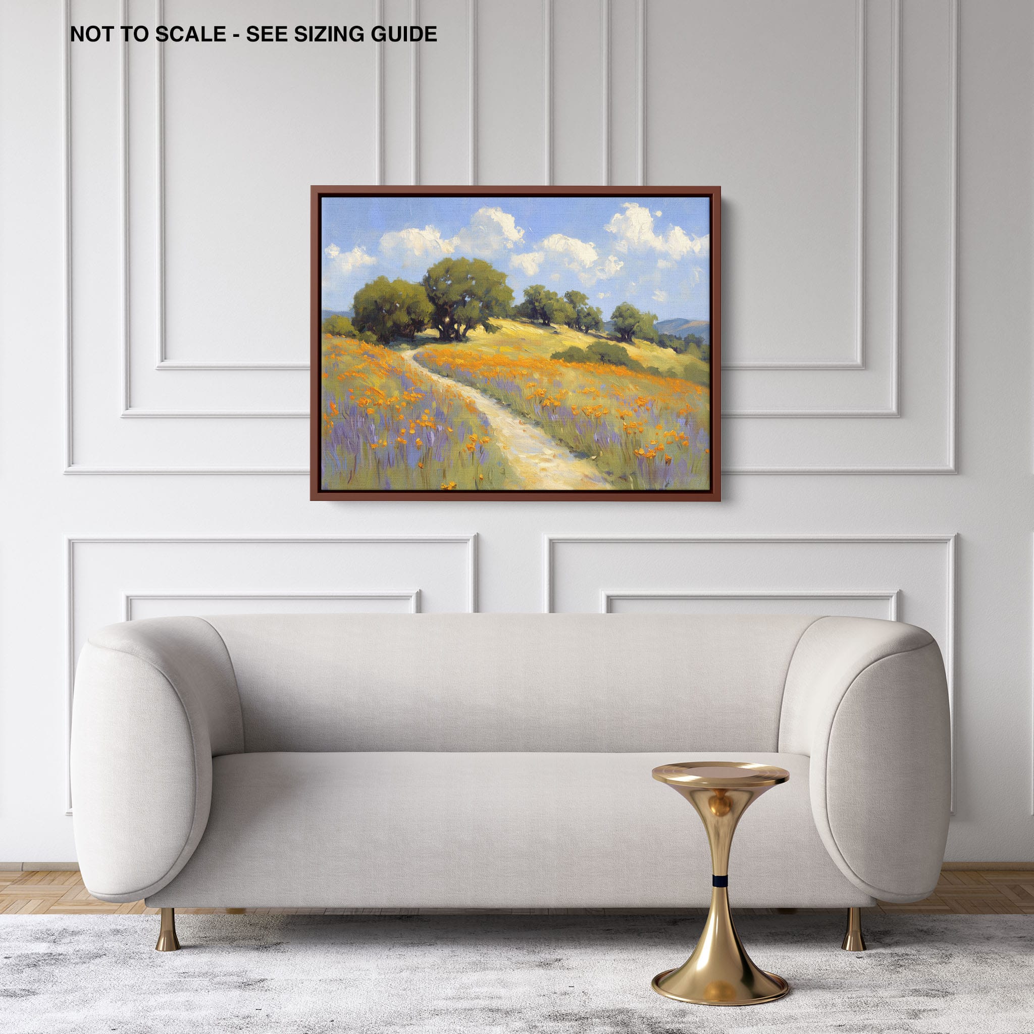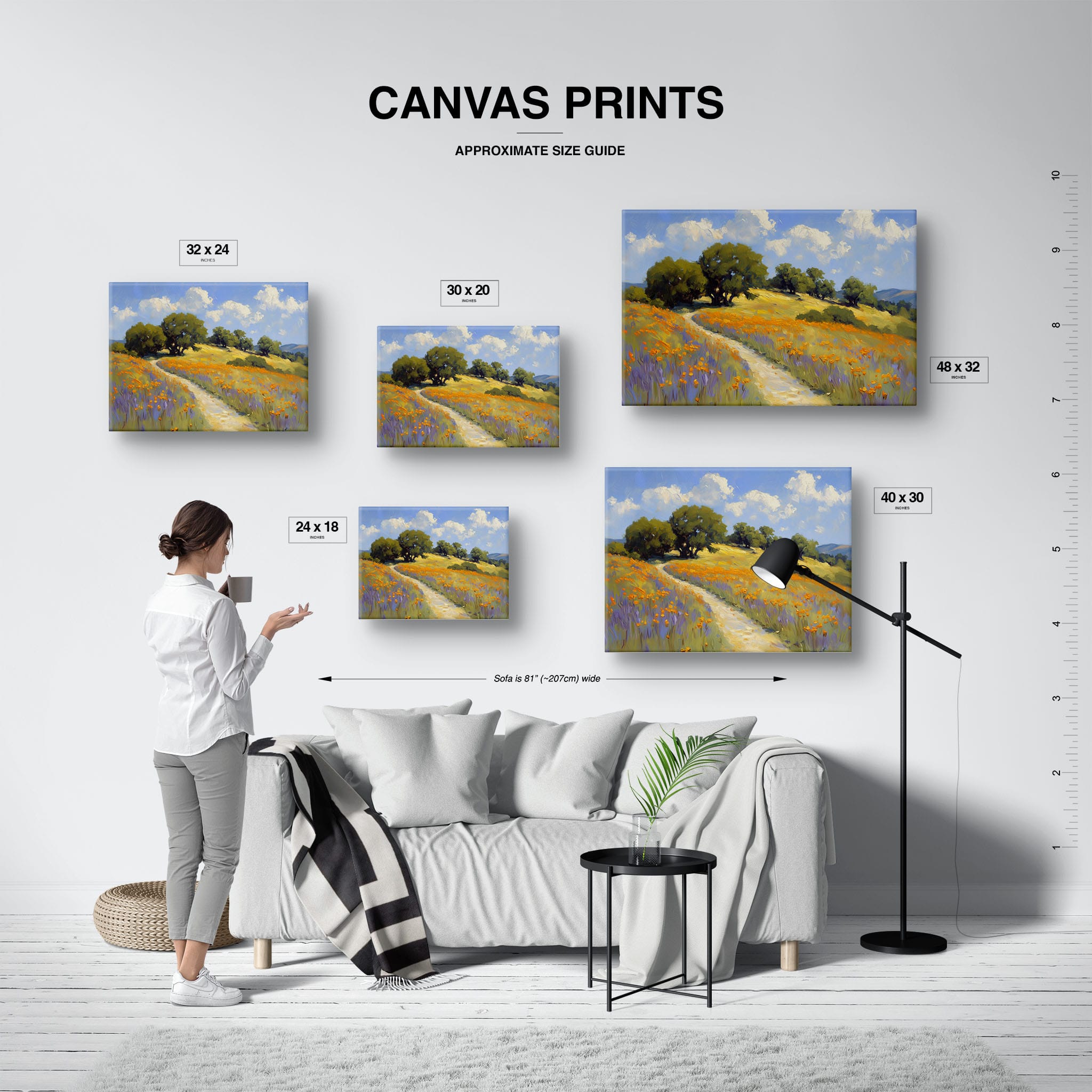 This painting captures the serene beauty of a sunlit meadow, adorned with vibrant orange and purple wildflowers, fluttering under a clear summer sky. The skilled brushwork enhances the lush greenery of the ancient trees casting dappled shadows over the winding path. Perfect for lovers of nature and tranquil landscapes, this high-quality painting brings a breath of fresh air and a touch of summer warmth into any room. It’s an ideal choice for anyone looking to add a splash of color and the innate charm of the great outdoors to their home décor.