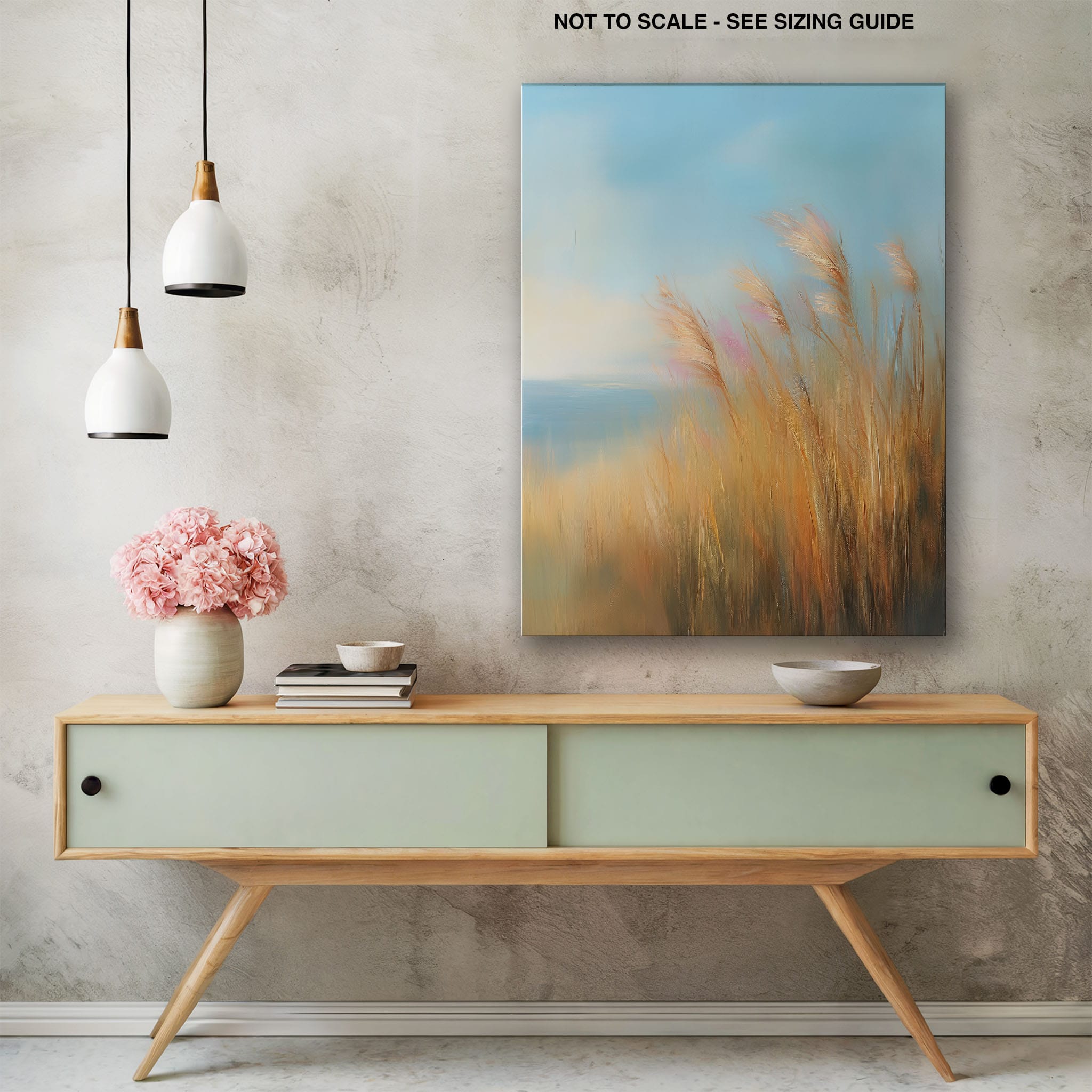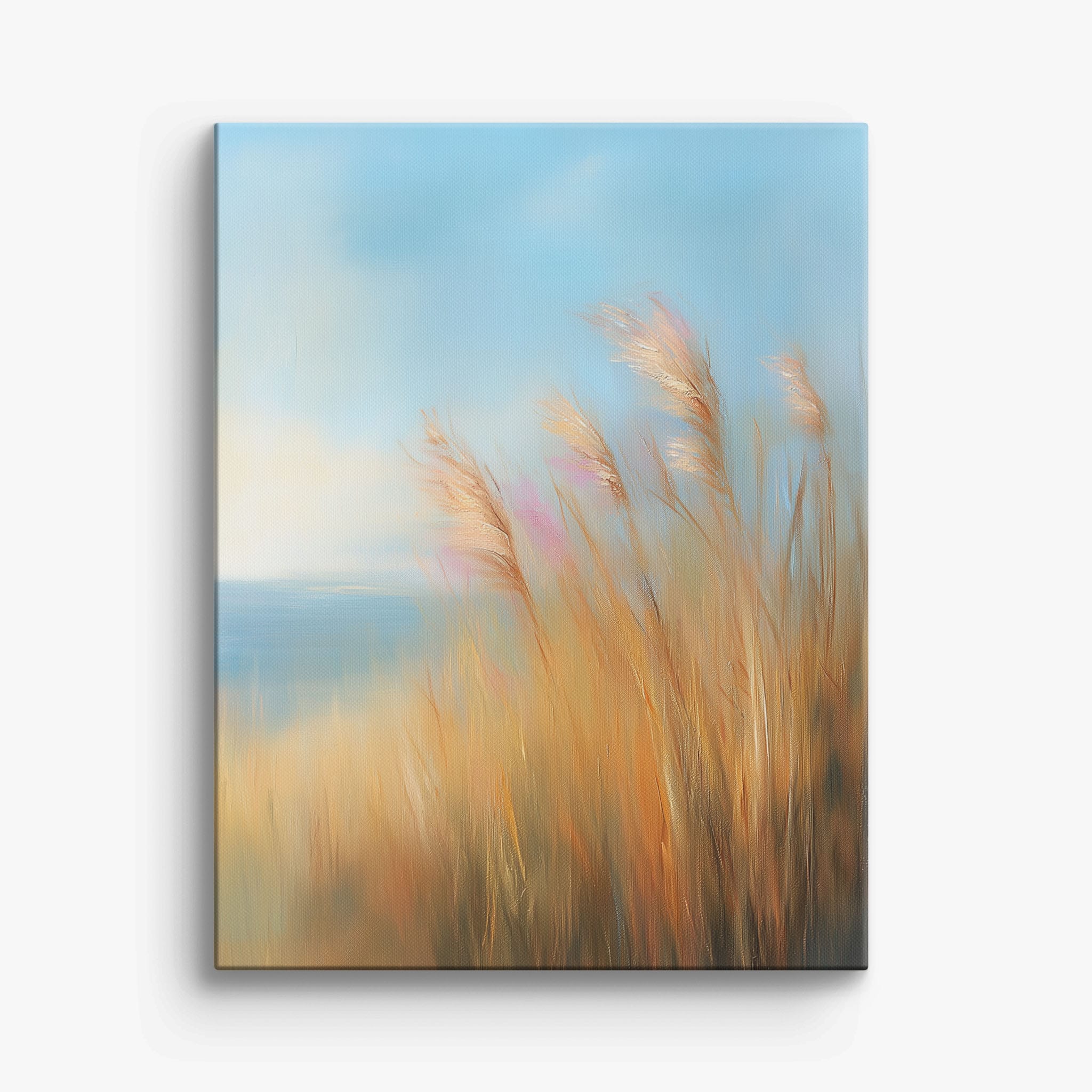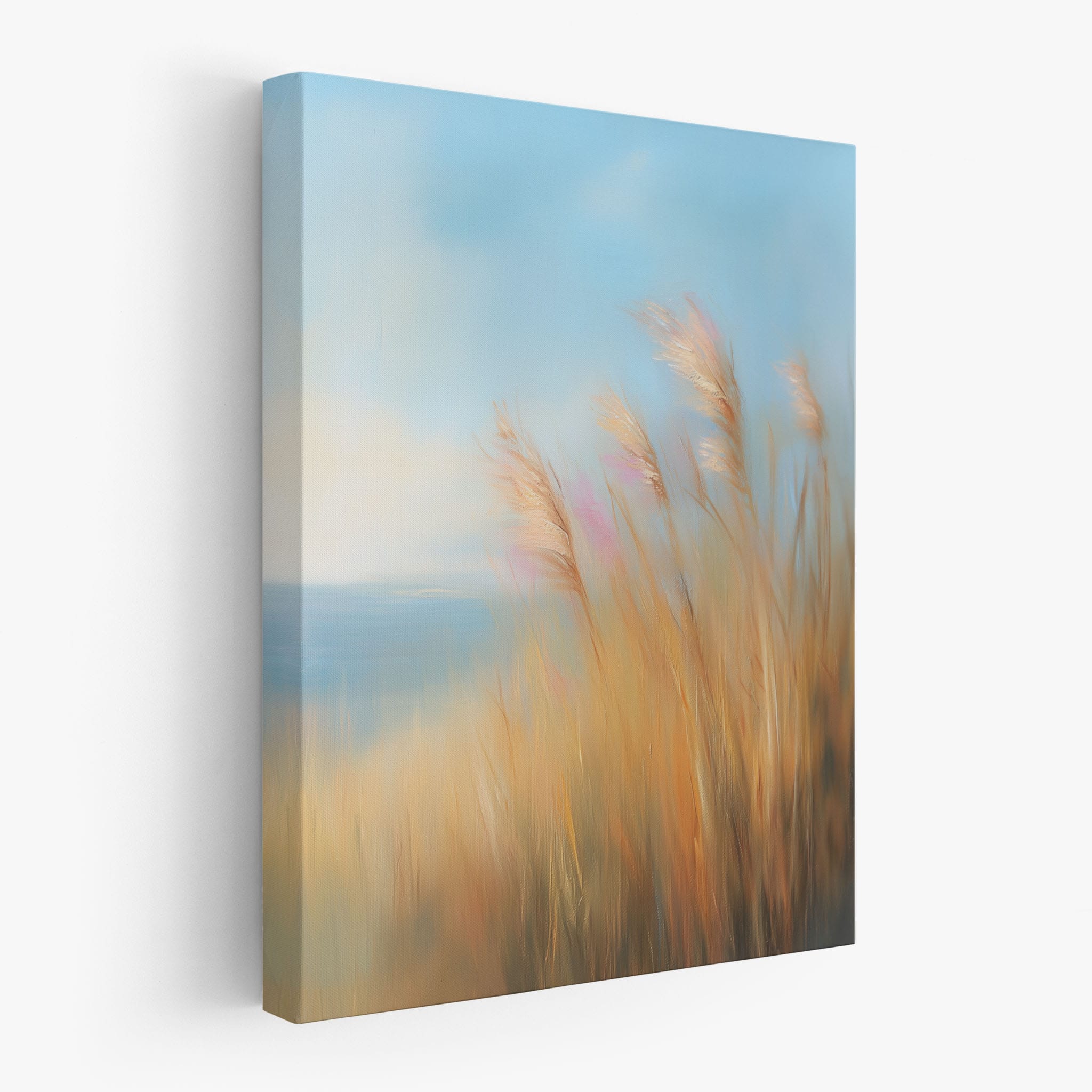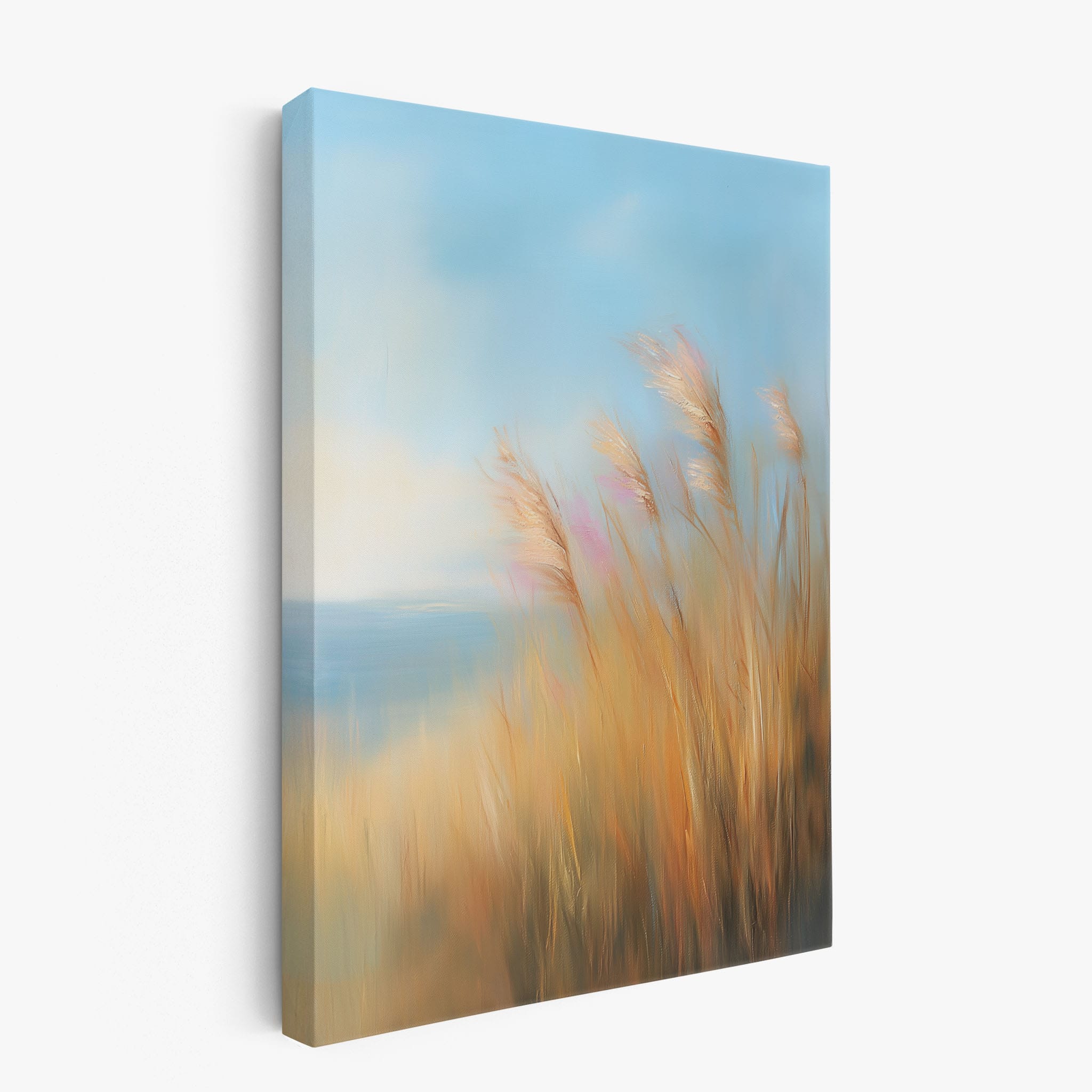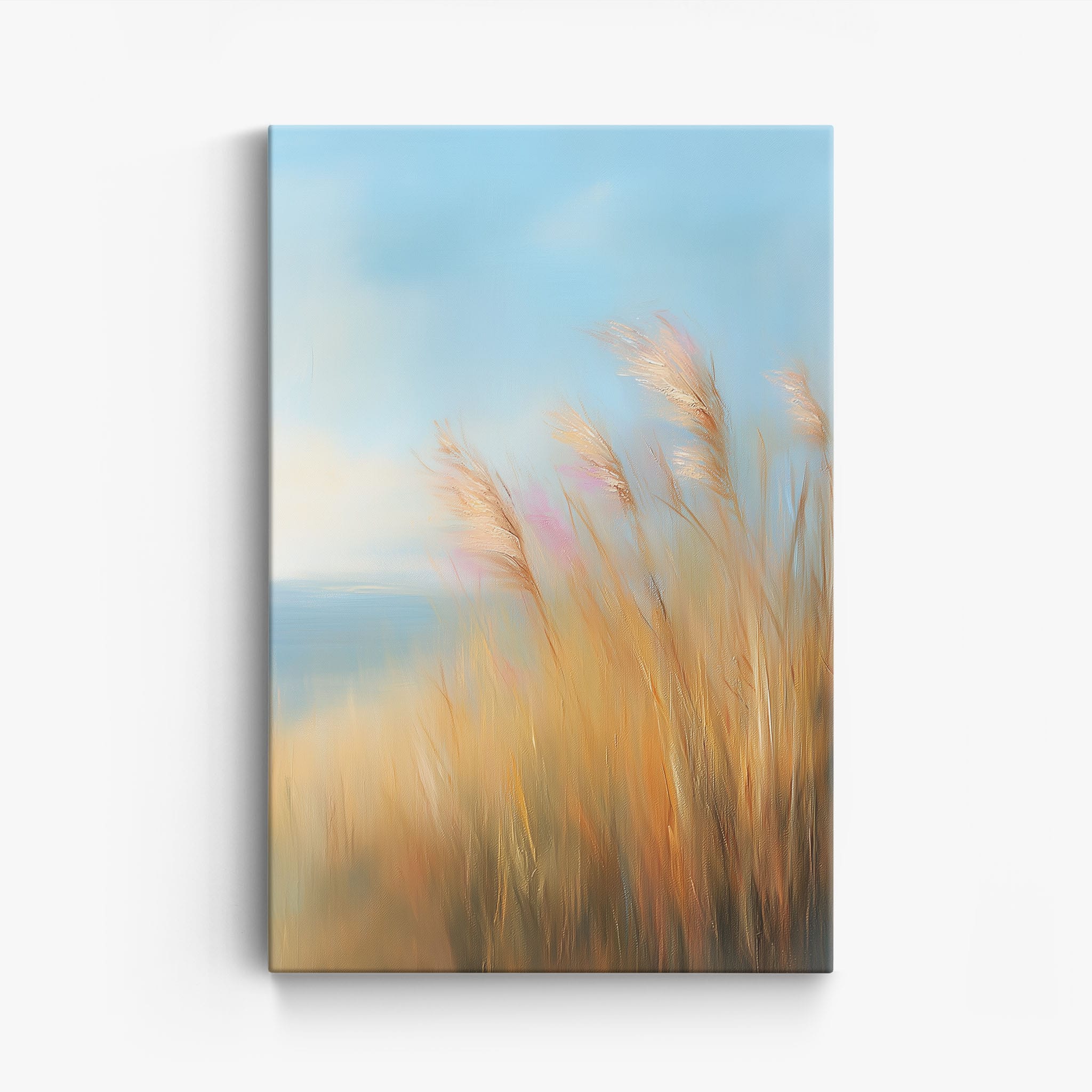 This captivating painting beautifully captures the soft sway of coastal grasses against a serene, hazy backdrop. The harmonious brushstrokes and gentle blend of golden and pastel hues invite a sense of tranquility and subtle movement, reminiscent of a gentle breeze by the sea. Ideal for adding a touch of Impressionistic charm and surreal calmness to any living space or office, this artwork is a sublime choice for those who appreciate nature's understated beauty. Its compelling allure makes it a must-have for any art aficionado looking to elevate their environment with peaceful imagery.