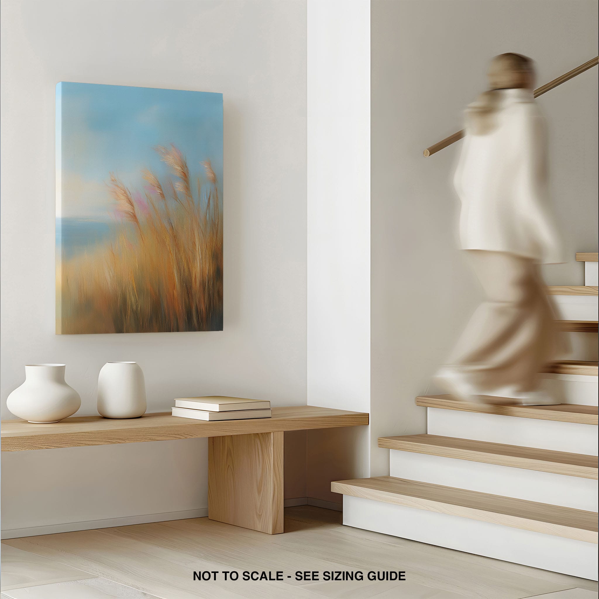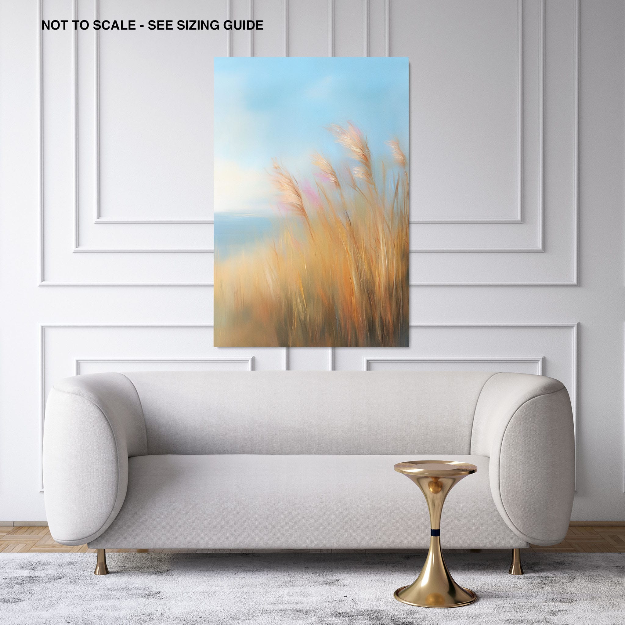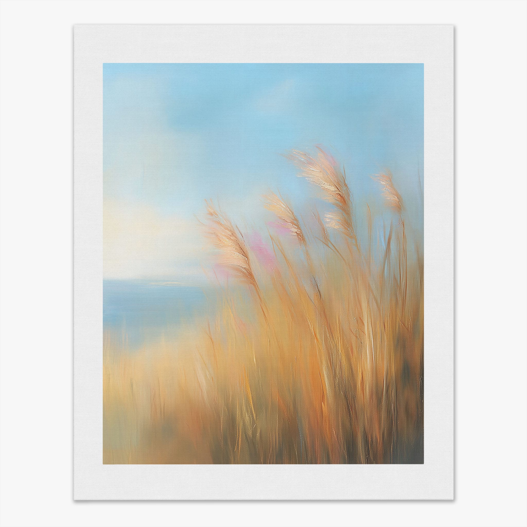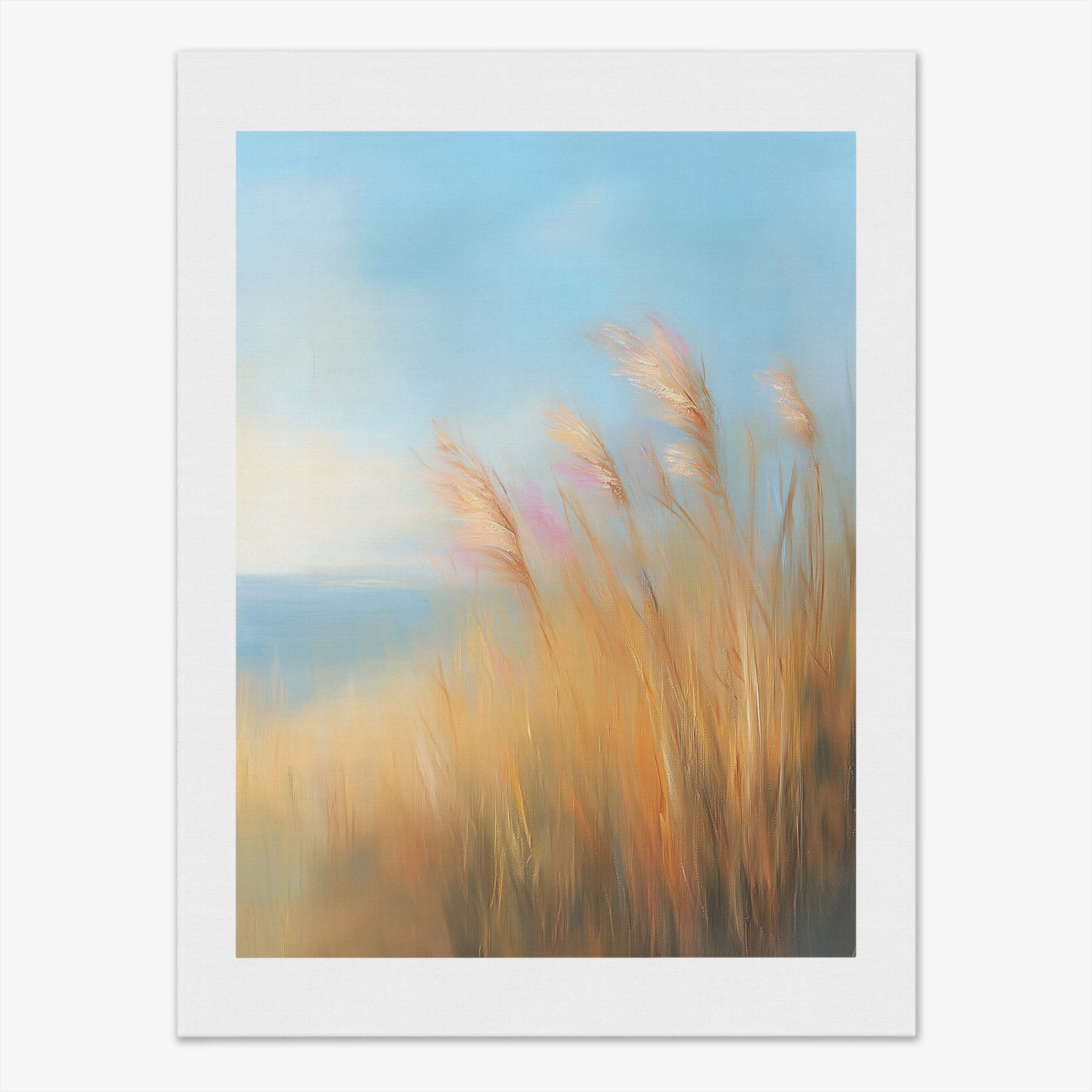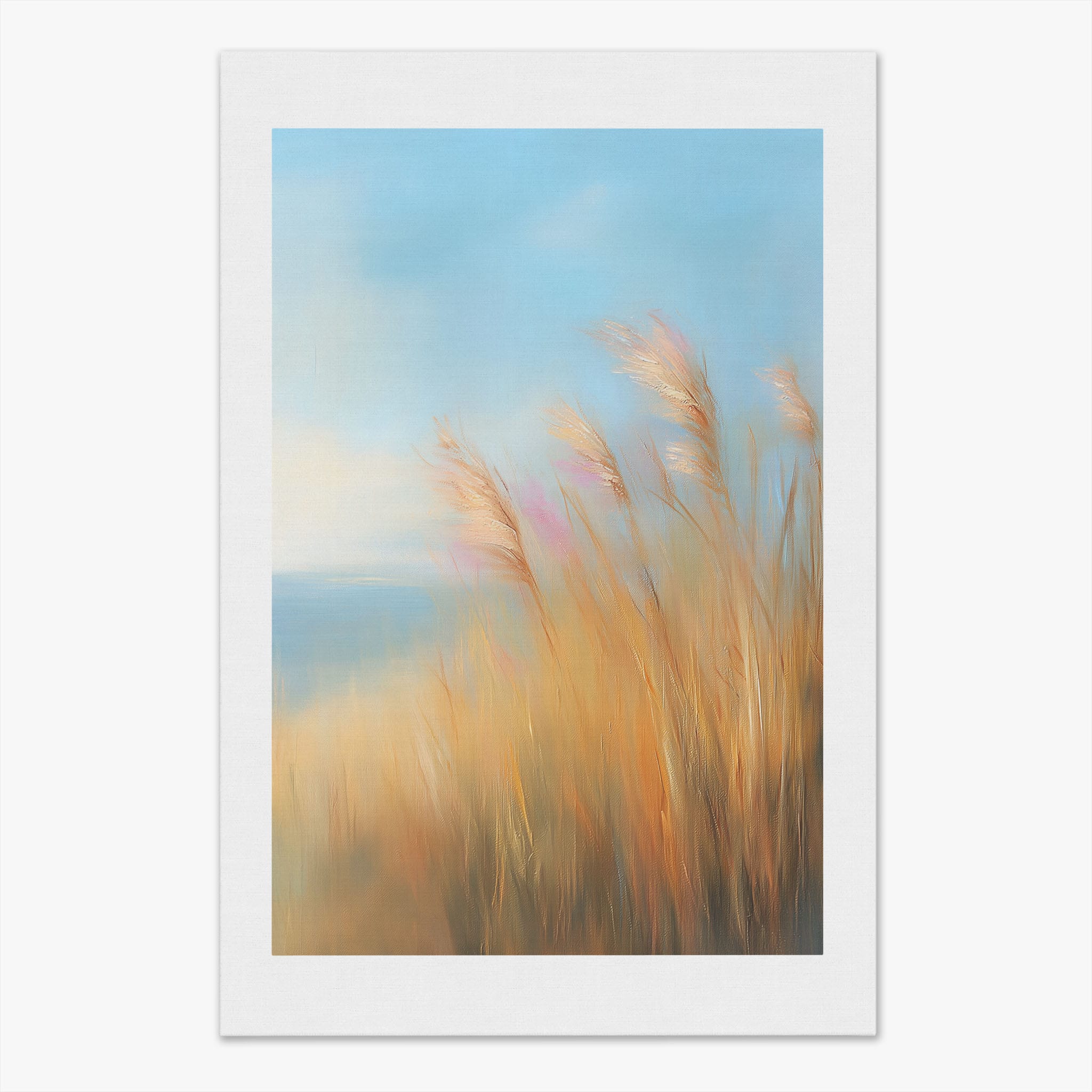 This captivating painting beautifully captures the soft sway of coastal grasses against a serene, hazy backdrop. The harmonious brushstrokes and gentle blend of golden and pastel hues invite a sense of tranquility and subtle movement, reminiscent of a gentle breeze by the sea. Ideal for adding a touch of Impressionistic charm and surreal calmness to any living space or office, this artwork is a sublime choice for those who appreciate nature's understated beauty. Its compelling allure makes it a must-have for any art aficionado looking to elevate their environment with peaceful imagery.