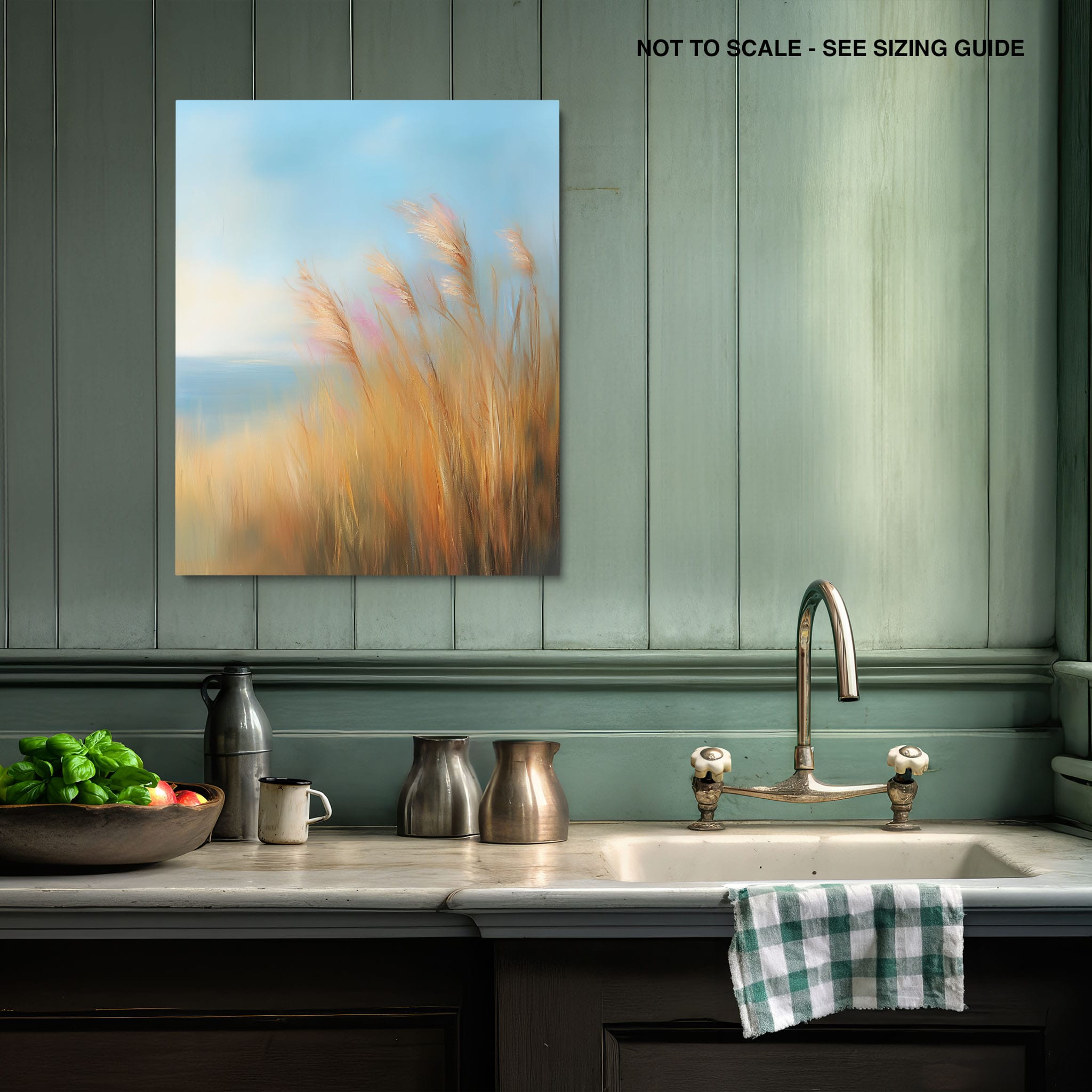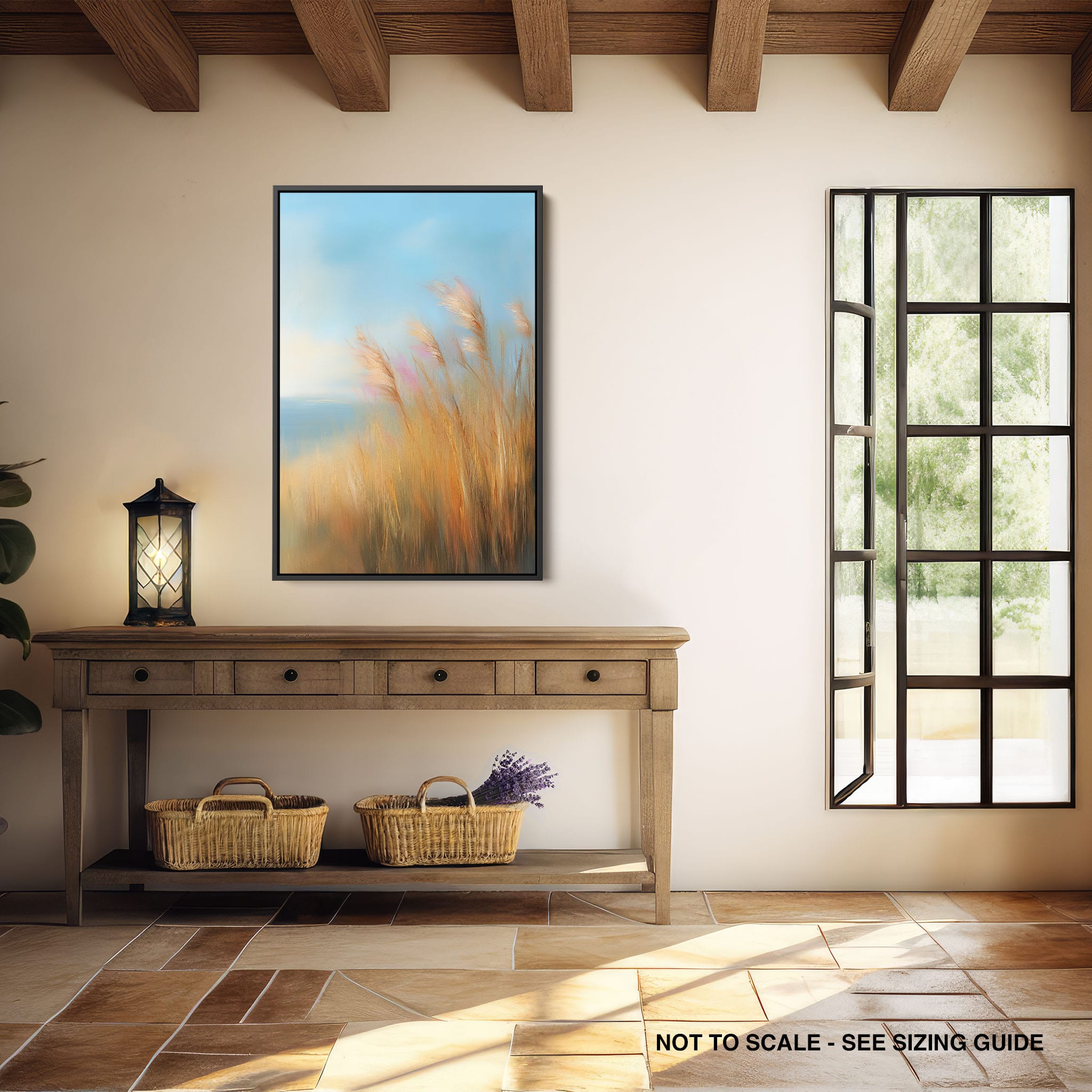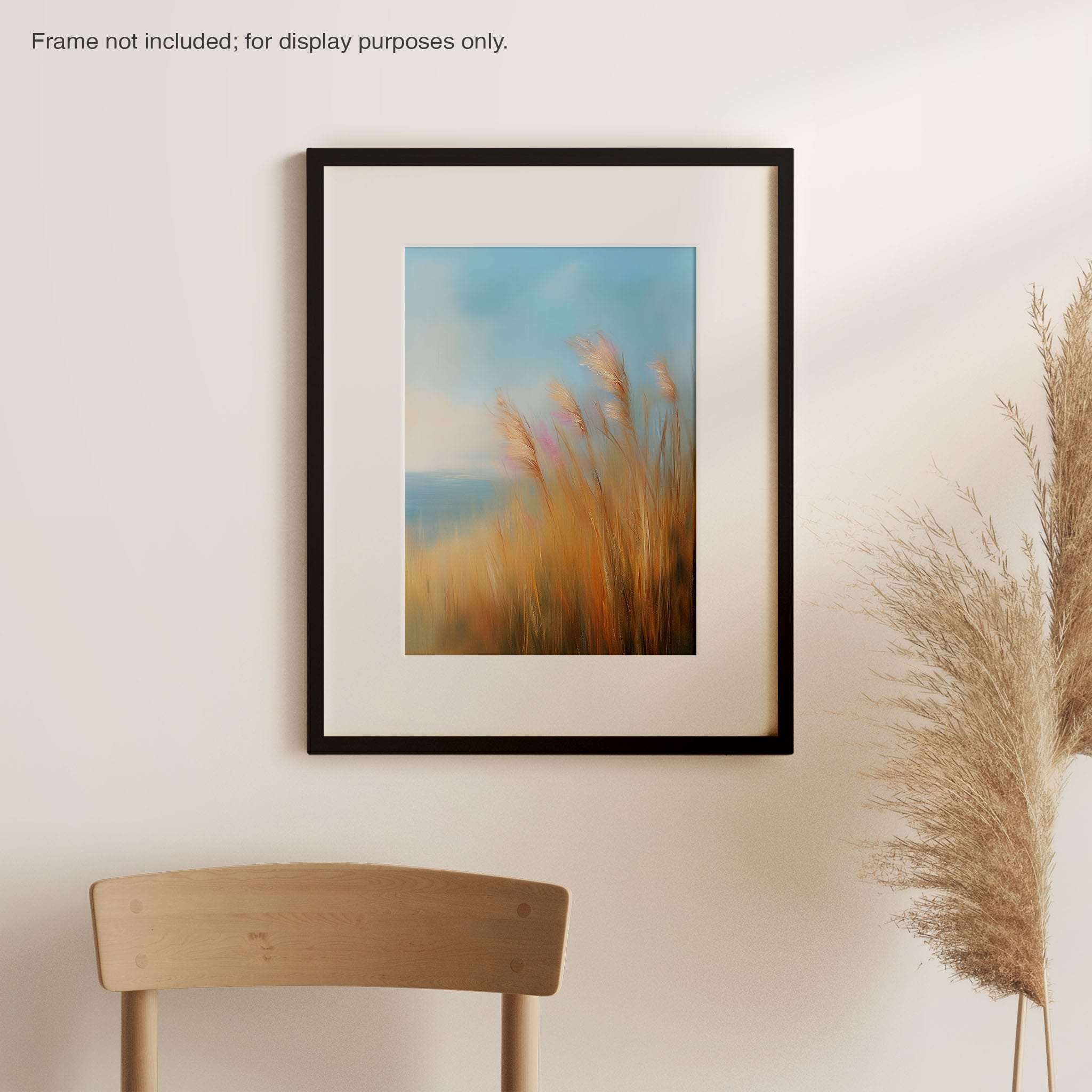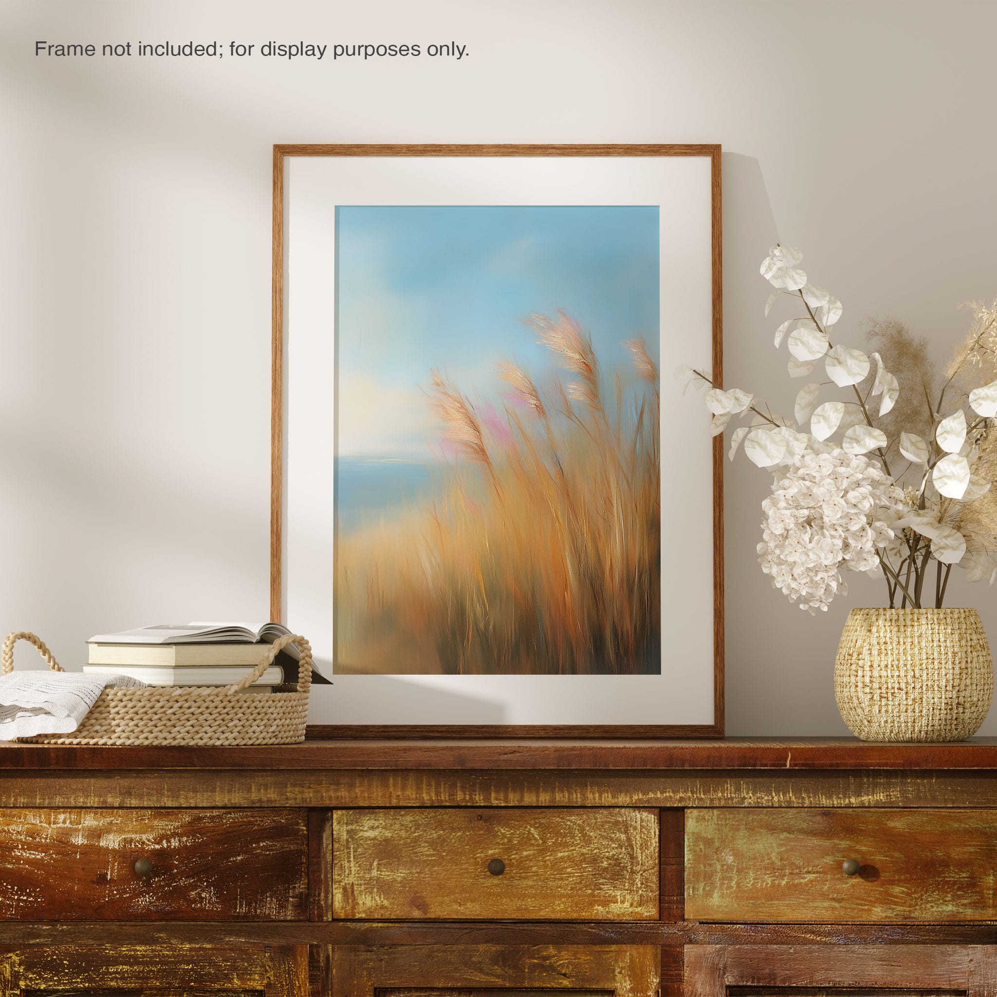 This captivating painting beautifully captures the soft sway of coastal grasses against a serene, hazy backdrop. The harmonious brushstrokes and gentle blend of golden and pastel hues invite a sense of tranquility and subtle movement, reminiscent of a gentle breeze by the sea. Ideal for adding a touch of Impressionistic charm and surreal calmness to any living space or office, this artwork is a sublime choice for those who appreciate nature's understated beauty. Its compelling allure makes it a must-have for any art aficionado looking to elevate their environment with peaceful imagery.