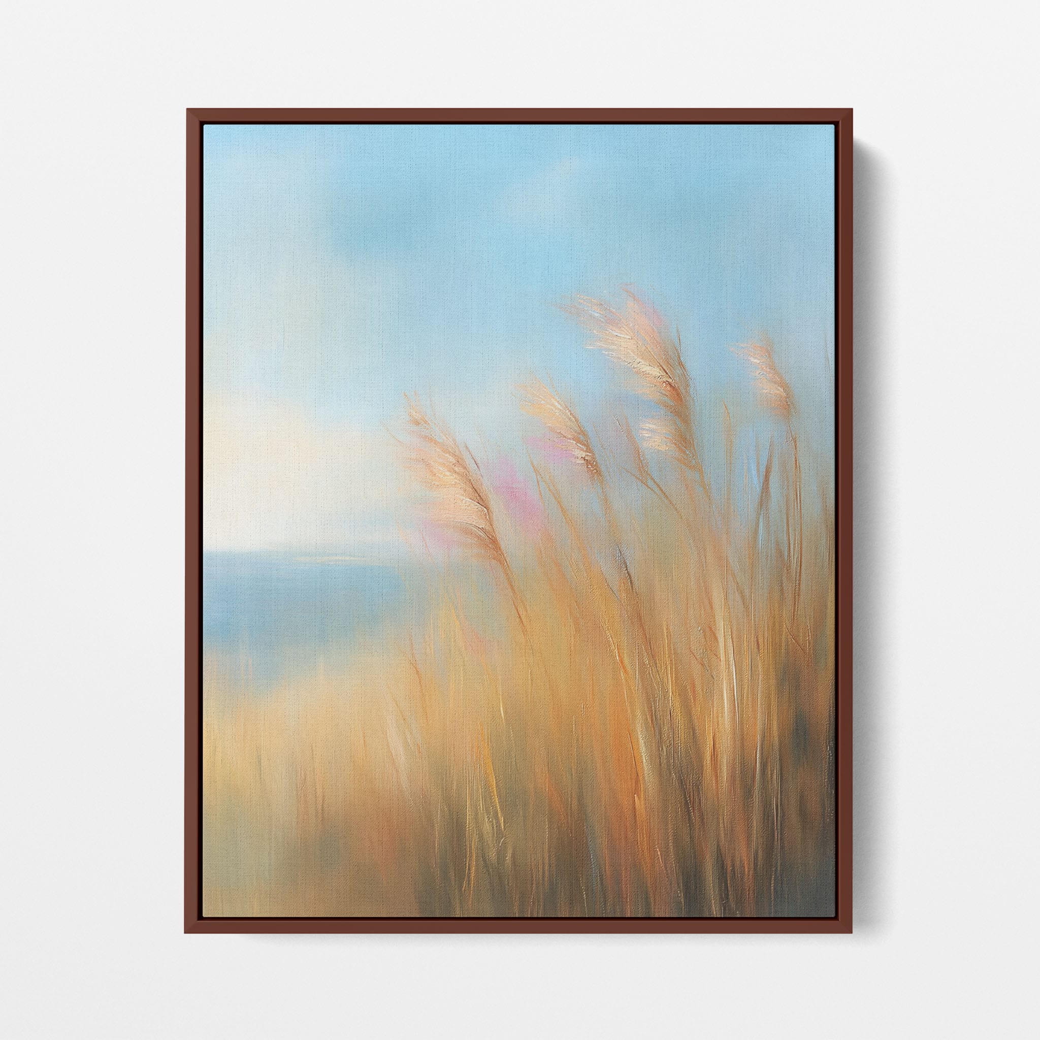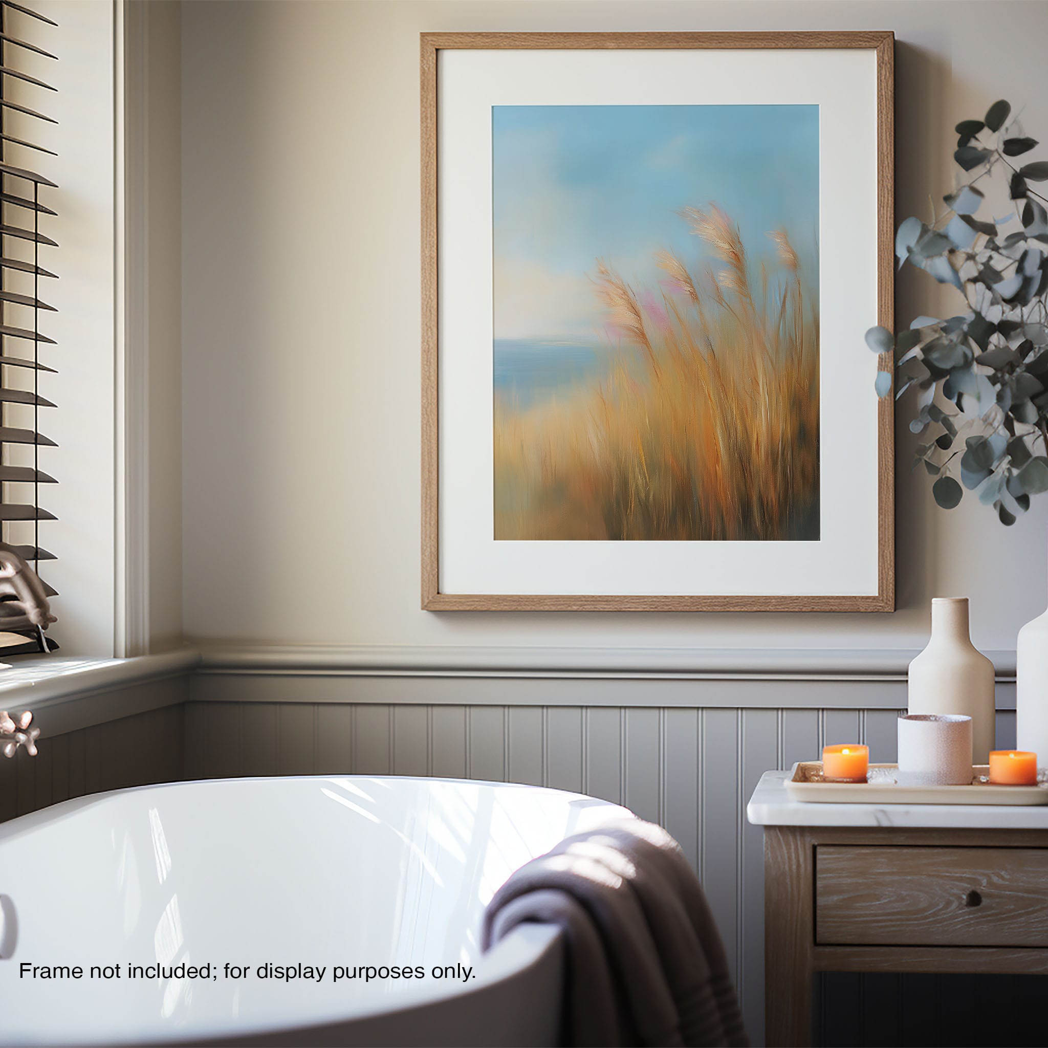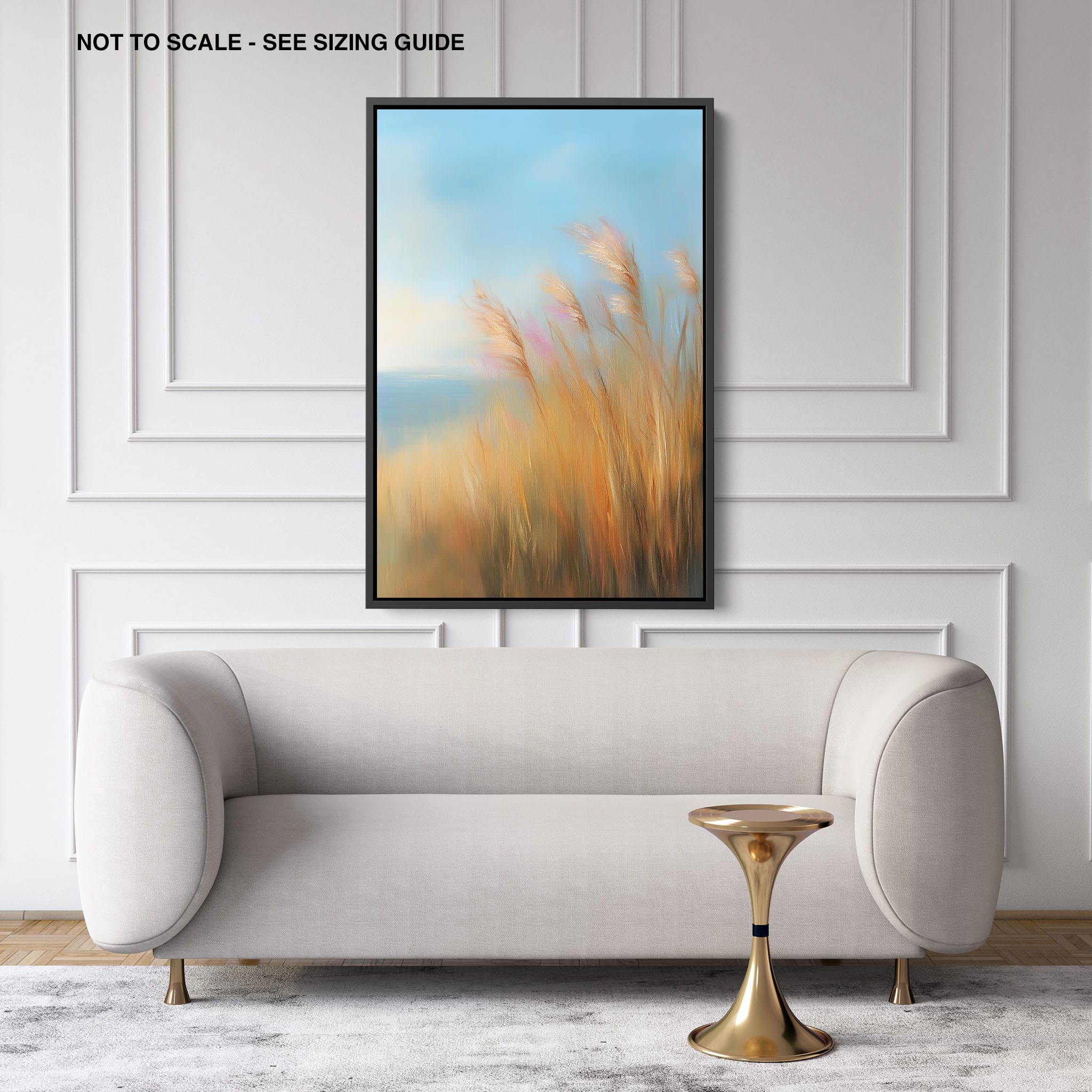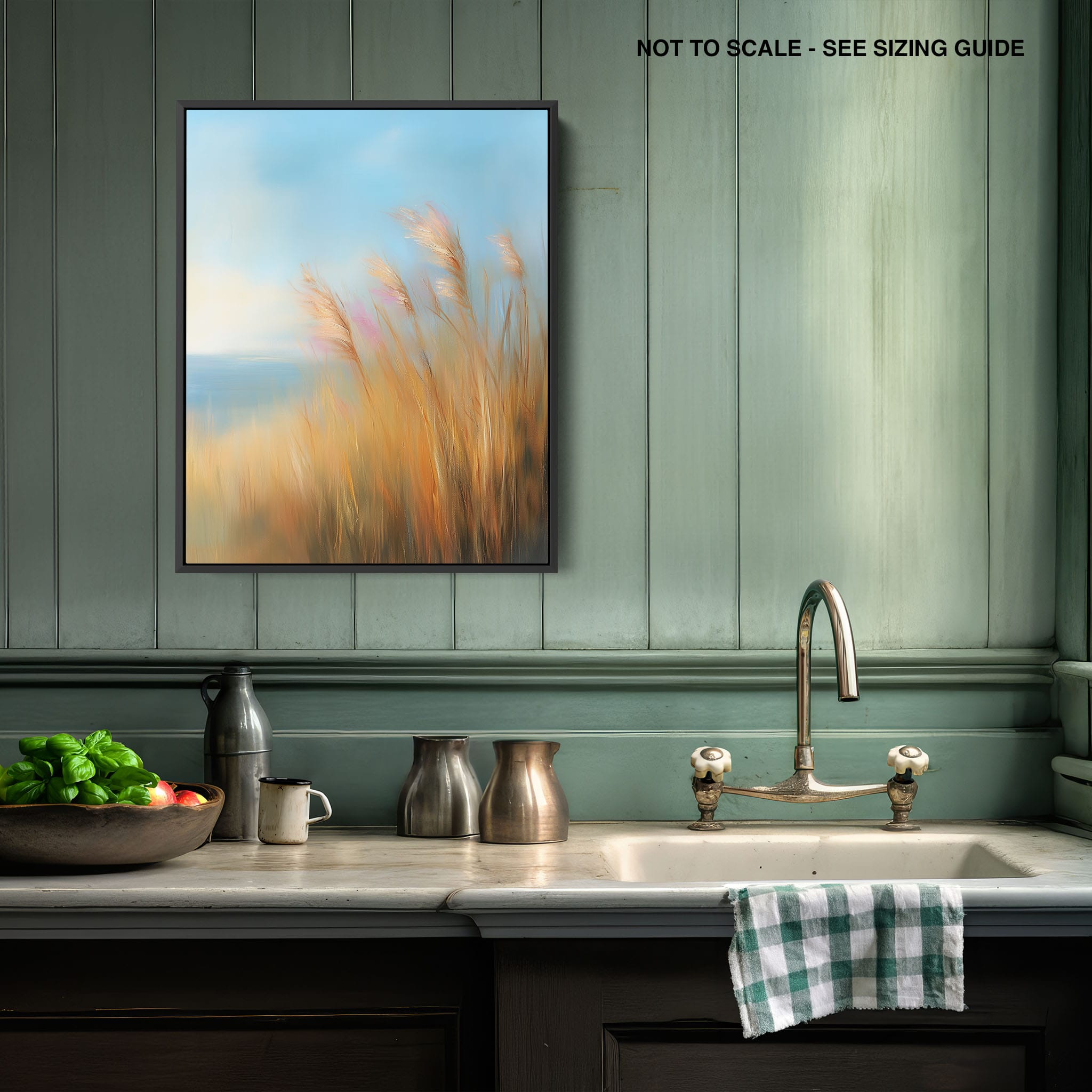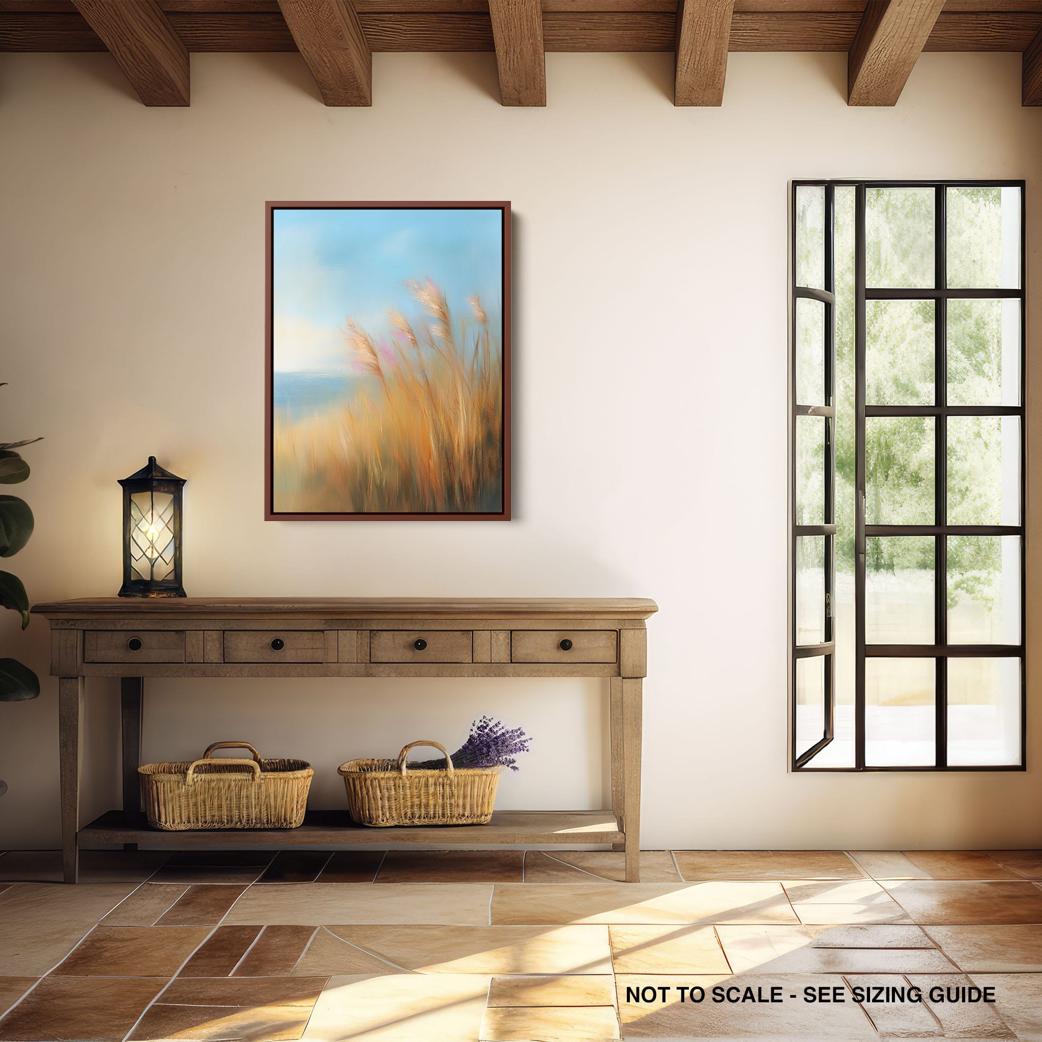 This captivating painting beautifully captures the soft sway of coastal grasses against a serene, hazy backdrop. The harmonious brushstrokes and gentle blend of golden and pastel hues invite a sense of tranquility and subtle movement, reminiscent of a gentle breeze by the sea. Ideal for adding a touch of Impressionistic charm and surreal calmness to any living space or office, this artwork is a sublime choice for those who appreciate nature's understated beauty. Its compelling allure makes it a must-have for any art aficionado looking to elevate their environment with peaceful imagery.