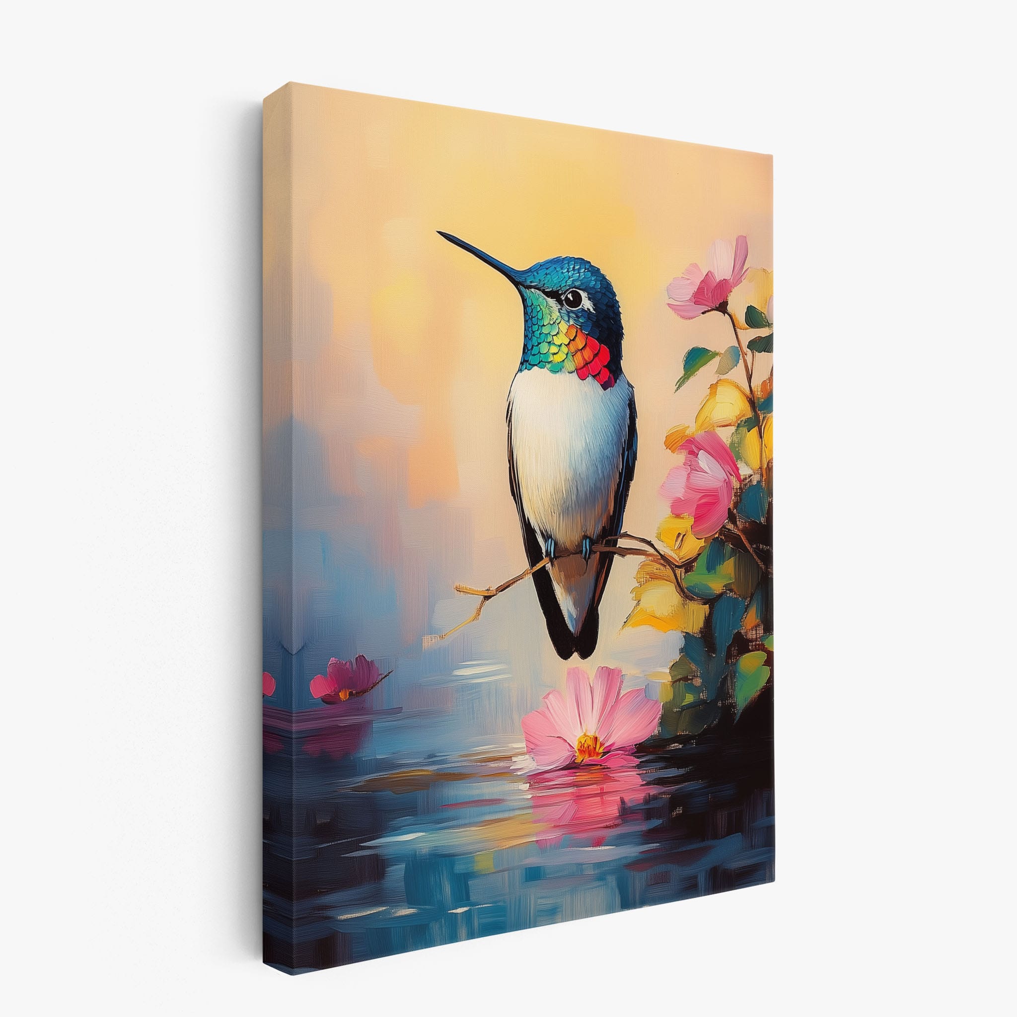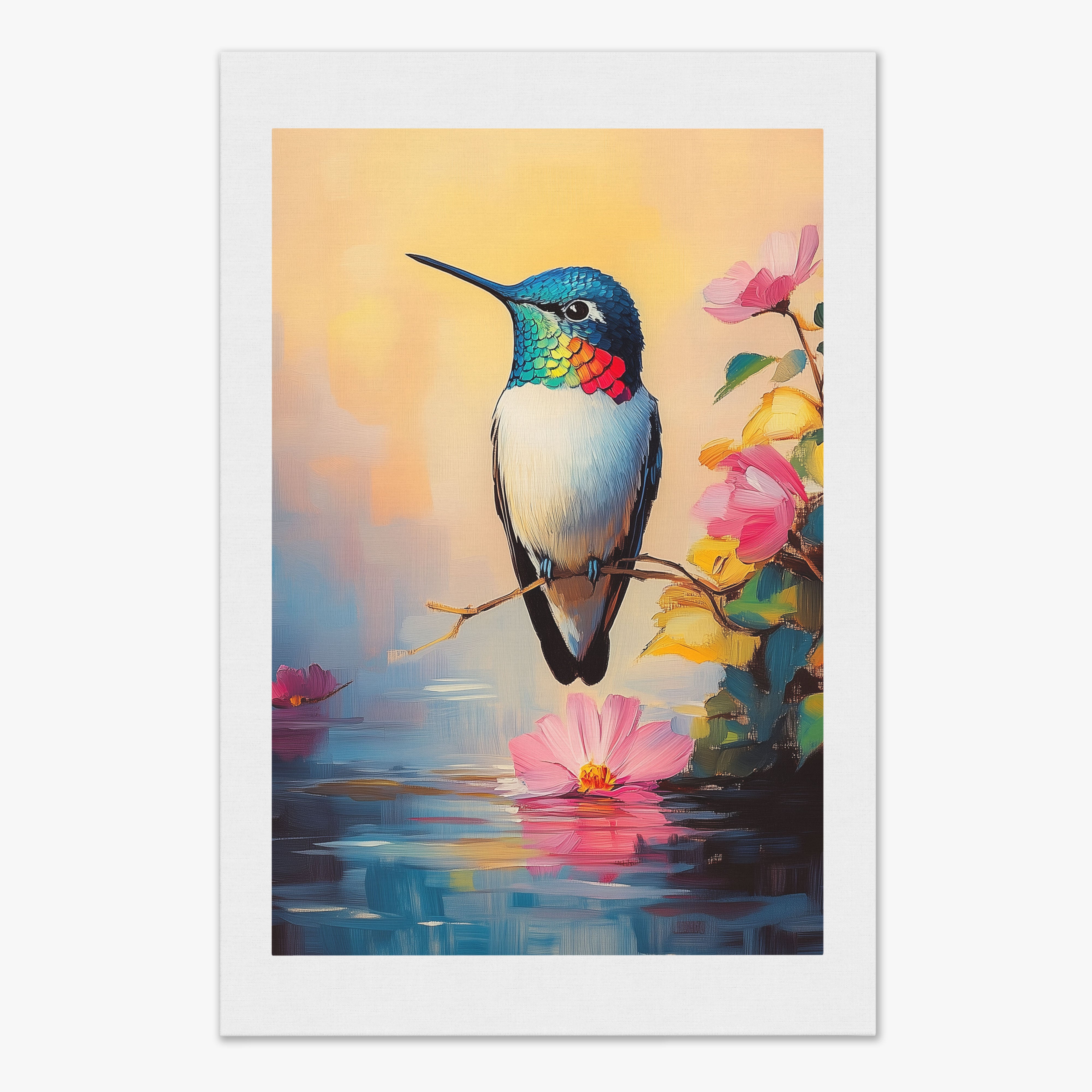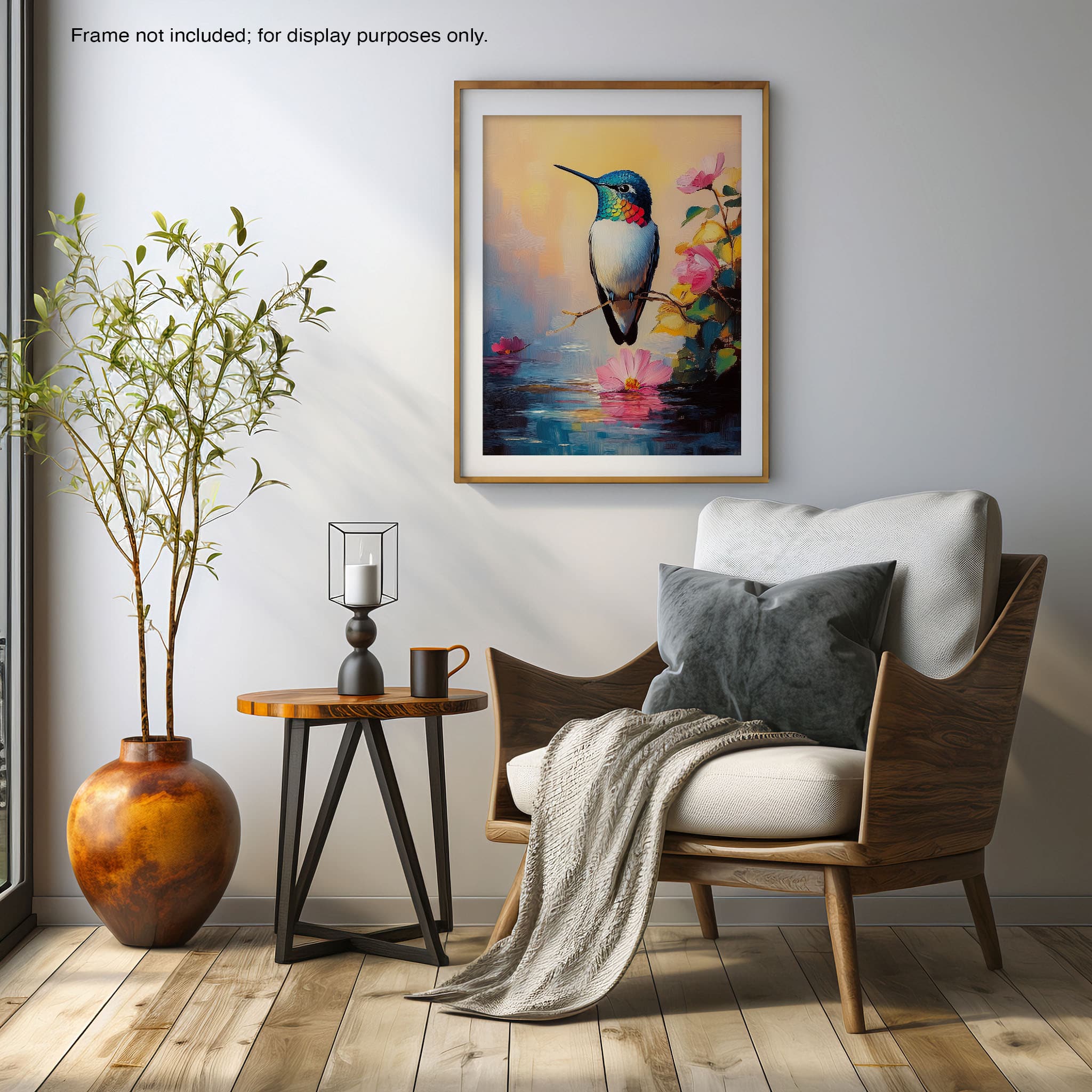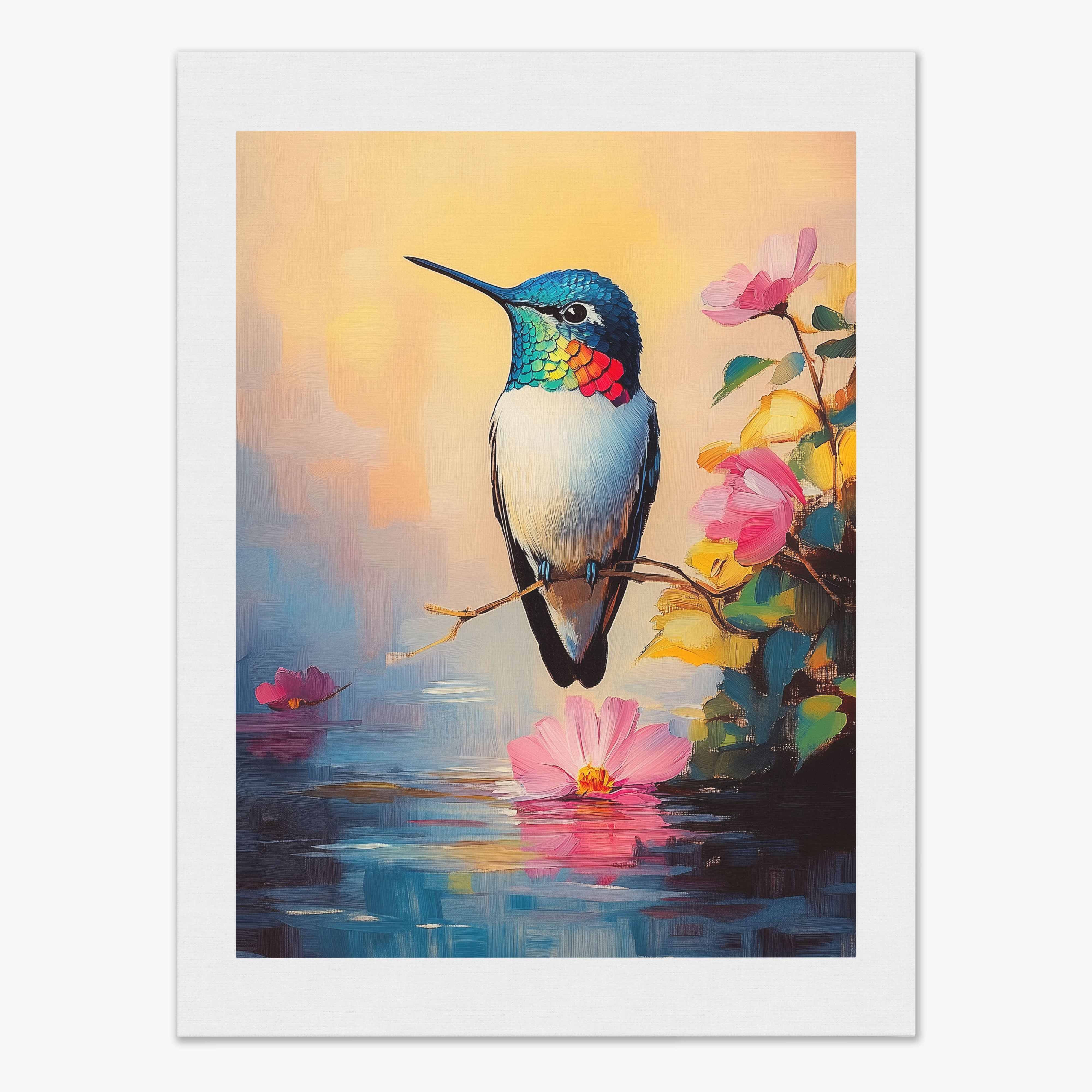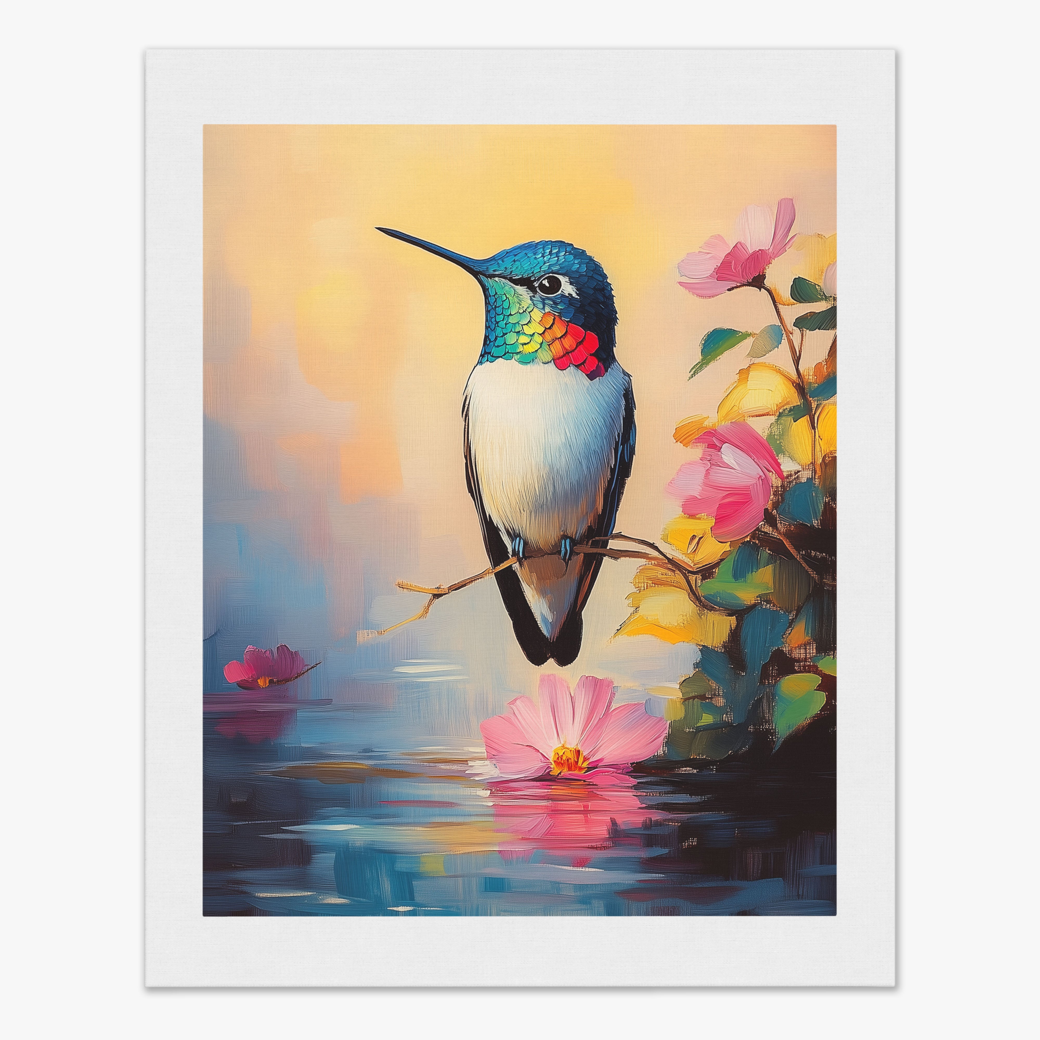This enchanting digital illustration captures the vibrant essence of a hummingbird gracefully perched amongst blooming flowers. The artwork’s dynamic use of colors, from the iridescent feathers to the vivid pink flowers, creates a mesmerizing visual spectacle. Ideal for nature enthusiasts and art collectors alike, it blends the precision of digital artistry with the charm of impressionistic influences, giving it a timeless appeal. Add a touch of natural beauty and tranquility to any space with this striking piece that celebrates the harmony of wildlife and flora. Perfect for enhancing modern or classic decor, it’s a testament to the elegance of the natural world captured through innovative digital techniques.