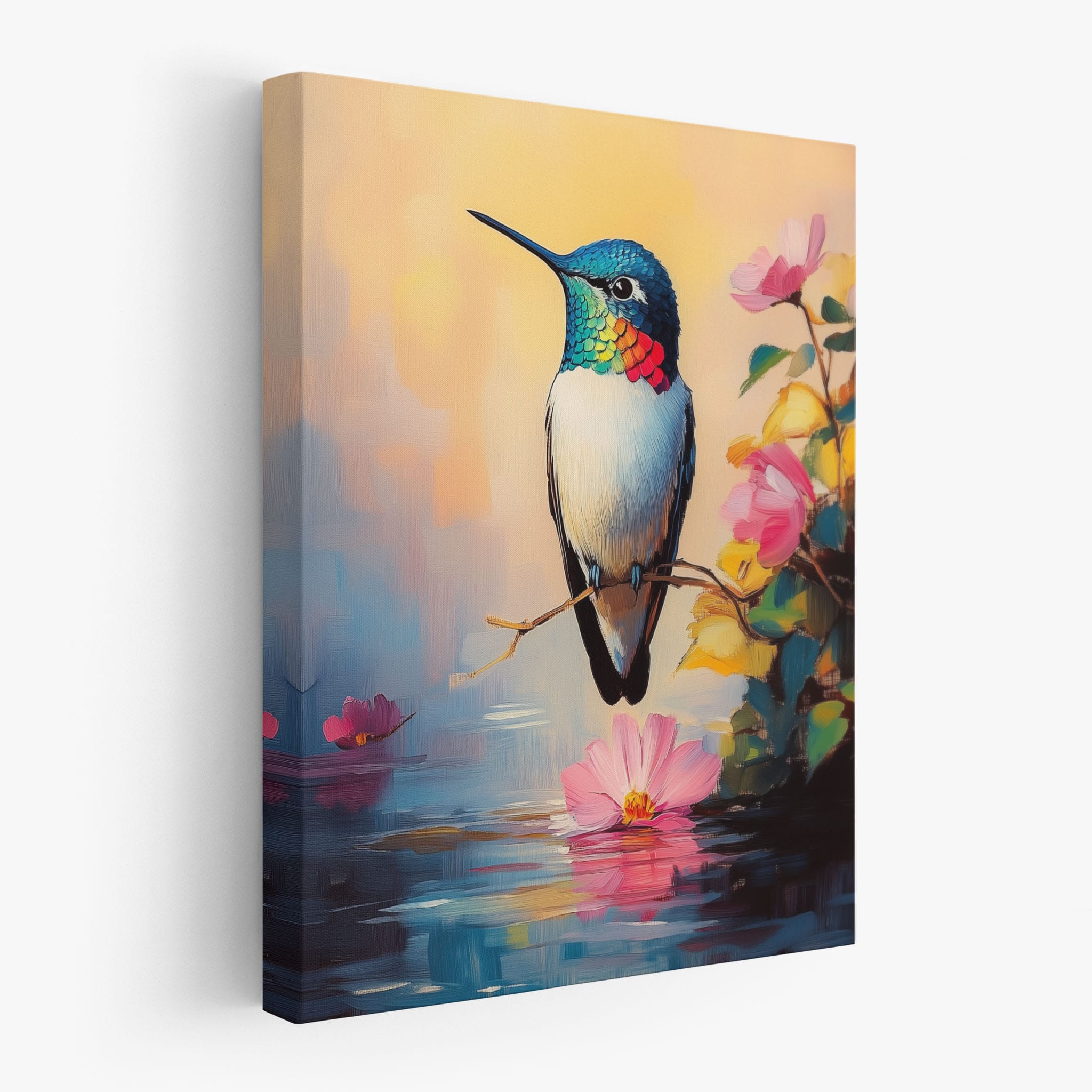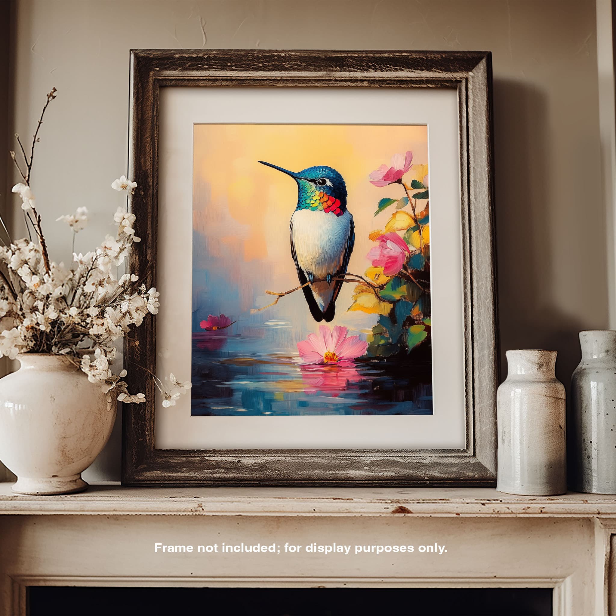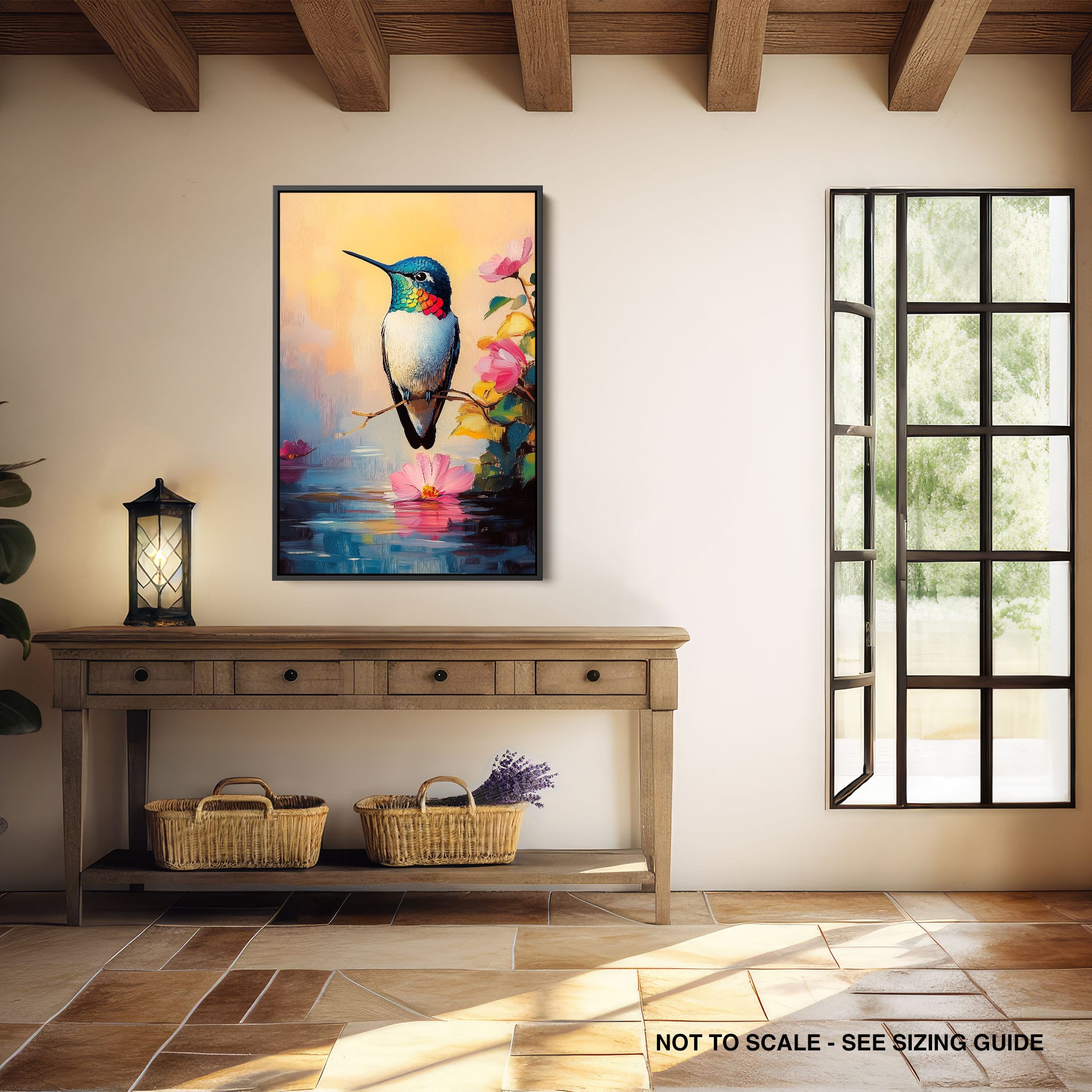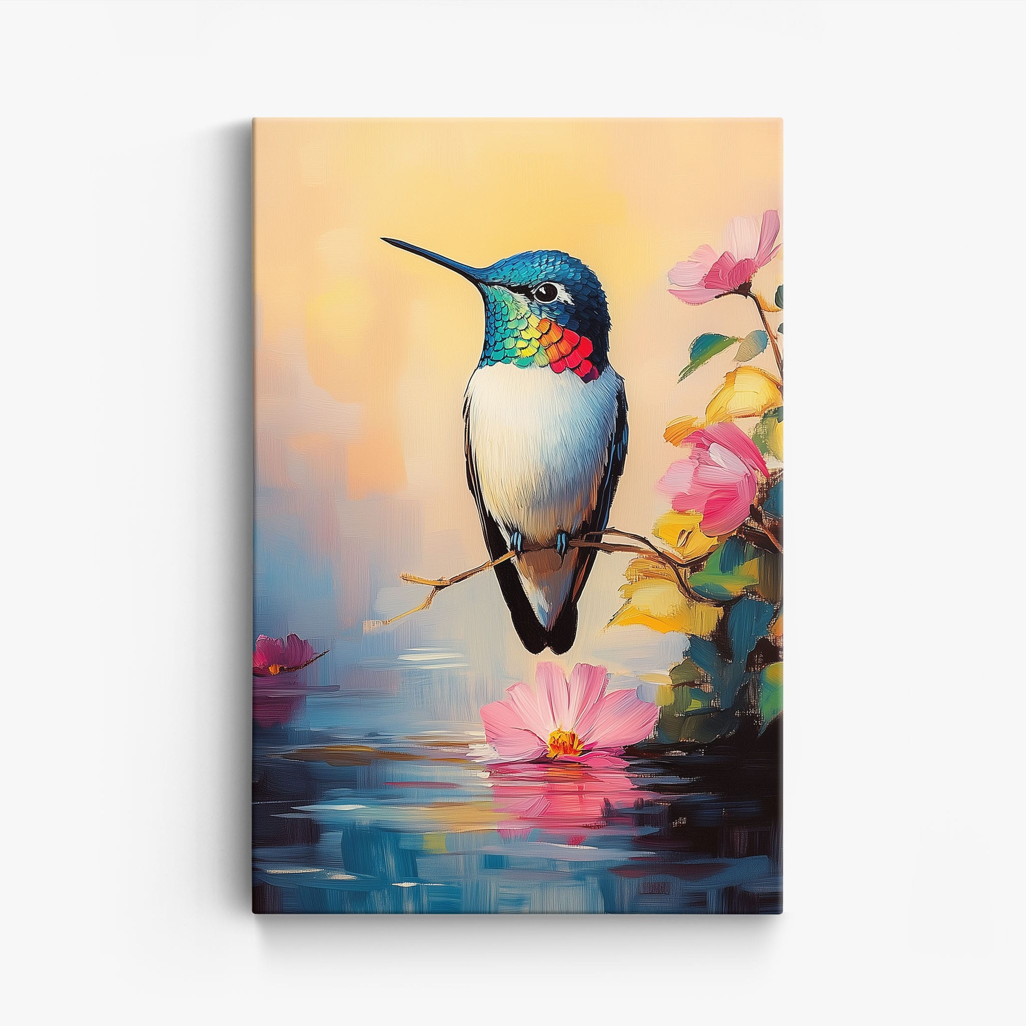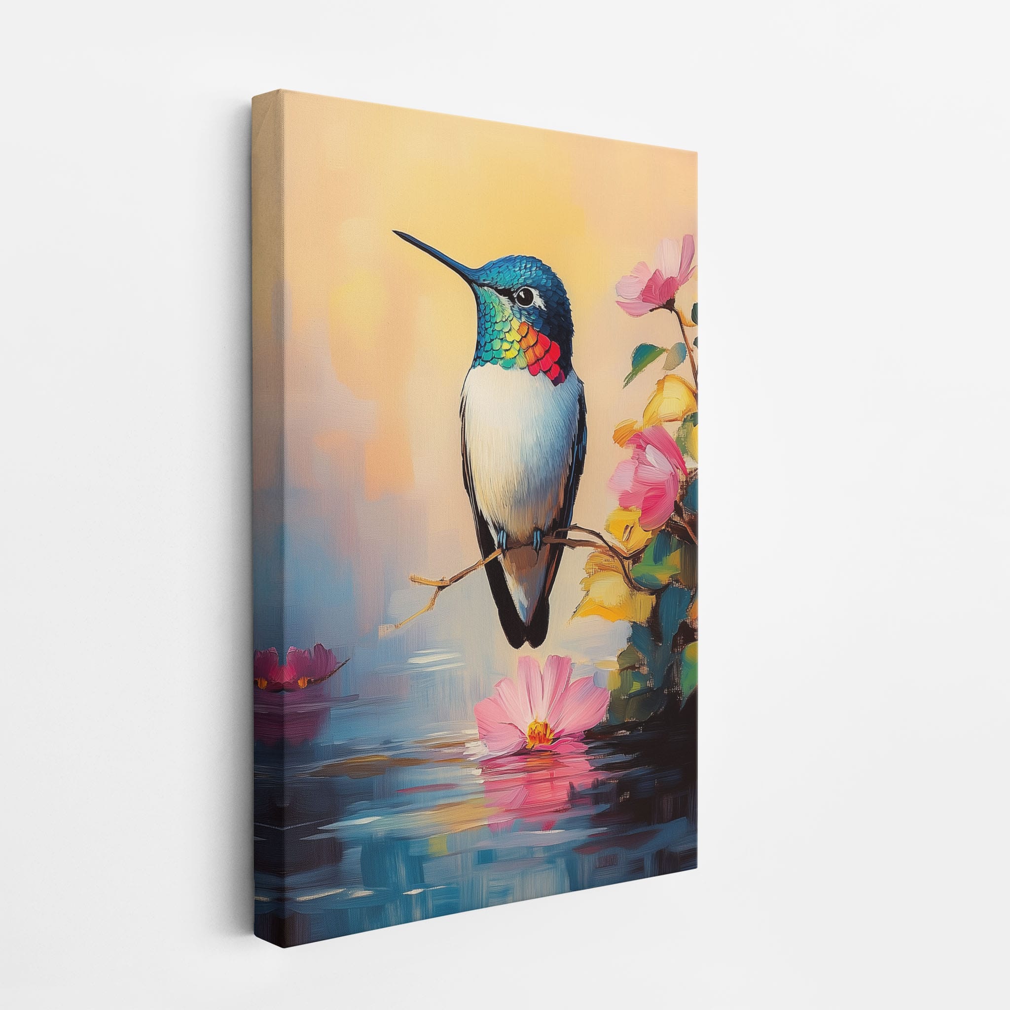 This enchanting digital illustration captures the vibrant essence of a hummingbird gracefully perched amongst blooming flowers. The artwork’s dynamic use of colors, from the iridescent feathers to the vivid pink flowers, creates a mesmerizing visual spectacle. Ideal for nature enthusiasts and art collectors alike, it blends the precision of digital artistry with the charm of impressionistic influences, giving it a timeless appeal. Add a touch of natural beauty and tranquility to any space with this striking piece that celebrates the harmony of wildlife and flora. Perfect for enhancing modern or classic decor, it’s a testament to the elegance of the natural world captured through innovative digital techniques.