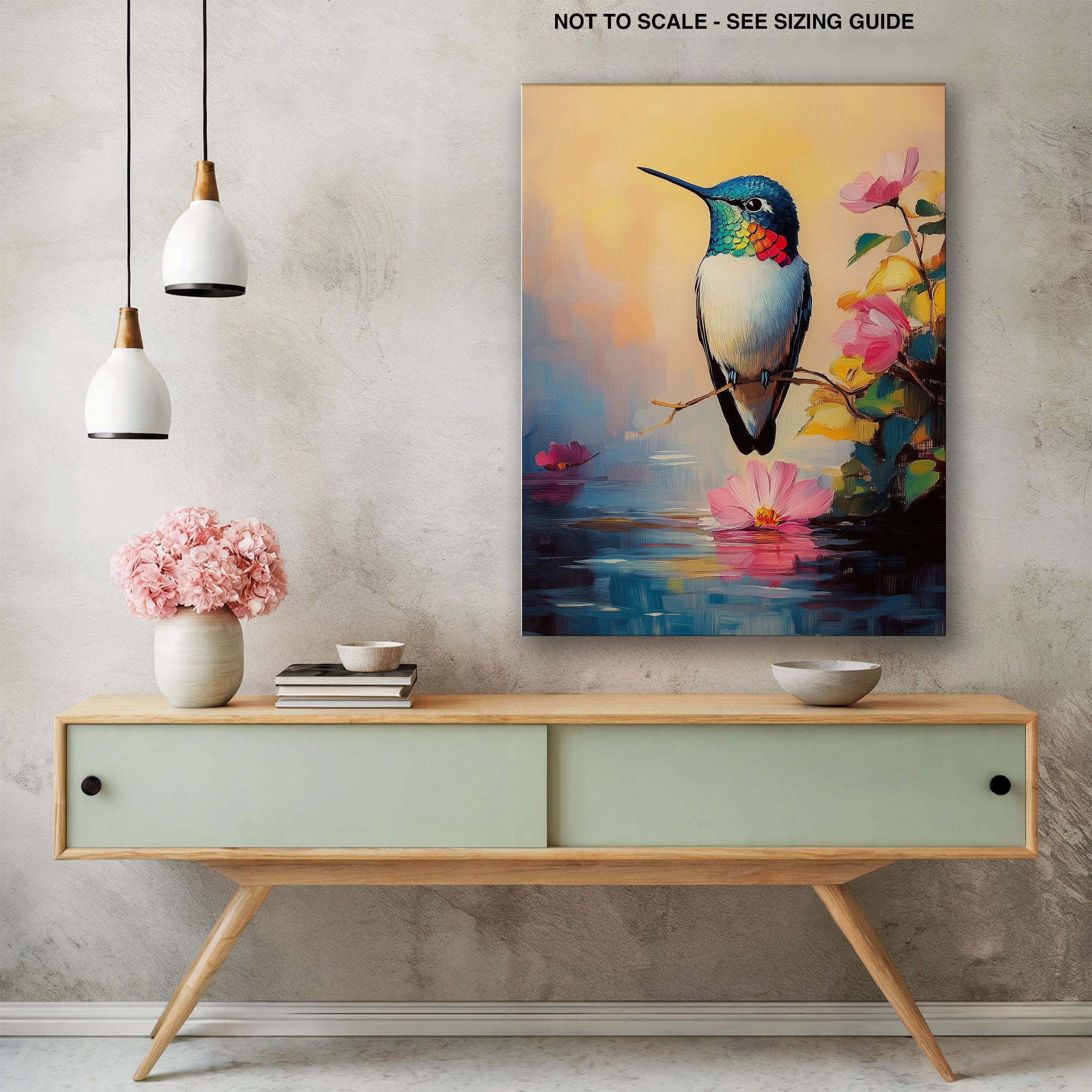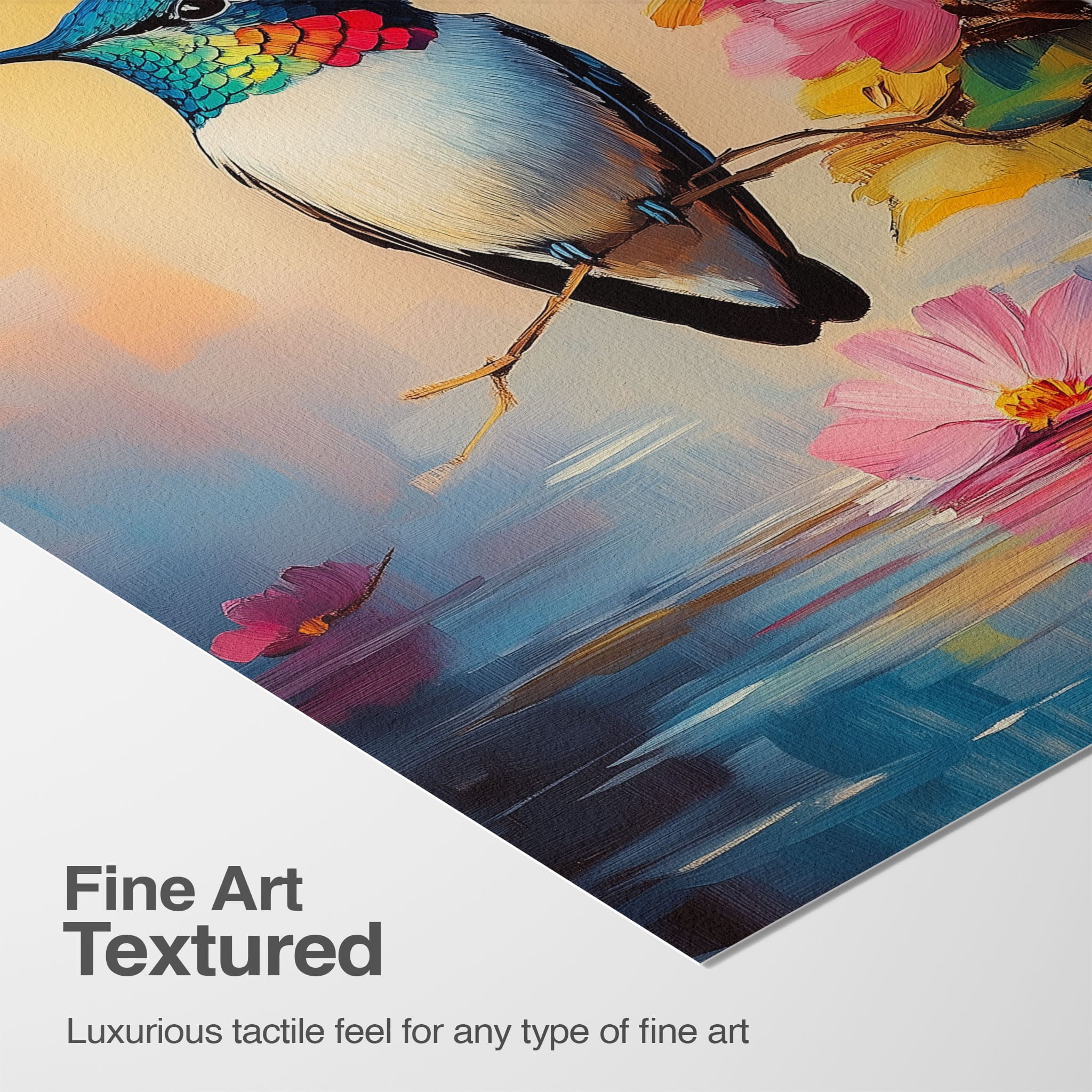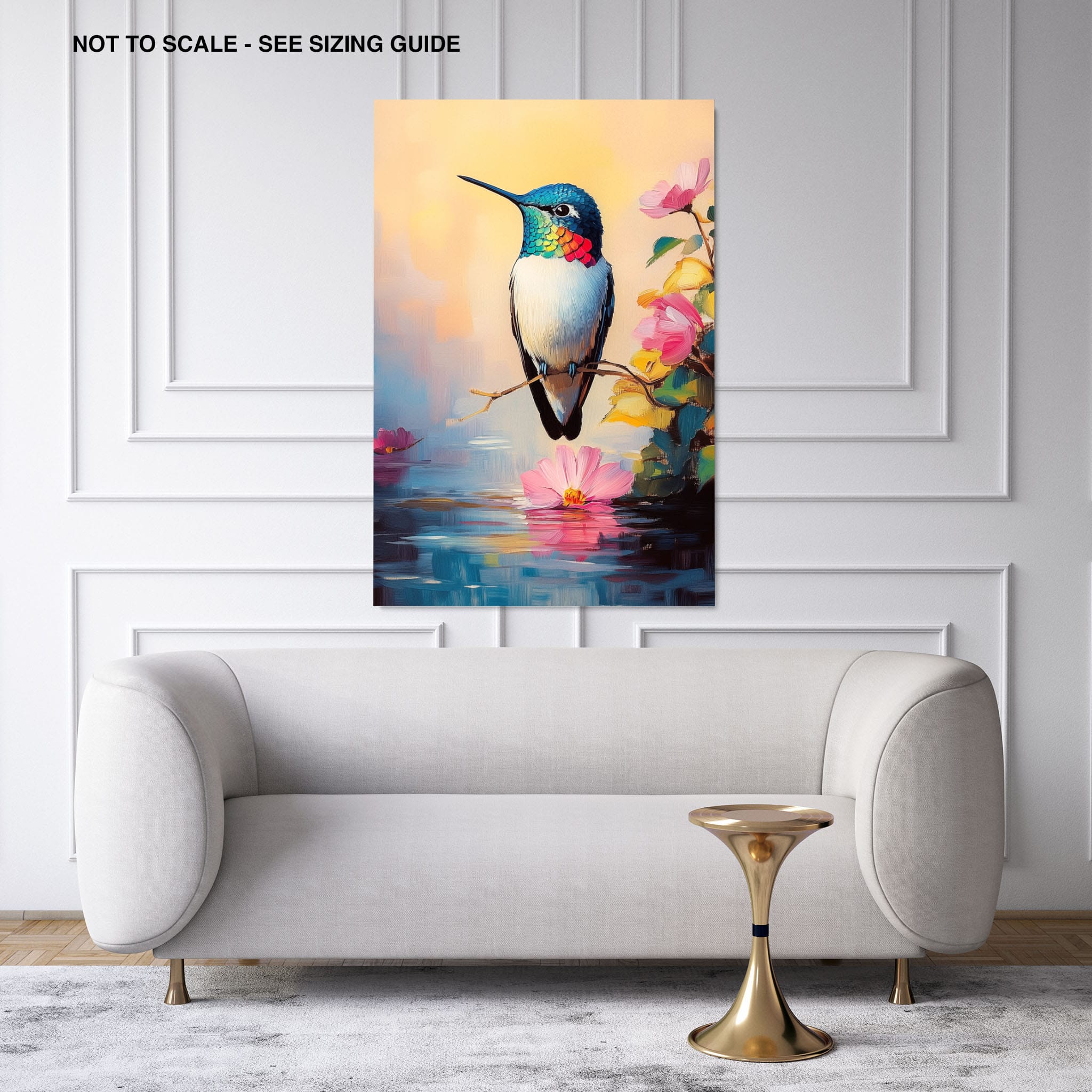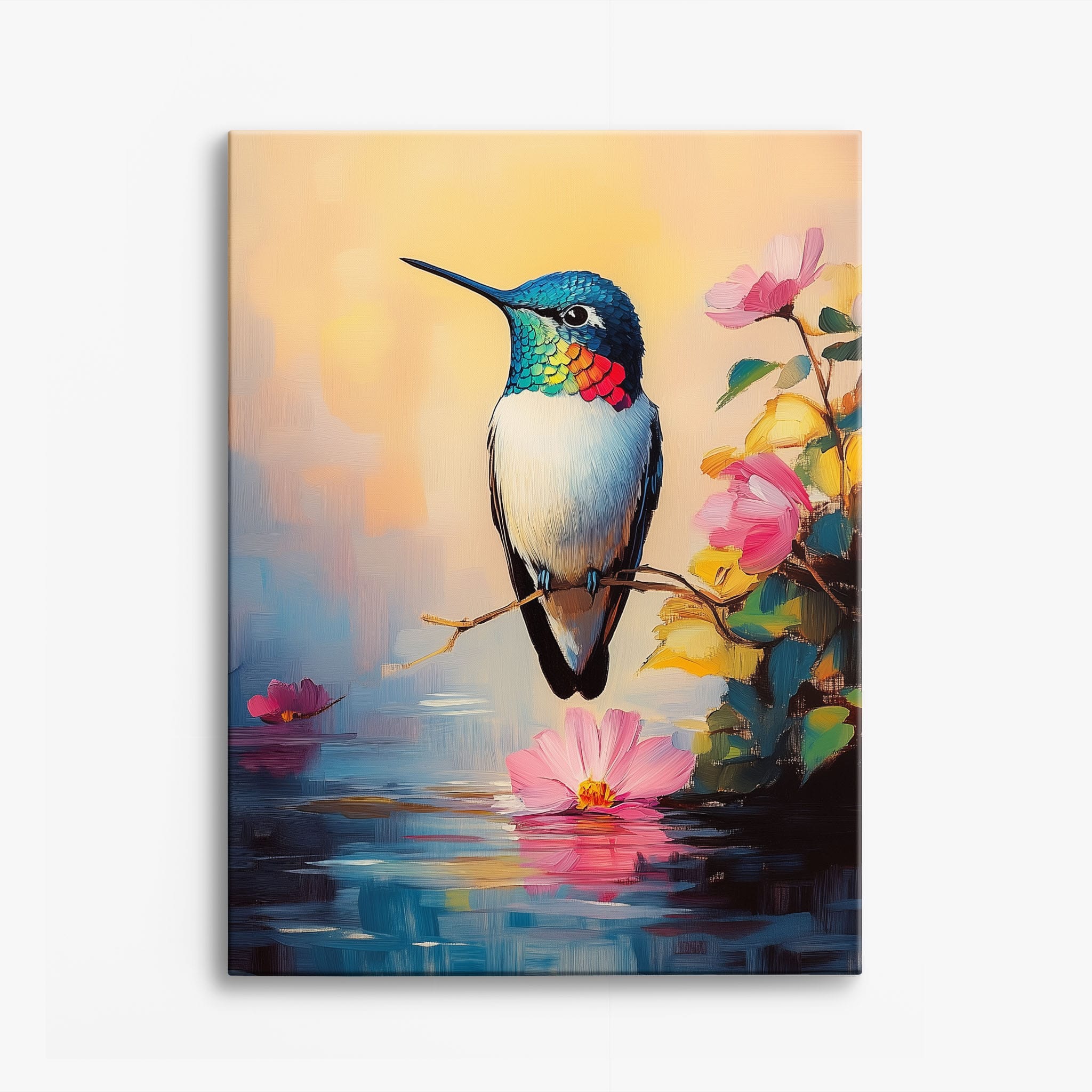 This enchanting digital illustration captures the vibrant essence of a hummingbird gracefully perched amongst blooming flowers. The artwork’s dynamic use of colors, from the iridescent feathers to the vivid pink flowers, creates a mesmerizing visual spectacle. Ideal for nature enthusiasts and art collectors alike, it blends the precision of digital artistry with the charm of impressionistic influences, giving it a timeless appeal. Add a touch of natural beauty and tranquility to any space with this striking piece that celebrates the harmony of wildlife and flora. Perfect for enhancing modern or classic decor, it’s a testament to the elegance of the natural world captured through innovative digital techniques.
