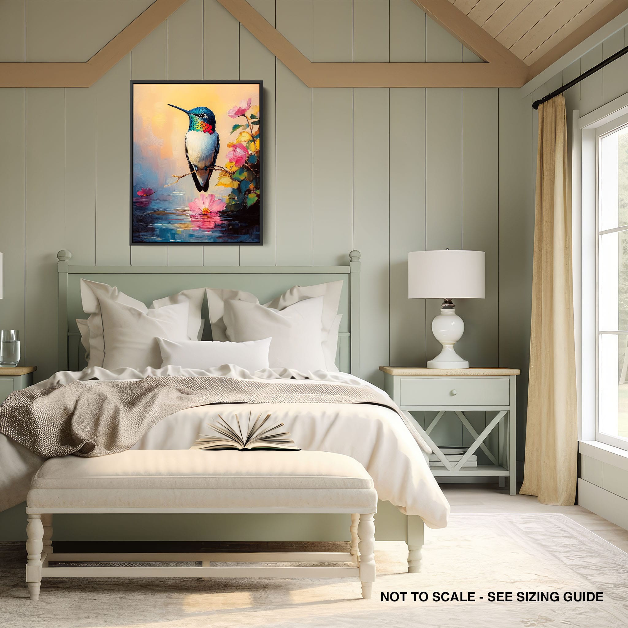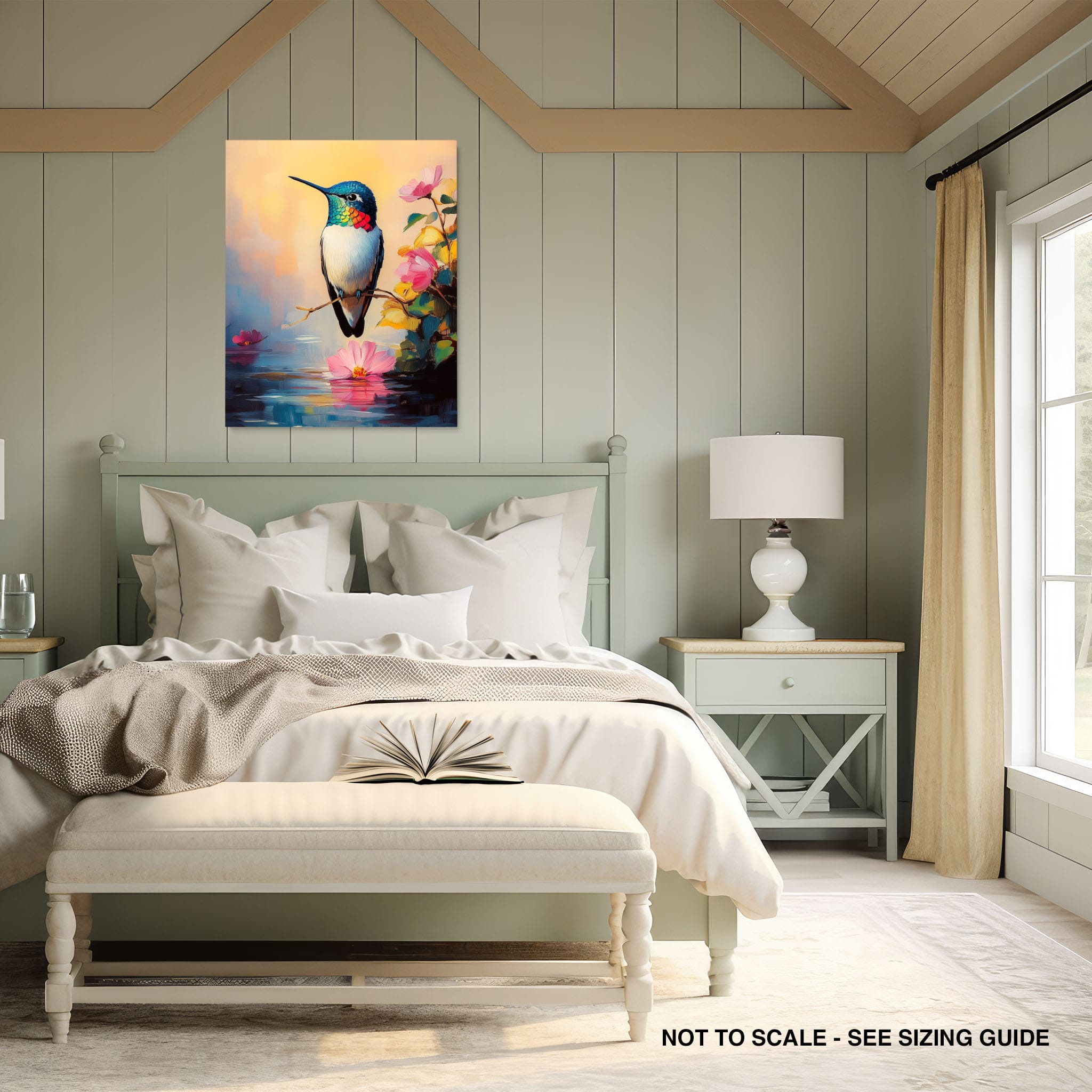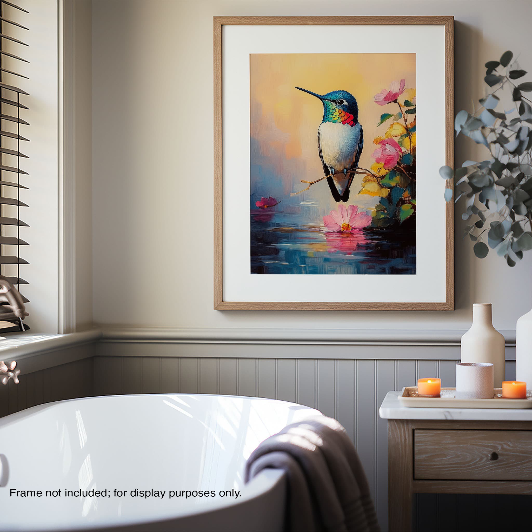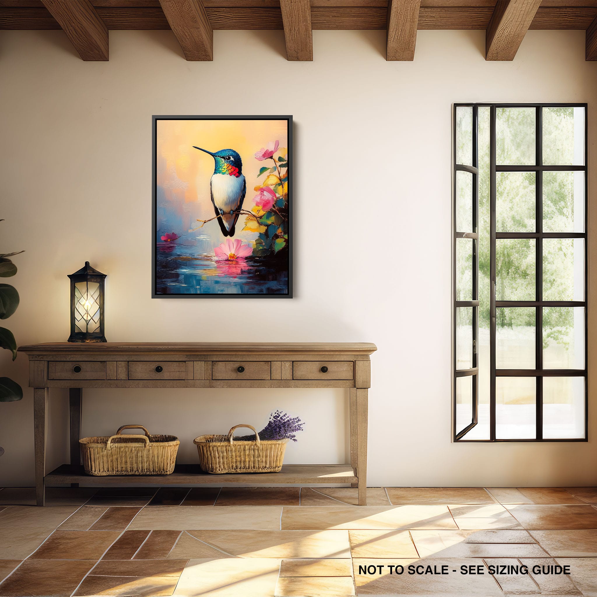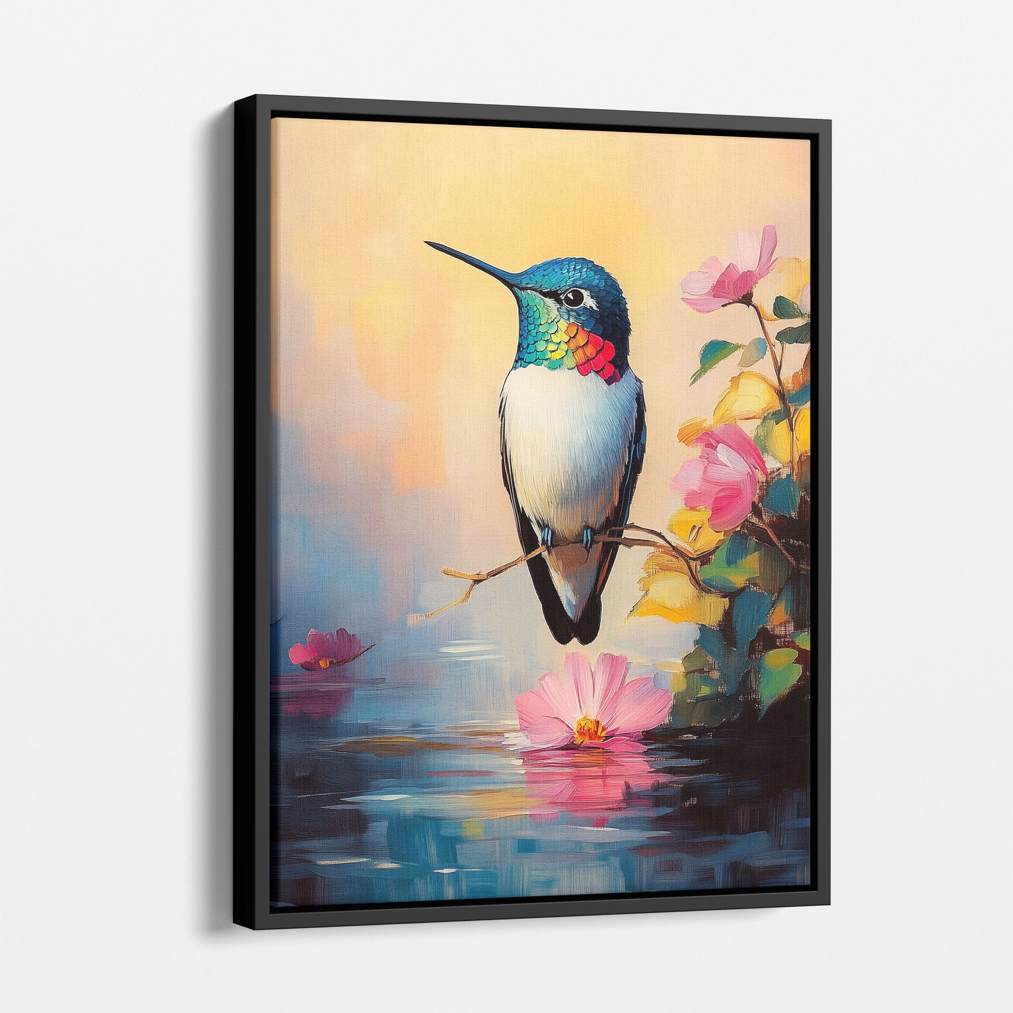This enchanting digital illustration captures the vibrant essence of a hummingbird gracefully perched amongst blooming flowers. The artwork’s dynamic use of colors, from the iridescent feathers to the vivid pink flowers, creates a mesmerizing visual spectacle. Ideal for nature enthusiasts and art collectors alike, it blends the precision of digital artistry with the charm of impressionistic influences, giving it a timeless appeal. Add a touch of natural beauty and tranquility to any space with this striking piece that celebrates the harmony of wildlife and flora. Perfect for enhancing modern or classic decor, it’s a testament to the elegance of the natural world captured through innovative digital techniques.
